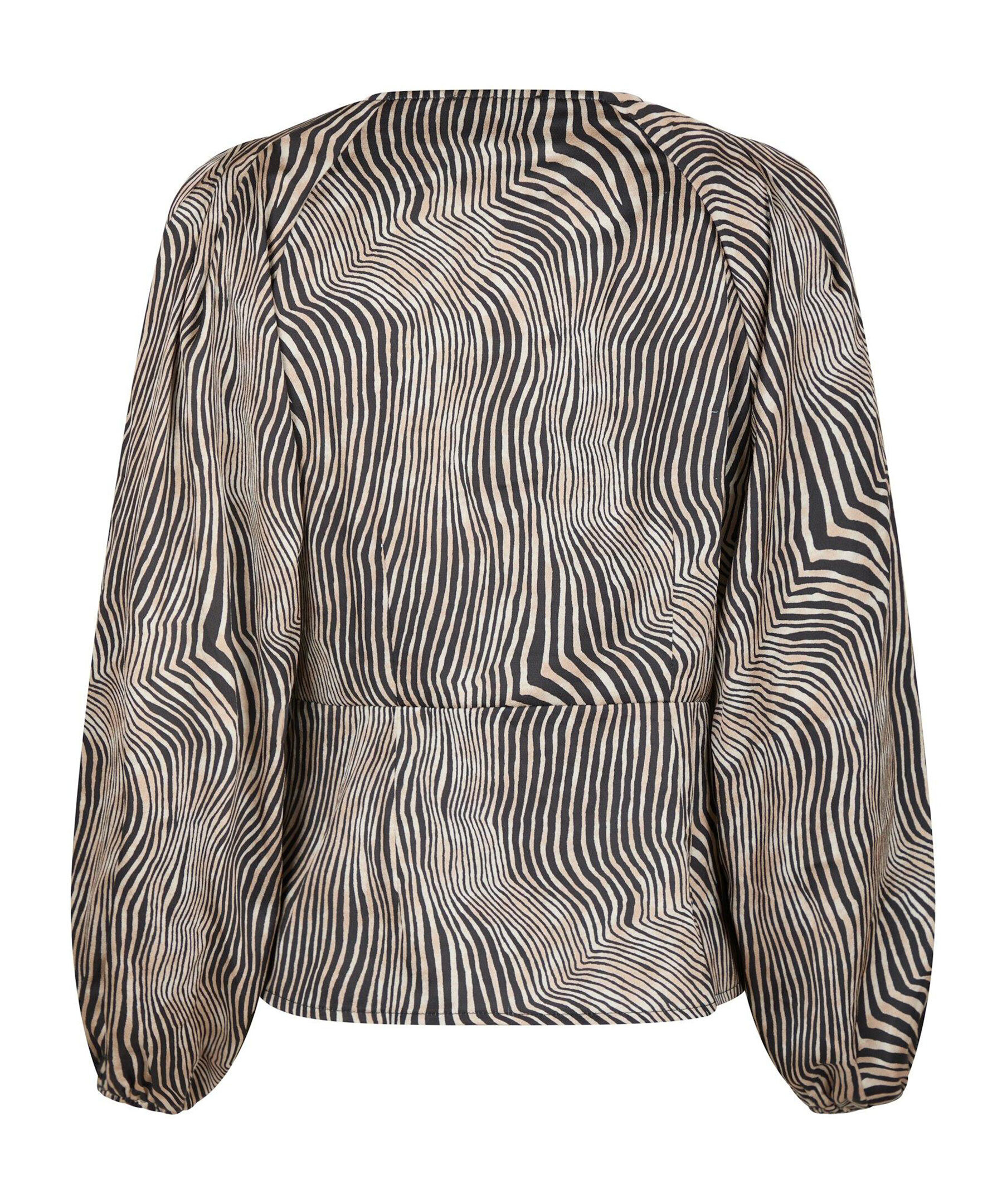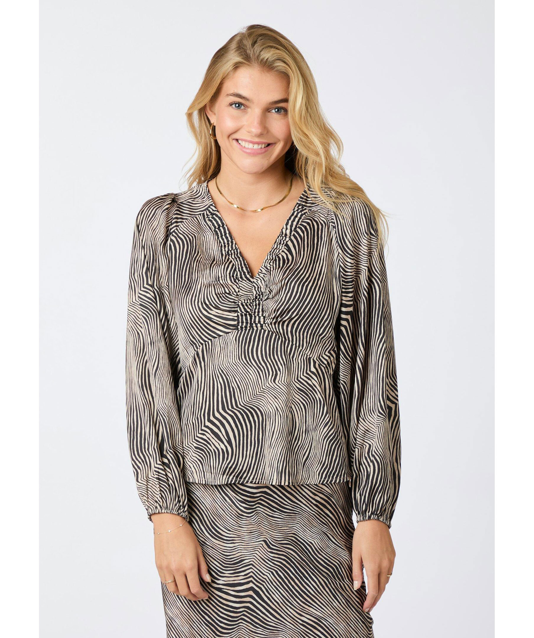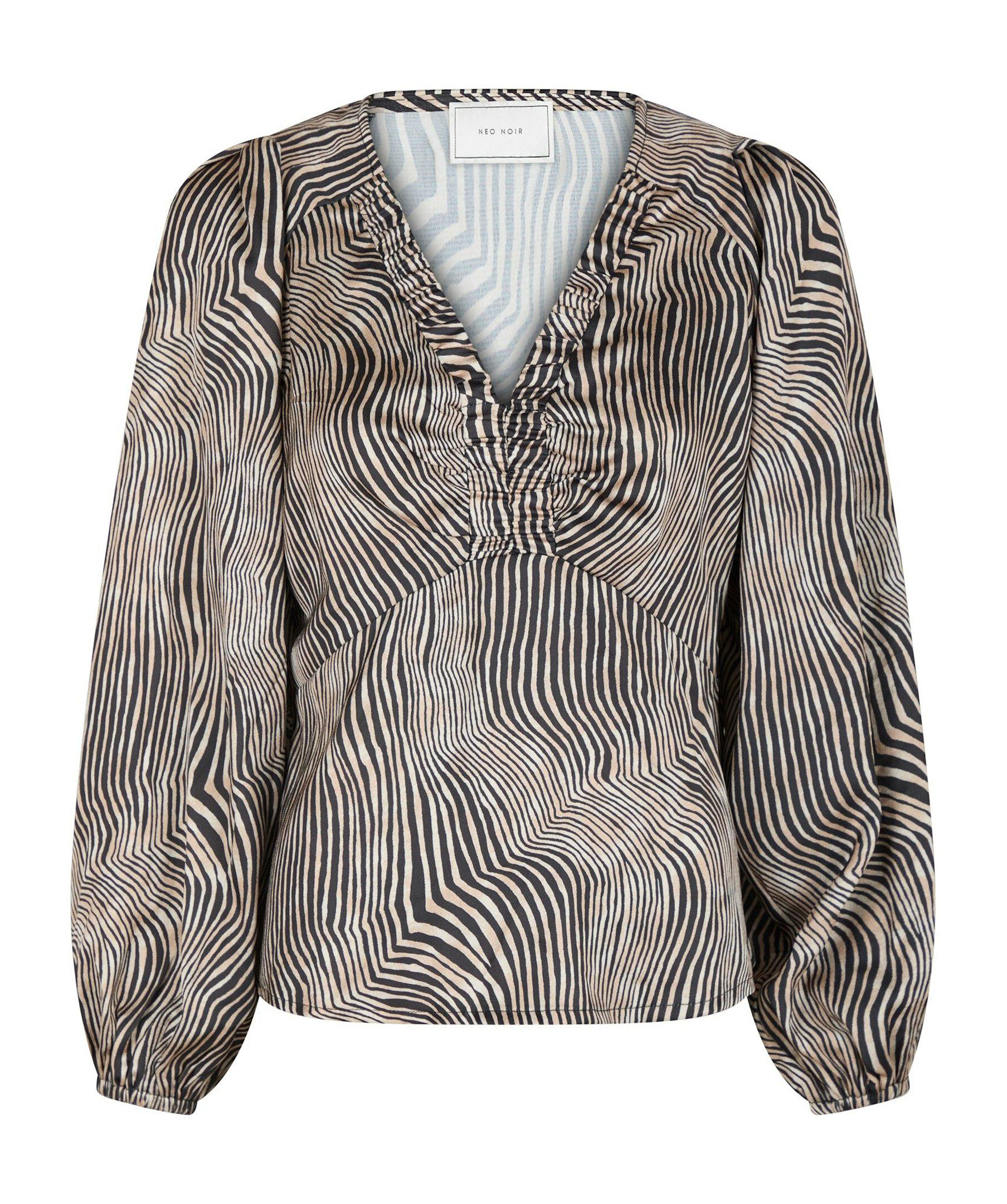 Beige och svart, långärmad zebramönstrad satinblus från Neo Noir. Blusen har en v-ringad halsringning med rynkade detaljer samt ballongärmar. Tillverkad i en polyesterblandning.