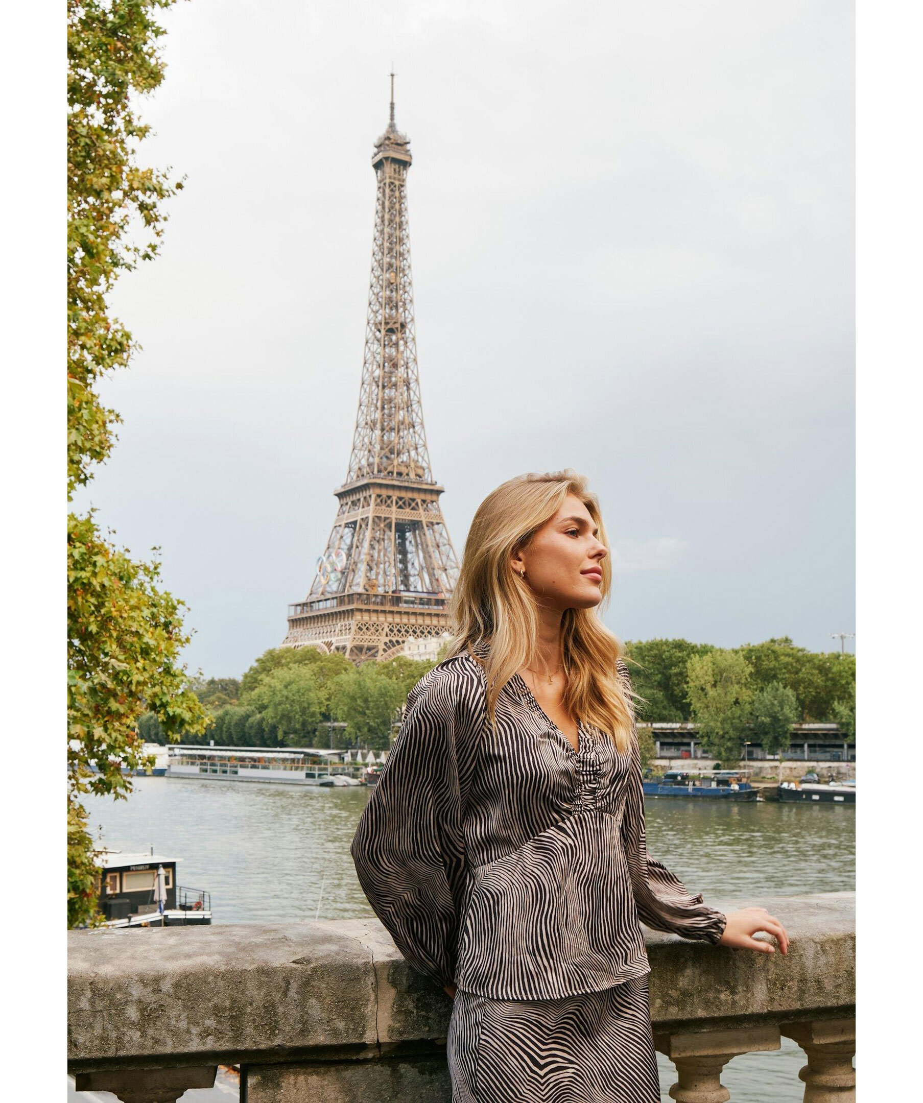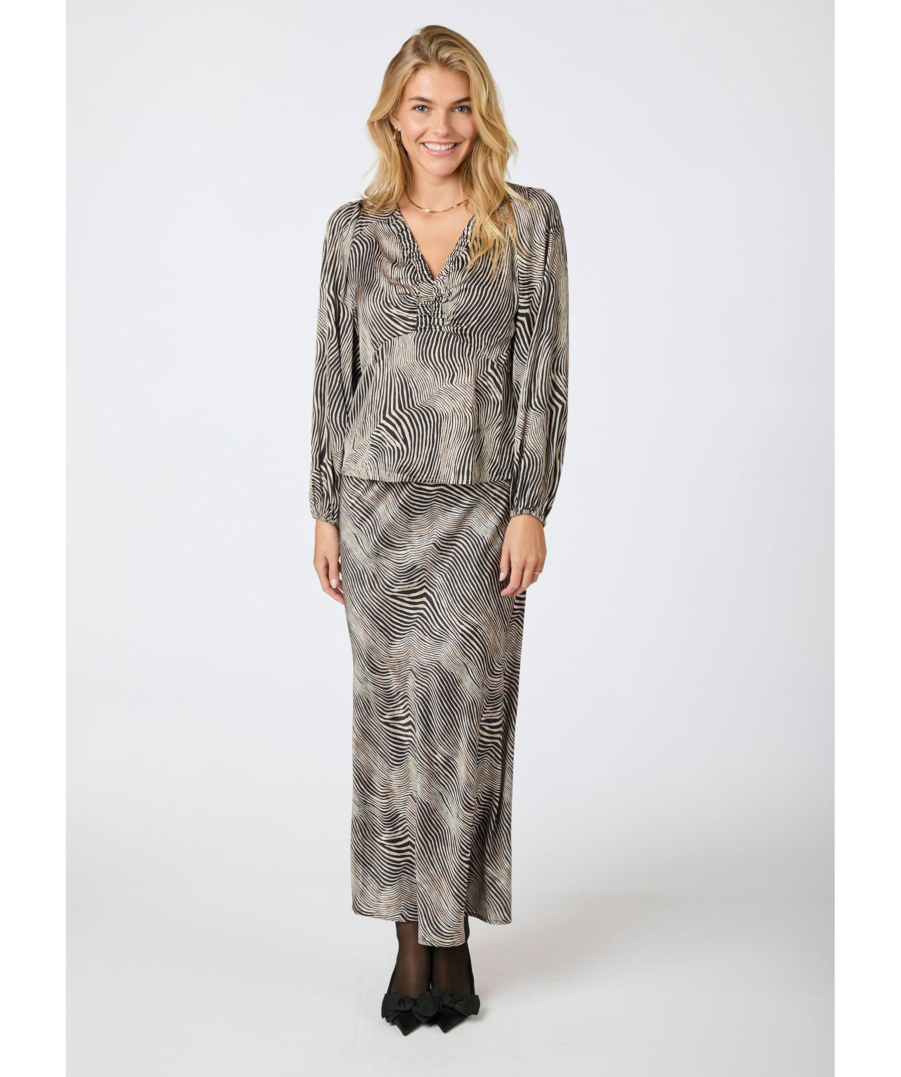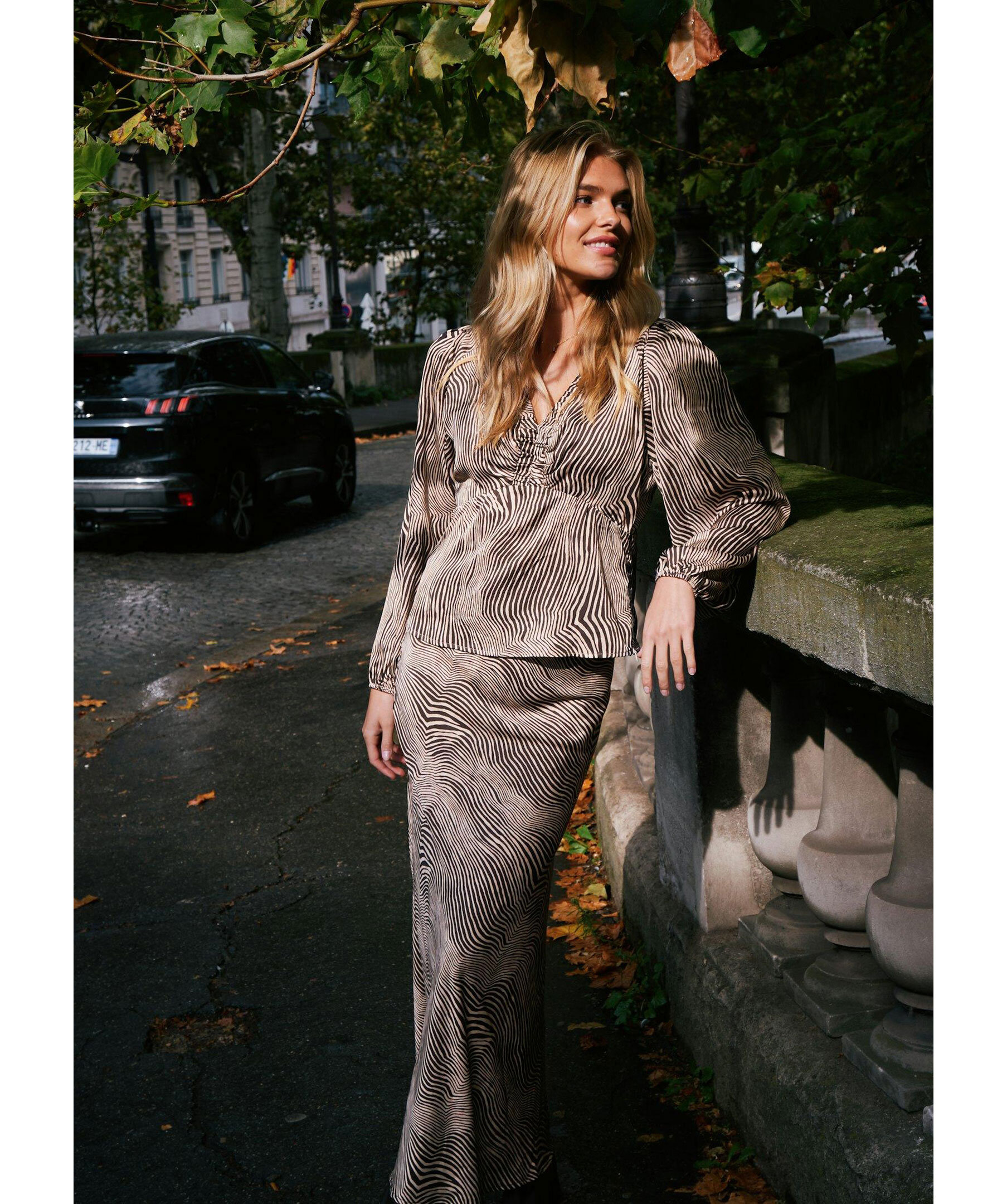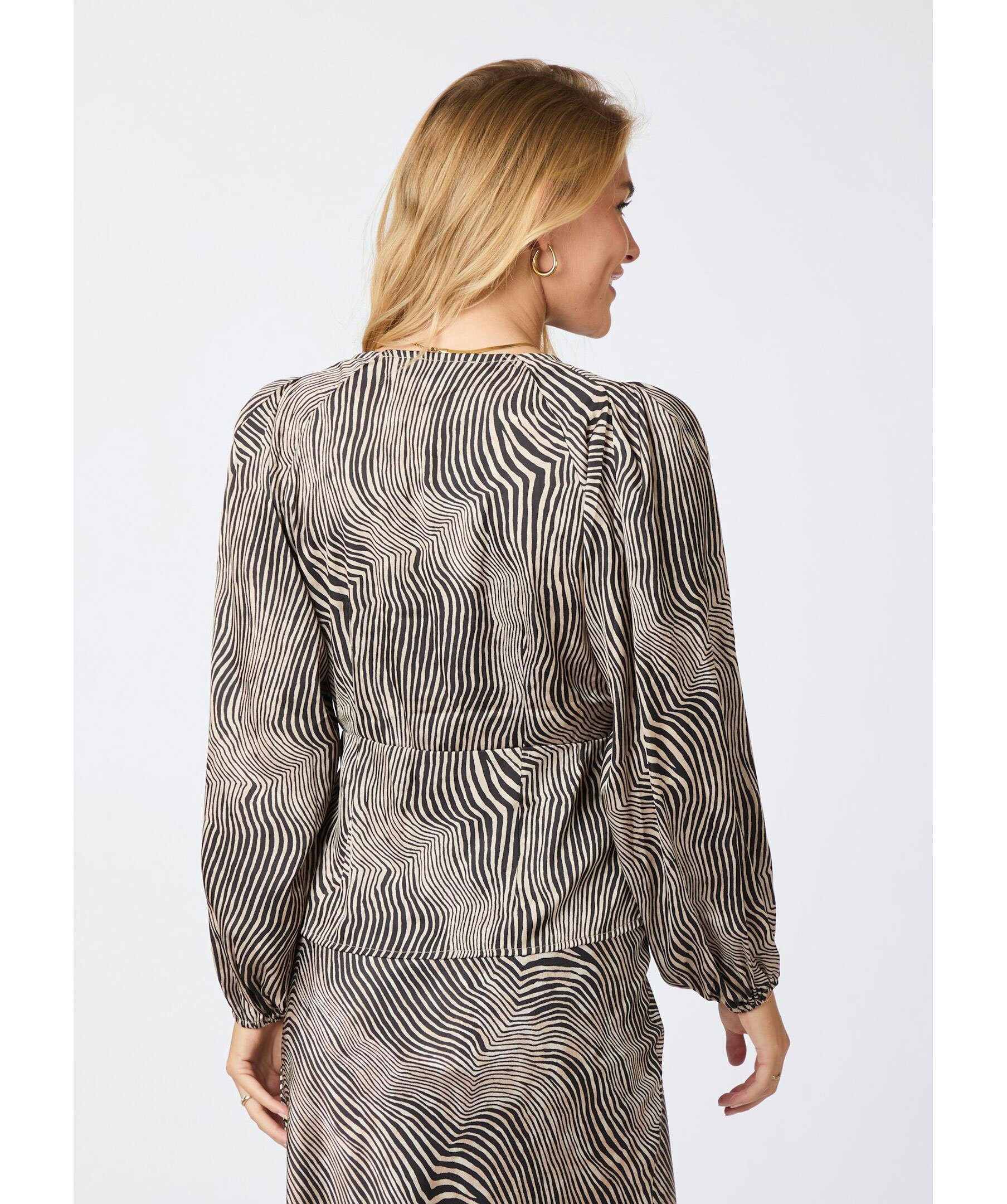 Beige och svart, långärmad zebramönstrad satinblus från Neo Noir. Blusen har en v-ringad halsringning med rynkade detaljer samt ballongärmar. Tillverkad i en polyesterblandning.