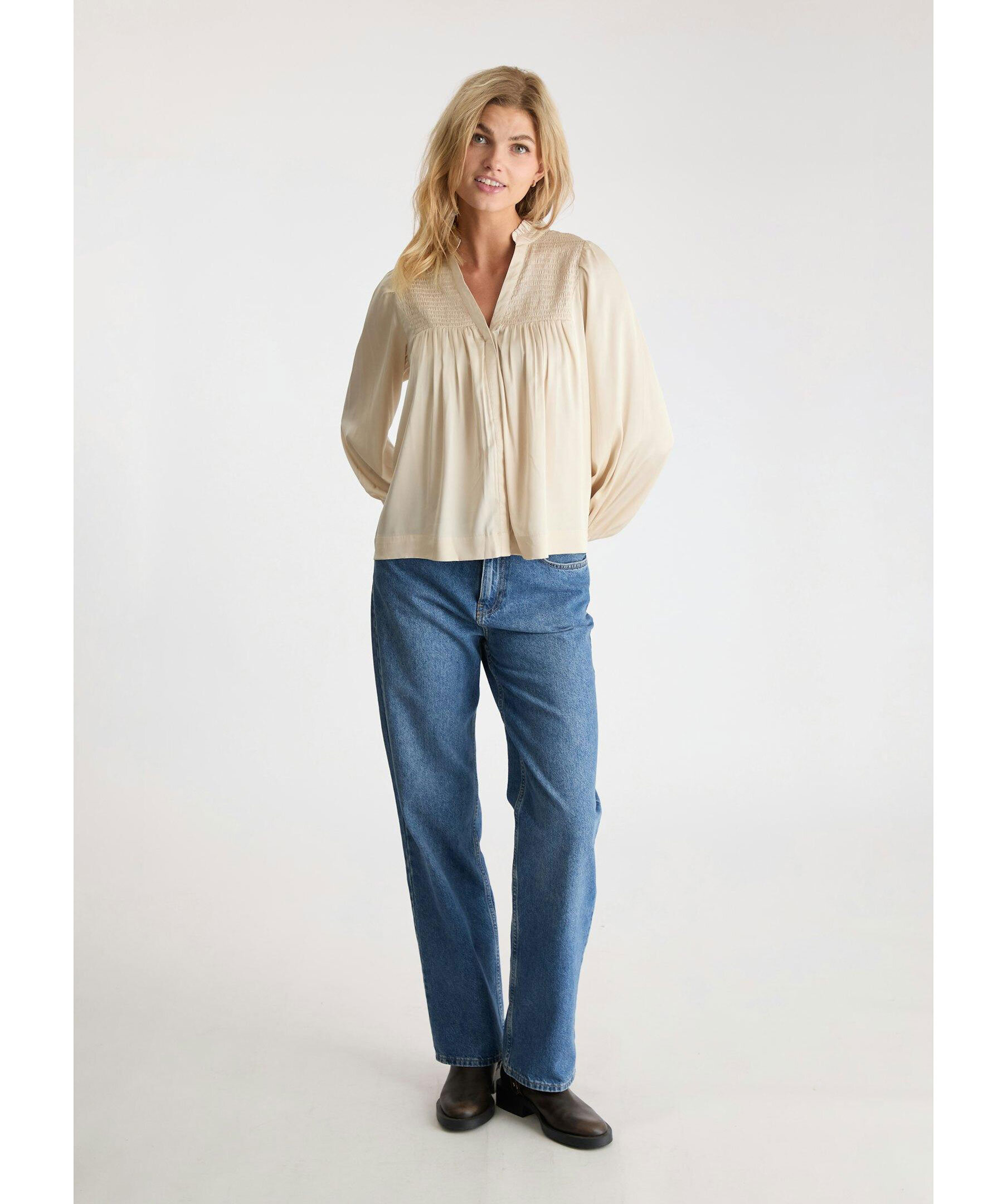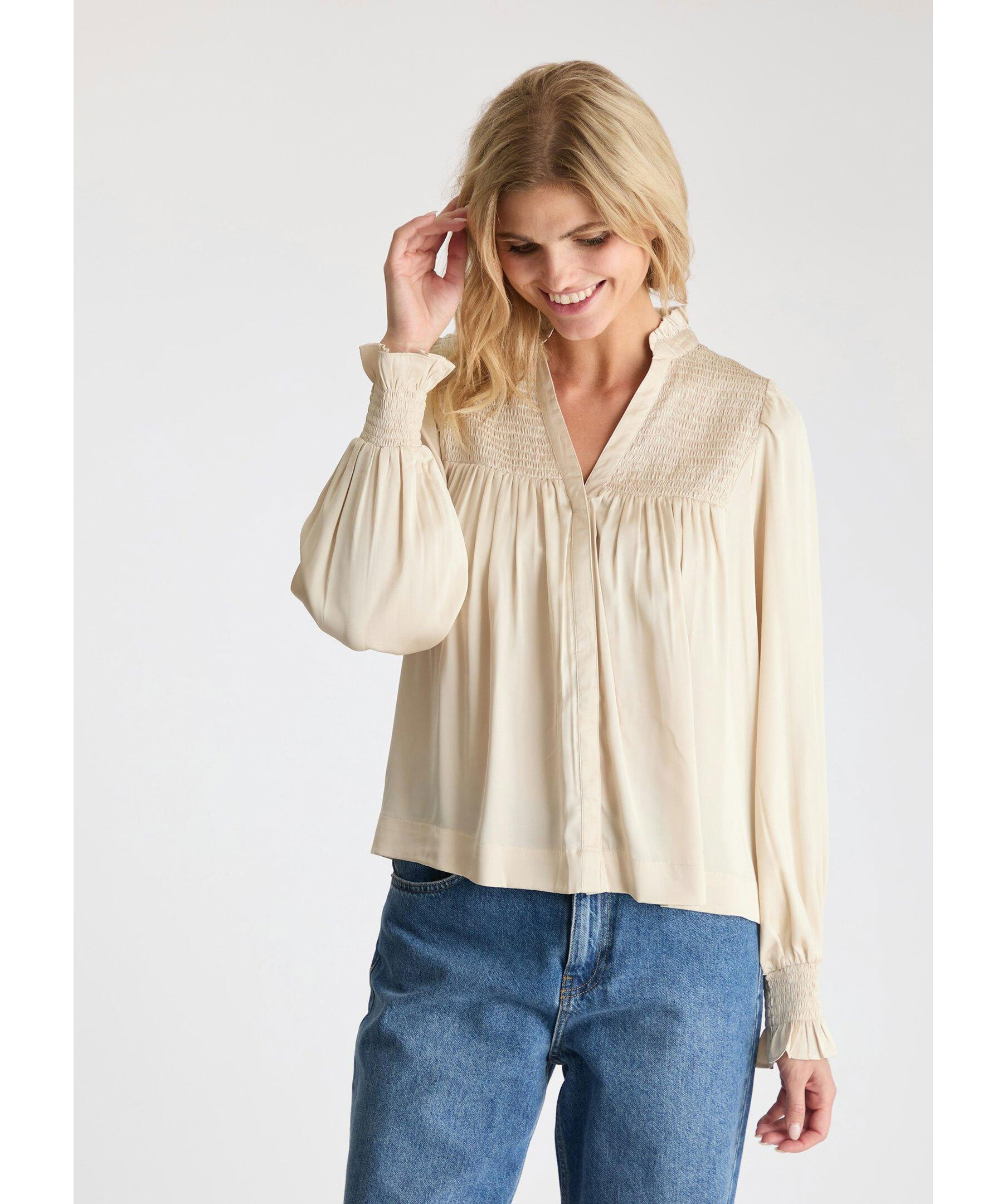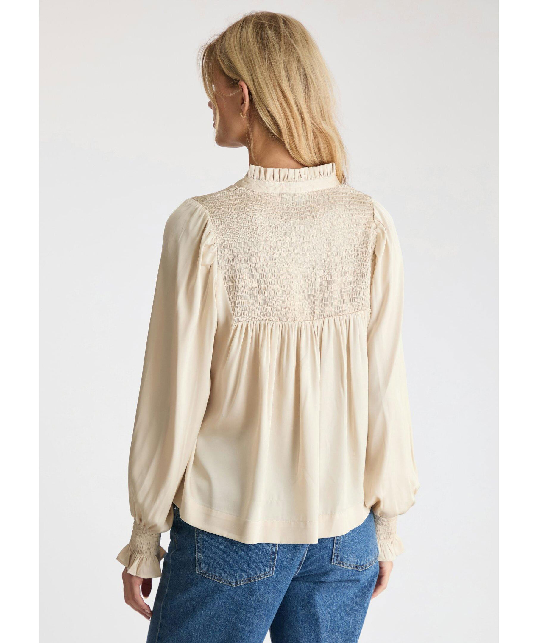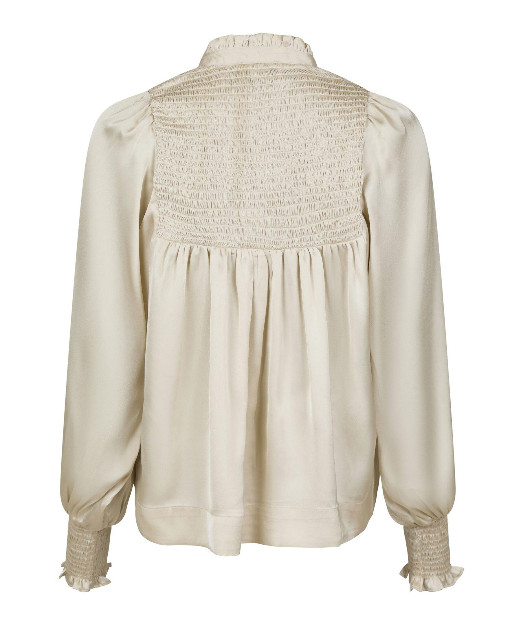 Champagnefärgad silkesblus från Neo Noir. Blusen har långa ärmar, liten krage med volanger, dold knäppning framtill och smockdetaljer på bröstet och vid ärmslut. Tillverkad i polyester.