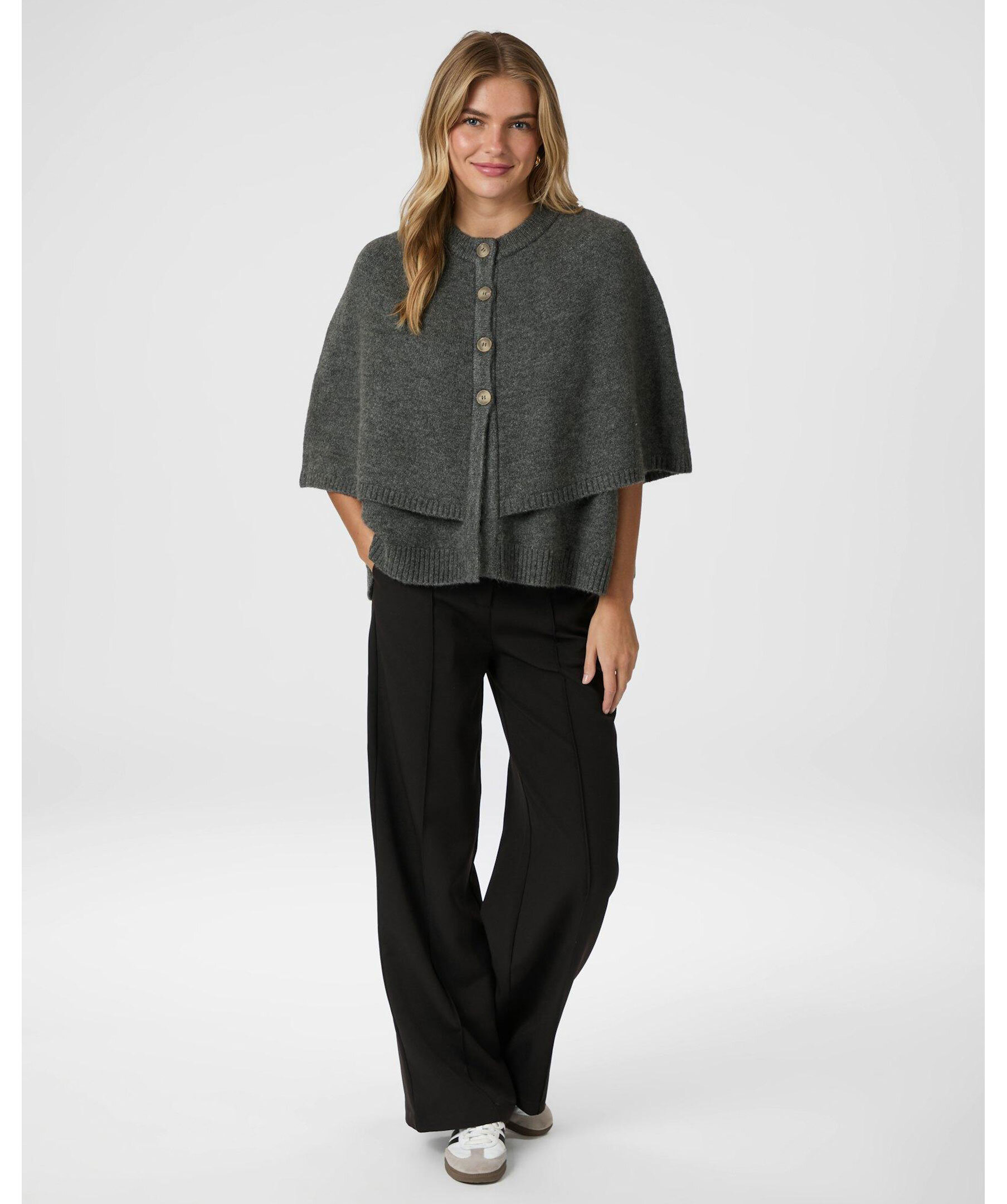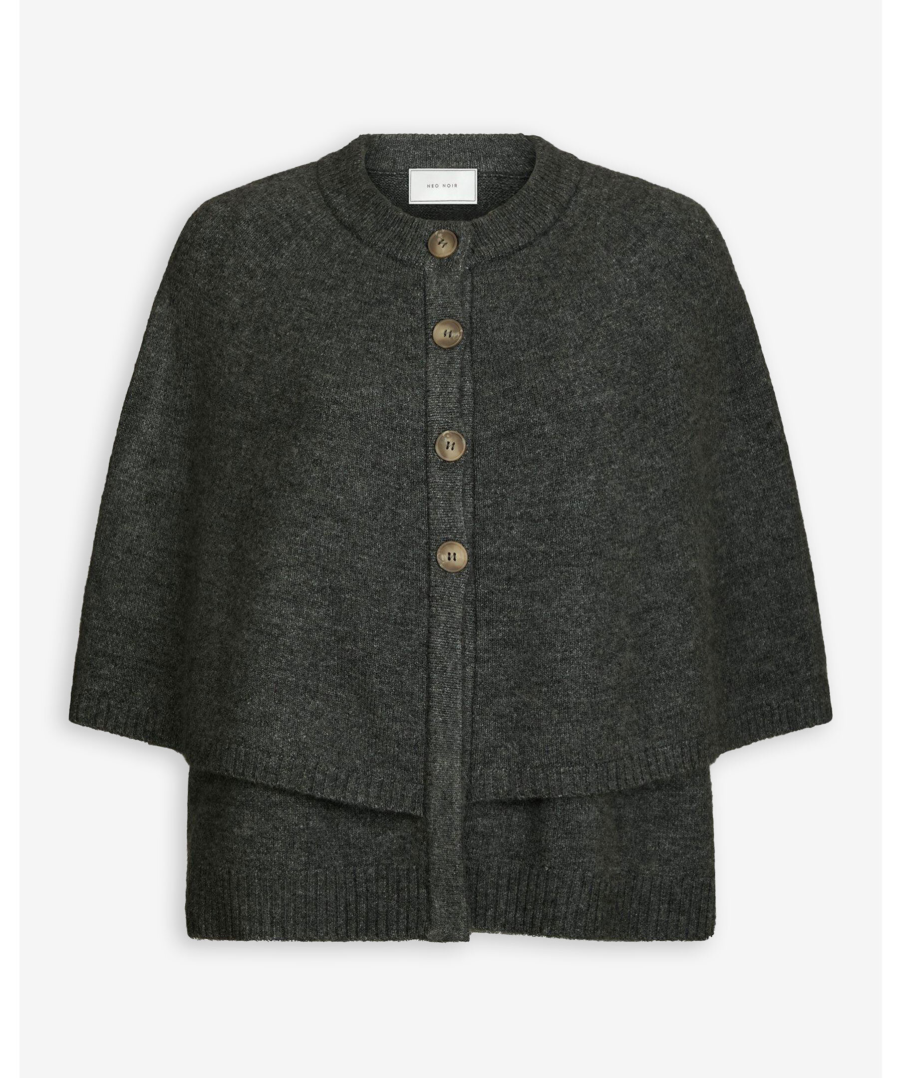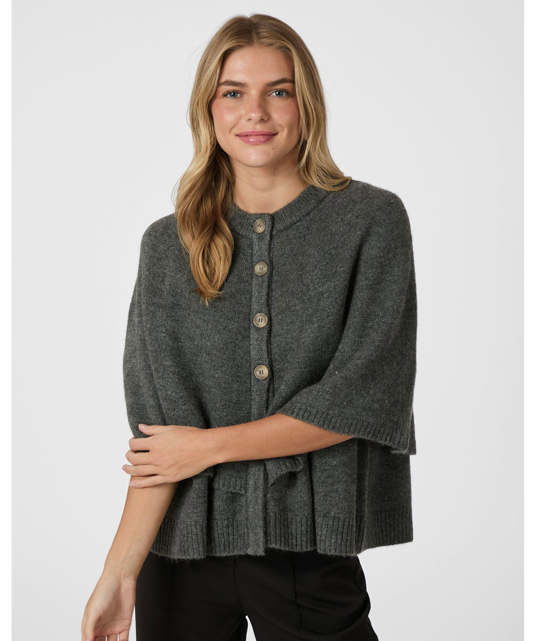 Grå dubbelstickad poncho från Neo Noir med rund halsringning och trekvartsärmar. Designad med drop shoulder och knäppning framtill. Tillverkad i en mjuk och stretchig akrylblandning för komfort och stil.