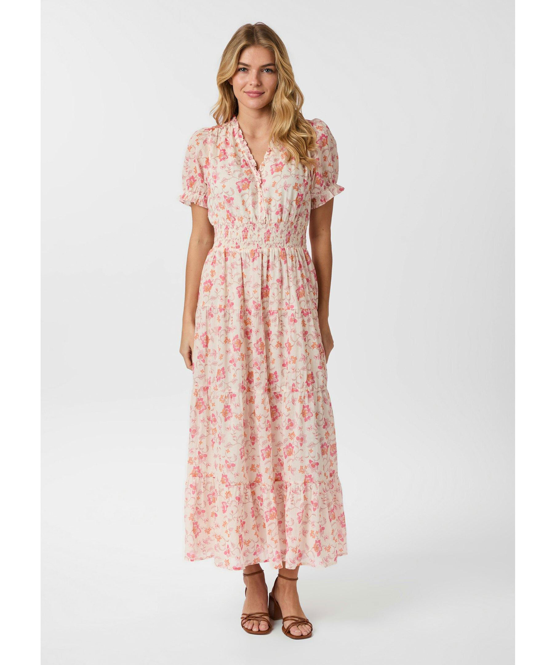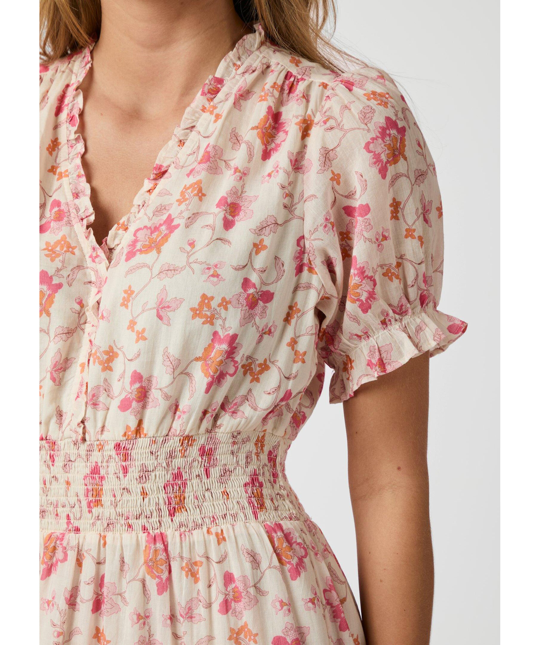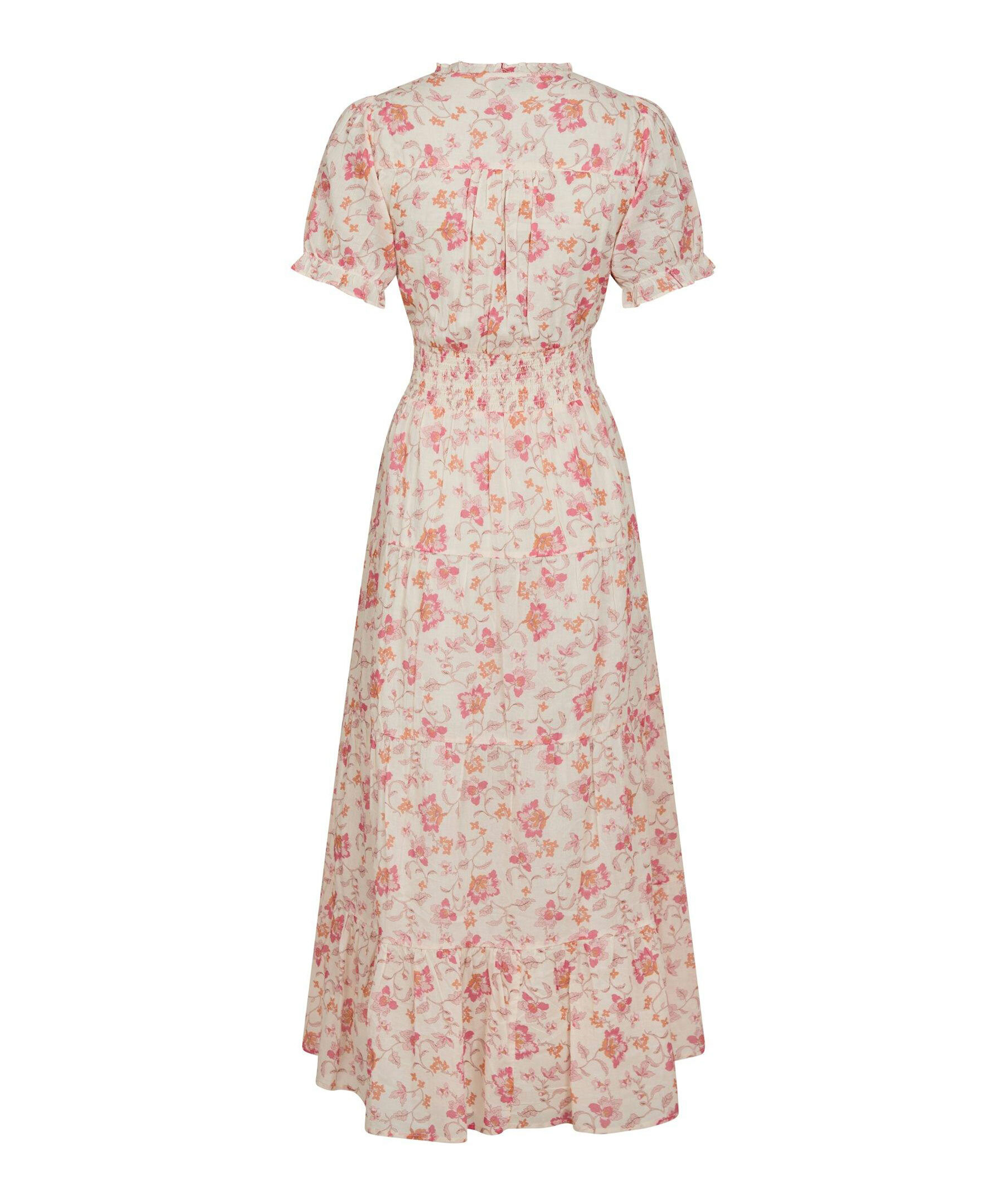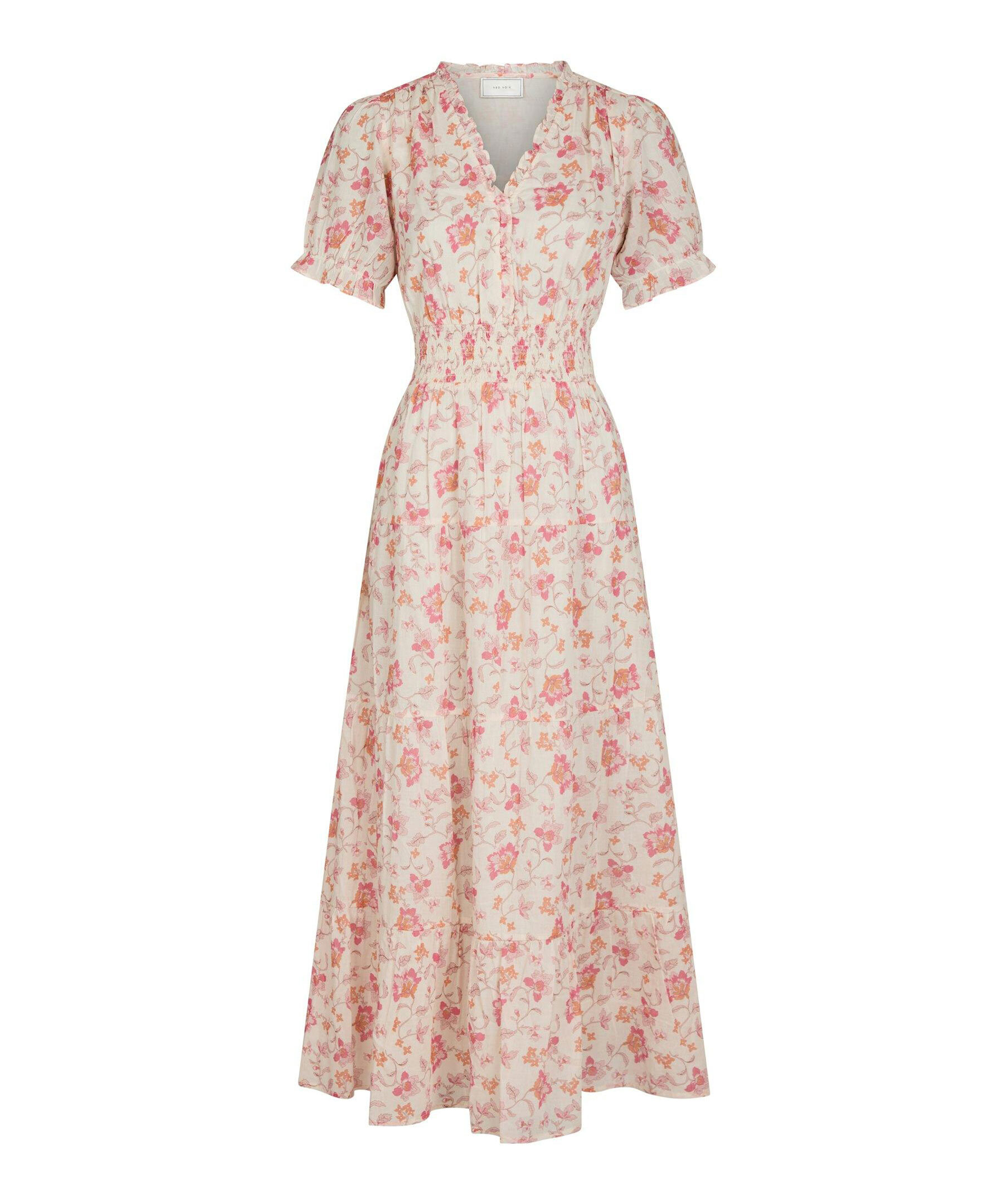 Rosa, blommönstrad långklänning från Neo Noir. Klänningen har korta puffärmar, elastiskt smock i midjan och v-ringad halsringning. Tillverkad i bomull.