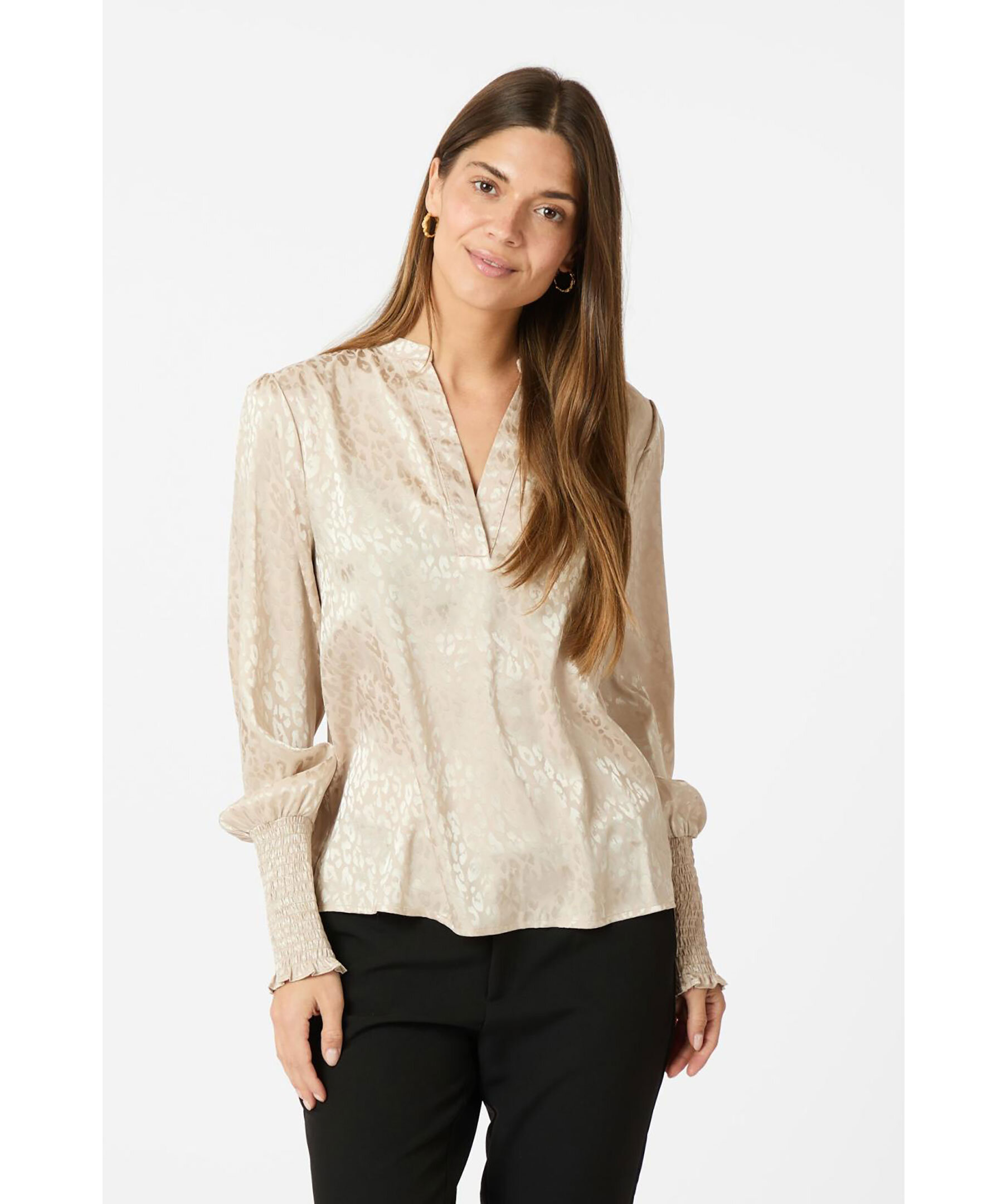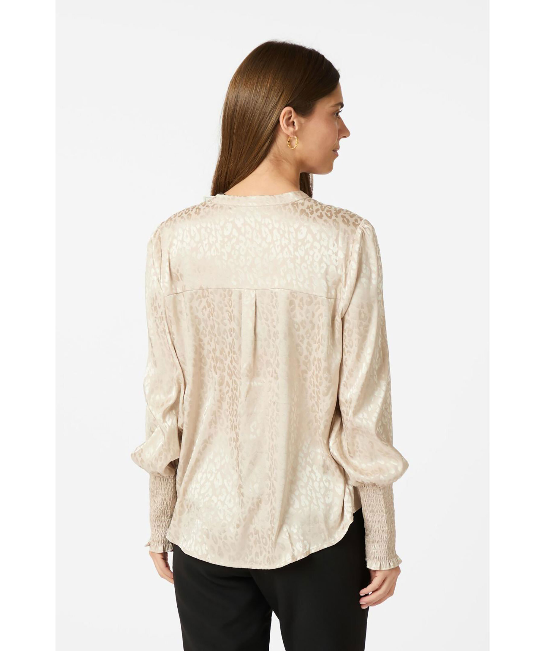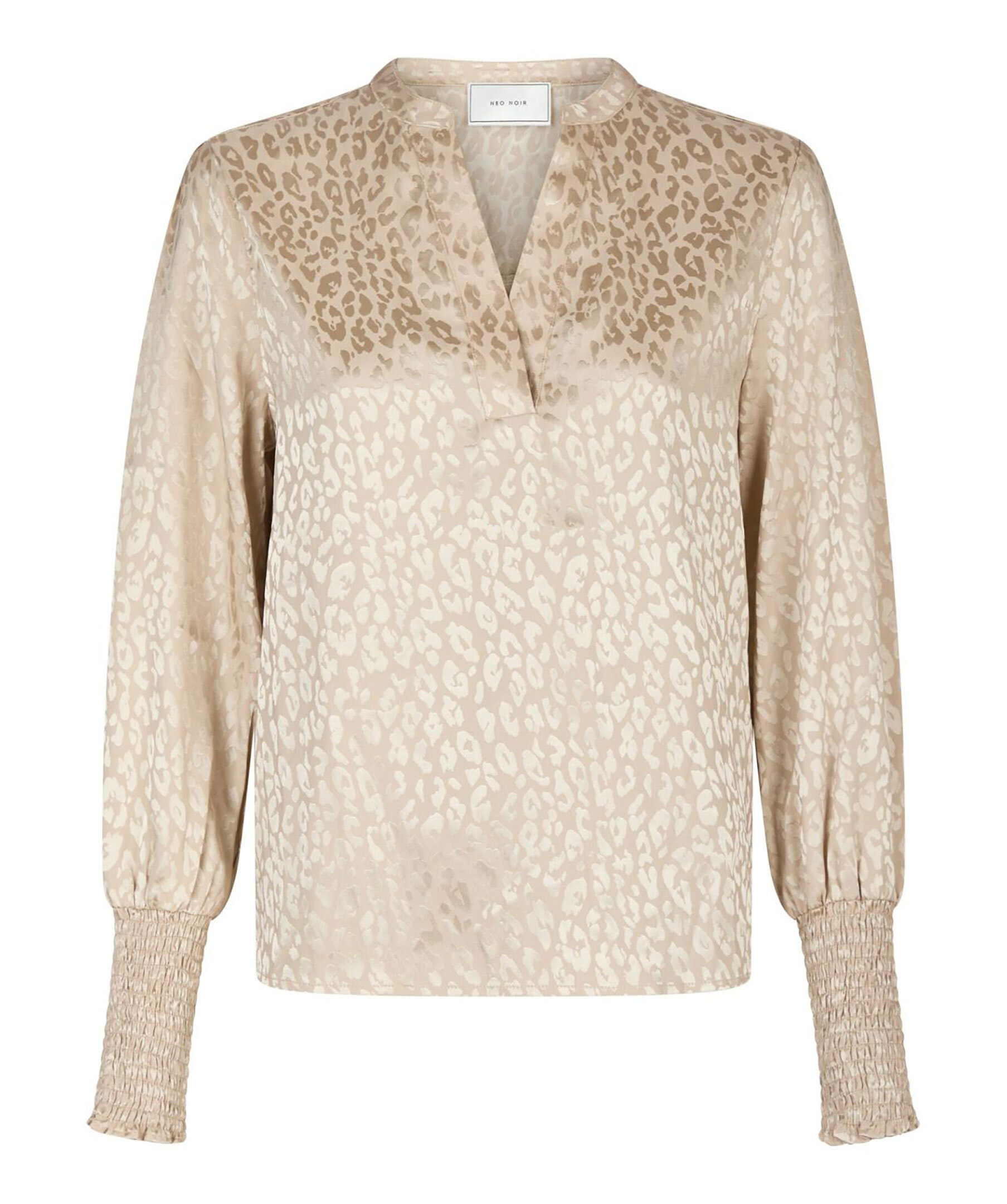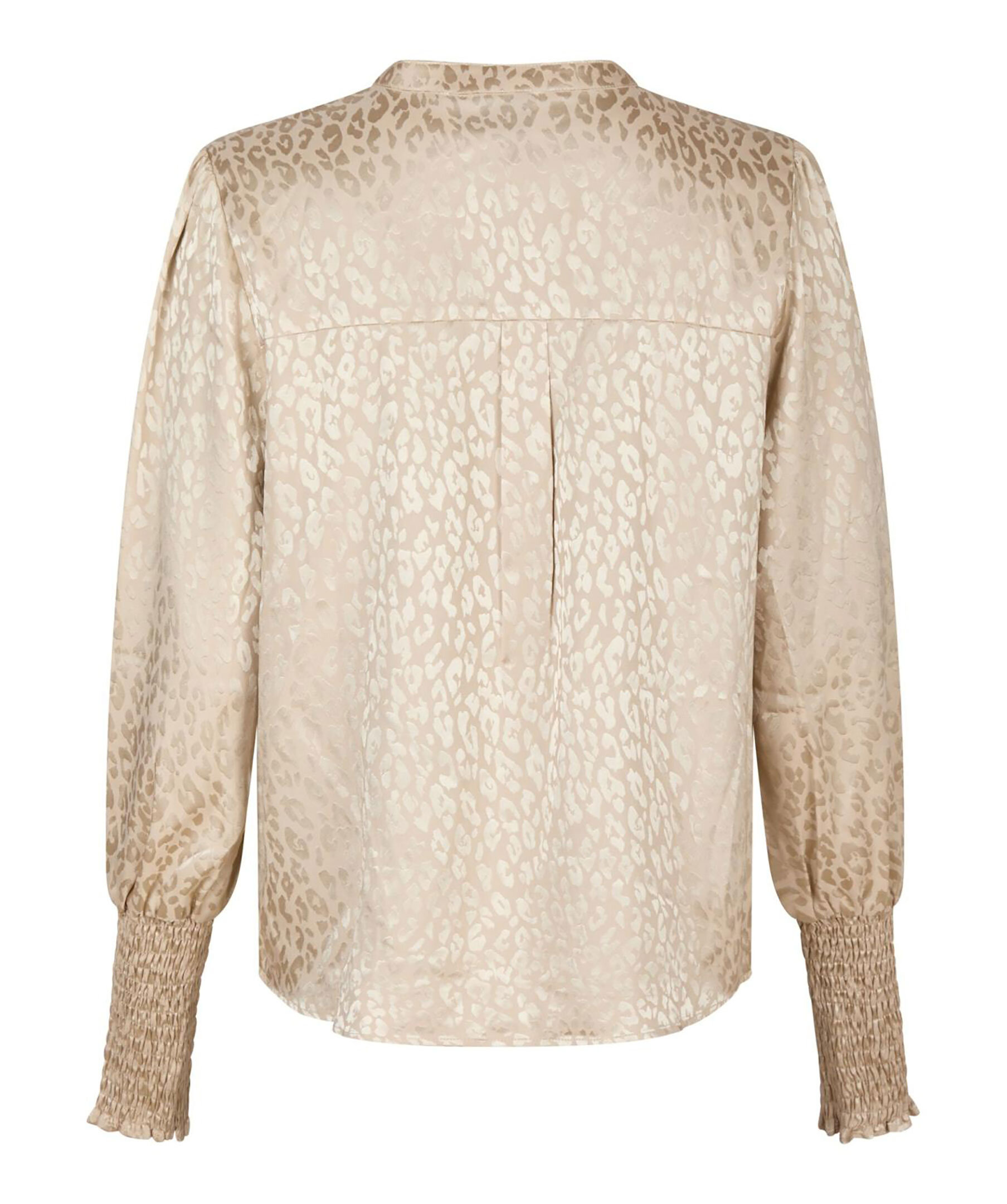 Champagnefärgad blus från Neo Noir. Blusen har leopardmönster, vävt i mjukt satin. smockmanschetter och elegant v-ringning. Tillverkad av polyester.