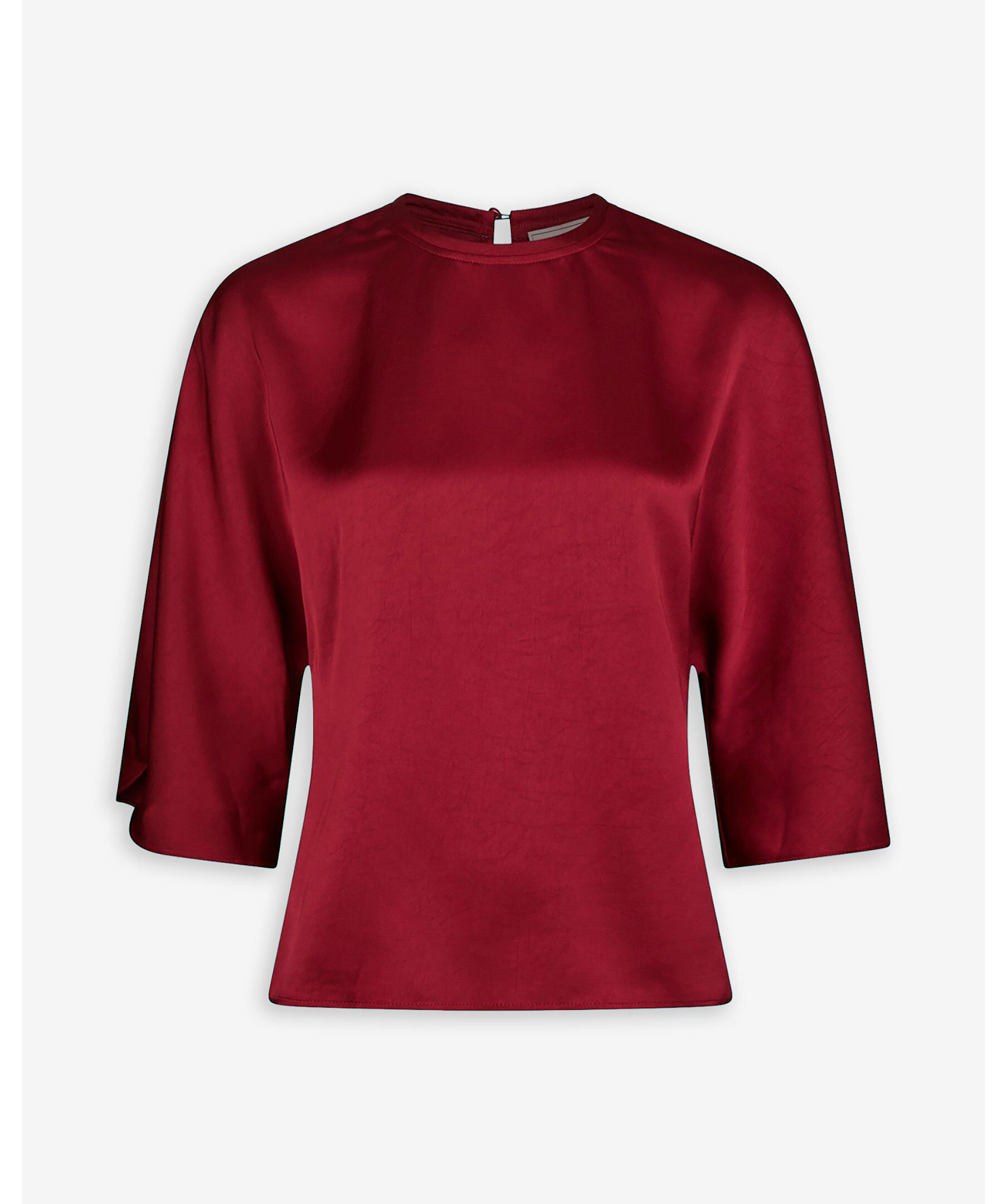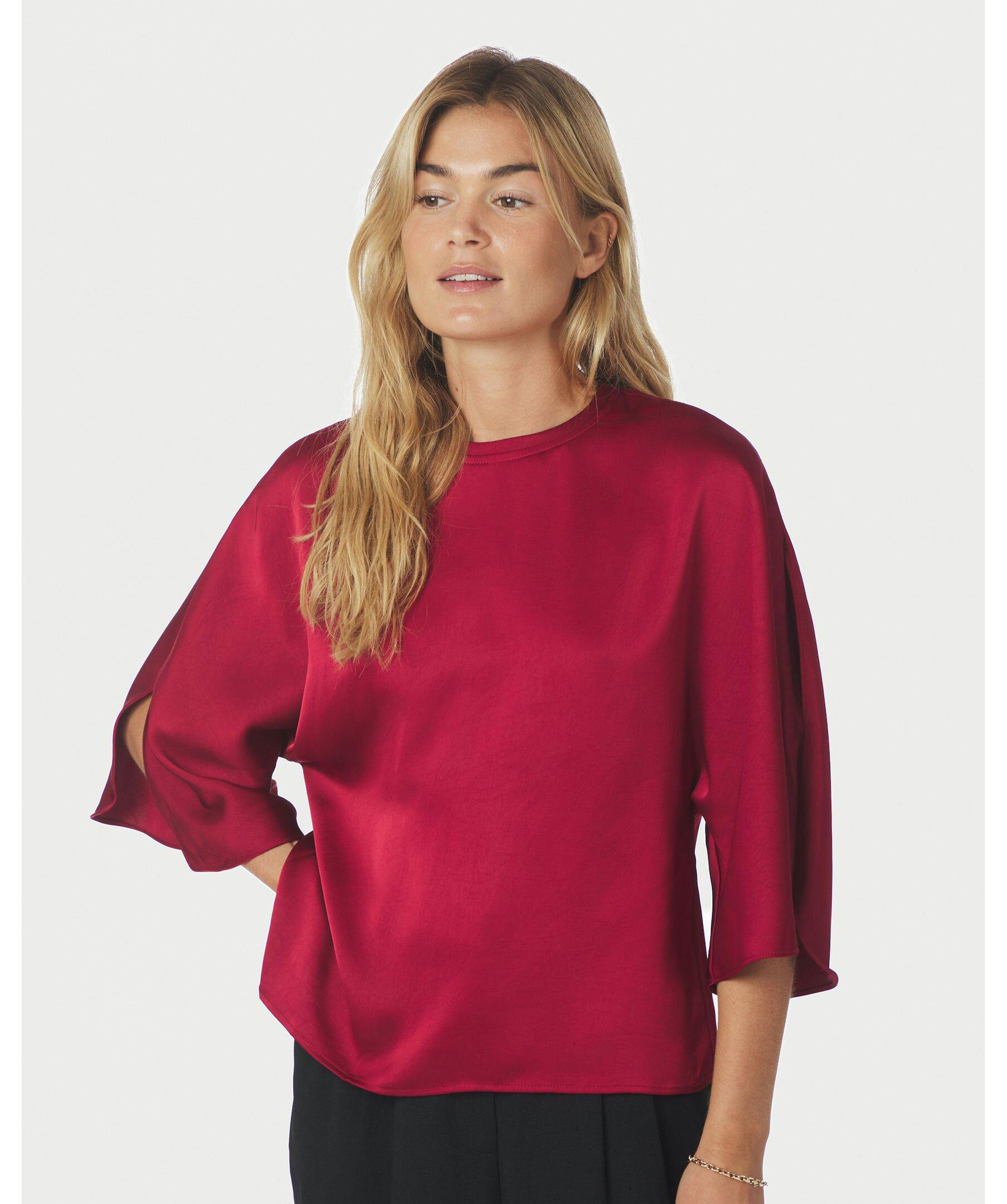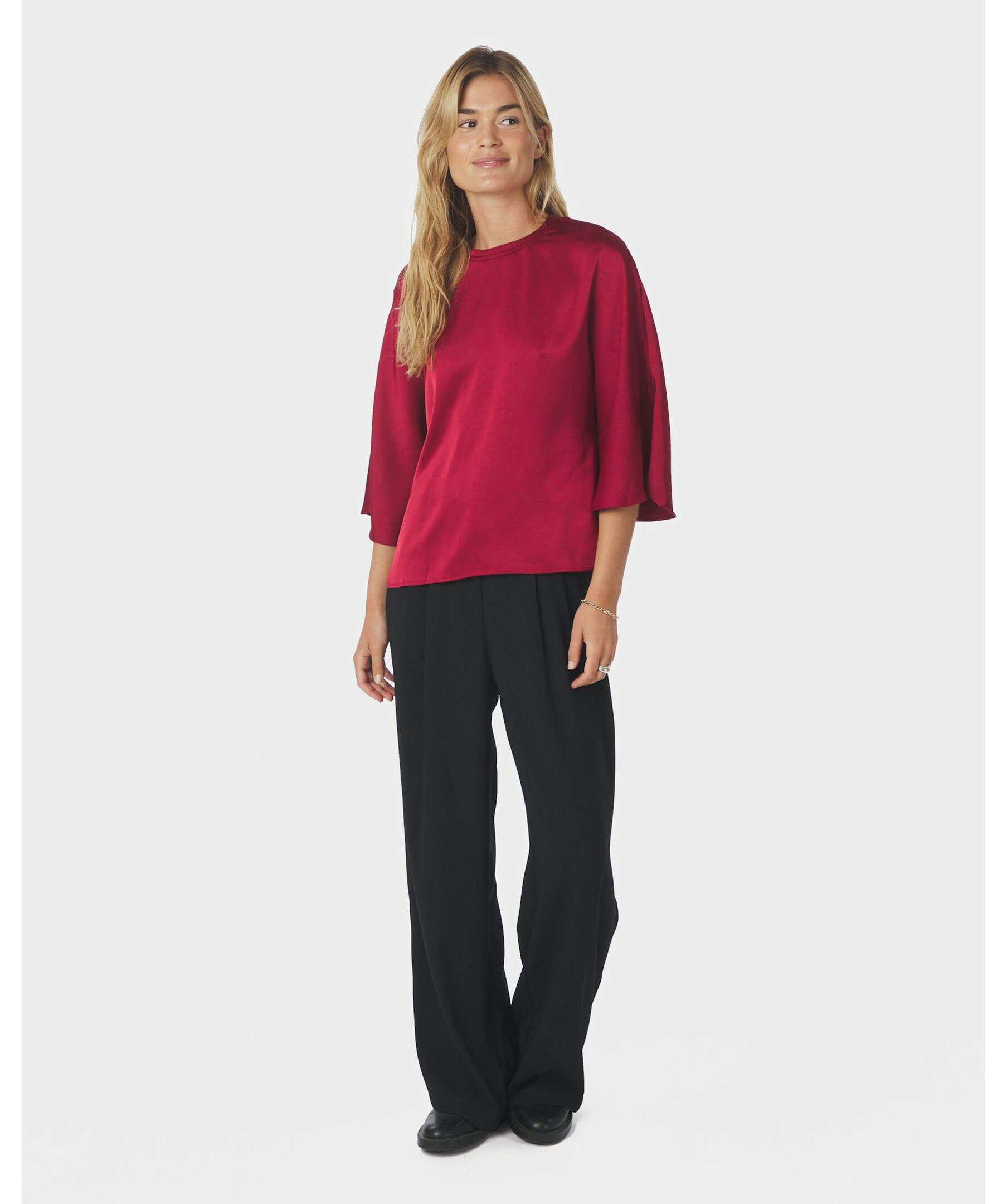 Röd blus i satinkvalitet från Neo Noir. Blusen har rund halsringning med knappstängning baktill samt trekvartslånga ärmar med slits.