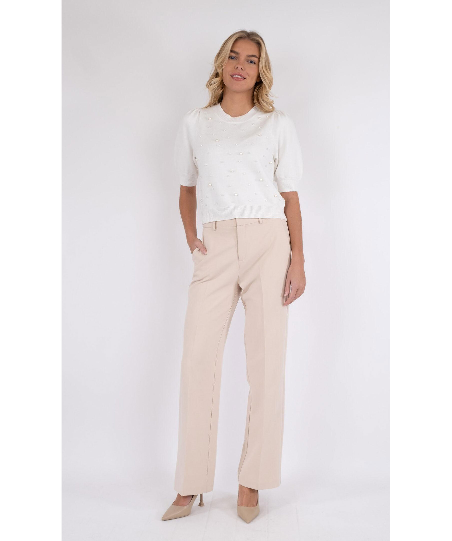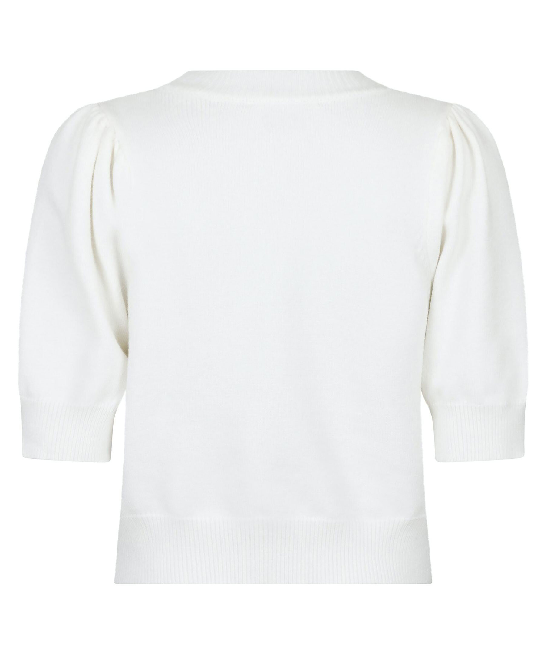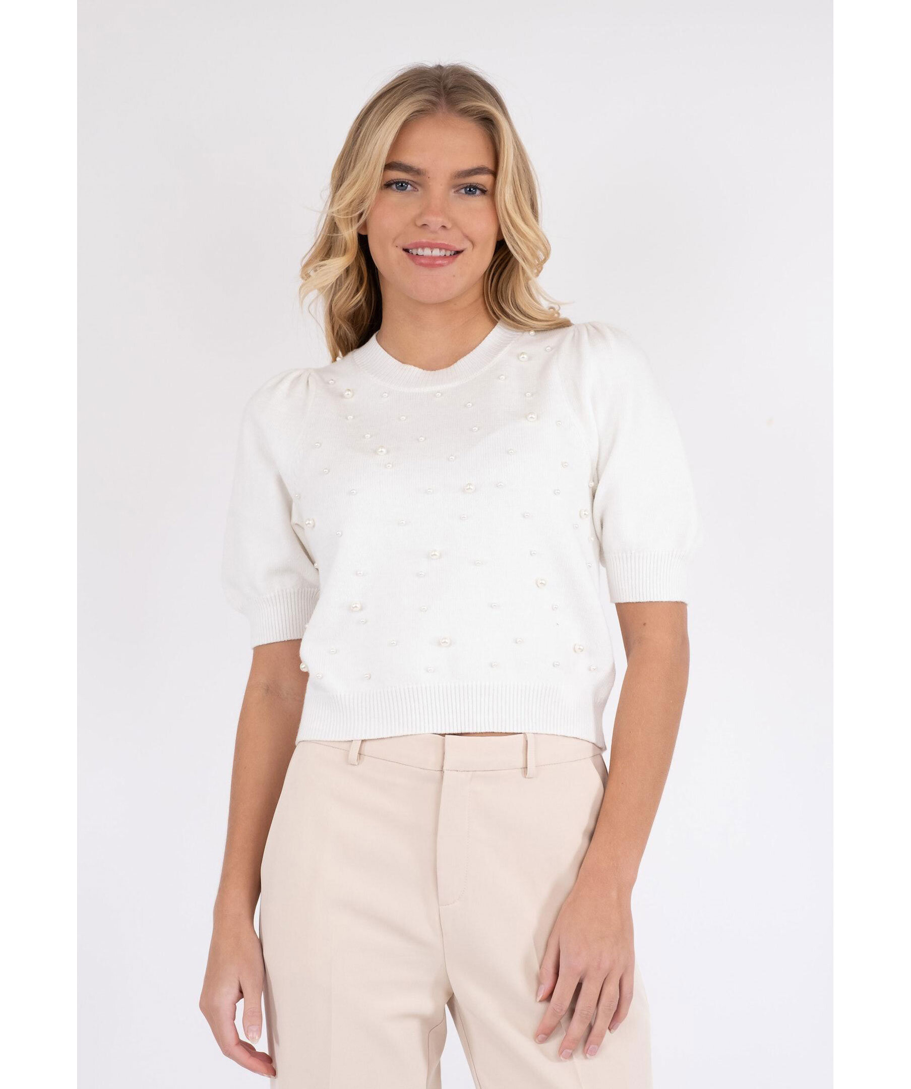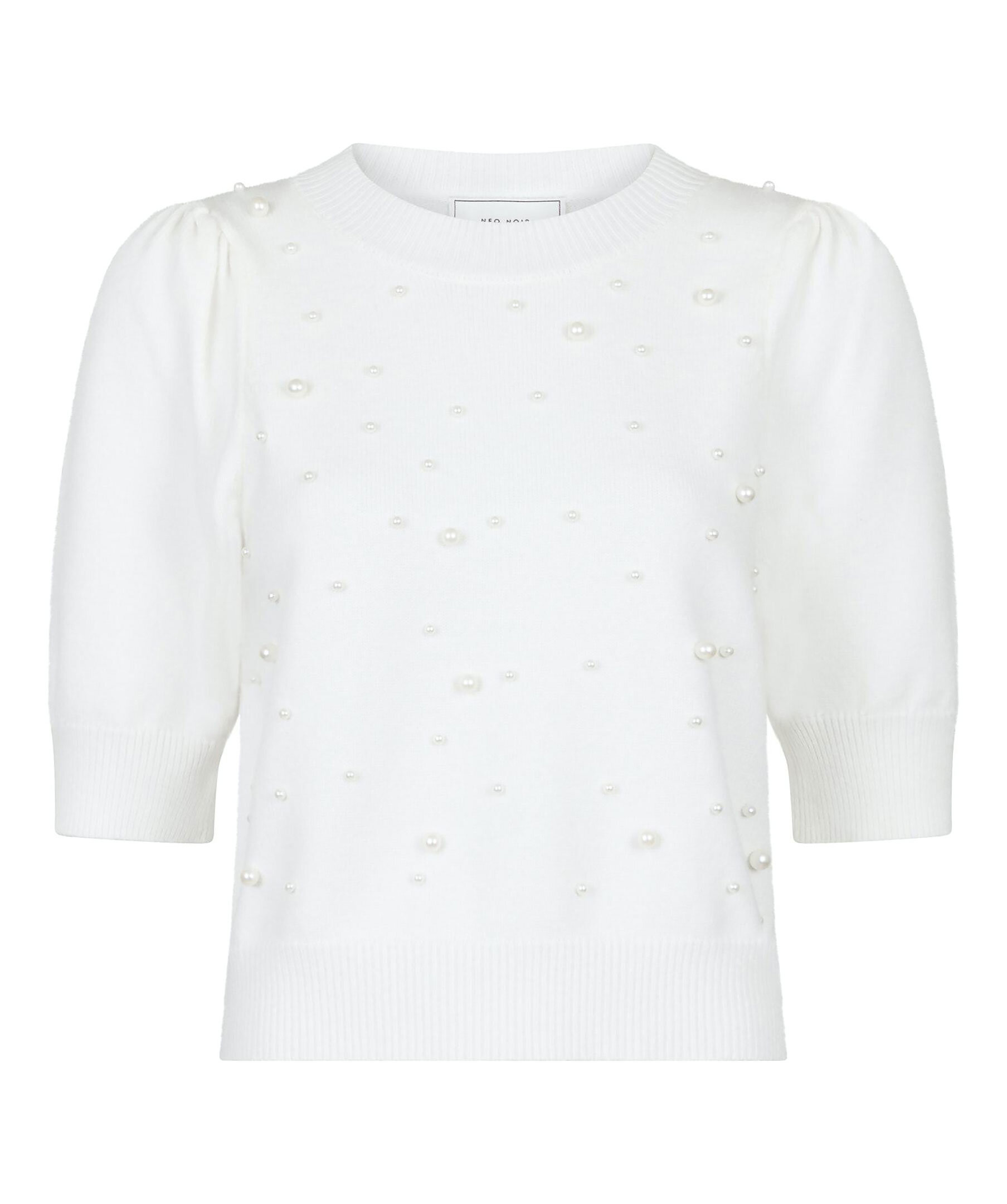 Vit stickad kortärmad tröja med pärlor från Neo Noir. Rundad halsringning med ribbstickad mudd. Puffärmar med ribbstickade ärmslut. Tillverkad i Viskos blandning.