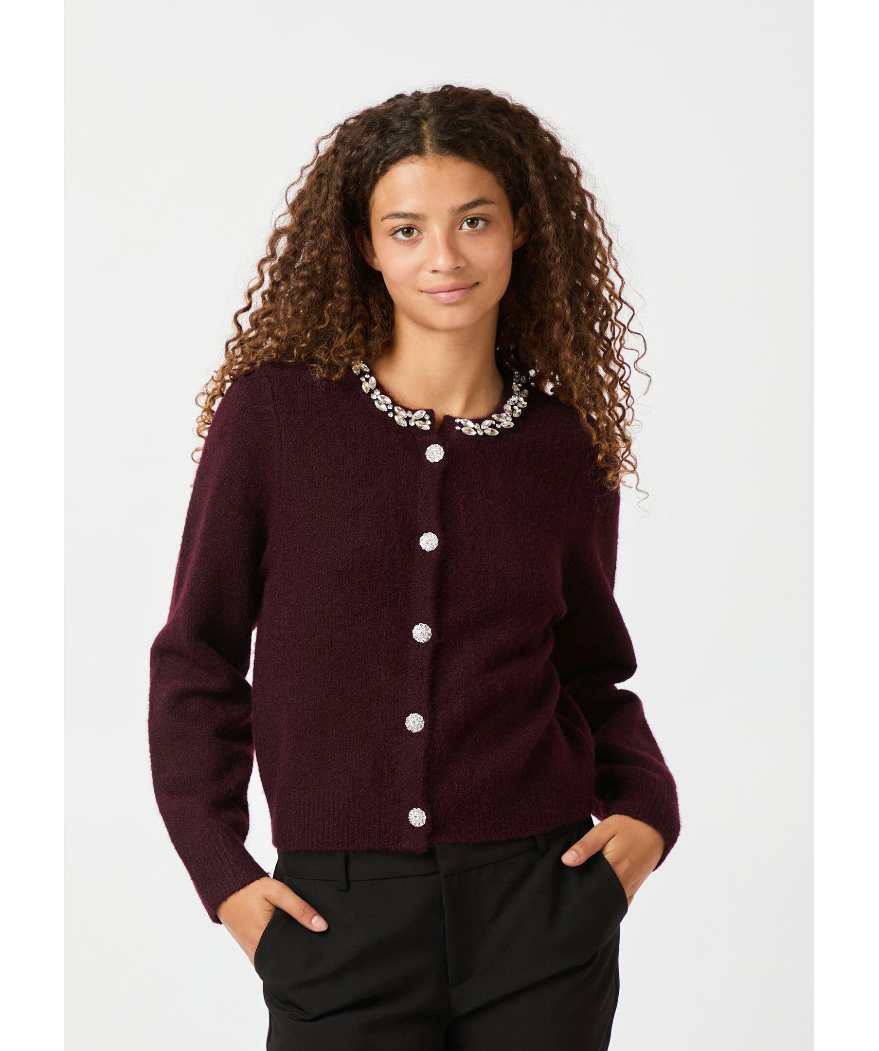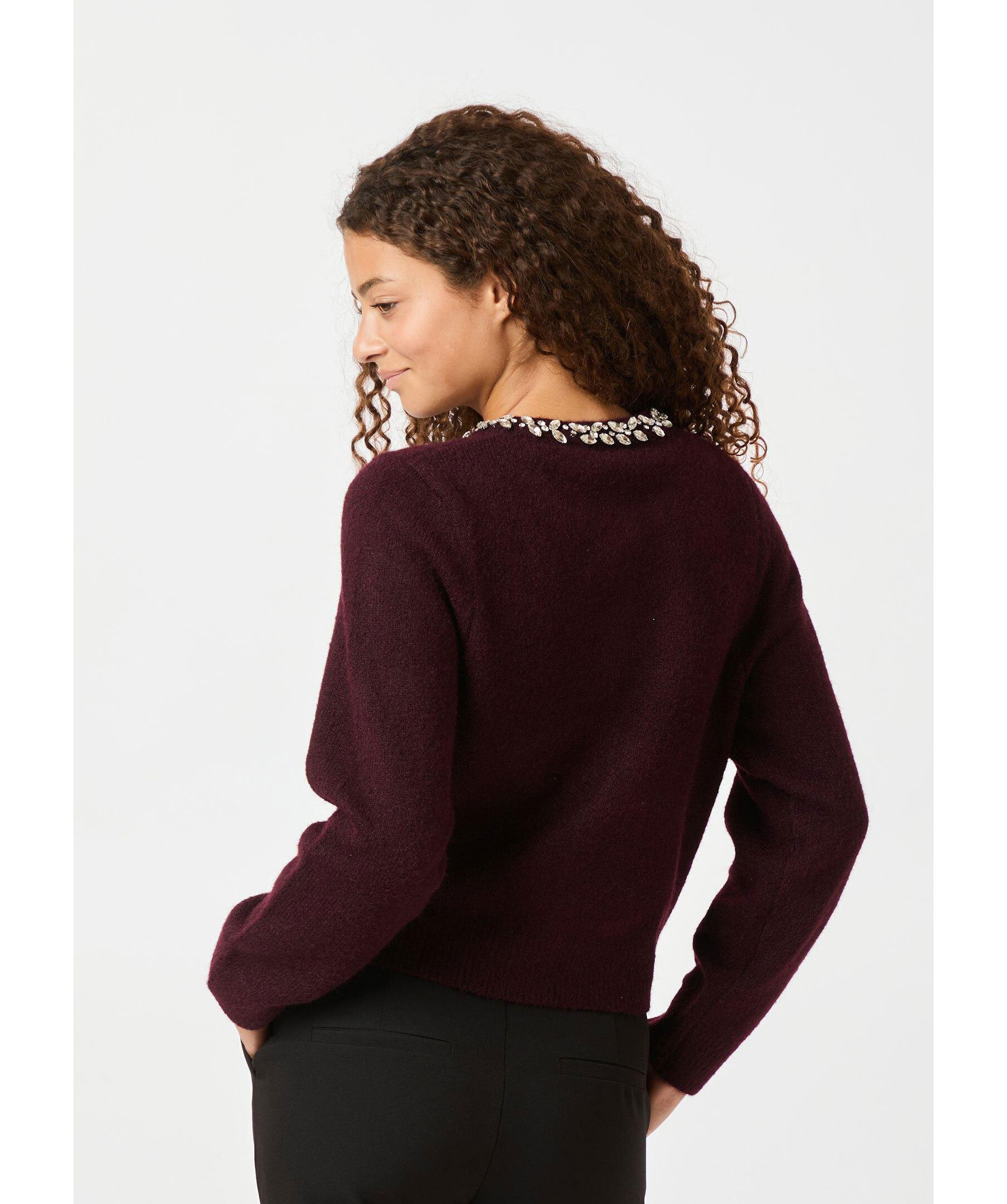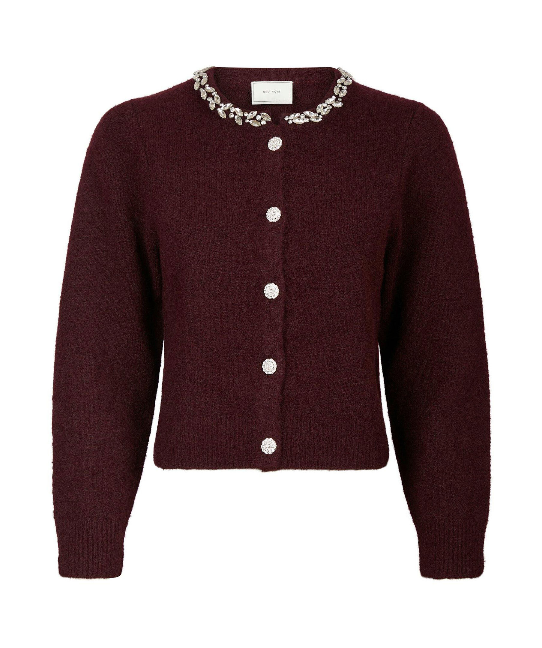 Vinröd stickad kofta från Neo Noir. Koftan har riministenar längs halsringningen och som knappar. Tillverkad i en ullblandning.