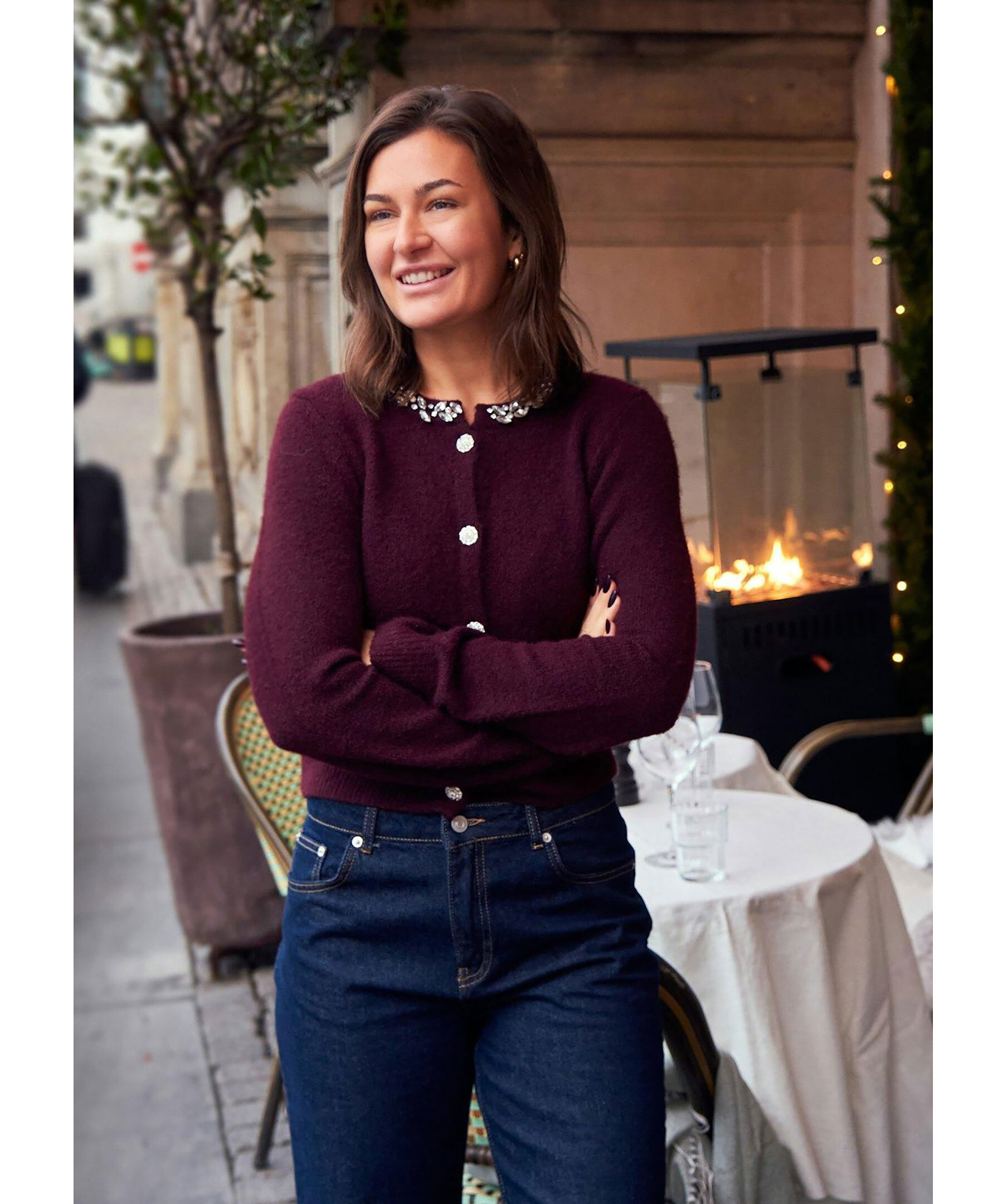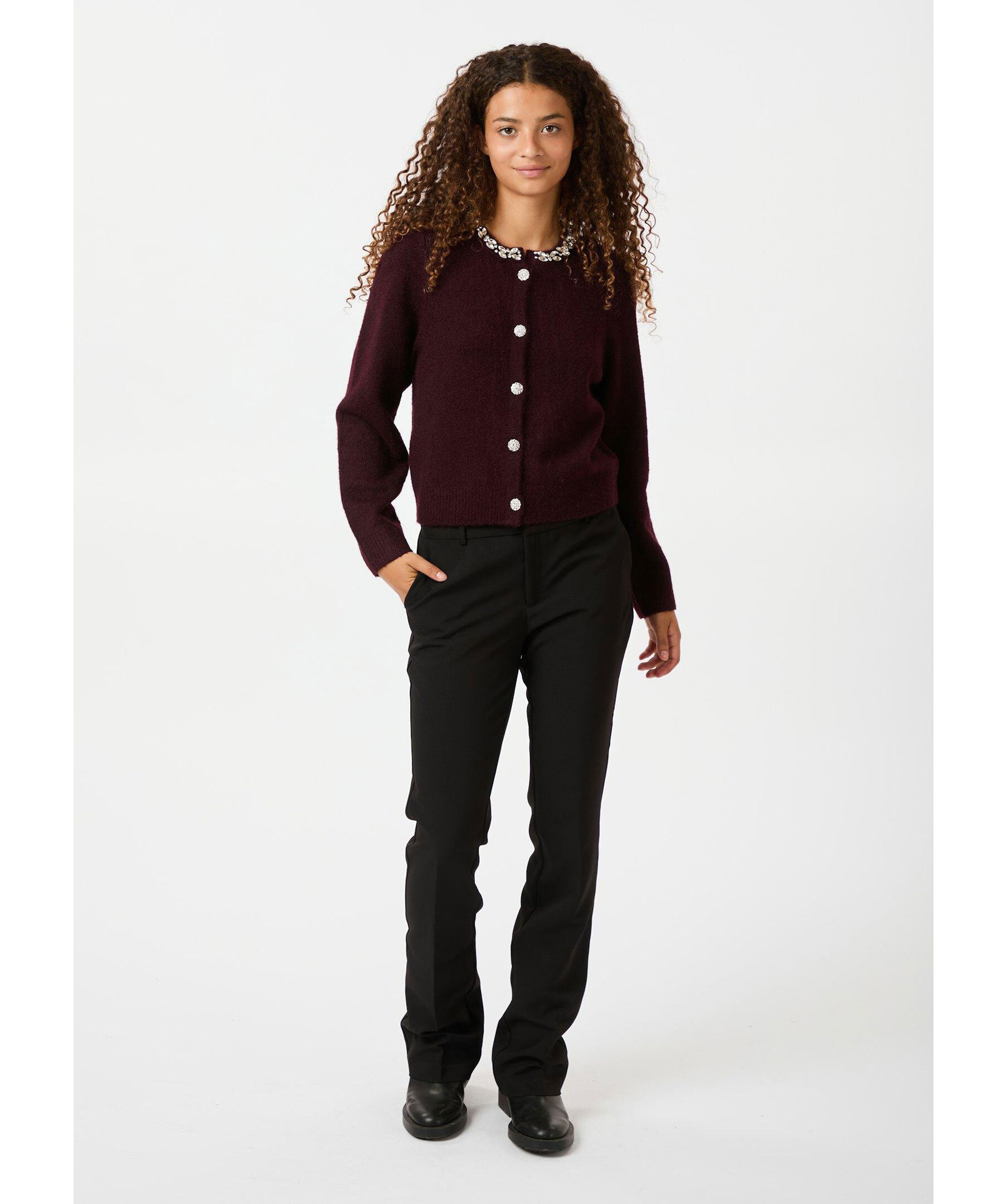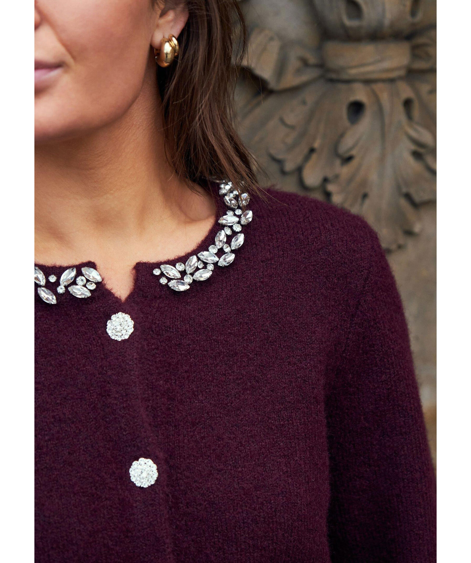 Vinröd stickad kofta från Neo Noir. Koftan har riministenar längs halsringningen och som knappar. Tillverkad i en ullblandning.