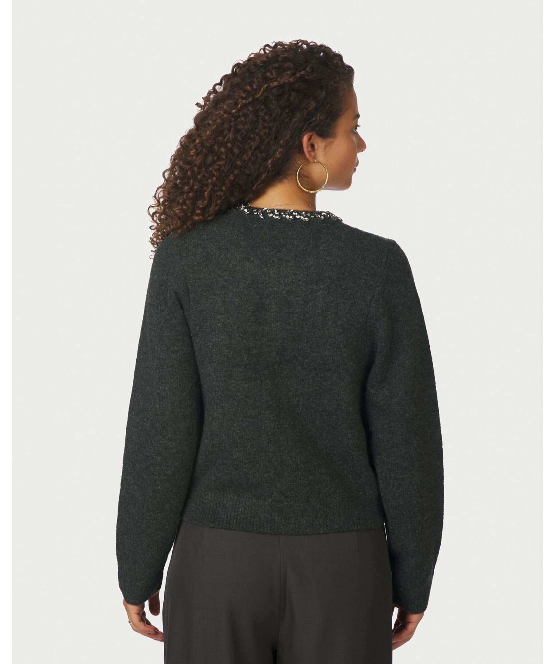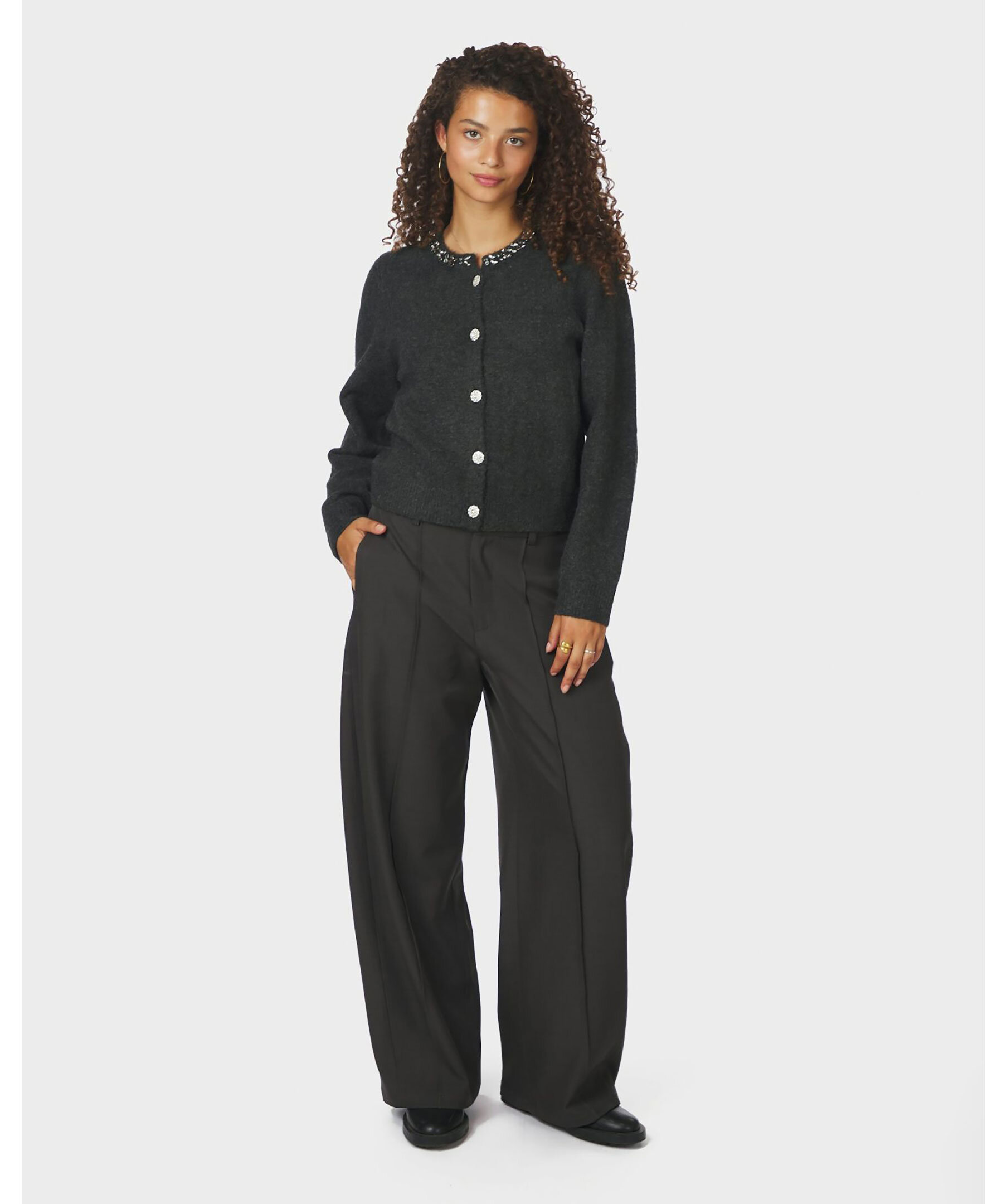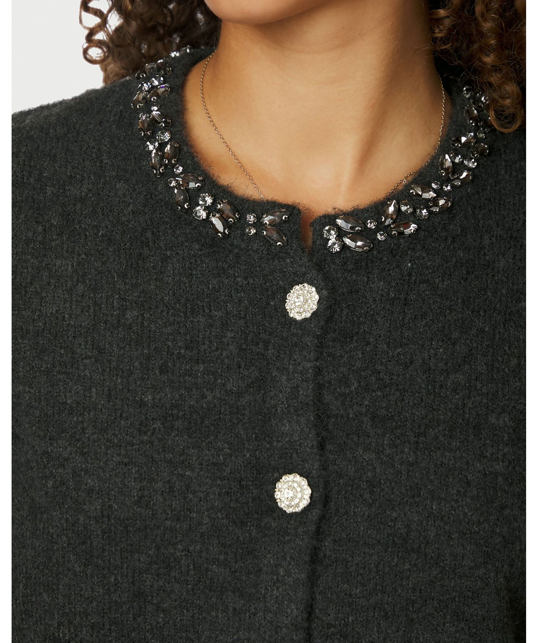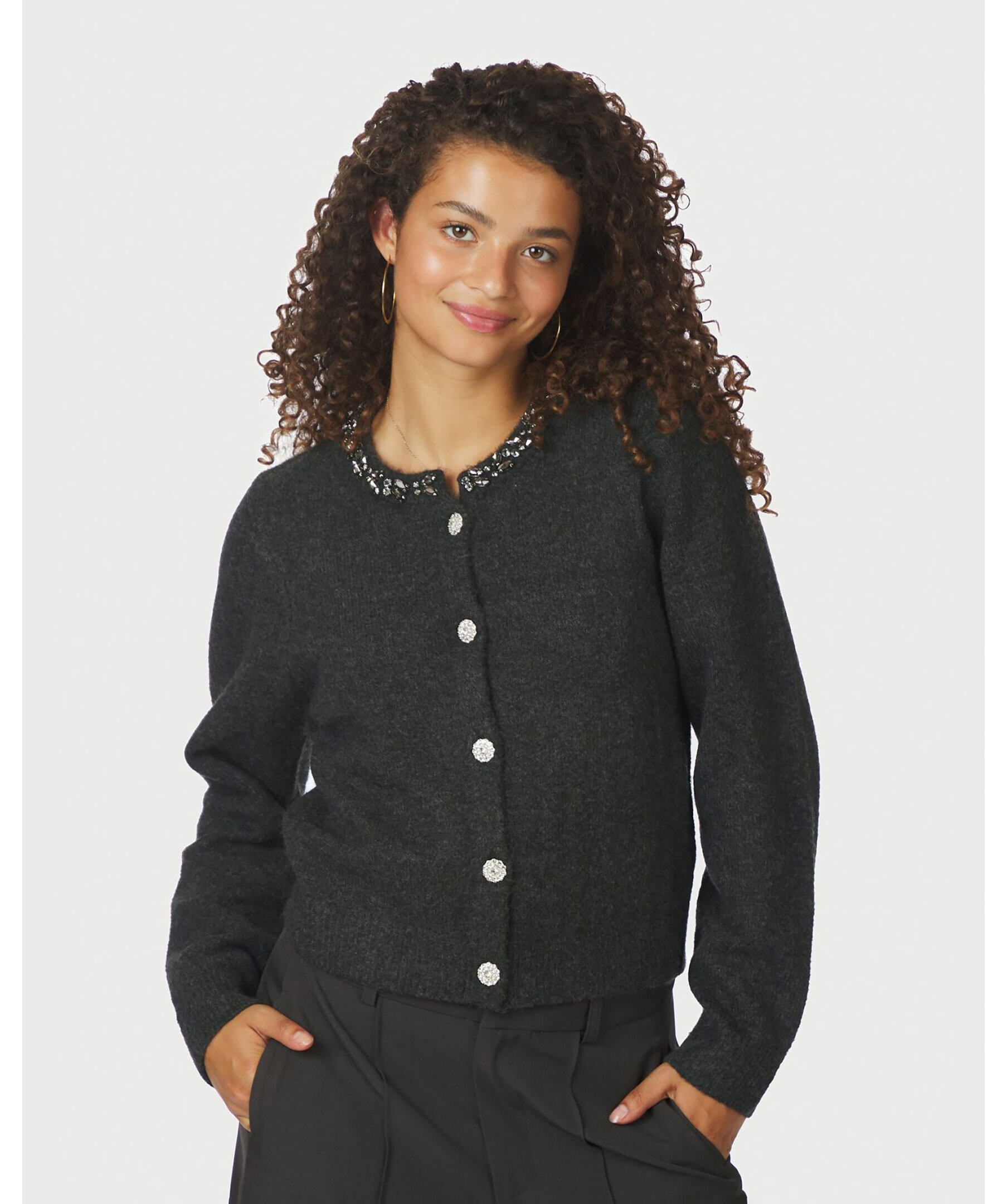 Stickad kofta från Neo Noir med rund hals, dekorerad med glittrande stenar. Modellen har dekorativa knappar framtill och är stickad i en mjuk blandning av polyester, akryl, ull och elastan.
