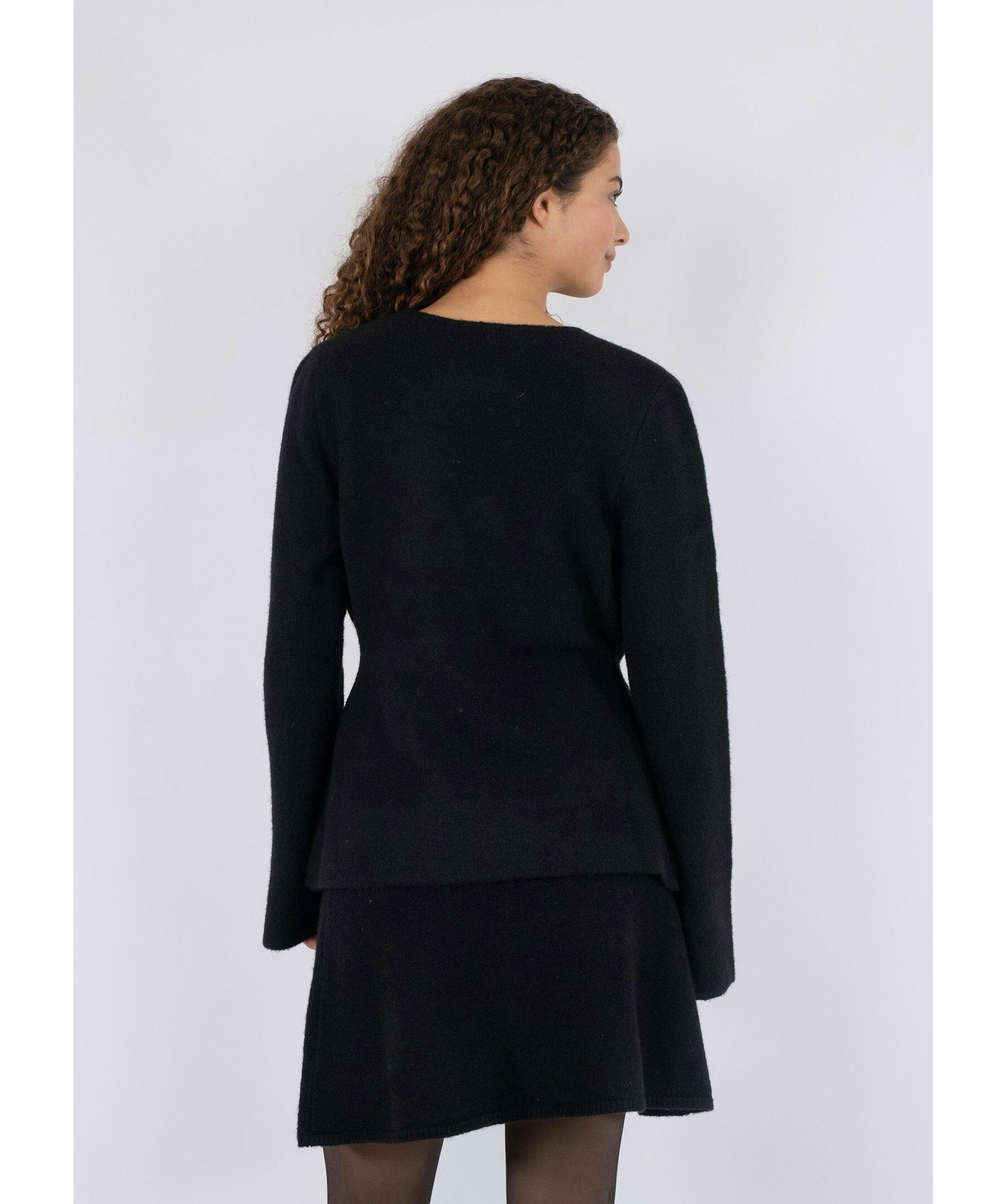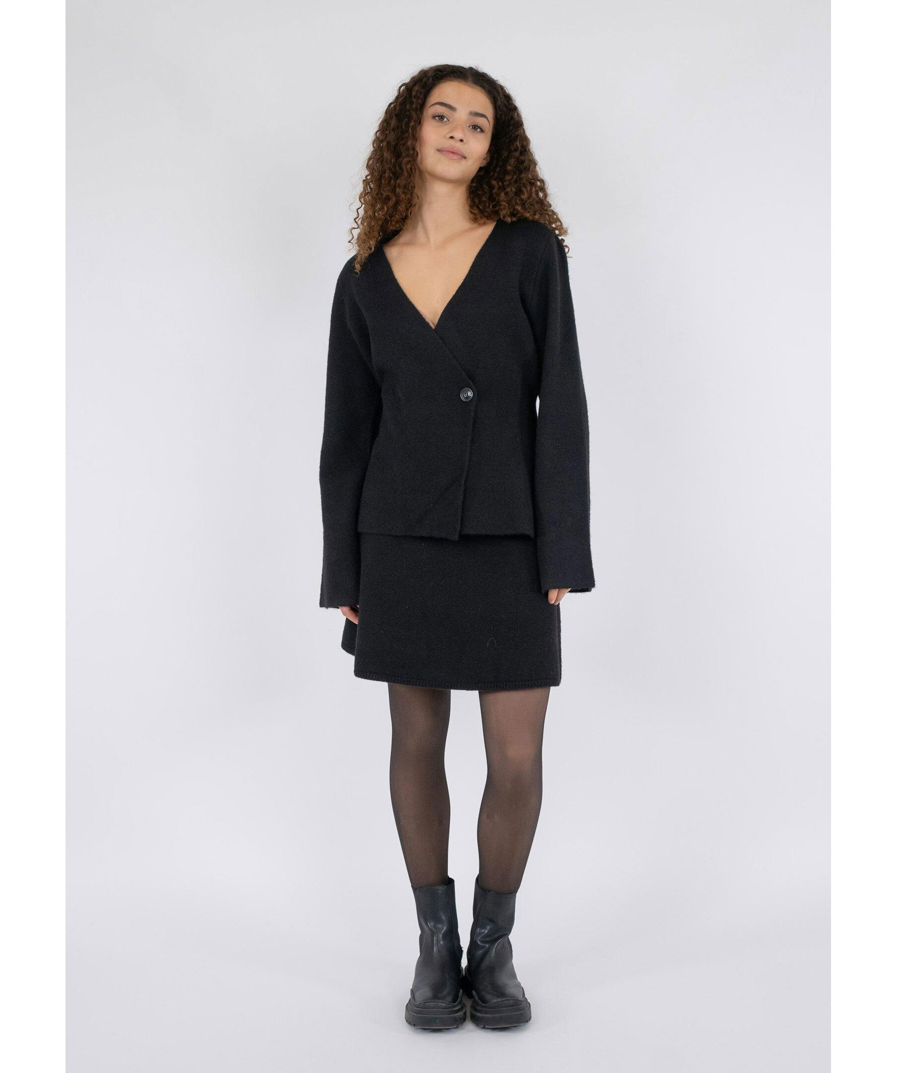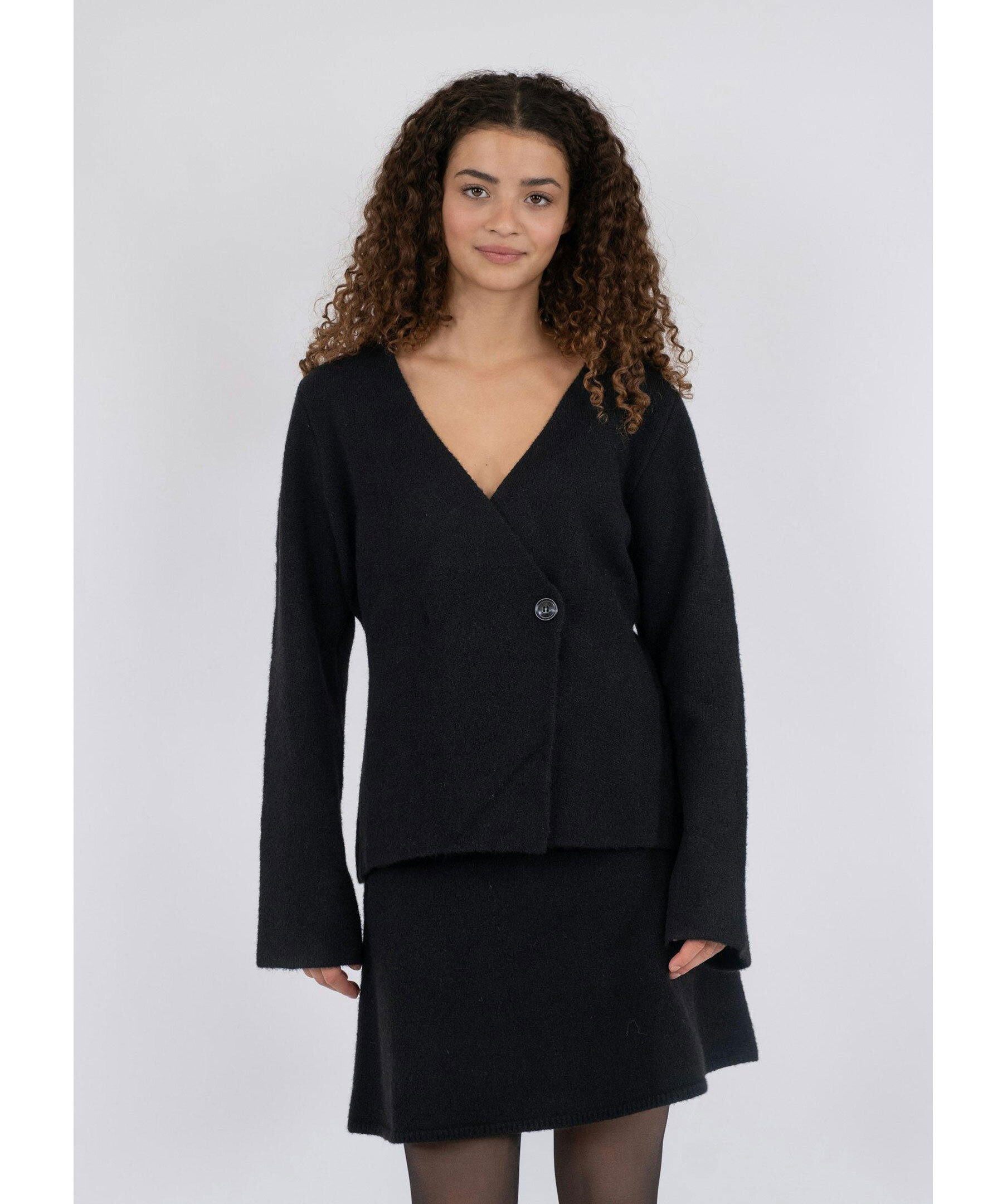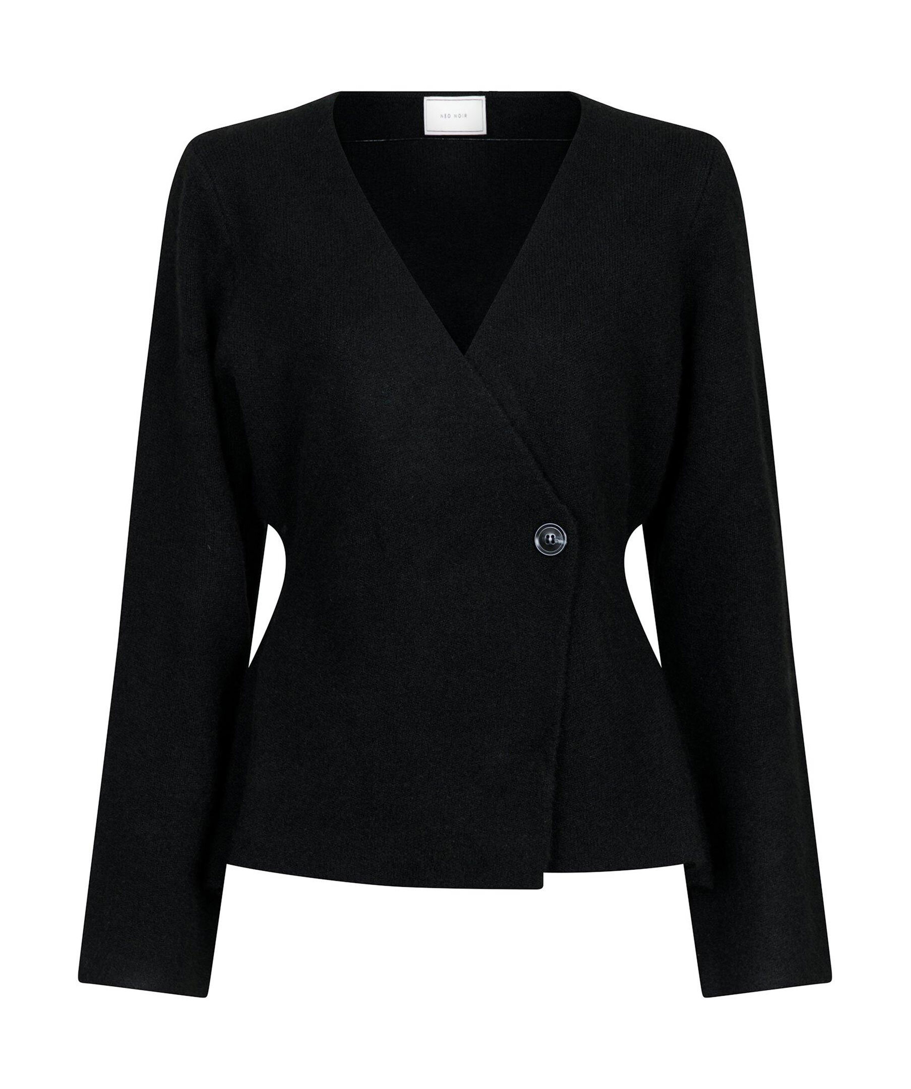 Svart, stickad kofta från Neo Noir. Koftan har timglasform för en feminin look och stängs med en knapp. Tillverkad i en polyester- och ullblandning.