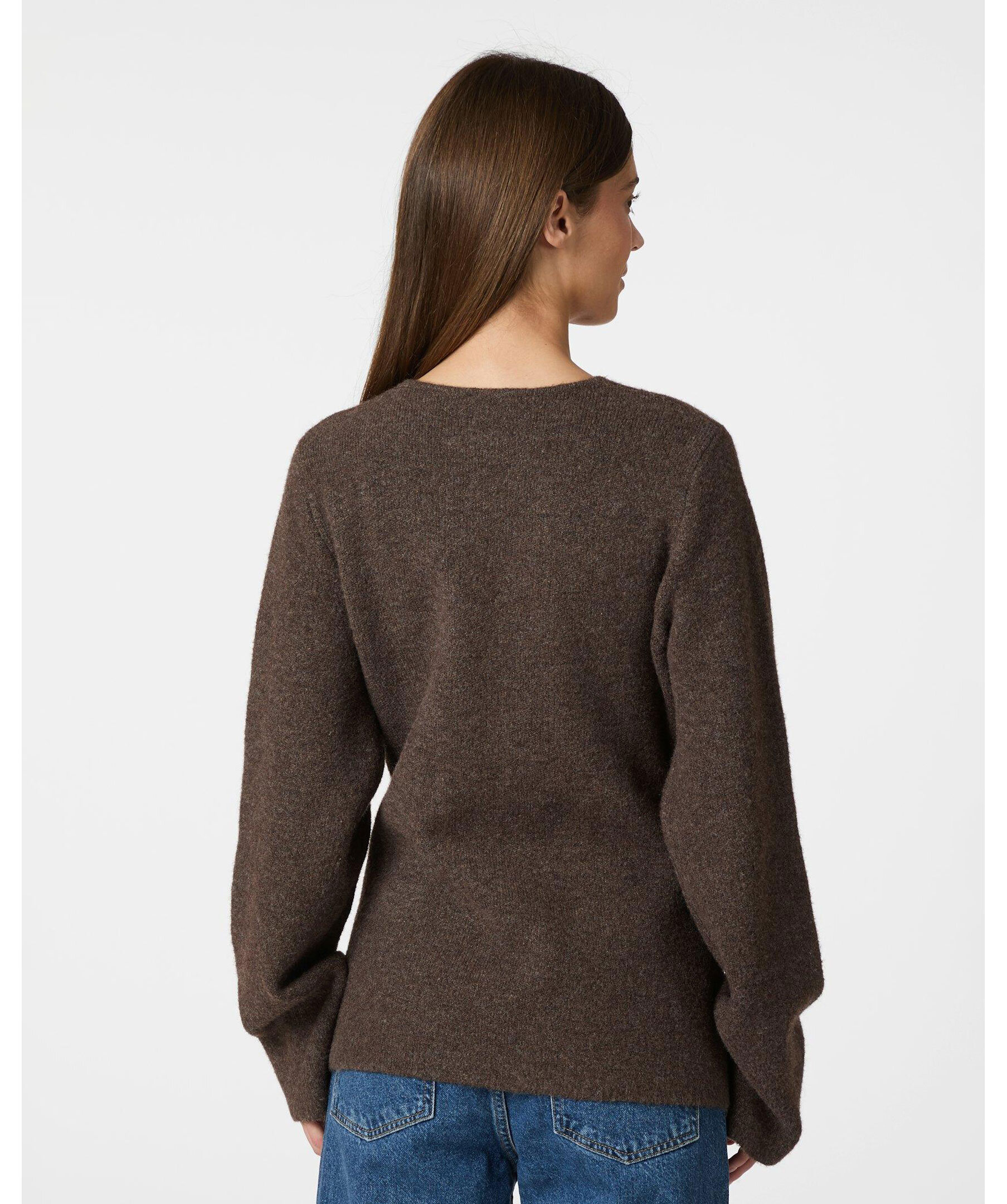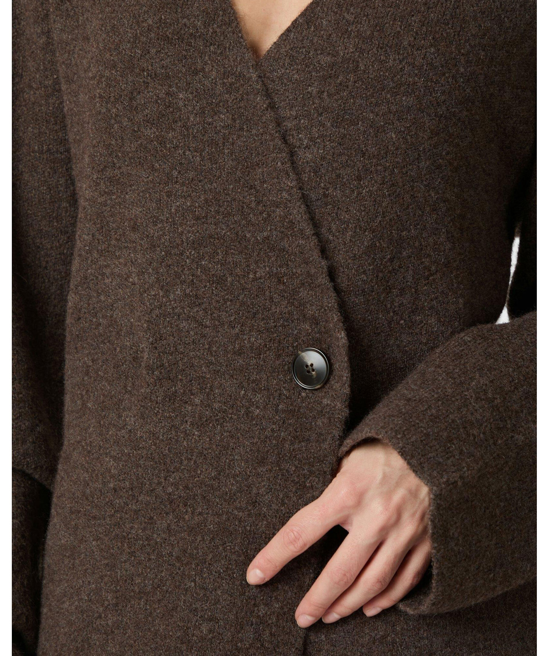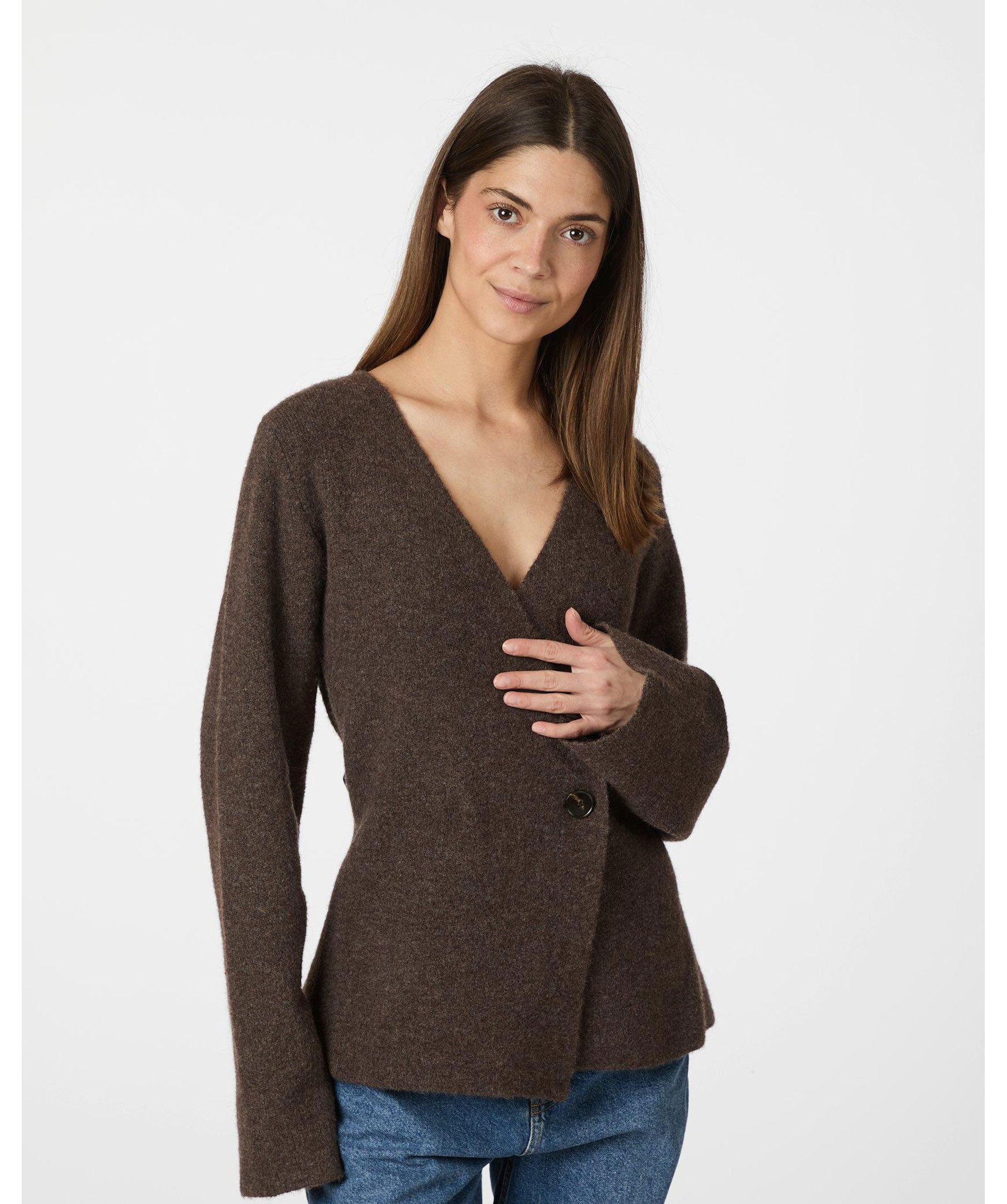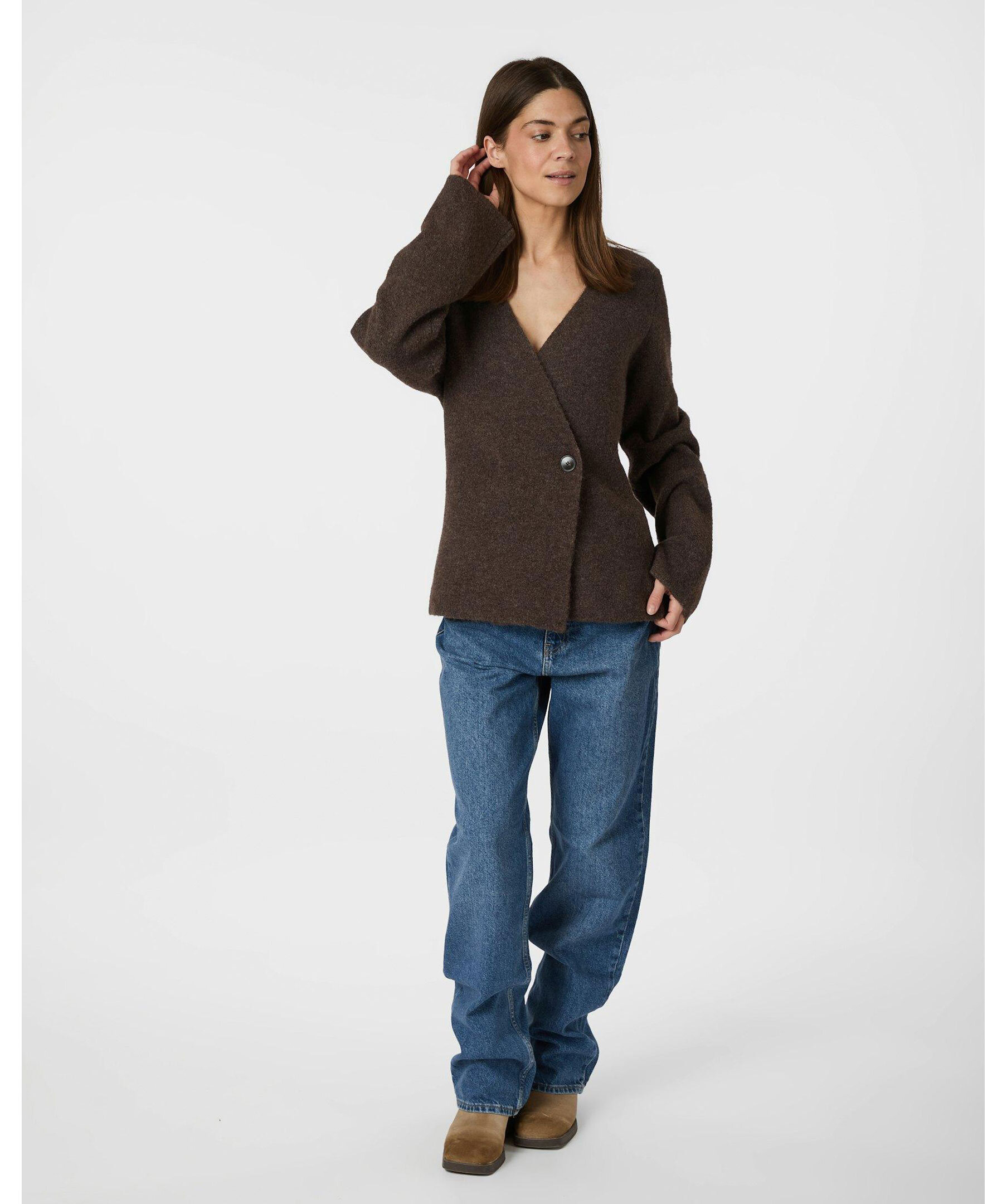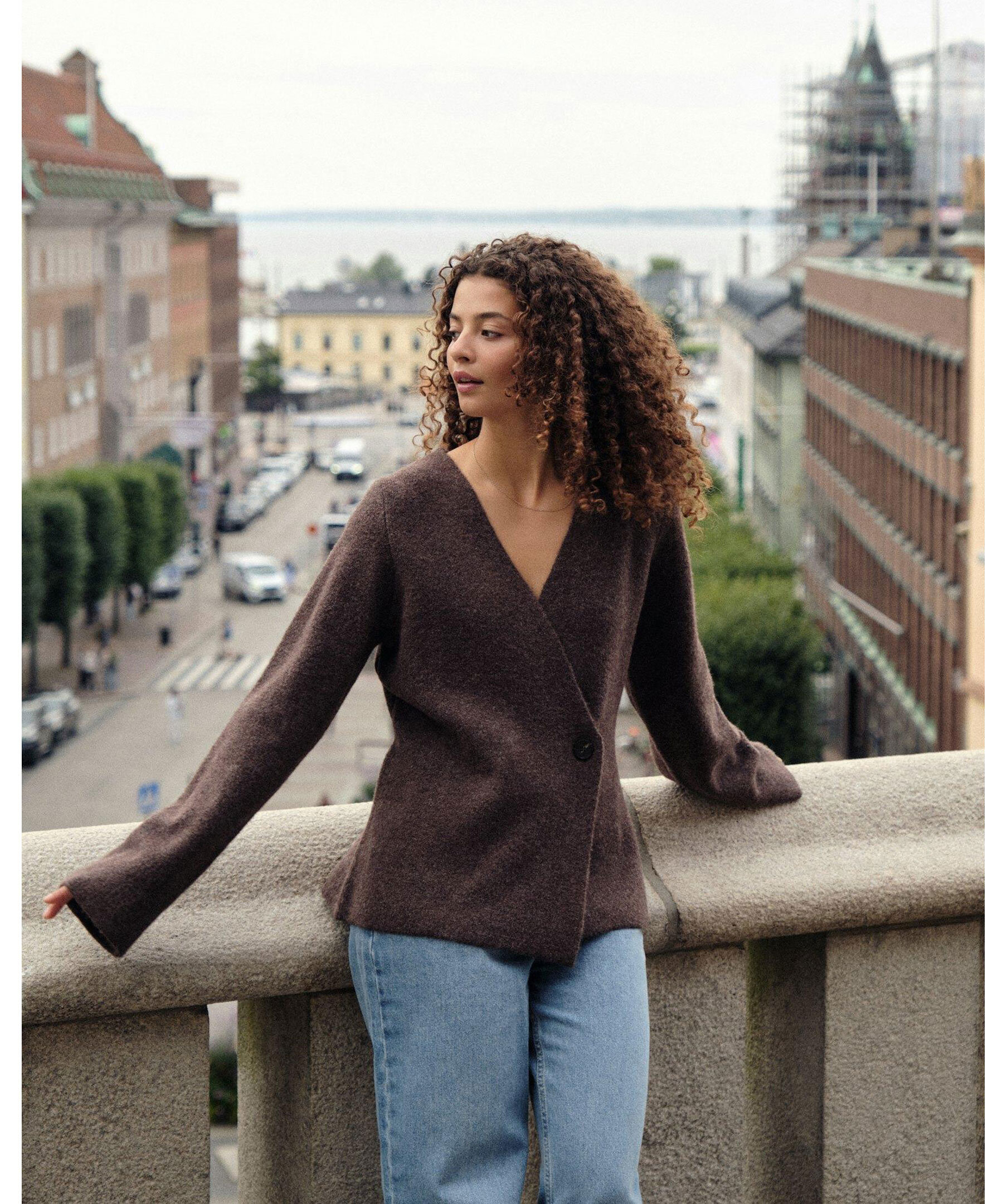 Brun, stickad kofta från Neo Noir. Koftan har timglasform för en feminin look och stängs med en knapp. Tillverkad i en polyester- och ullblandning.