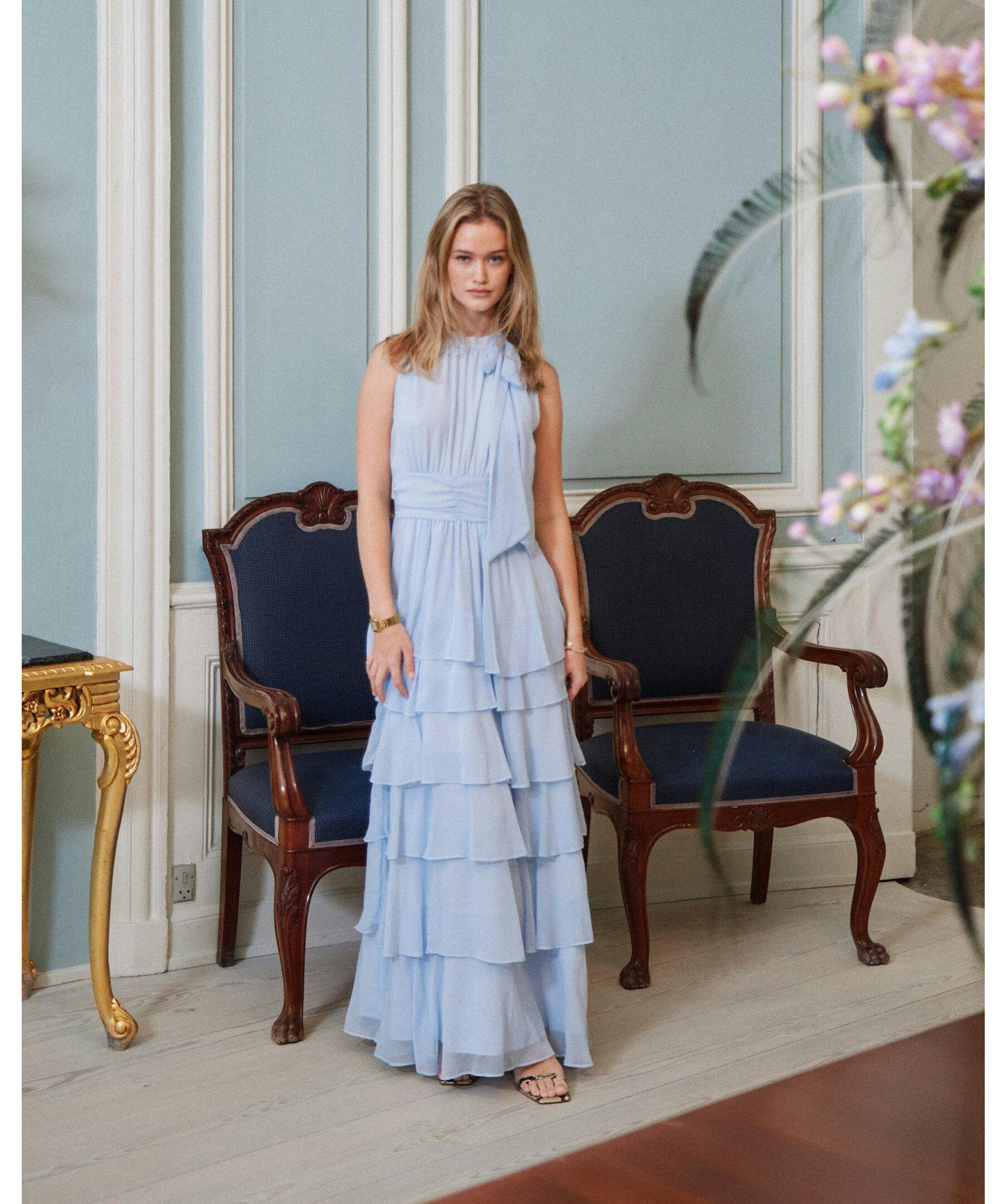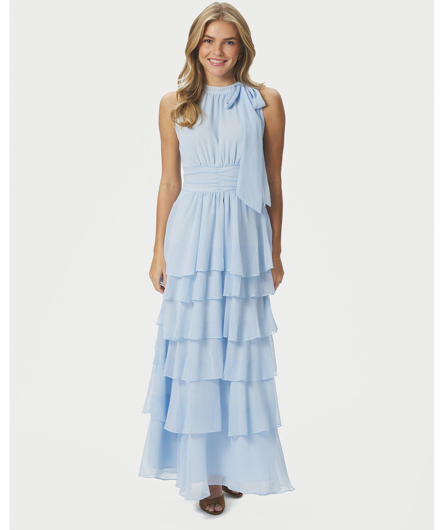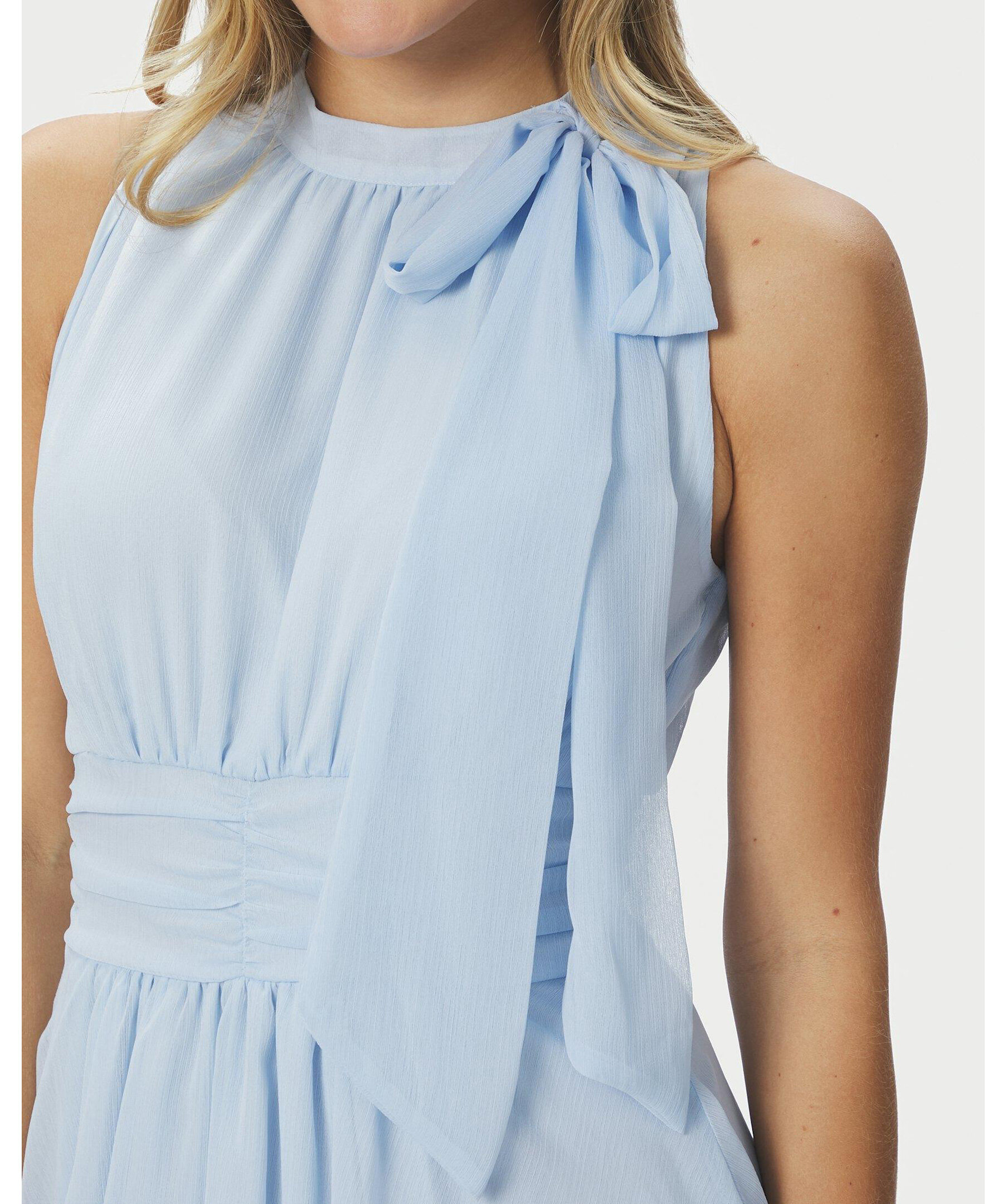 Ljusblå lång klänning med halterneck och rosettrem vid halsringningen. Kommer i en härlig chiffonkvalitet. Modellen är 176 cm lång och bär storlek 36.