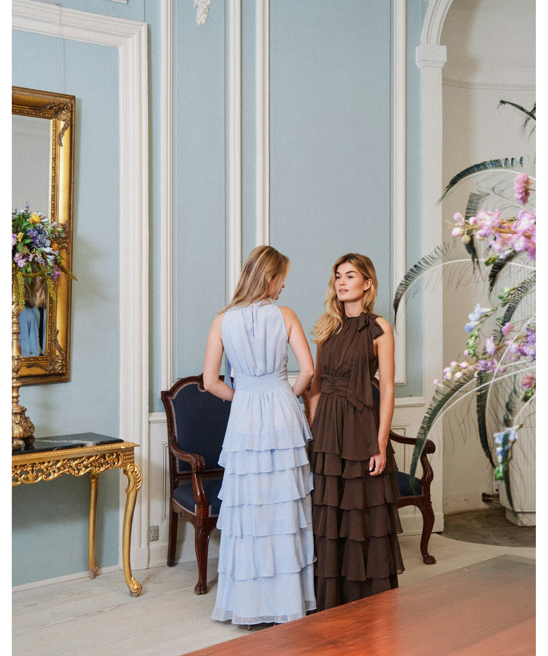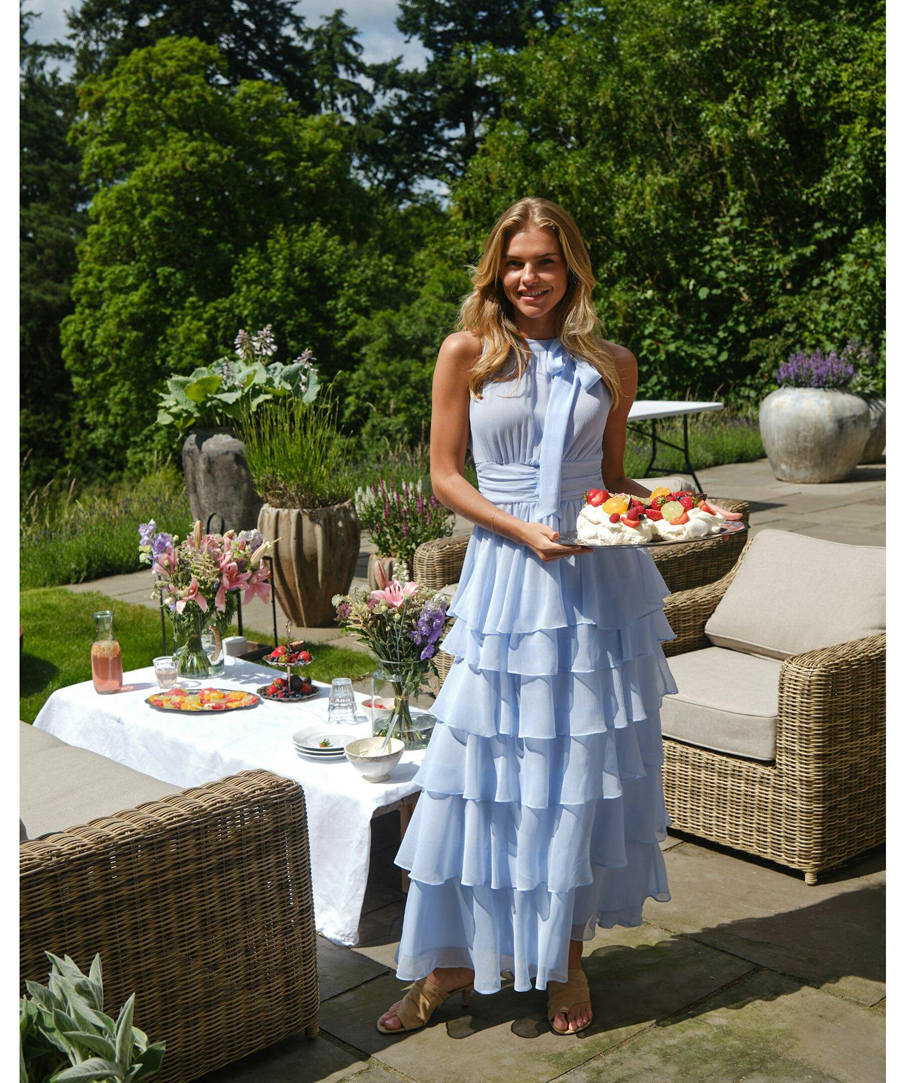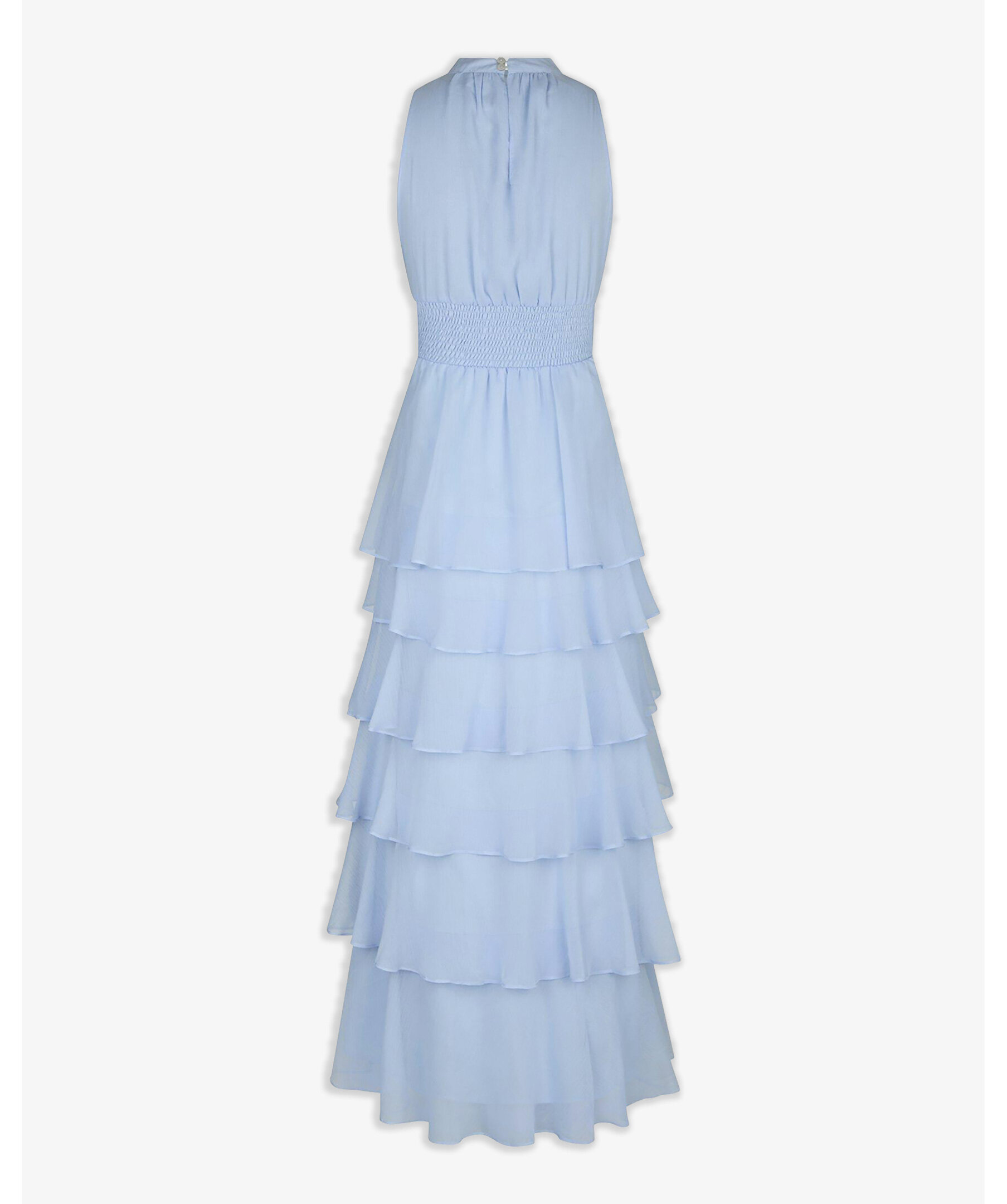 Ljusblå lång klänning med halterneck och rosettrem vid halsringningen. Kommer i en härlig chiffonkvalitet. Modellen är 176 cm lång och bär storlek 36.