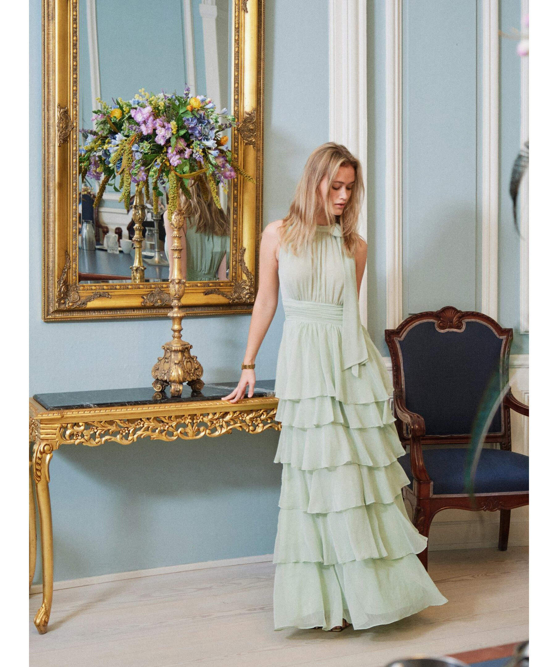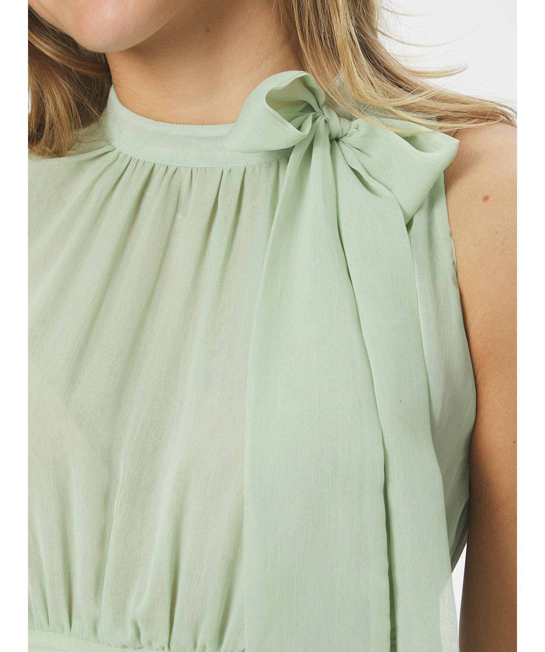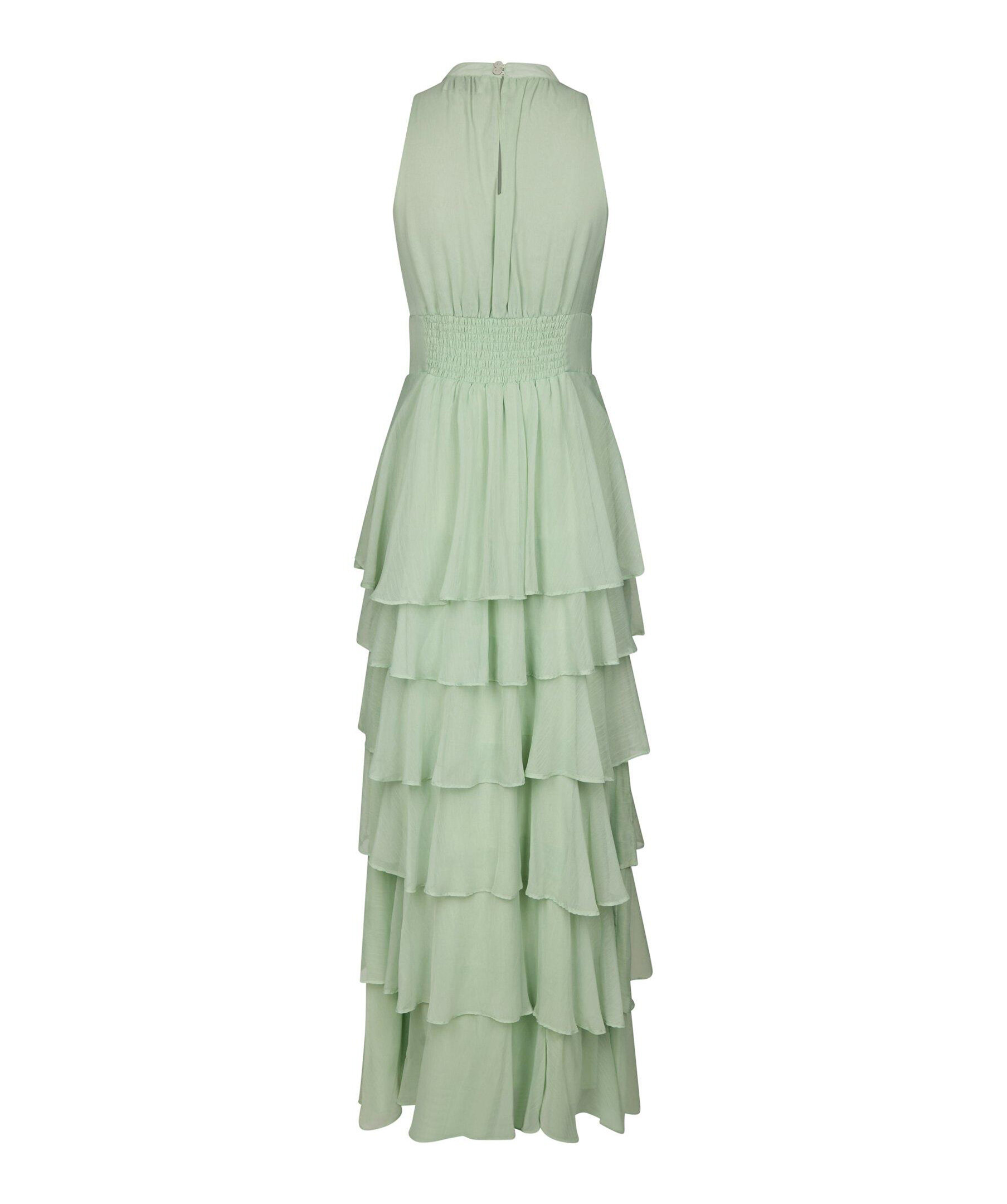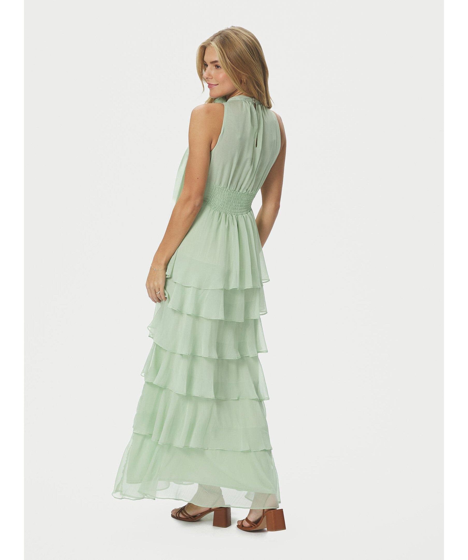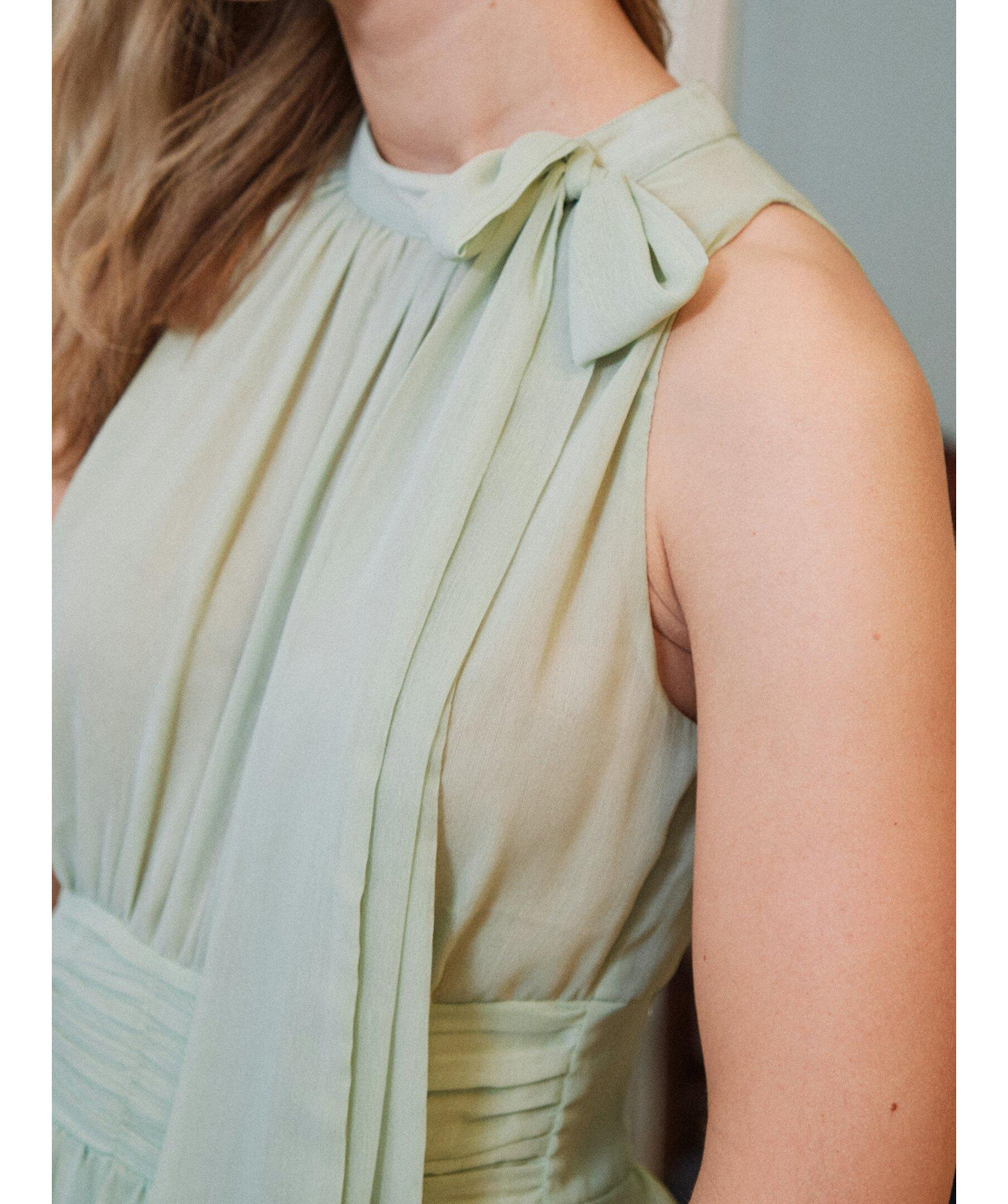 Ljusgrön långklänning med halterneck och rosettrem vid halsringningen. Kommer i en fin chiffonkvalitet. Modellen är 176 cm lång och bär storlek 36.