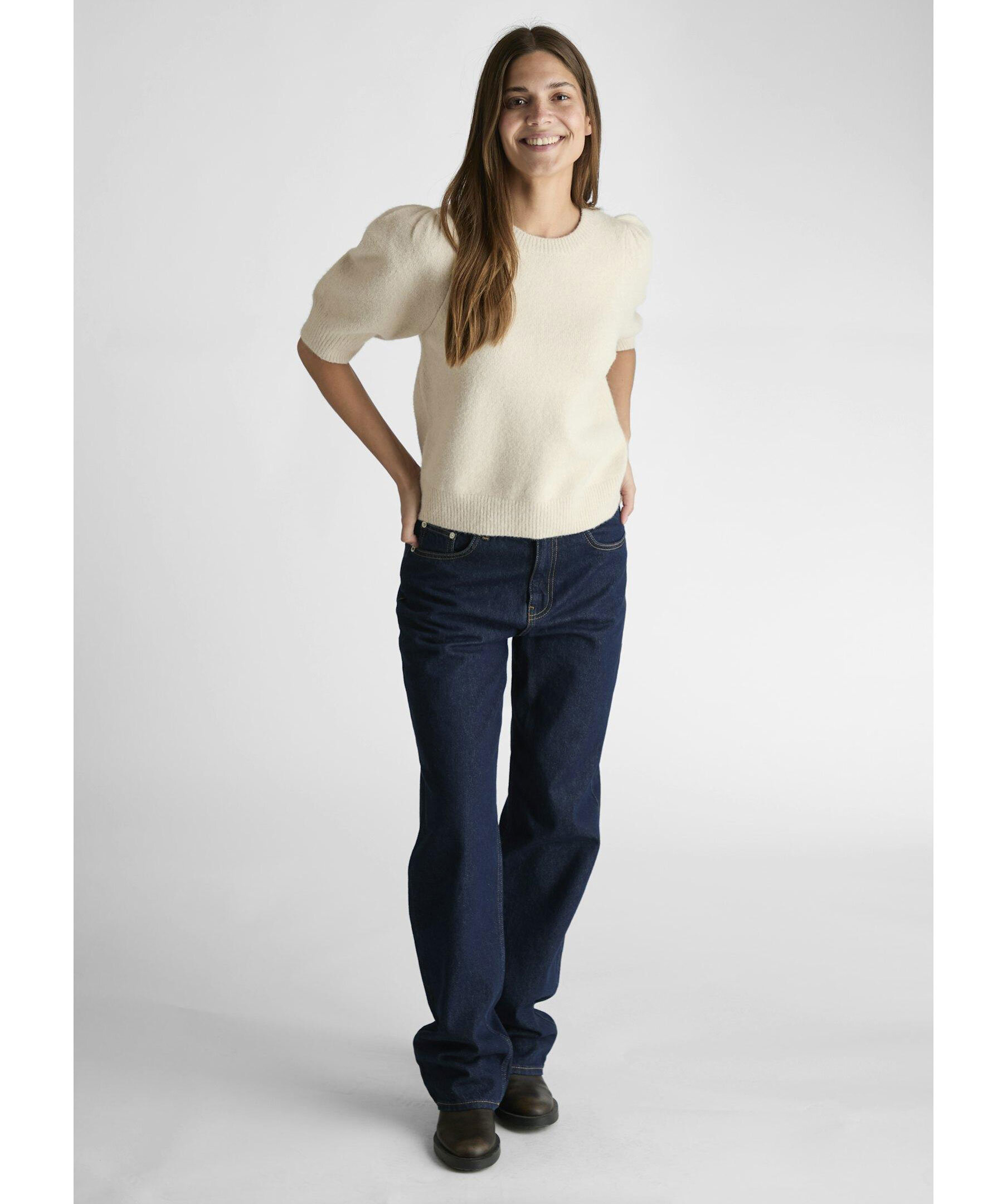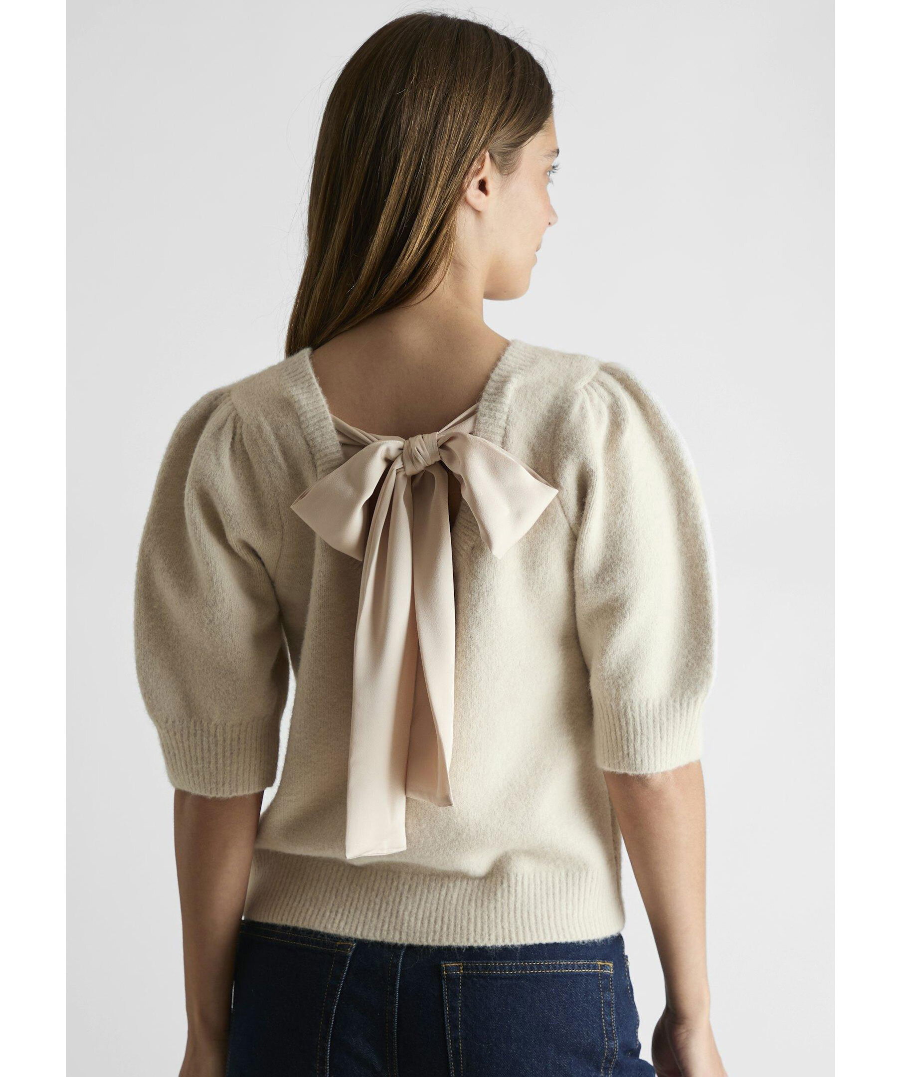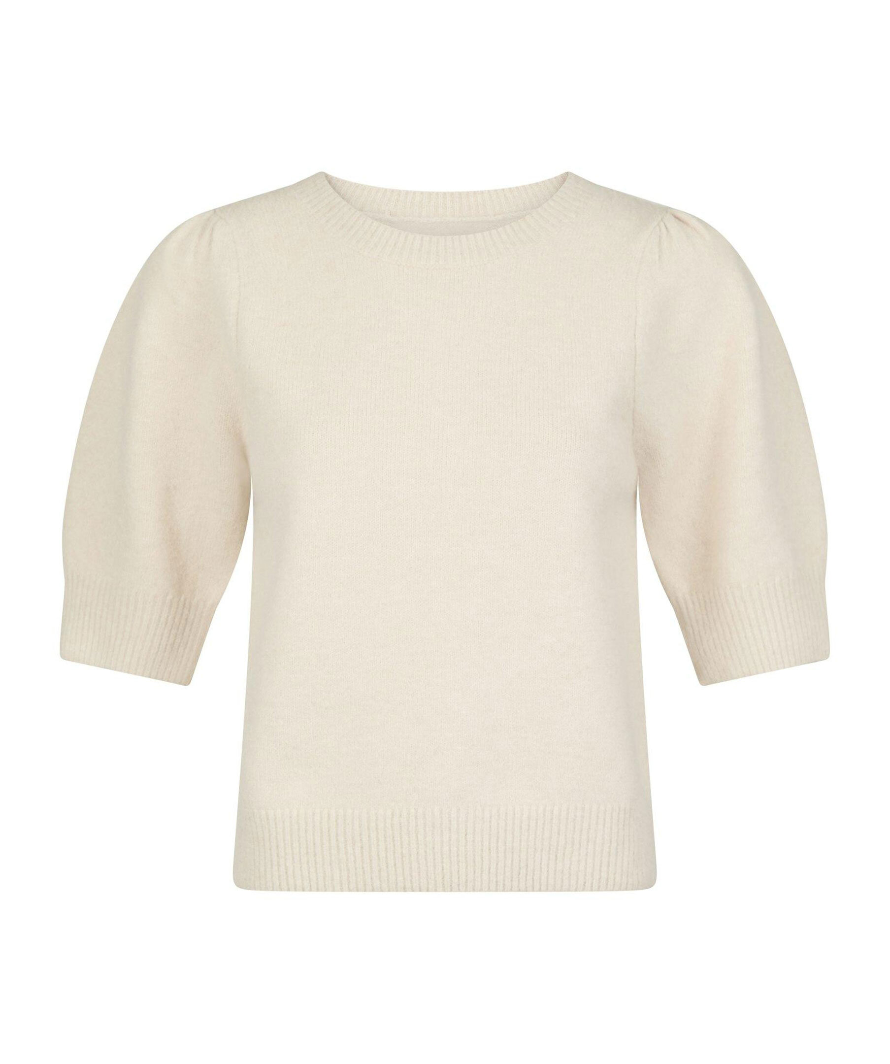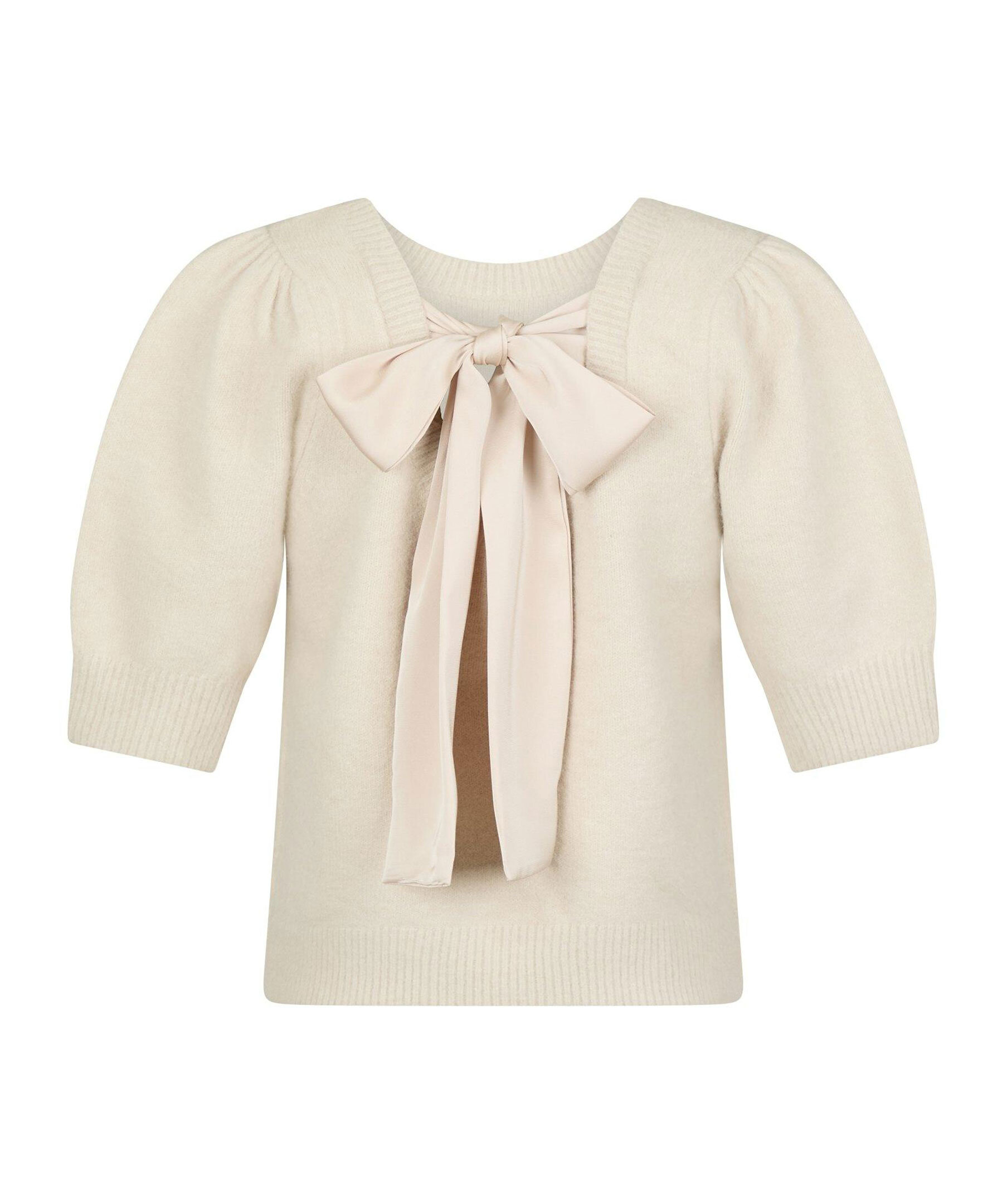 Krämvit stickad topp från Neo Noir. Toppen har puffärmar, rosett baktill och ribbstickade muddar samt halsringning. Tillverkad i en polyester- och ullblandning.