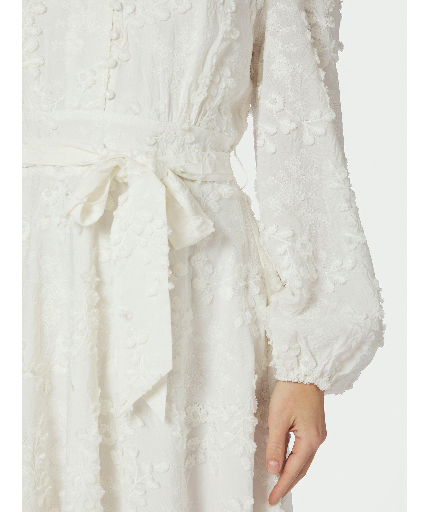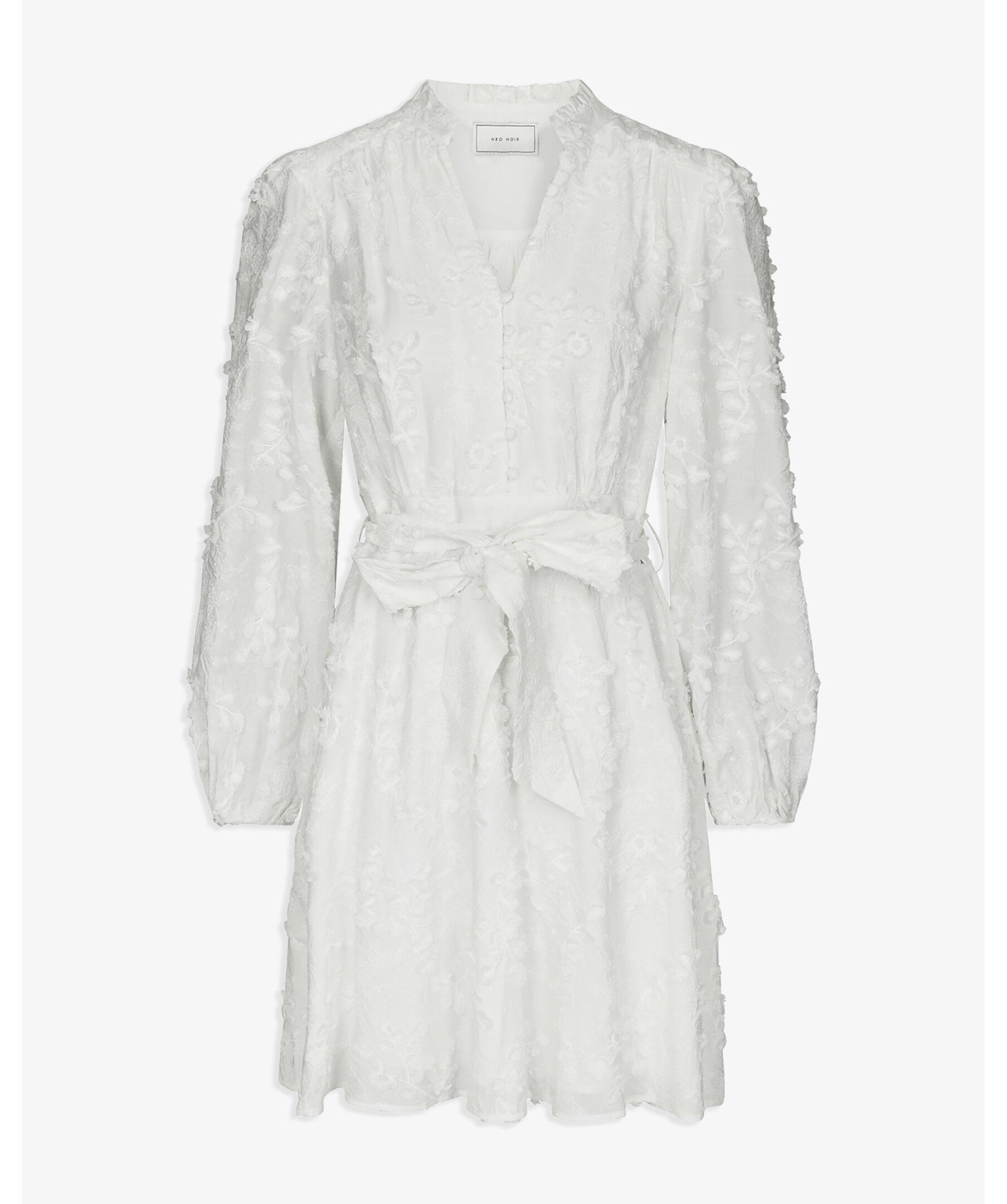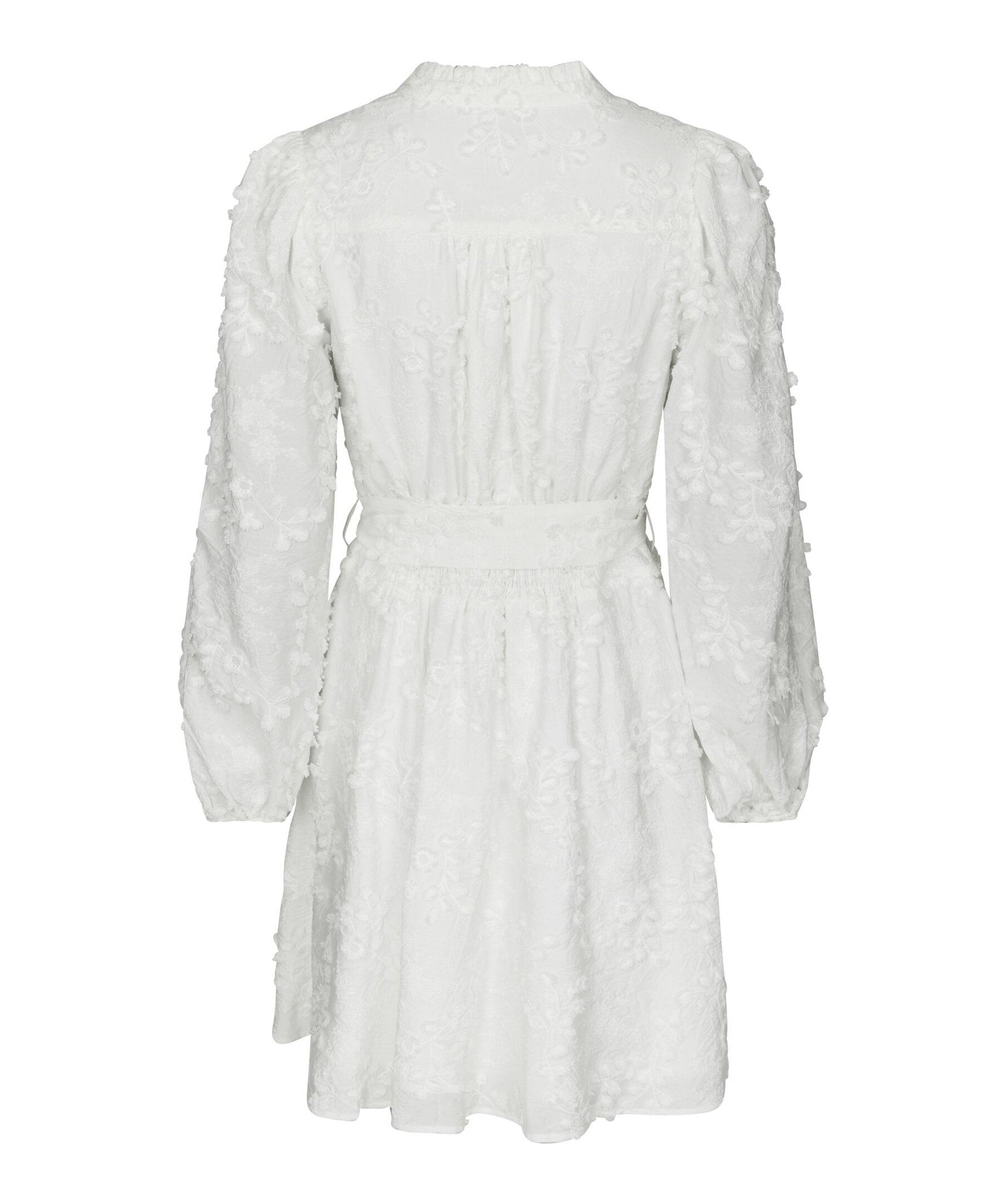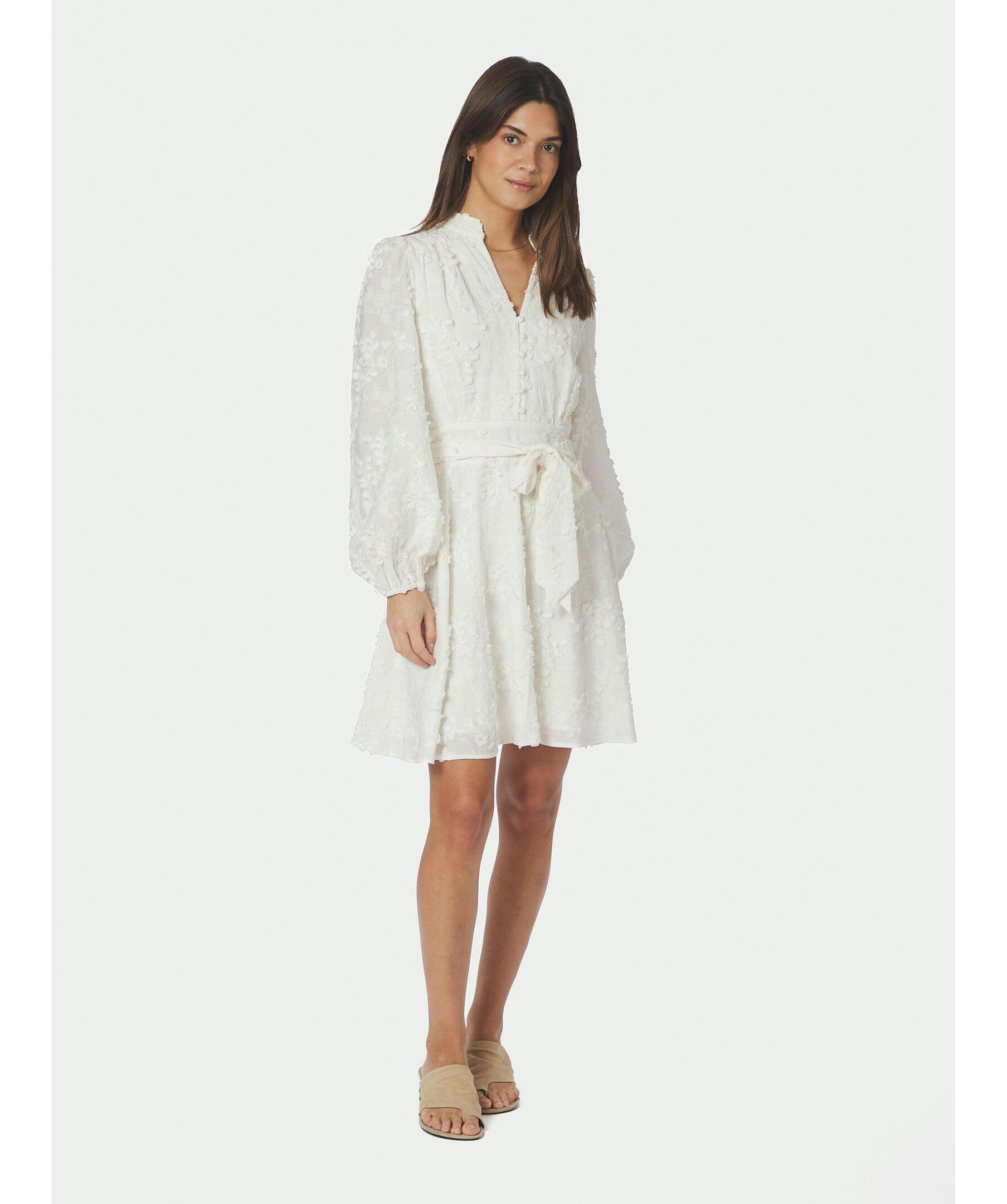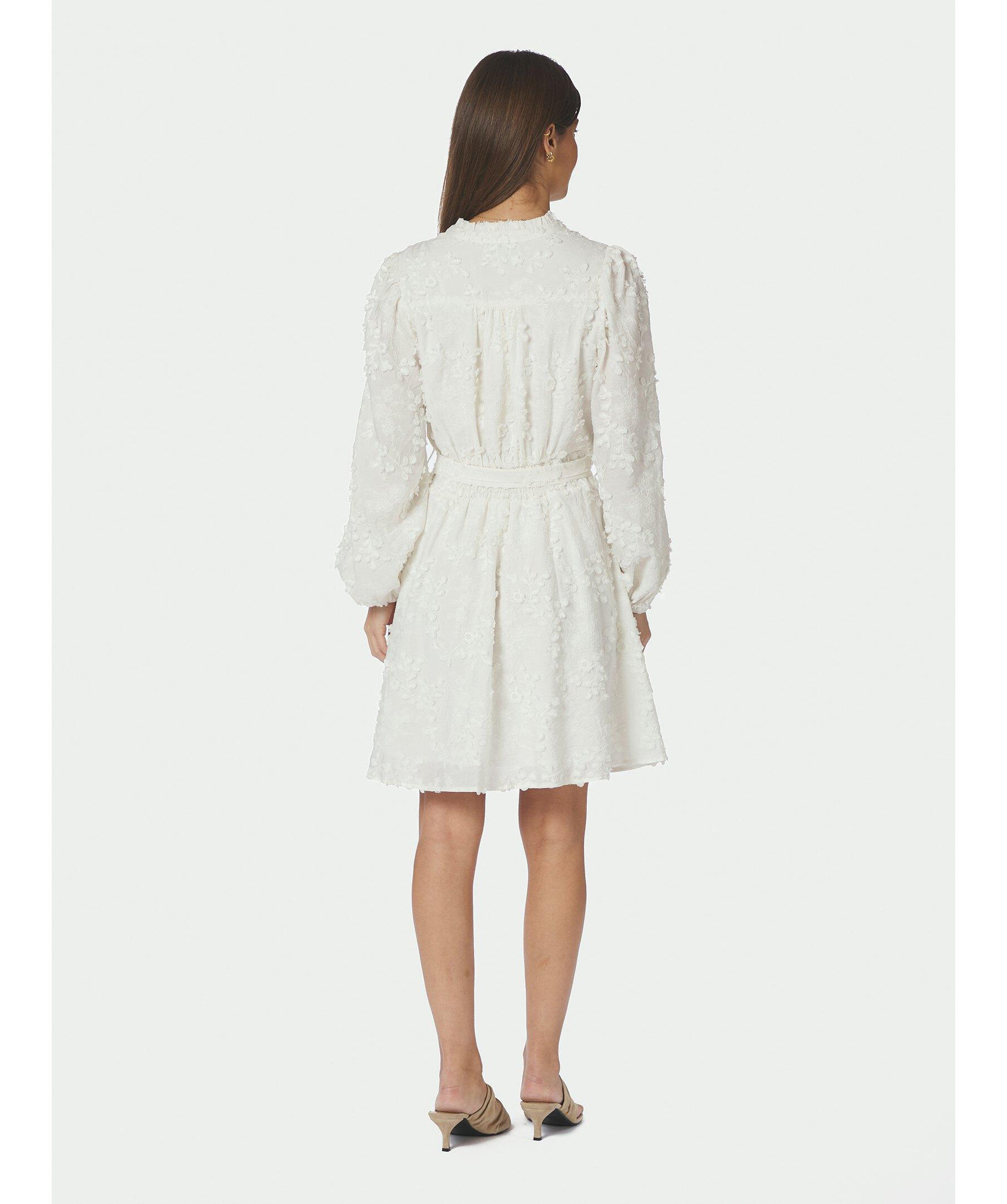 Vit, kort, broderad klänning med eleganta detaljer, hög halsringning och midjeband. Modellen är 176 cm lång och bär storlek 36.