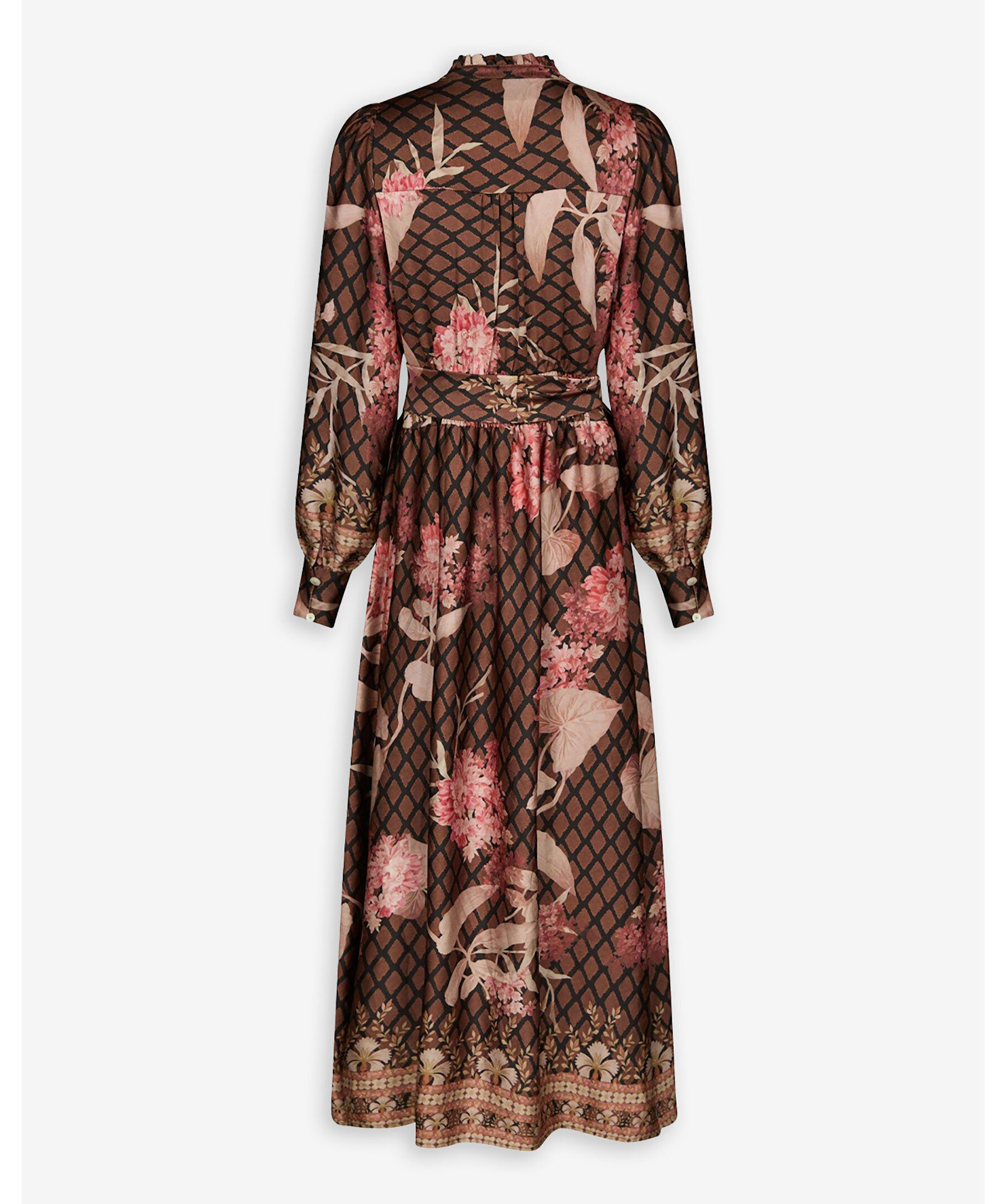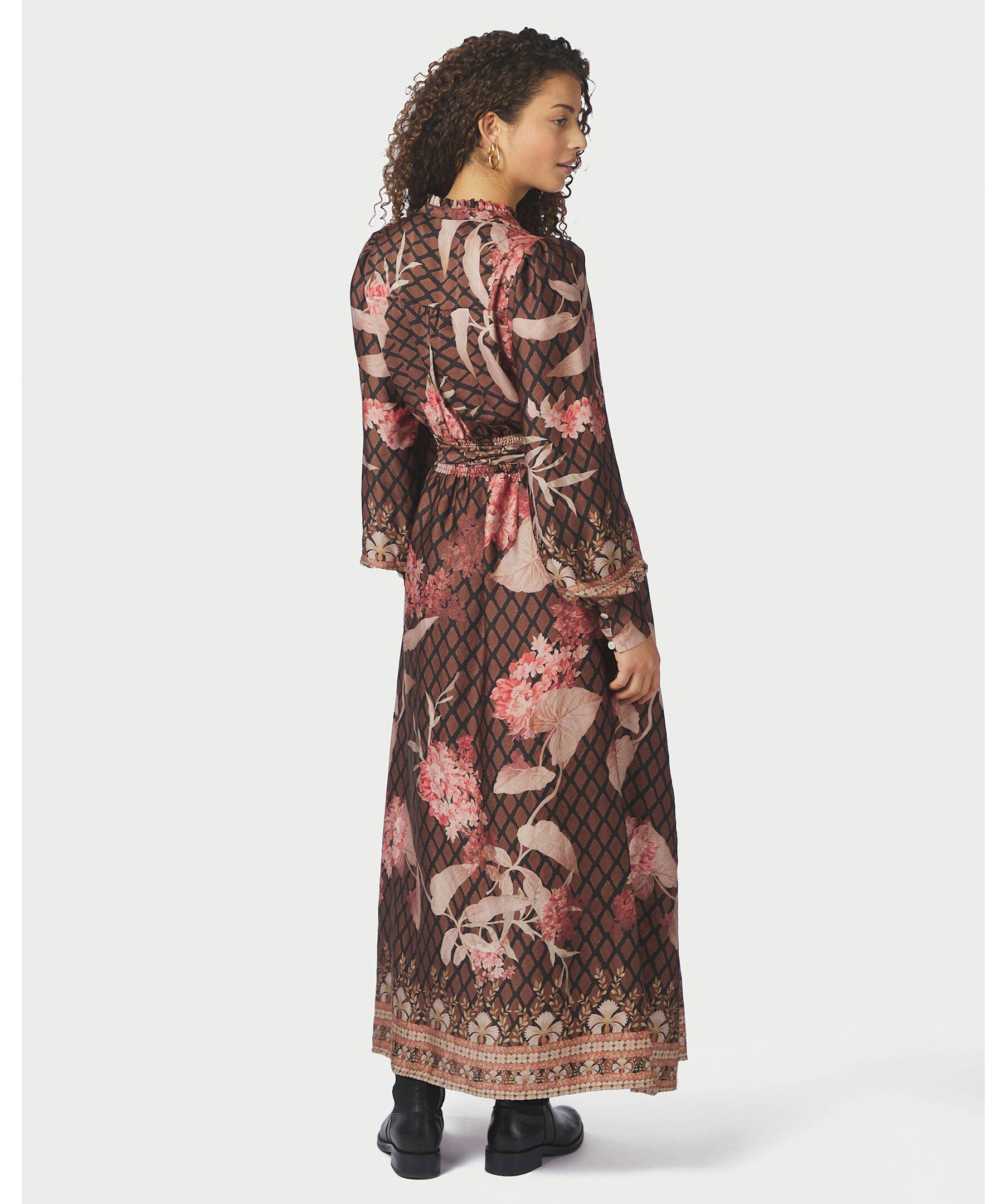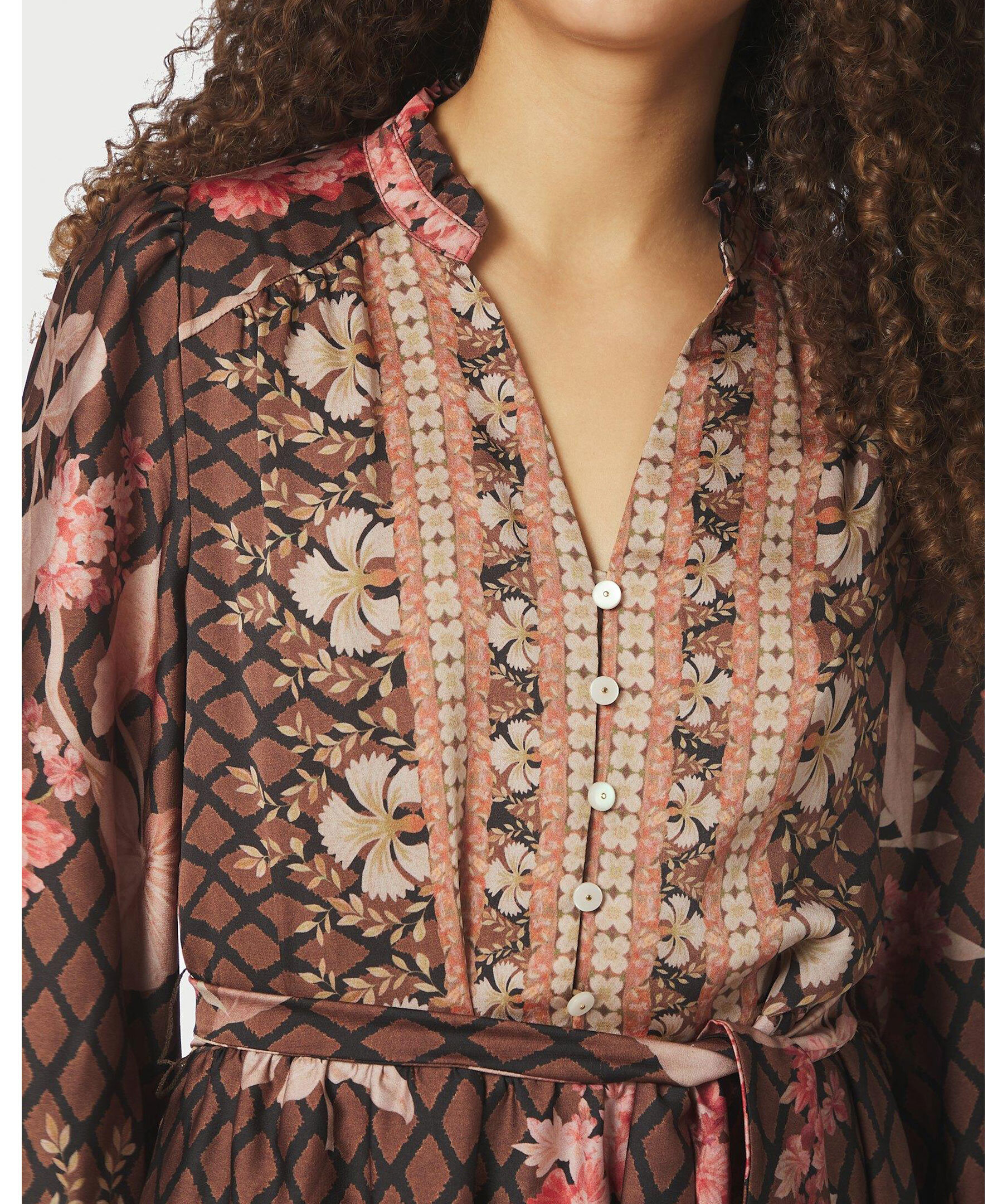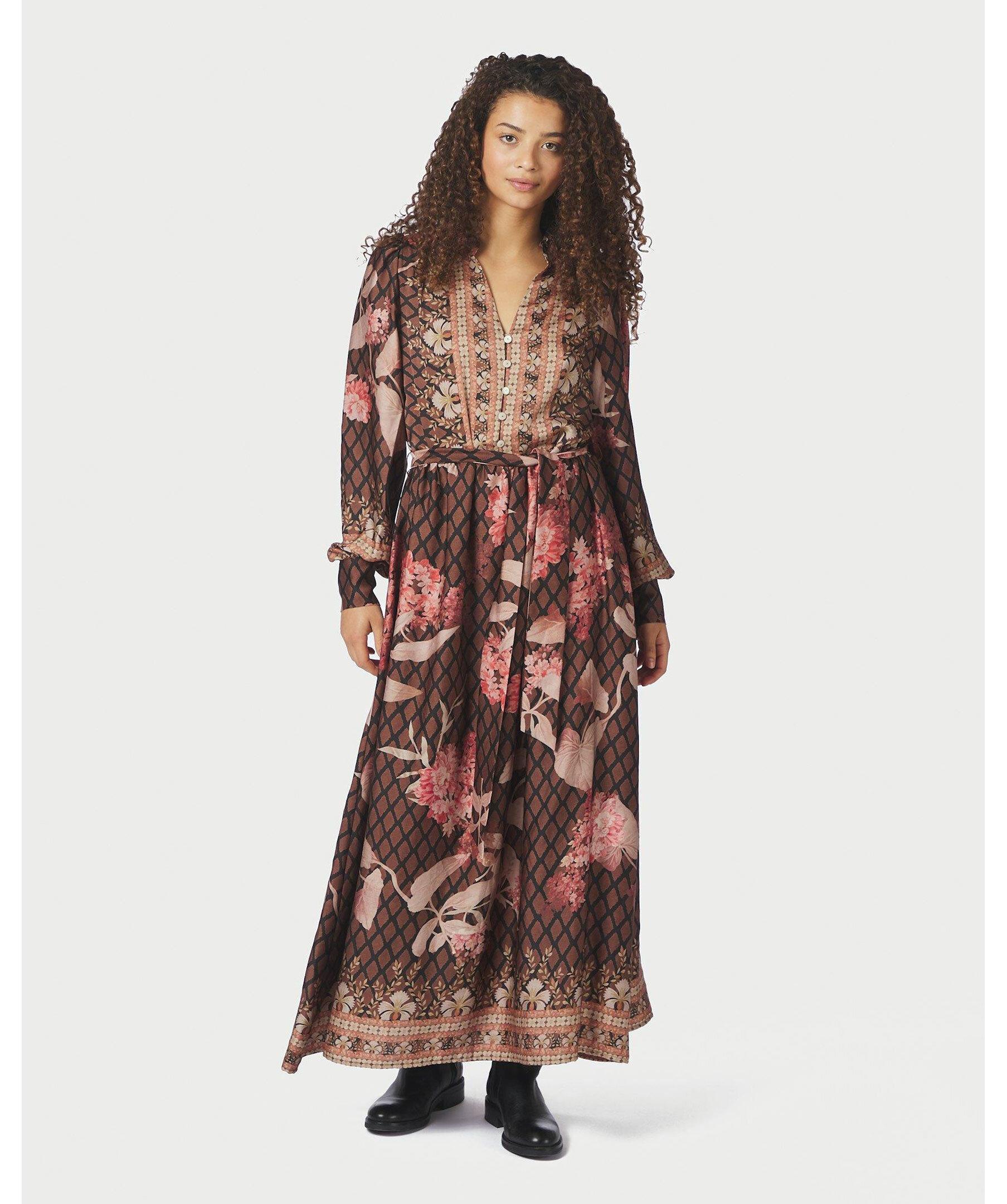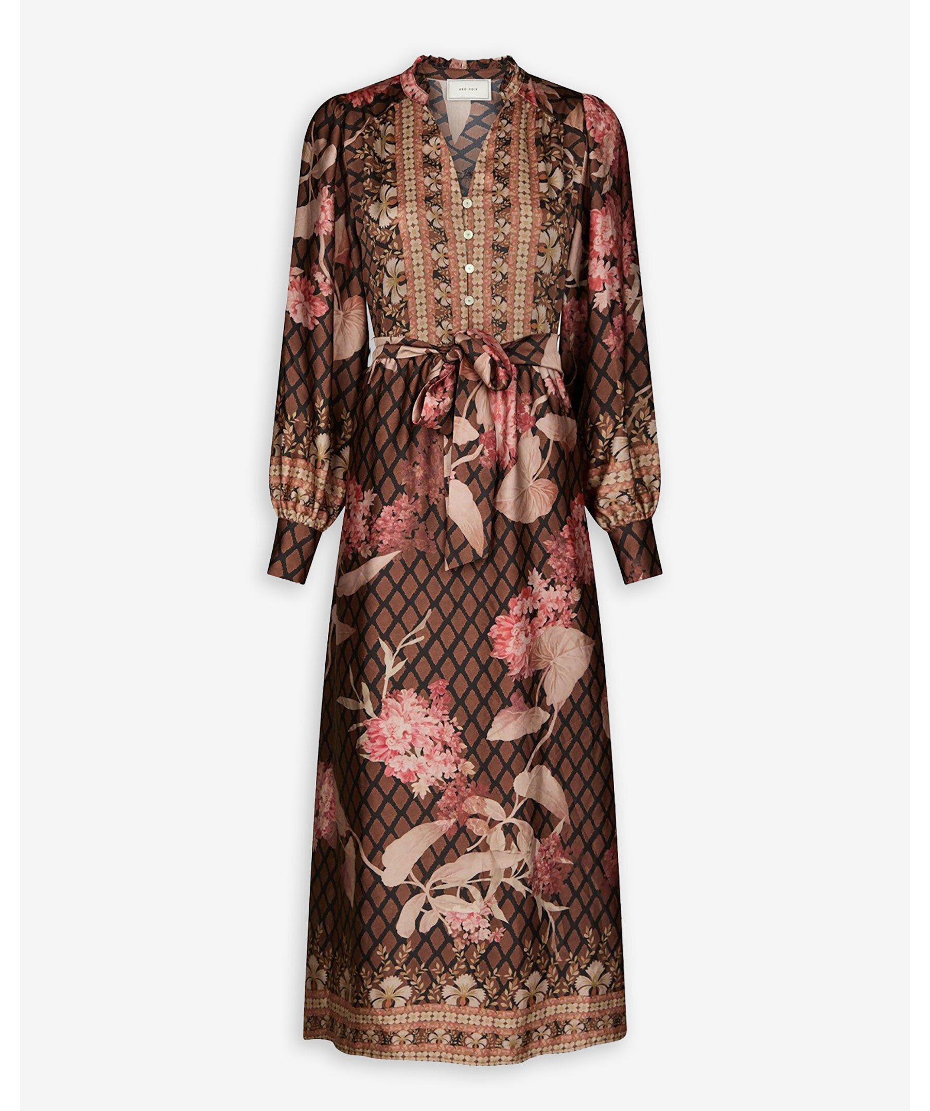 Mönstrad klänning från Neo Noir. Klänningen är v-ringad med knappar fram till och har ett knytband i midjan.