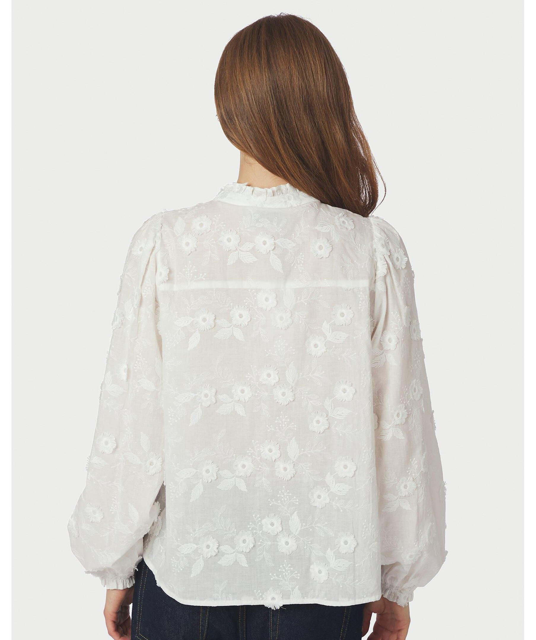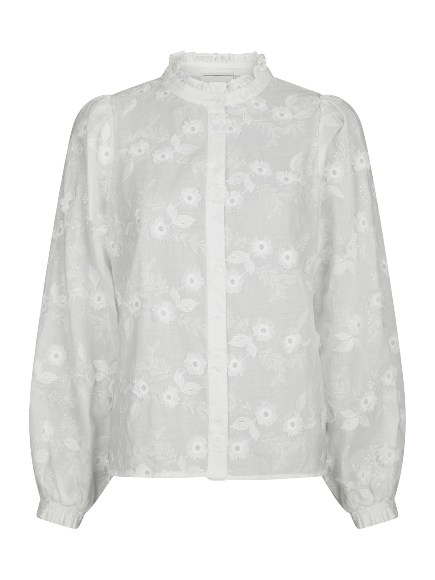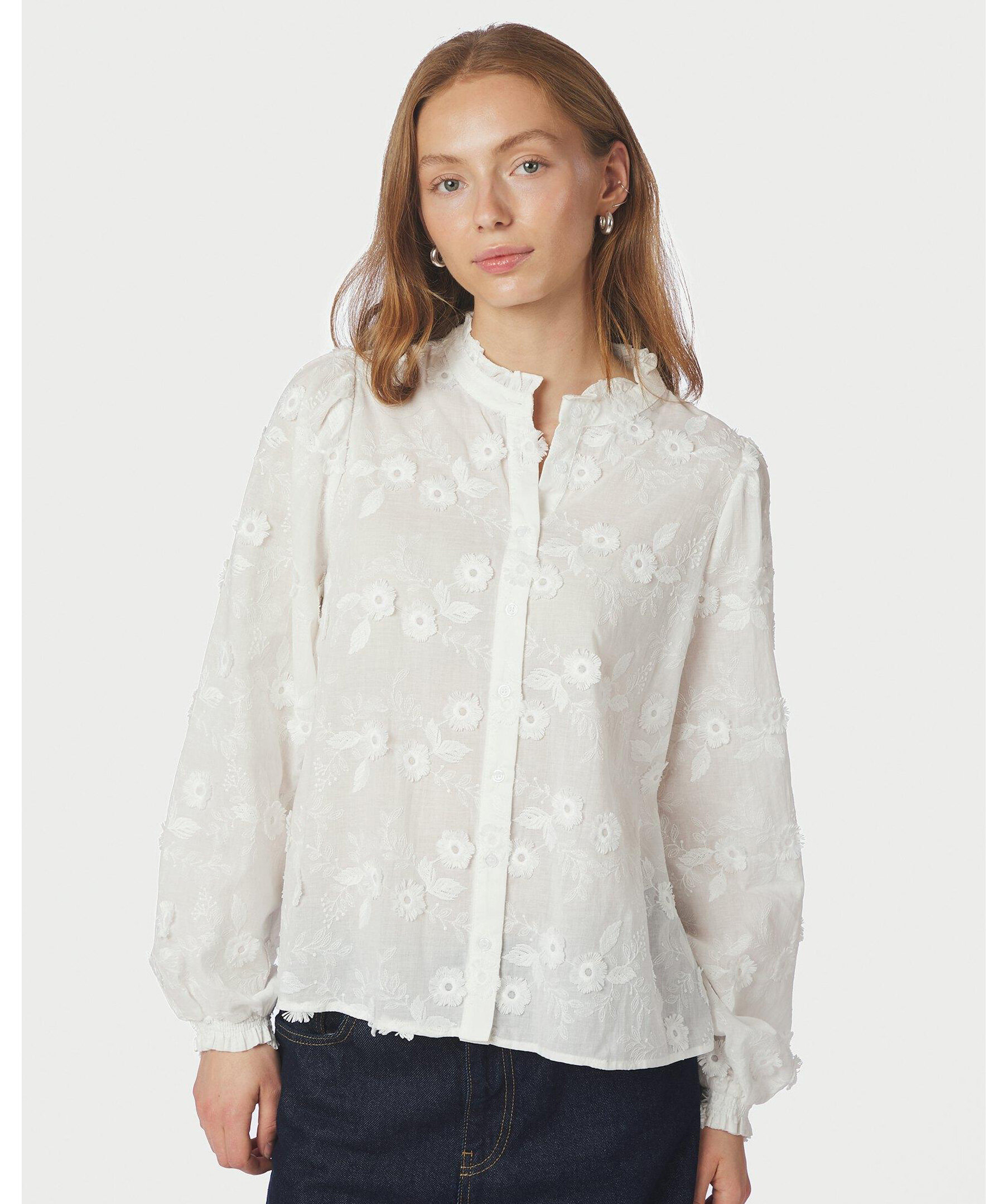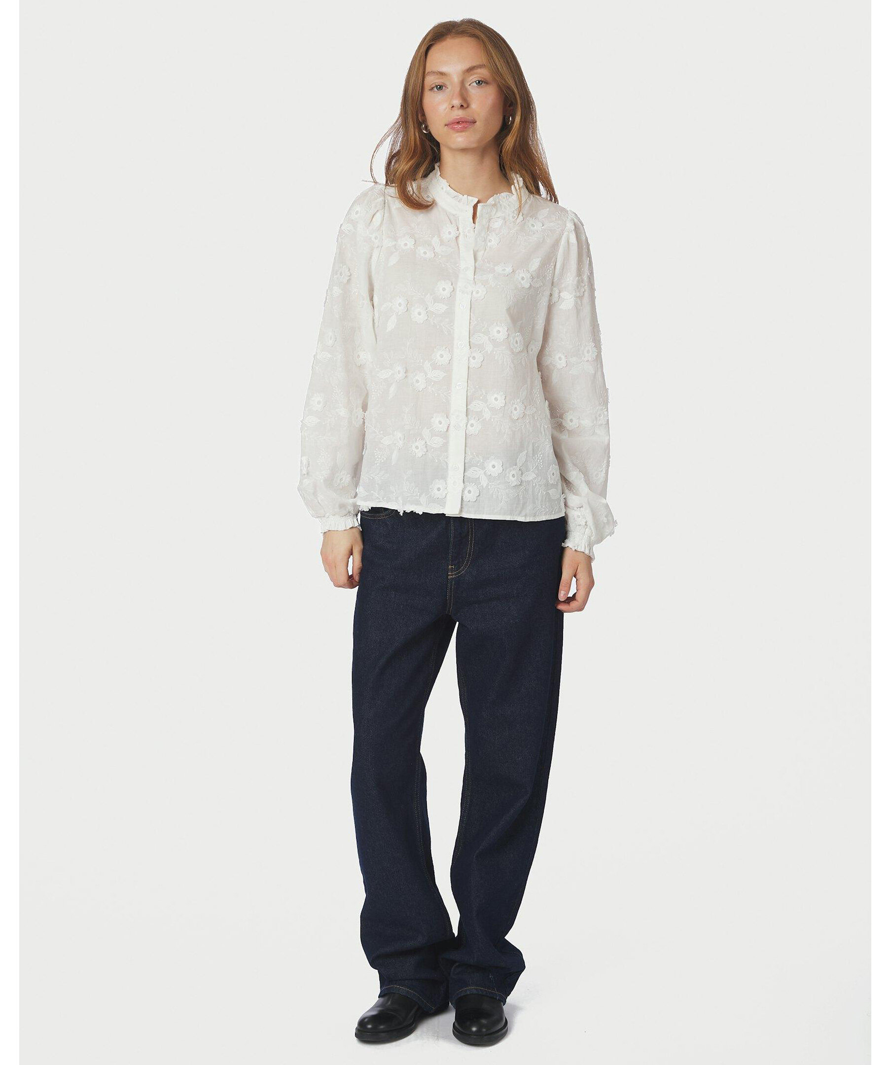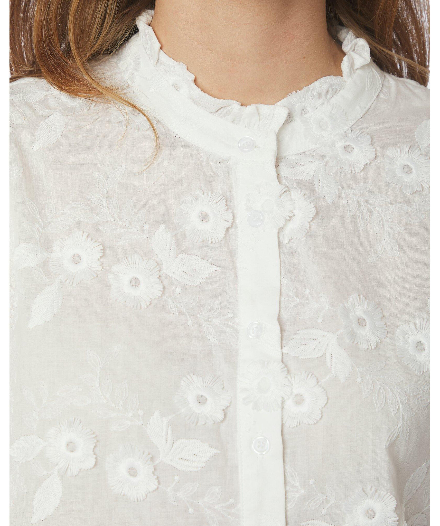 Vit enkel och feminin skjorta i en fin broderad kvalitet från Neo Noir. Modellen är 176 cm och bär storlek 36.