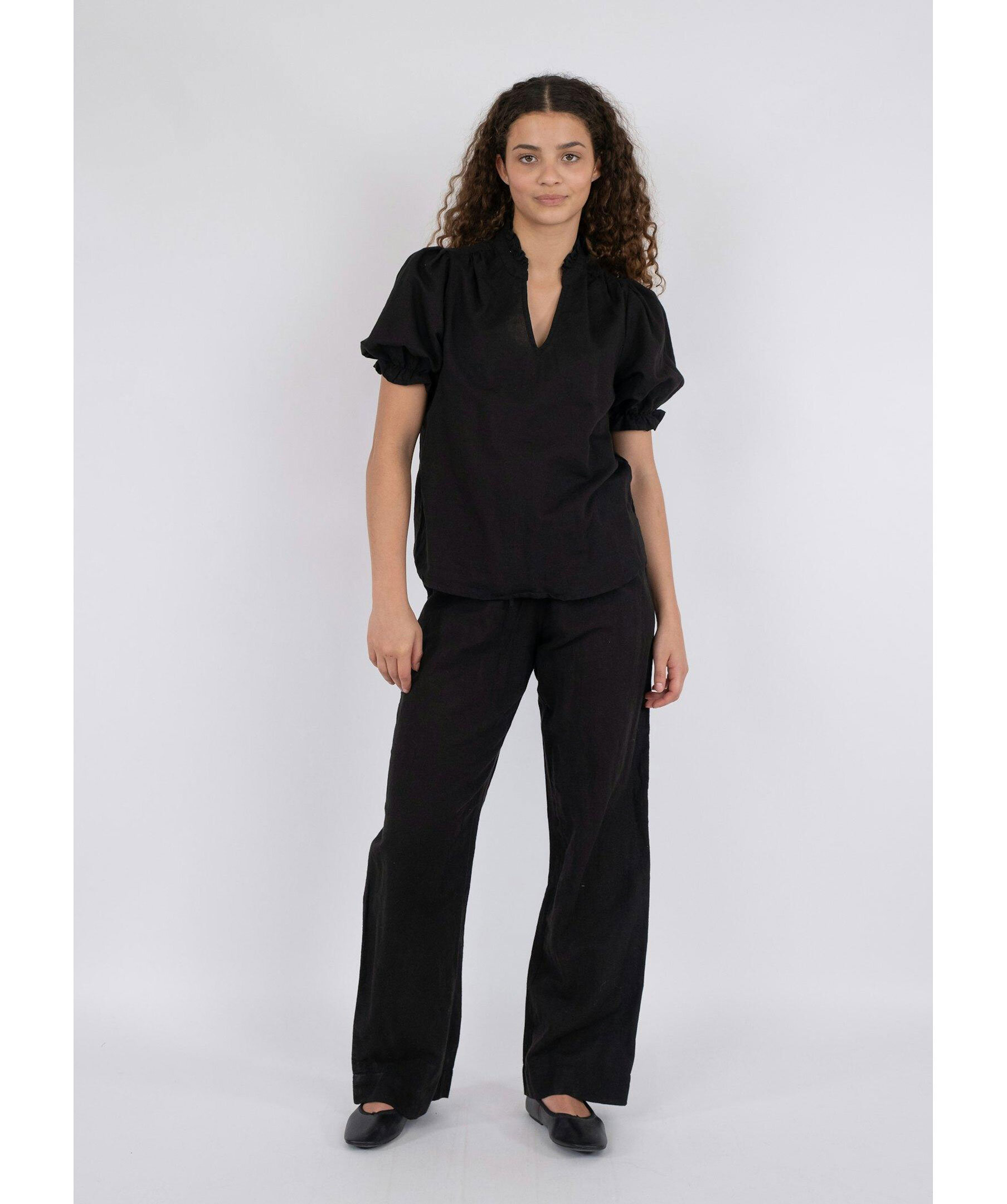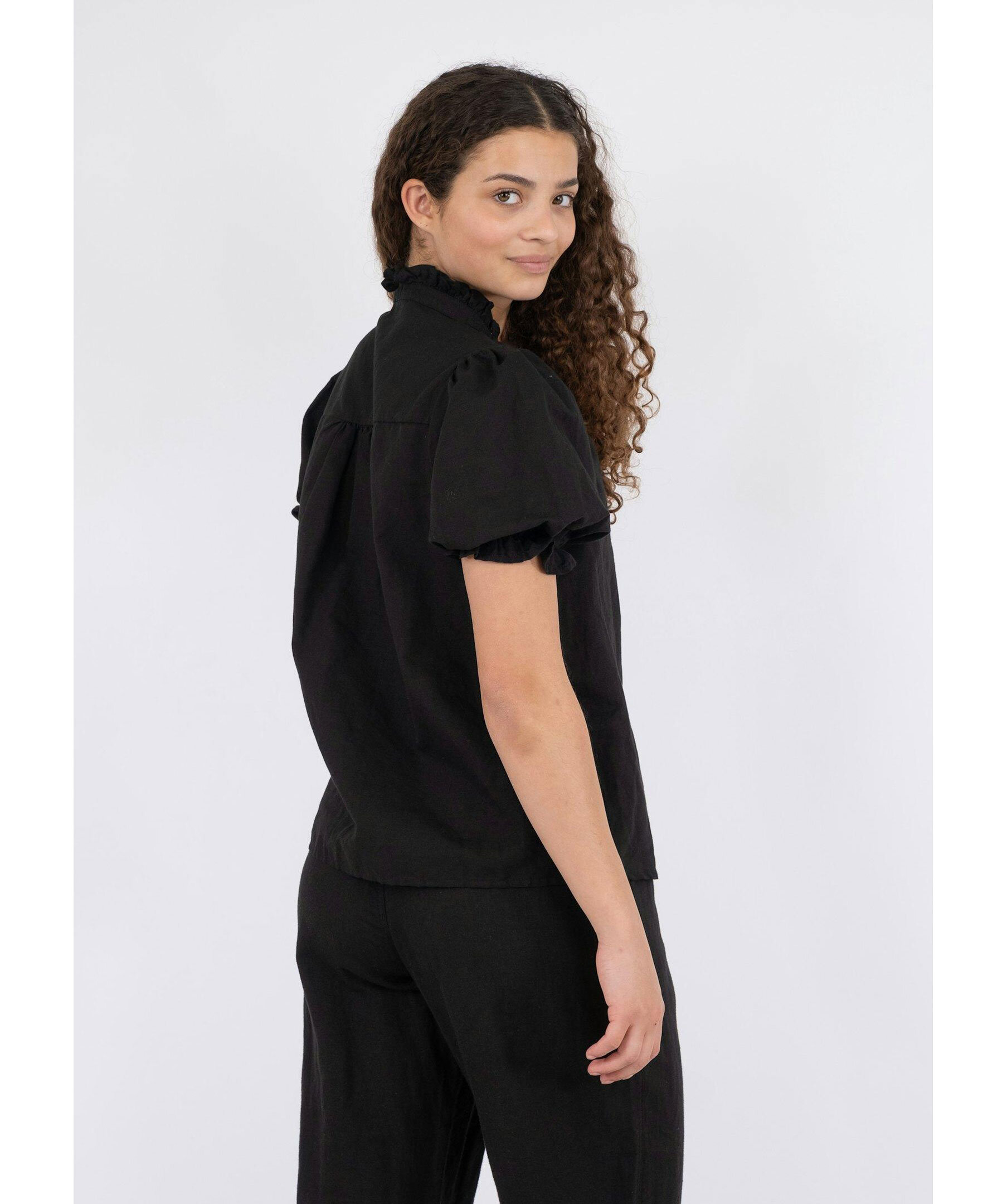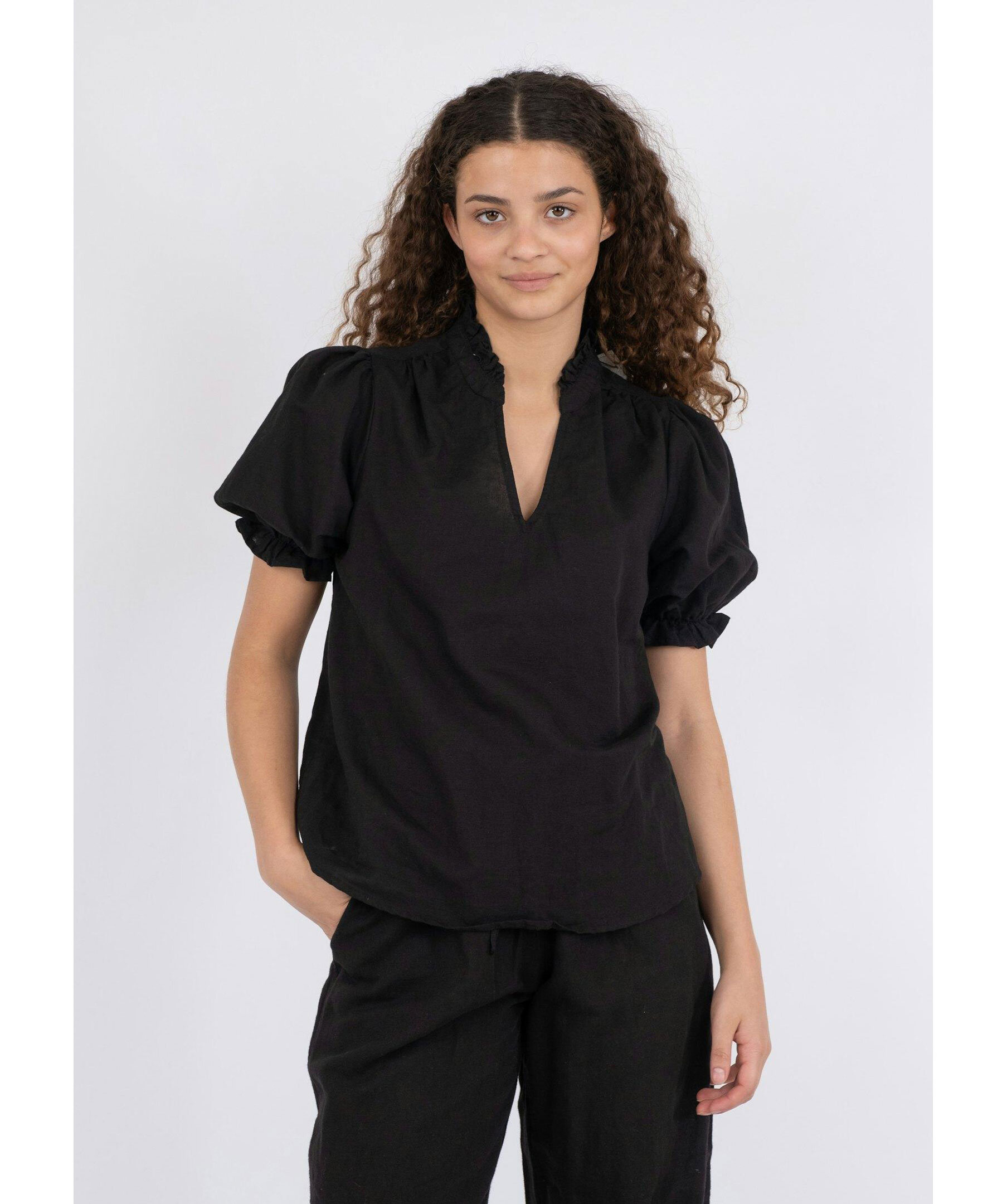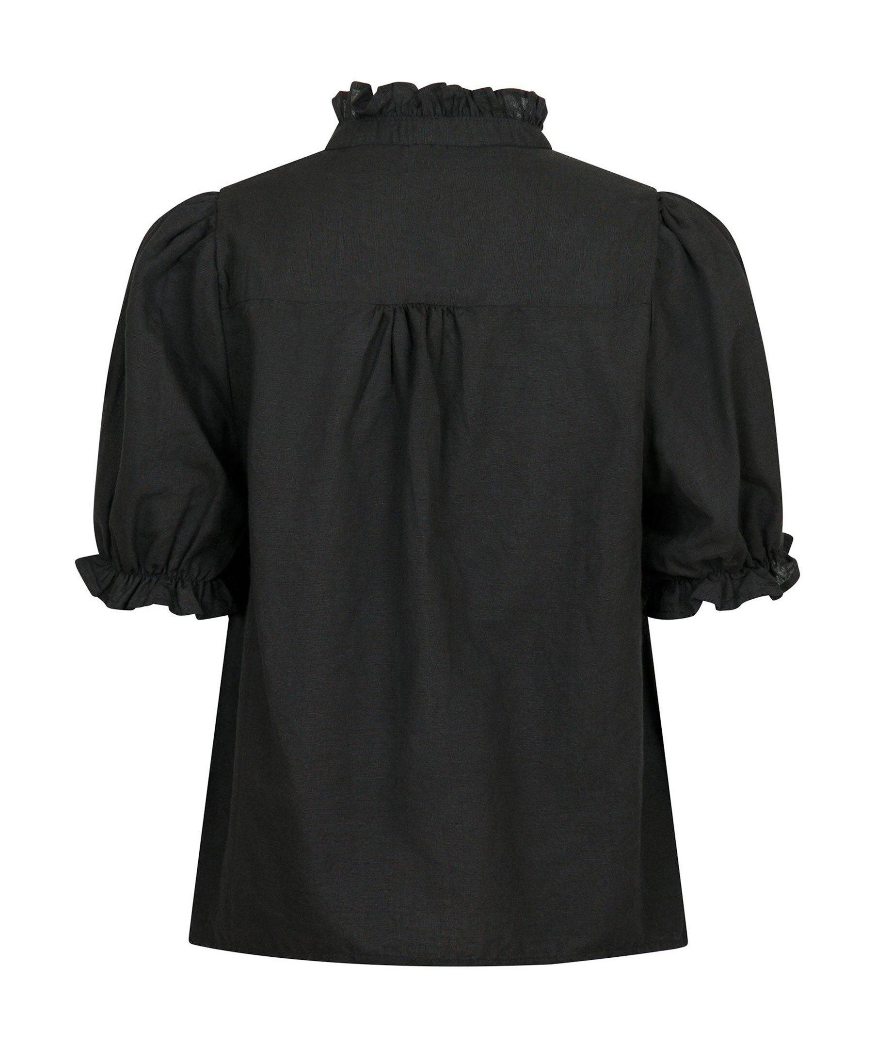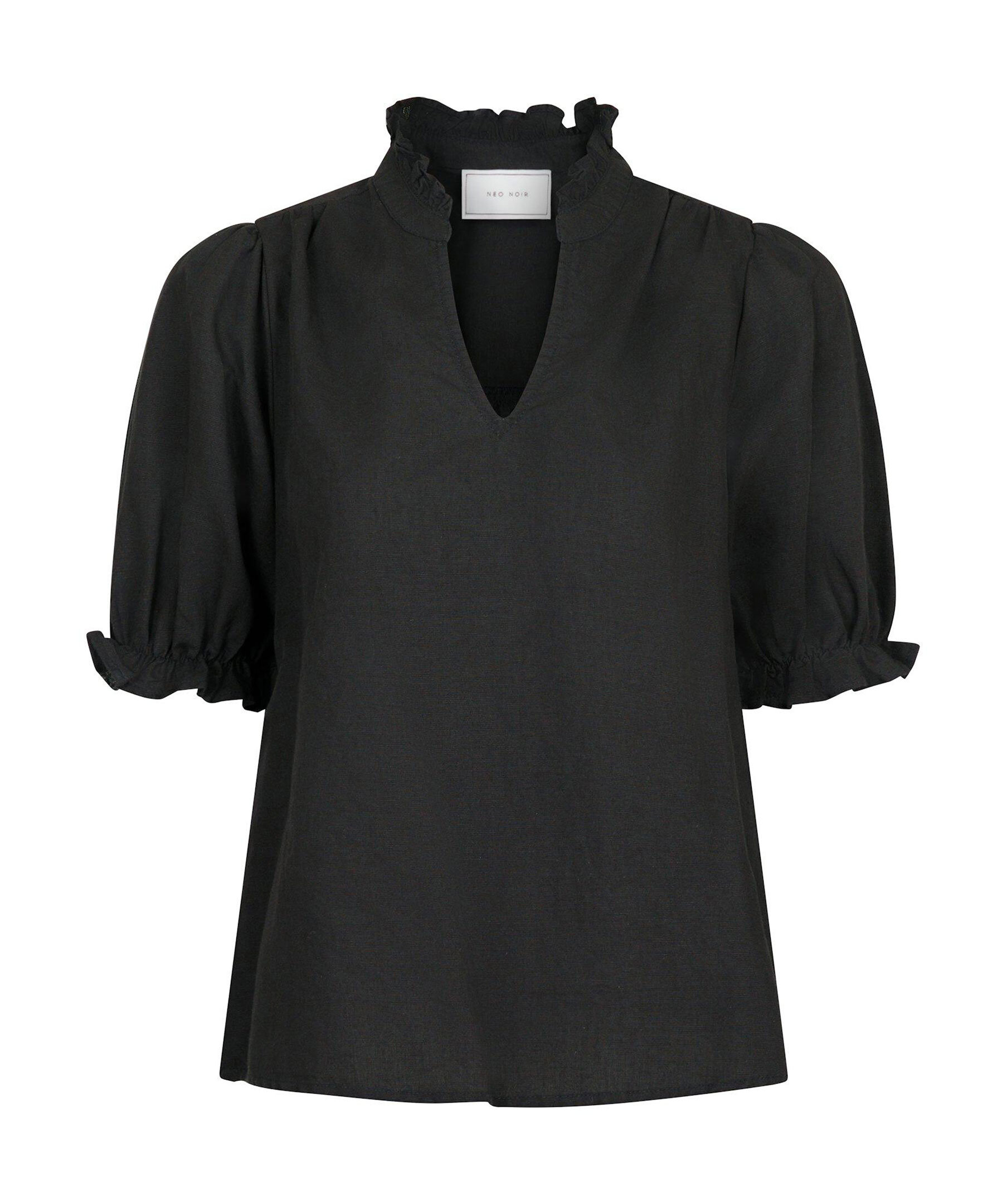 Svart kortärmad blus från Neo Noir med fin volangdetalj vid krage och axlar. Blusen har en V-ringad hals och puffdetalj vid armarna. Tillverkad i en linneblandning.