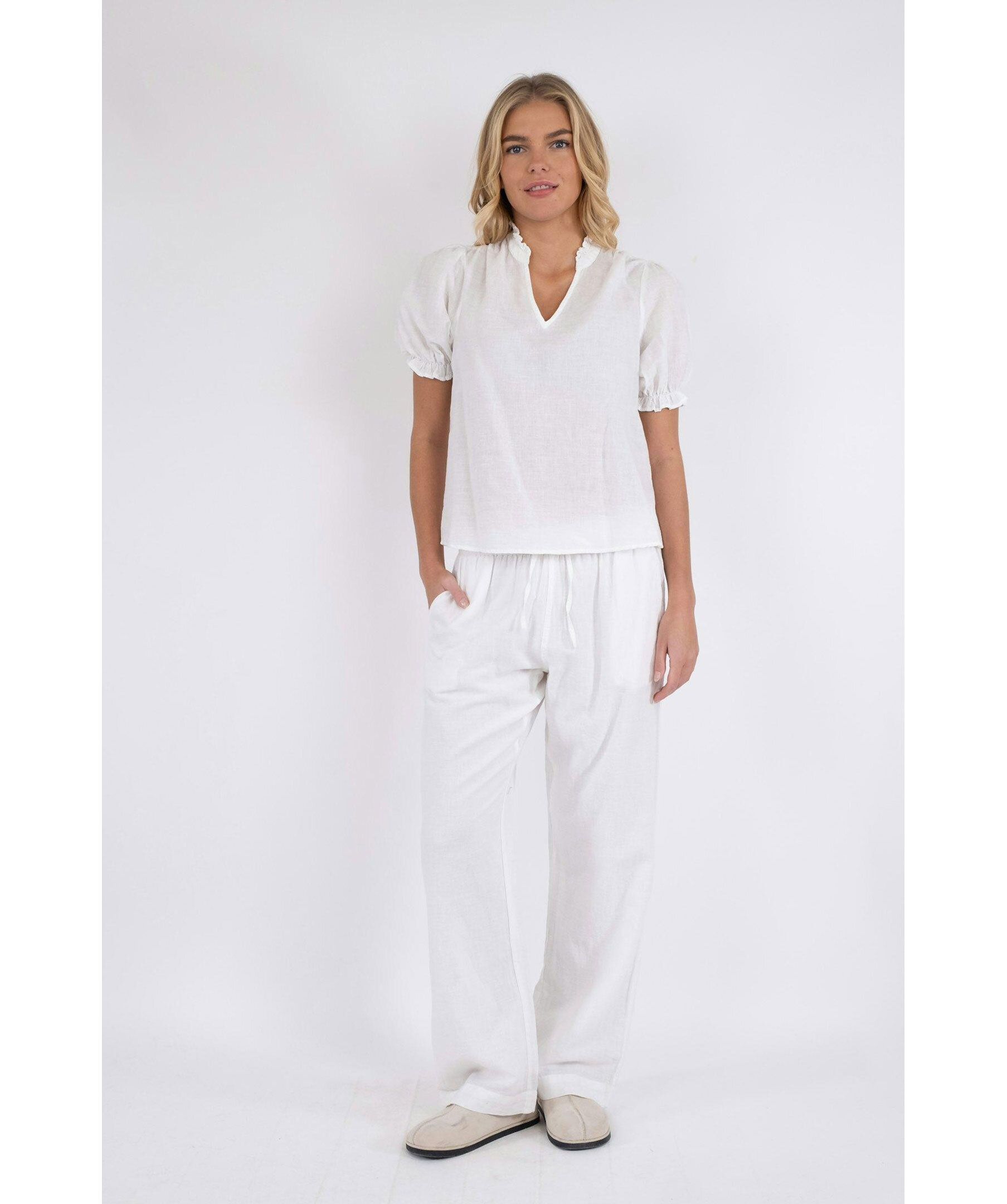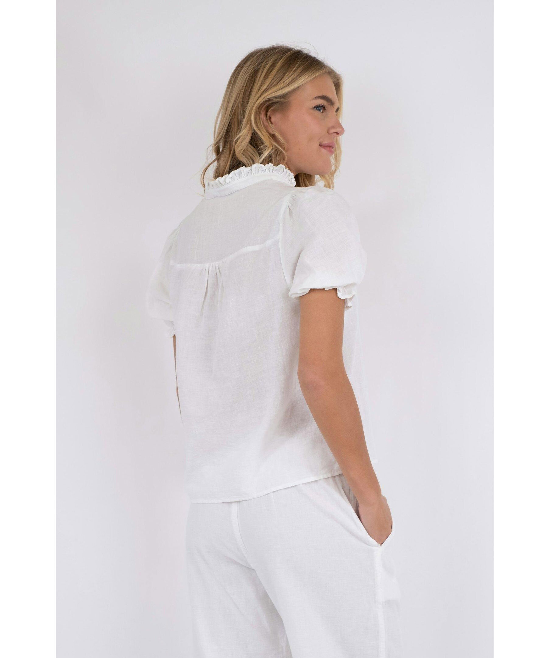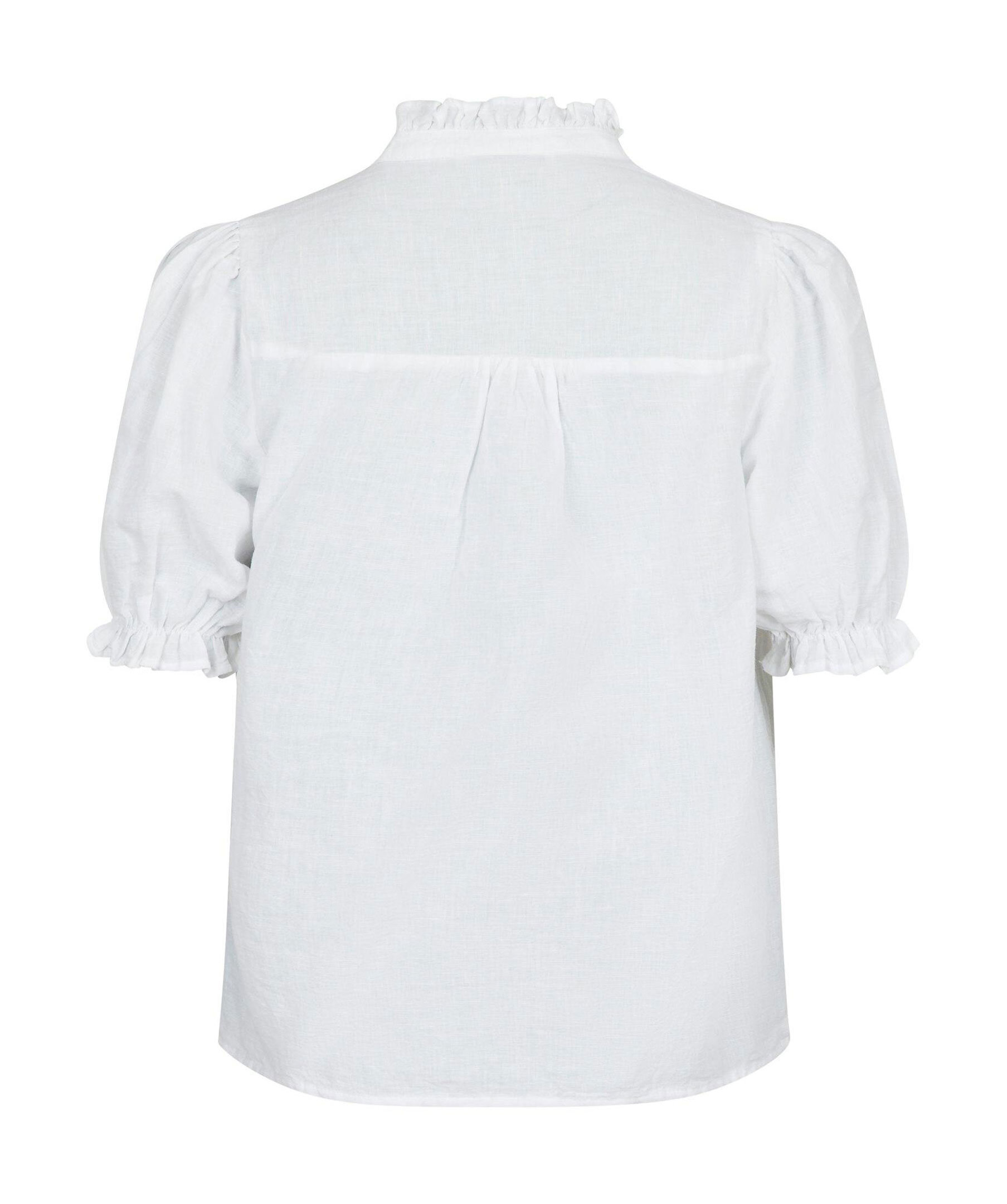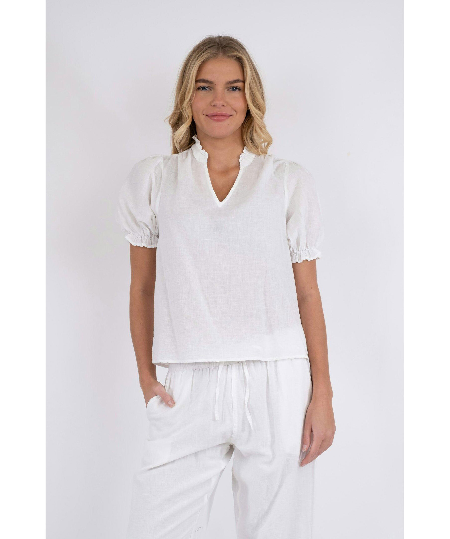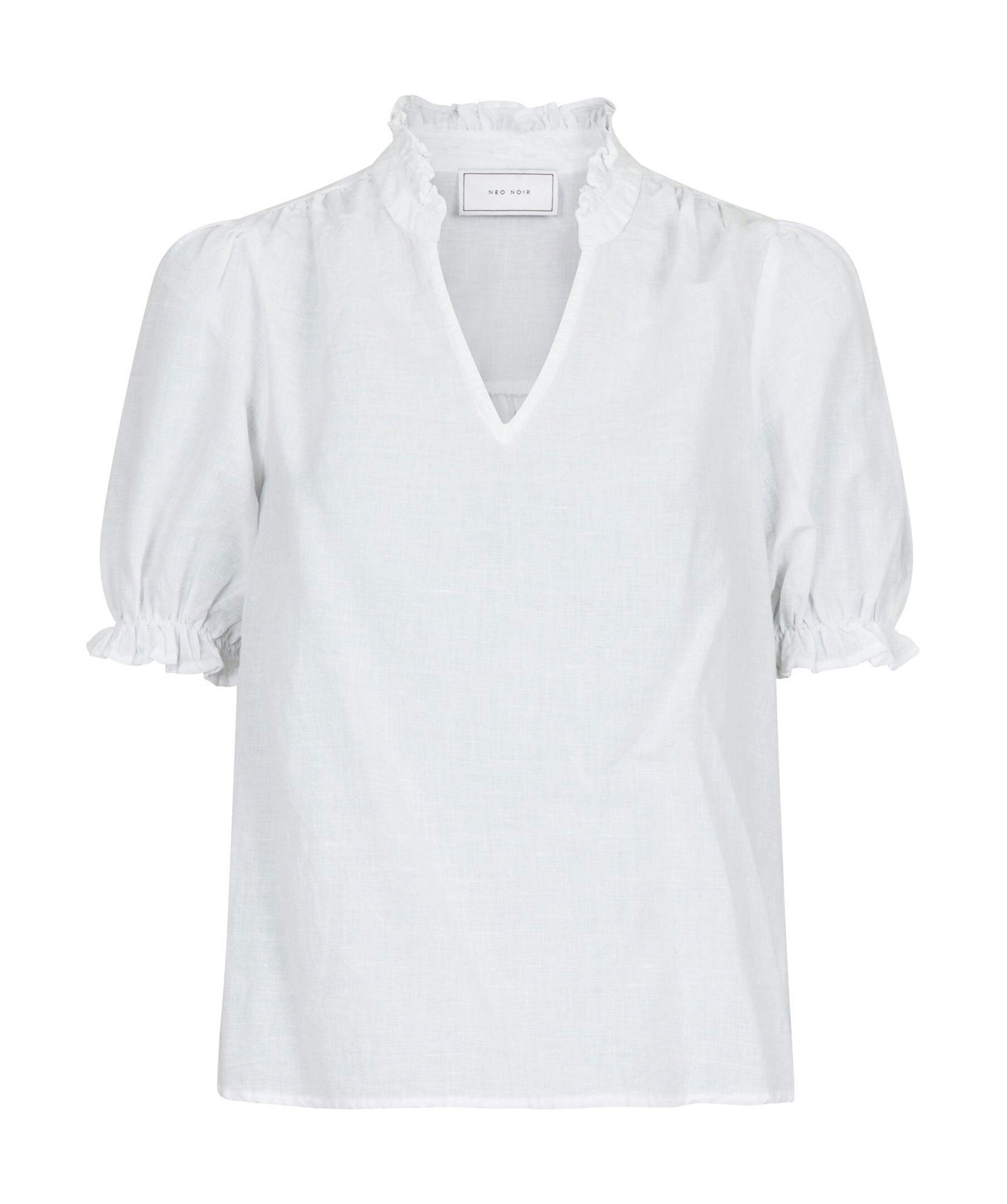 Vit kortärmad blus från Neo Noir med fin volangdetalj vid krage och axlar. Blusen har en V-ringad hals och puffdetalj vid armarna. Tillverkad i en linneblandning.