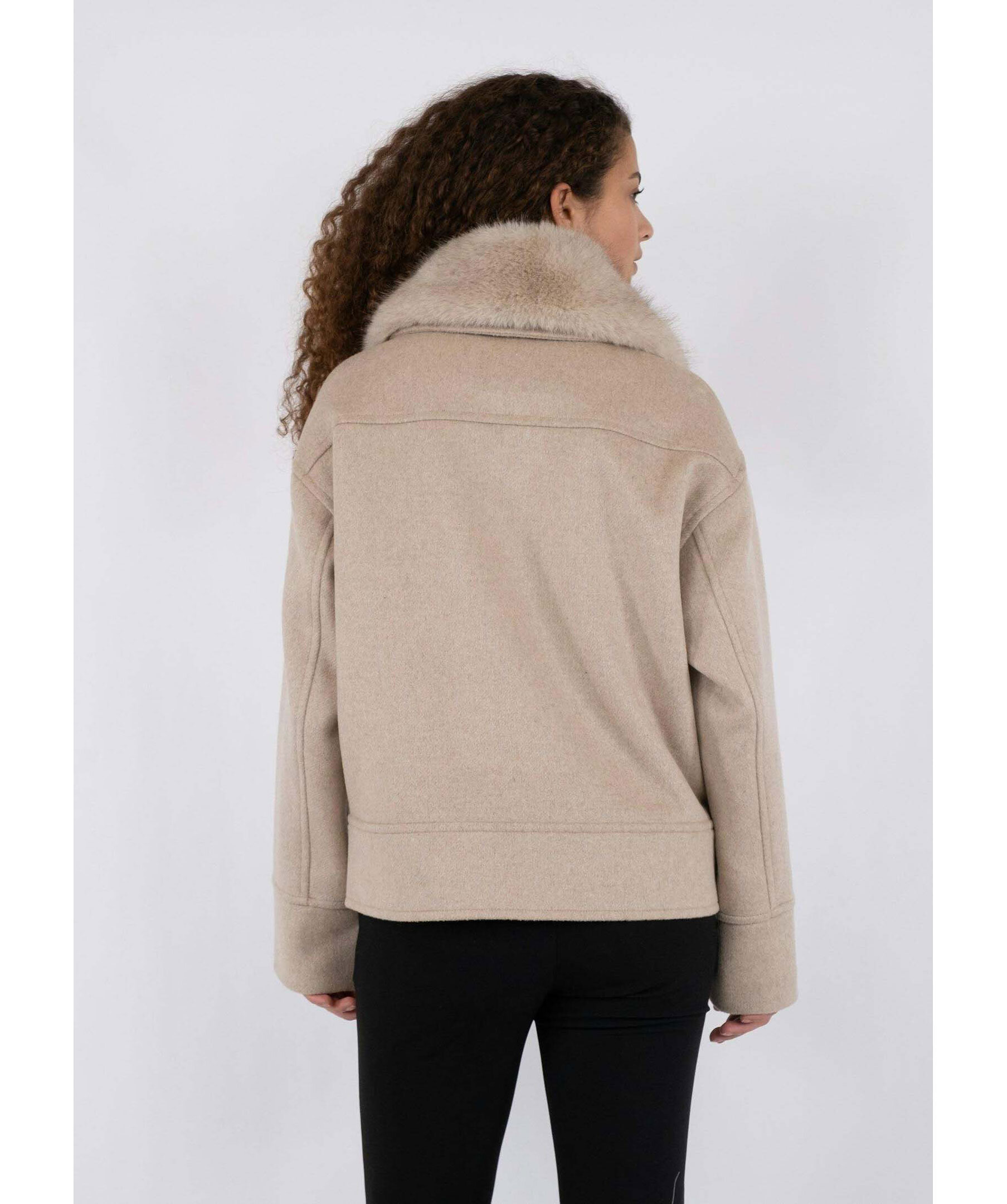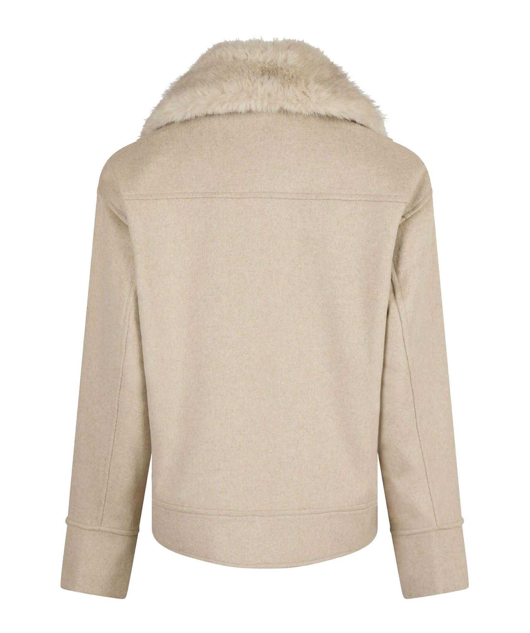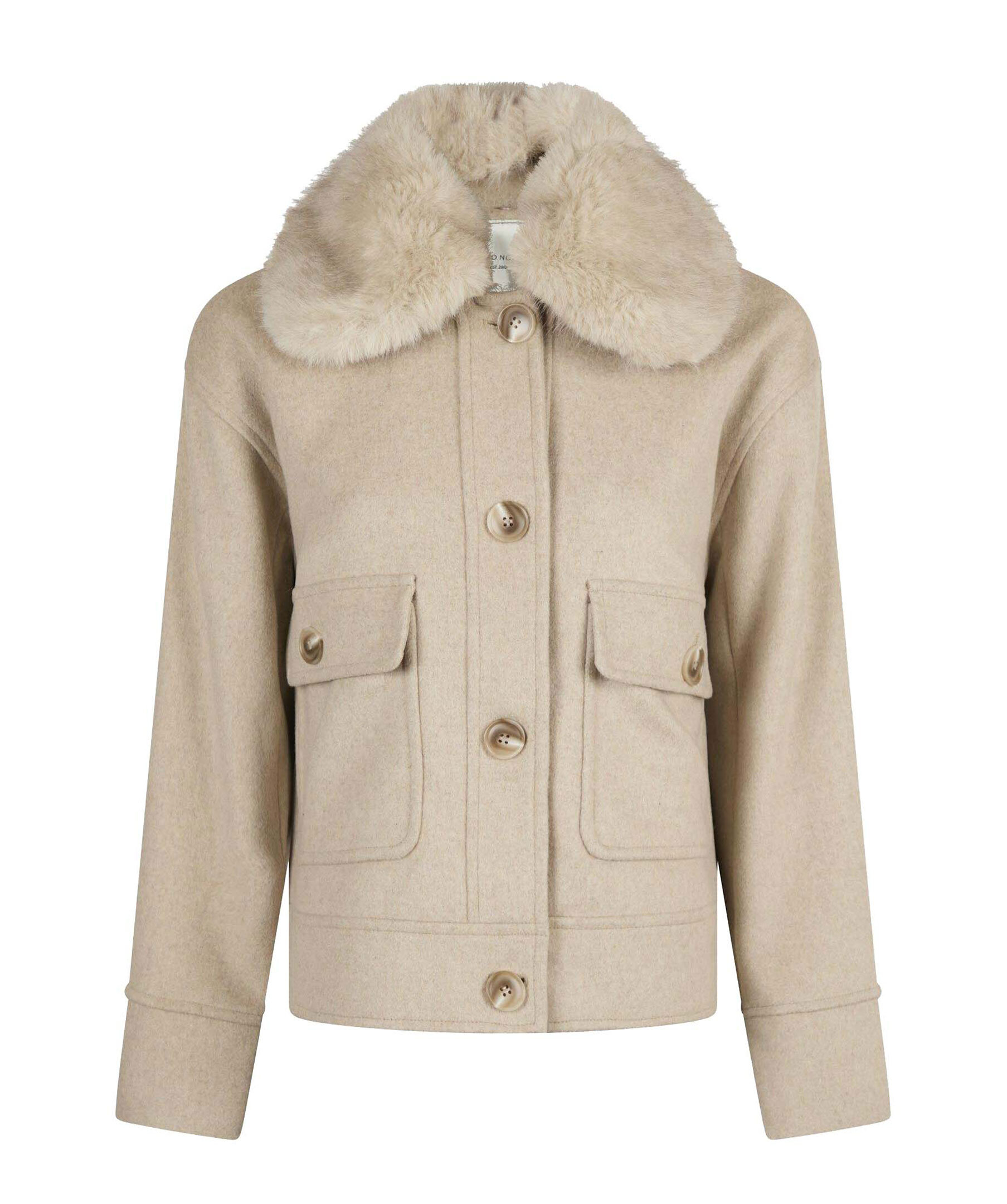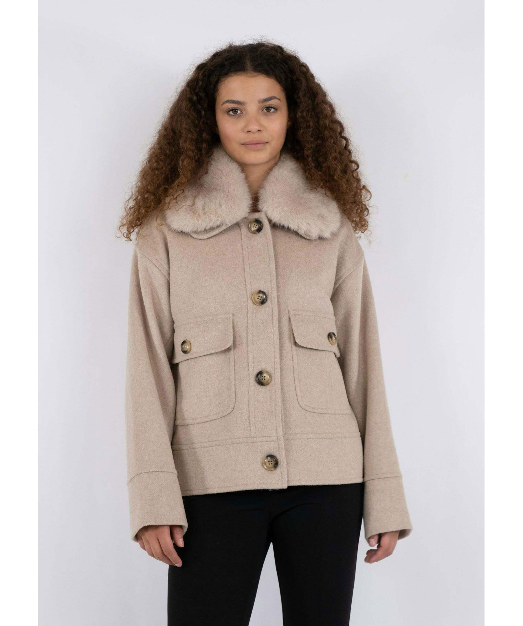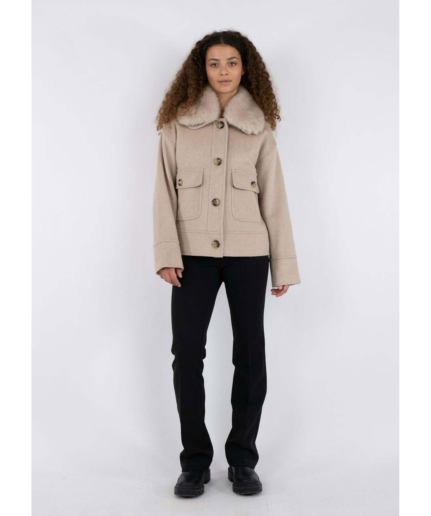 Sandfärgad ulljacka med lurvig krage från Neo Noir. Jackan stängs med synliga knappar fram och har två framfickor med lock och knapp. Tillverkad i en ullblandning.