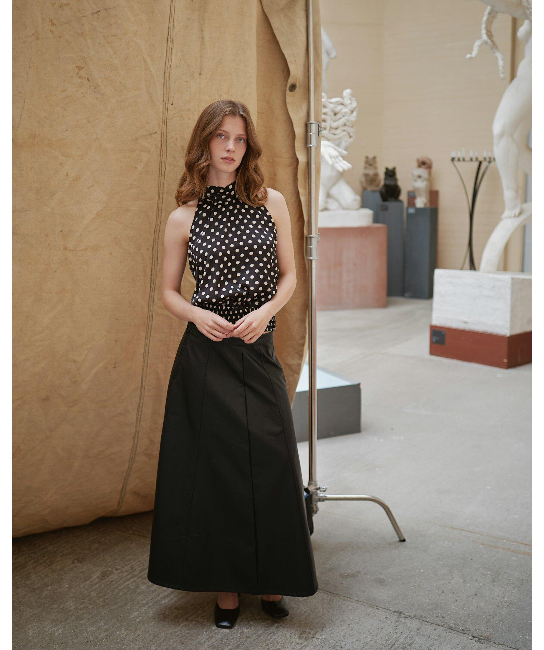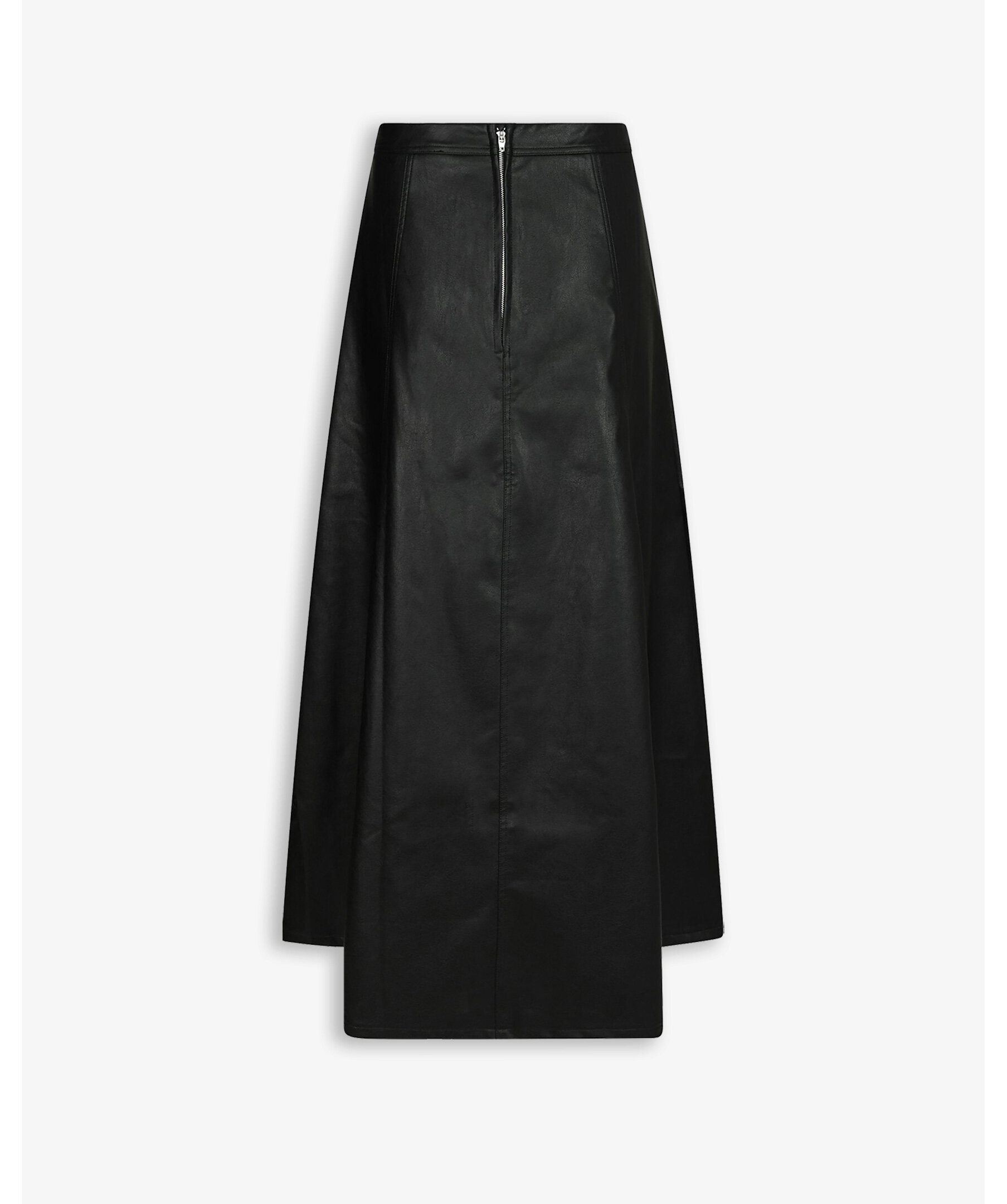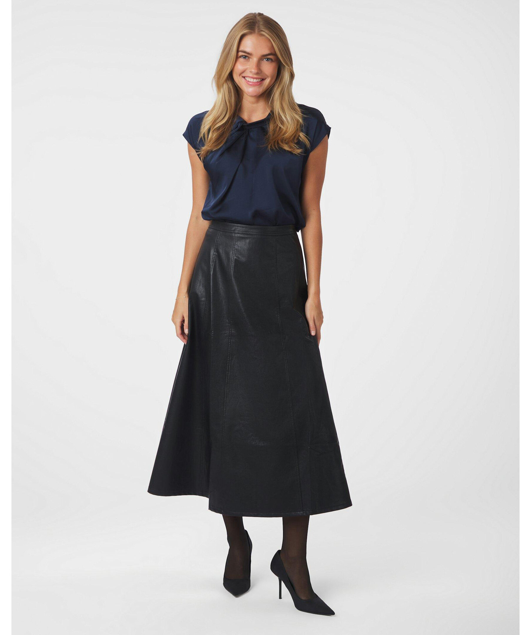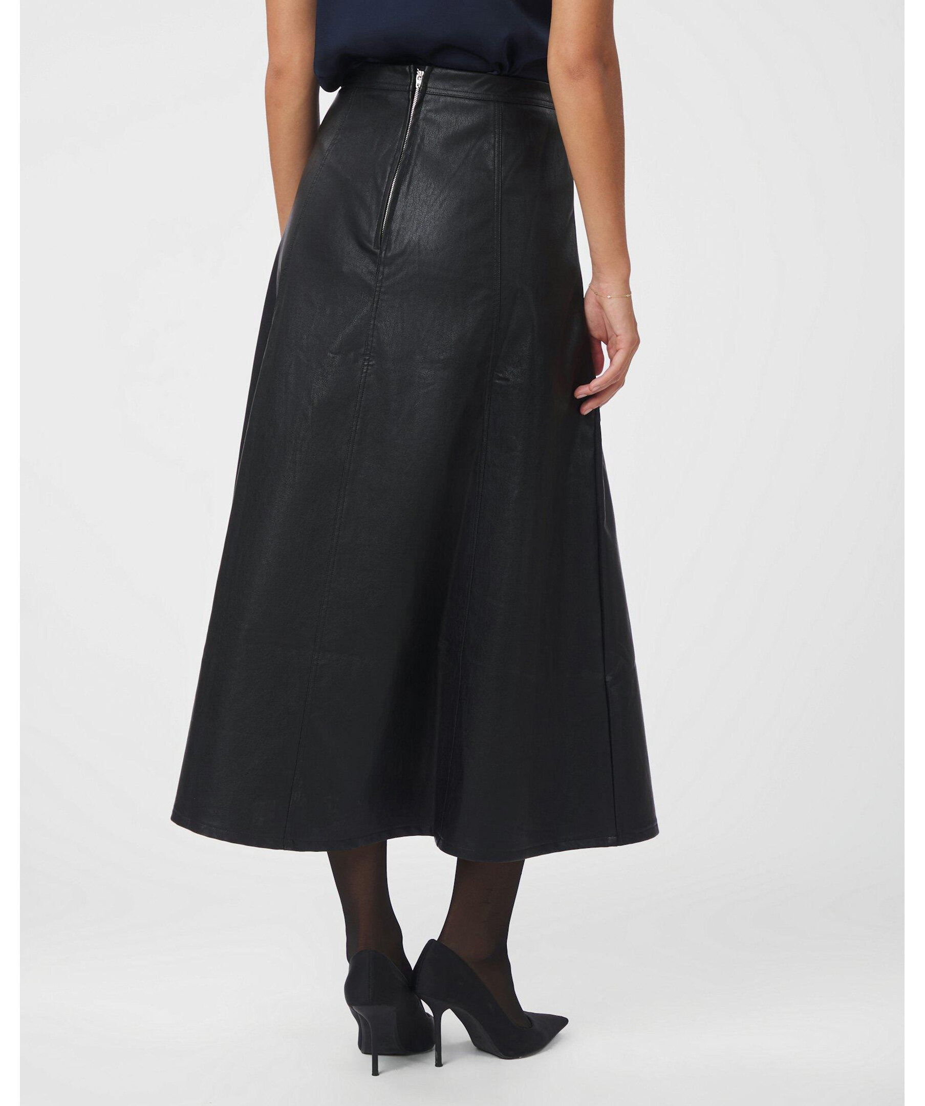 Svart kjol i läderimitation från Neo Noir. Kjolen har en dragkedja och sitter mycket smickrande. Modellen är 176 cm lång och bär storlek 36.