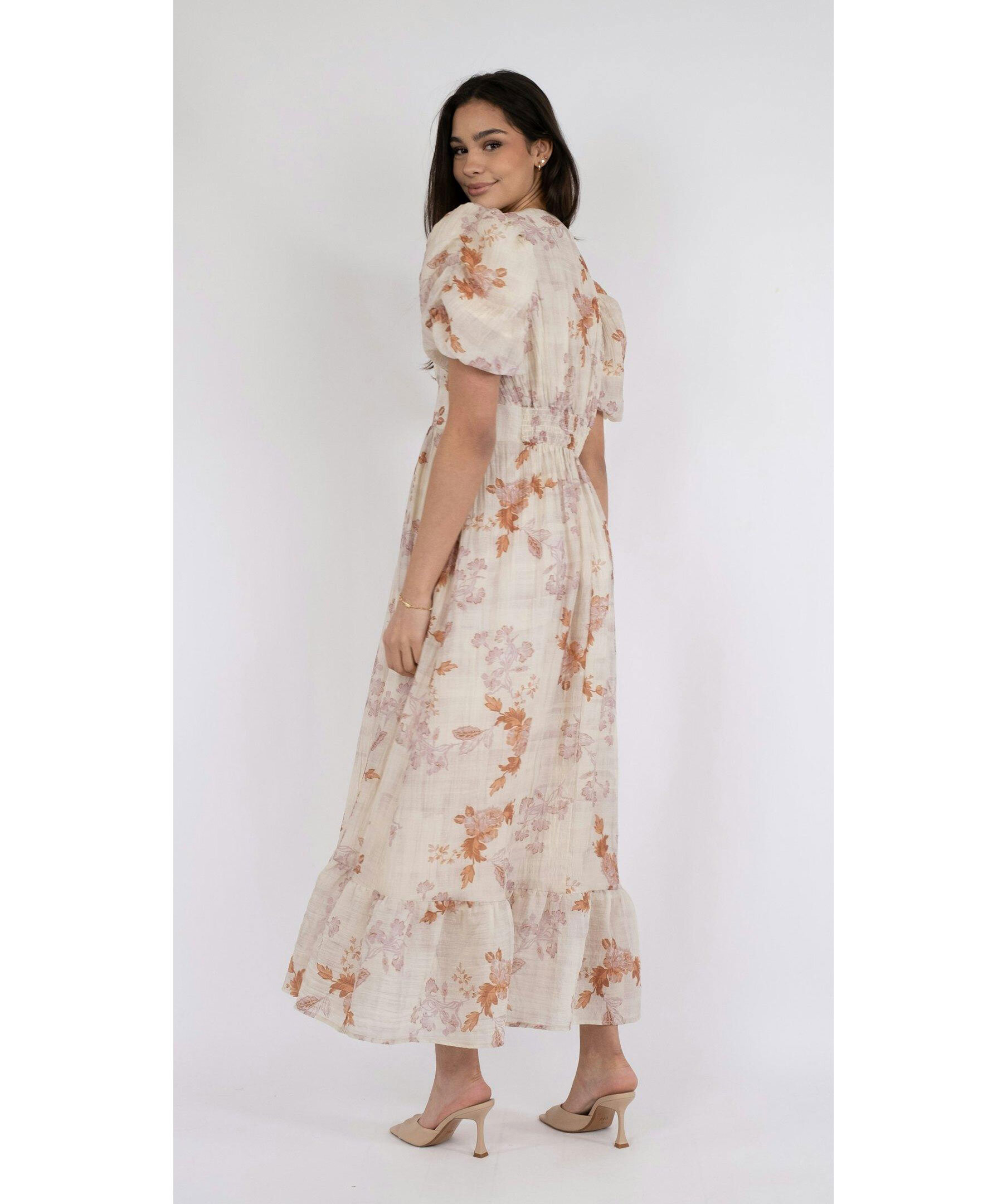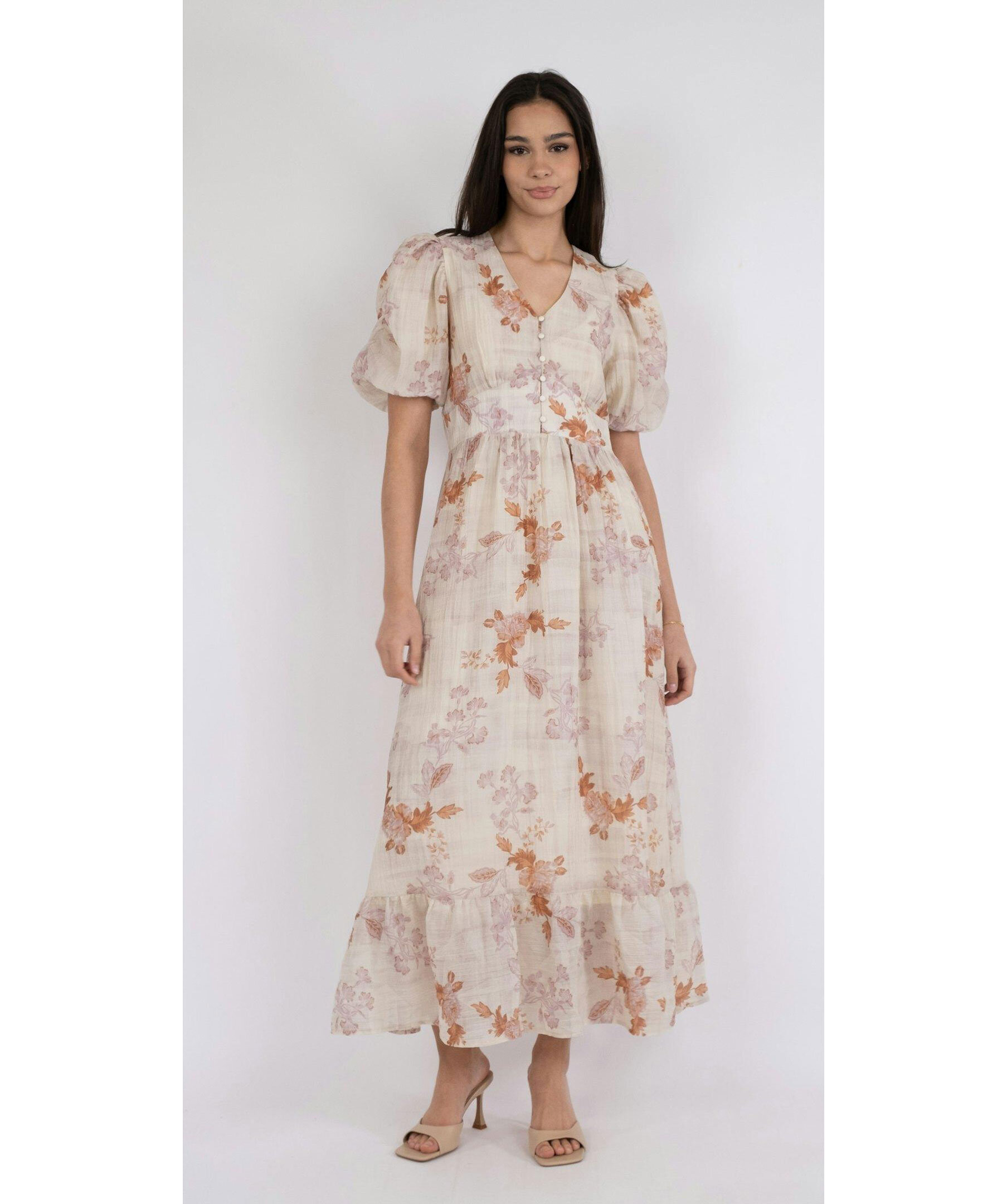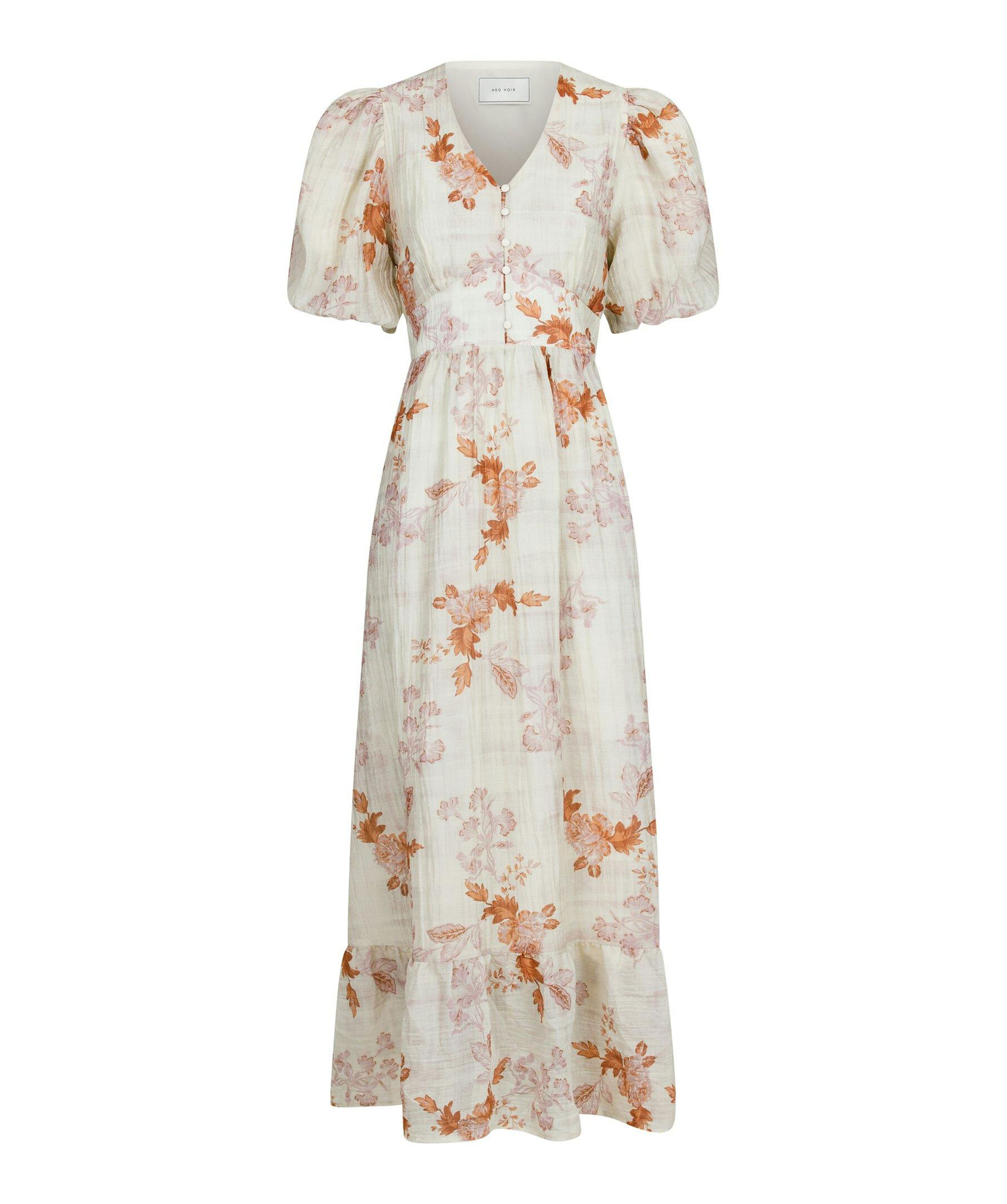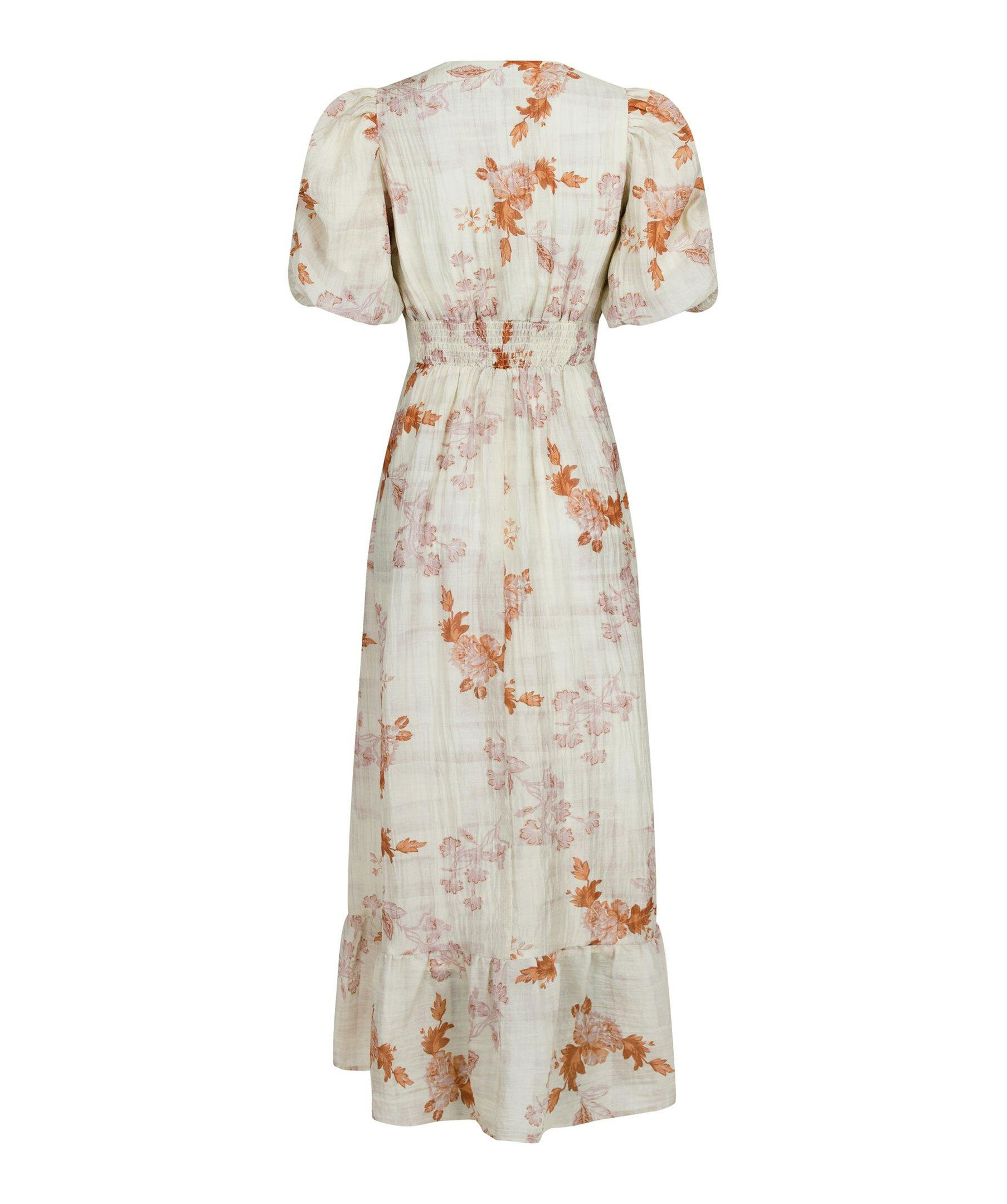 Creméfärgad klänning med blommönster från Neo Noir. Korta ballongärmar med elastisk resår vid ärmslut, V Ringad med klädda knappar och en markerad midja. Kjol med volang nedtill samt en fastsydd underkjol.