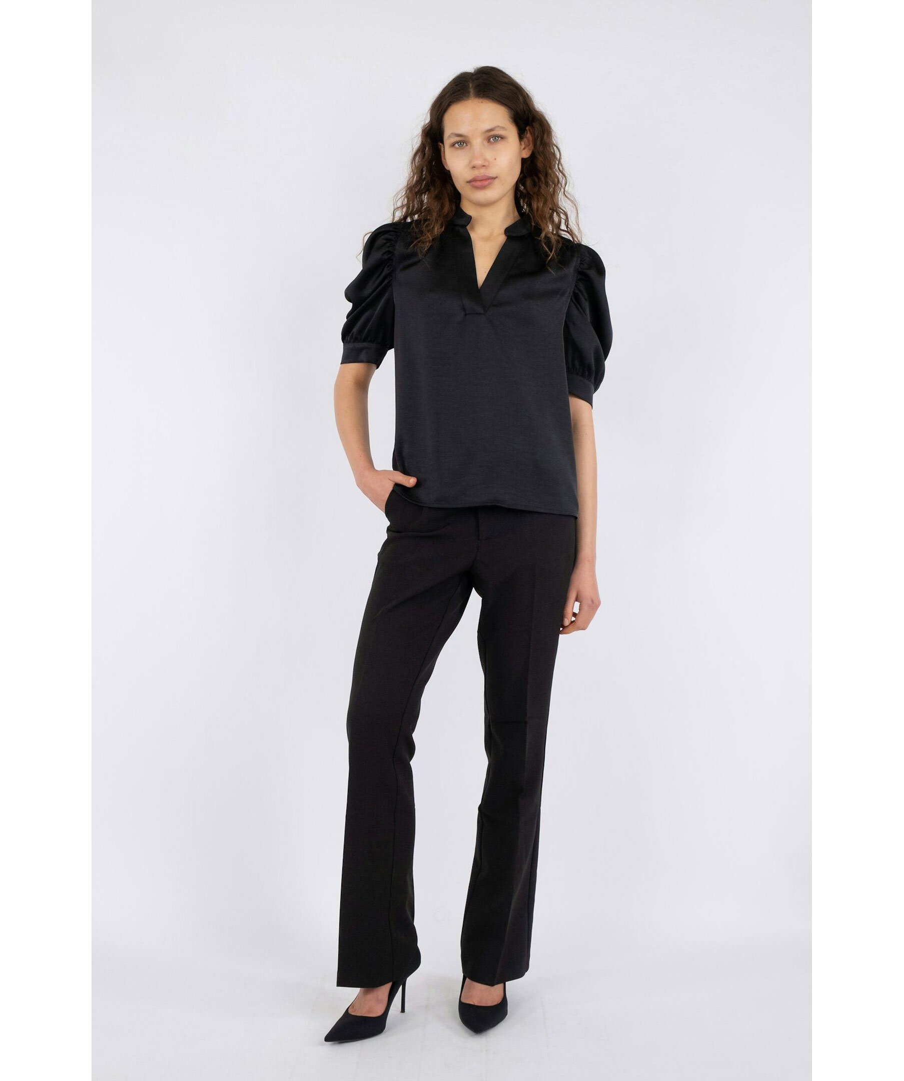 Svart blus från Neo Noir. Elegant öppning framtill och draperade ärmar för en sofistikerad touch. Dekorativa sömmar ger en stilren detalj. Blusen har en V-ringning vid halsen och är tillverkad i mjuk satin, vilket gör den perfekt för både vardag och festliga tillfällen.