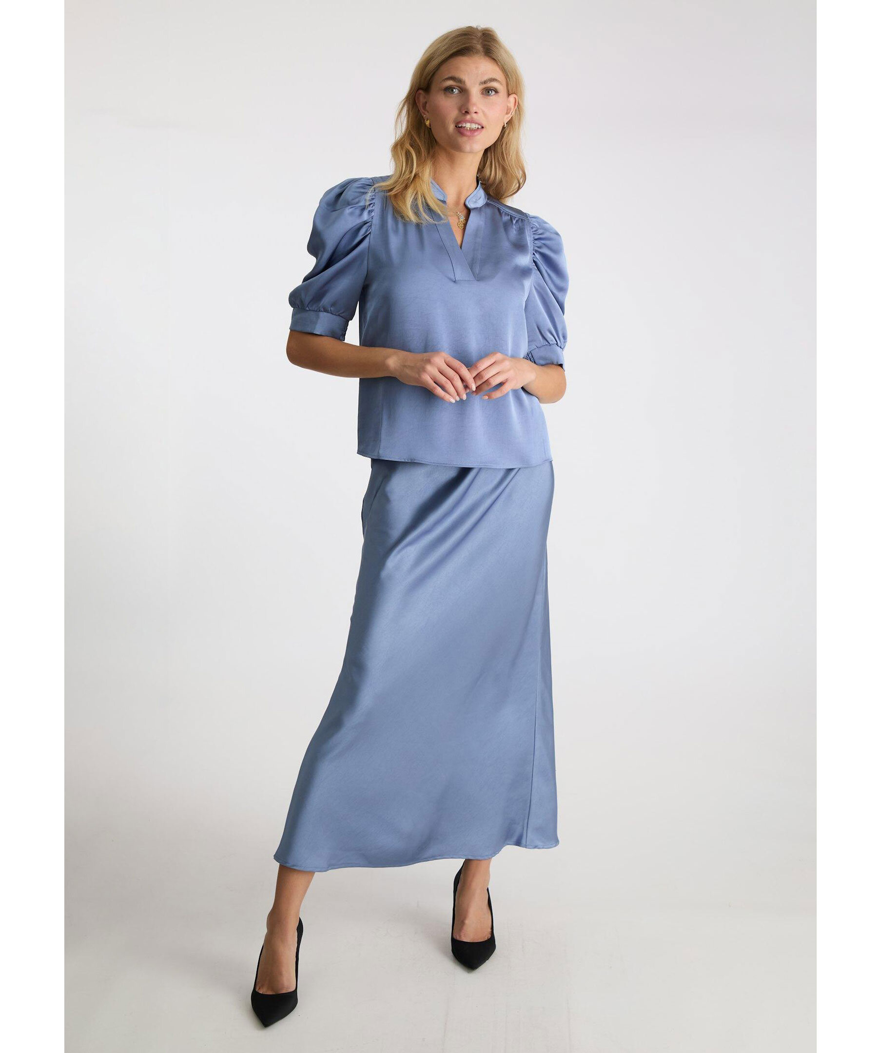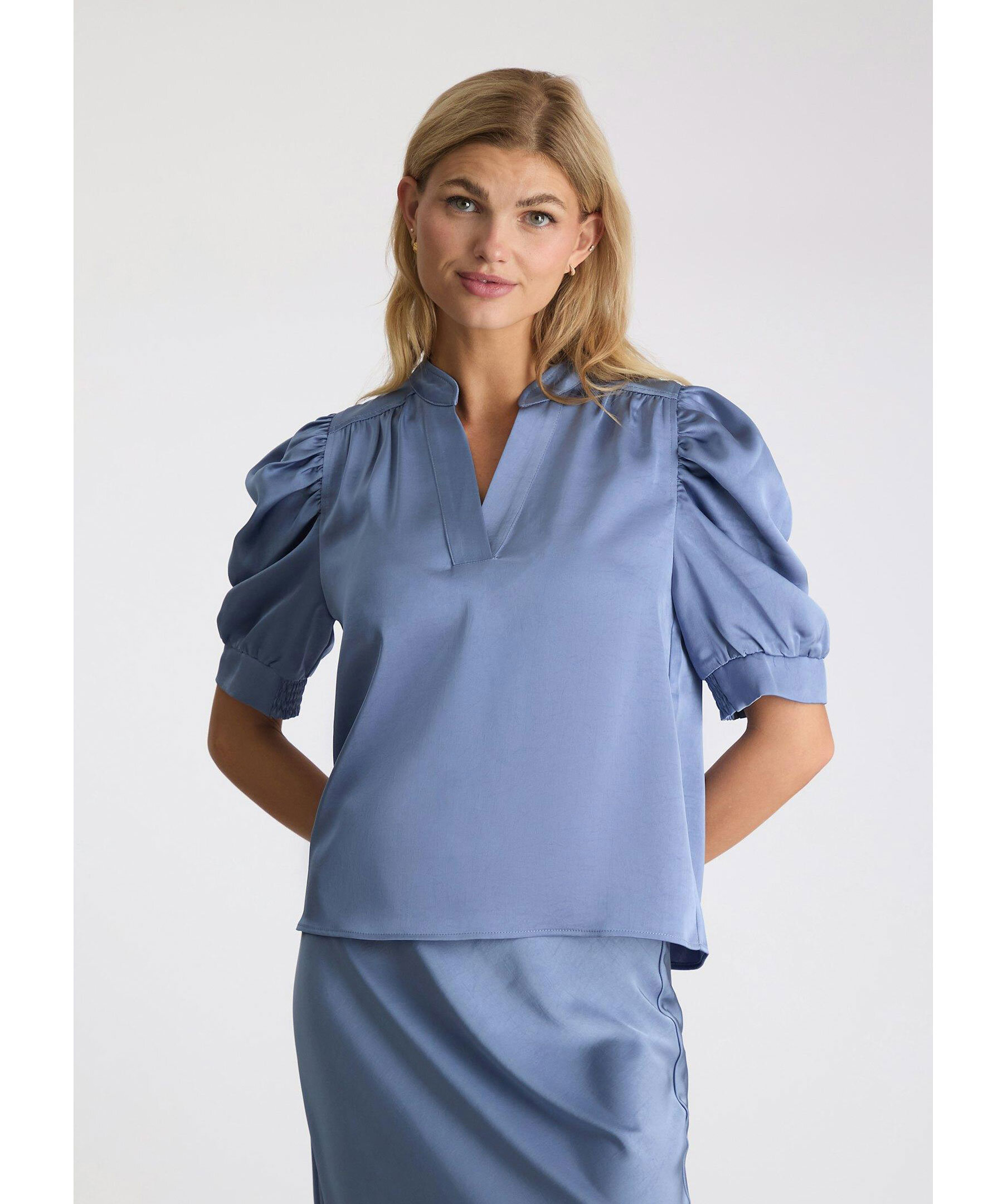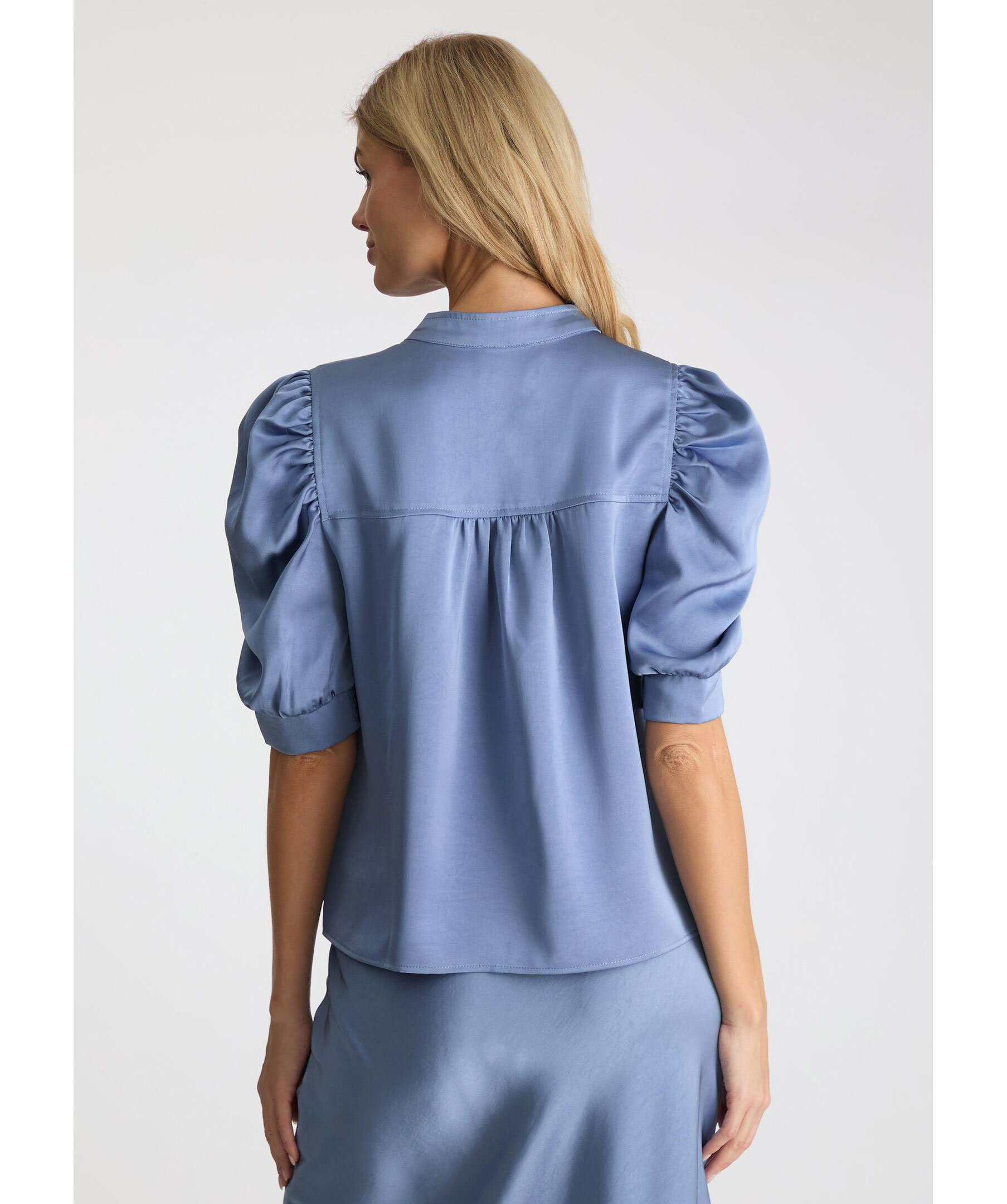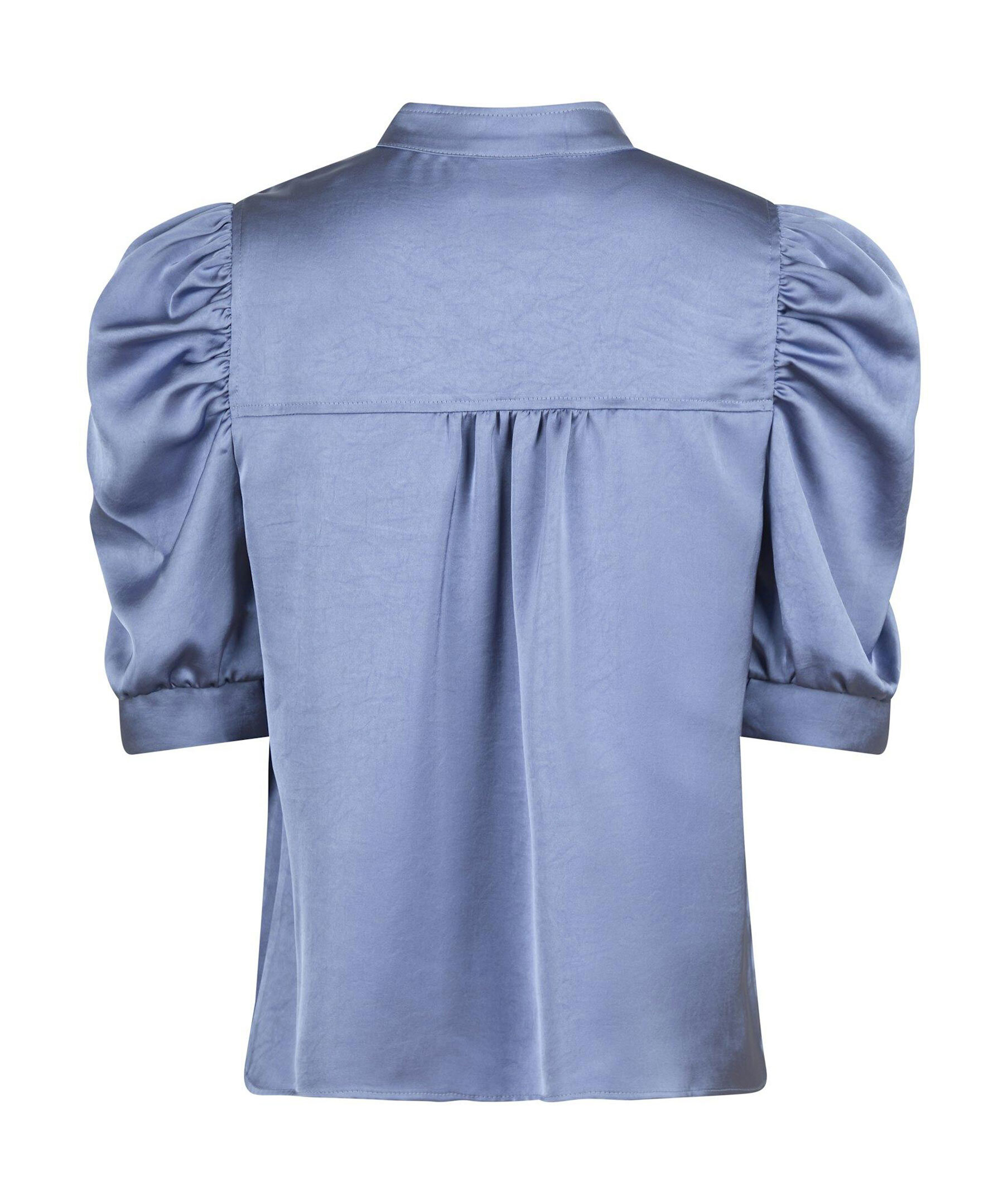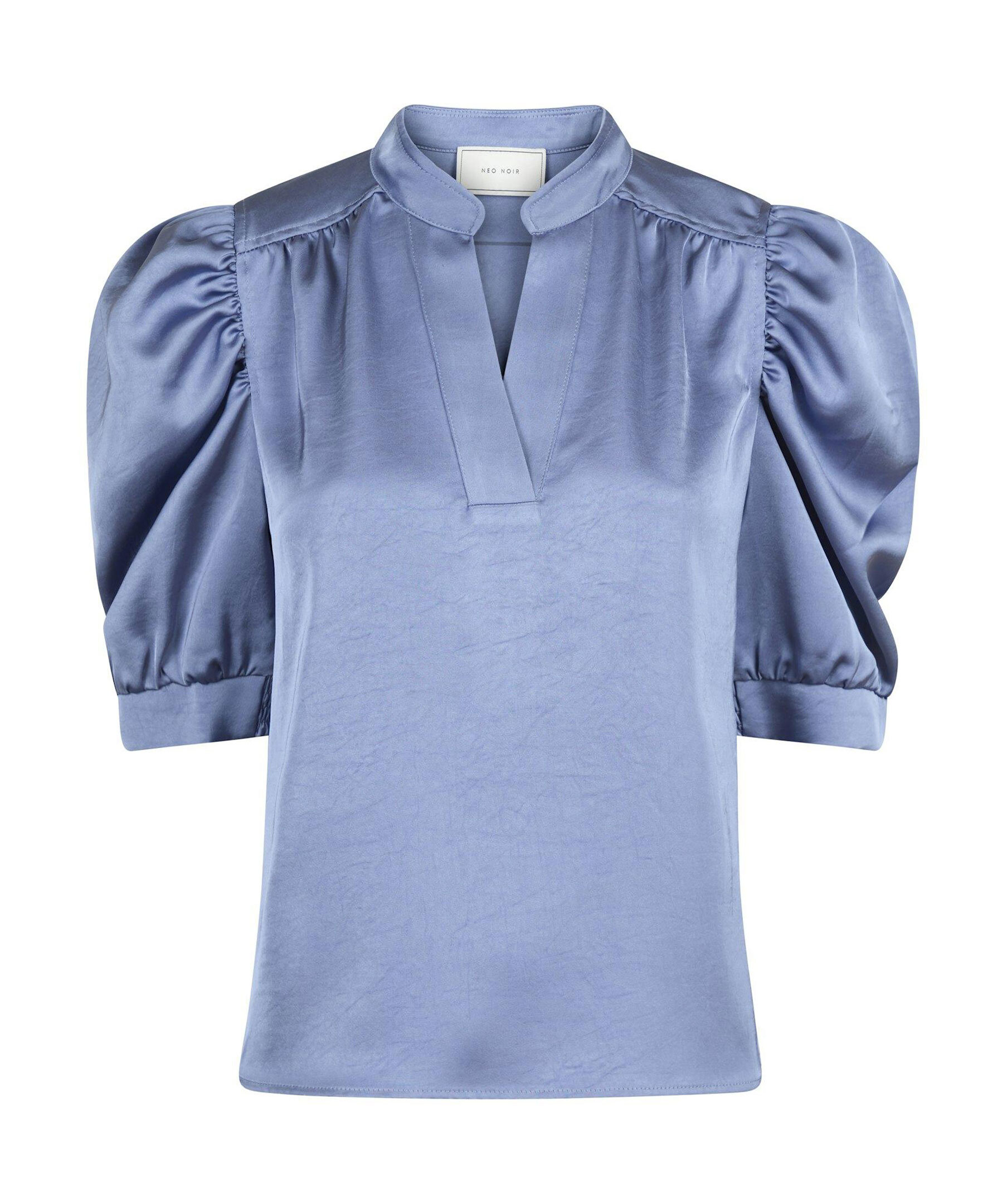 Blå satinblus från Neo Noir. Blusen är V-ringad och har puffärmar som slutar strax över armbågen och plissering i ryggen. Dekorativa sömmar vid axlarna. Tillverkad i en polyesterblandning.