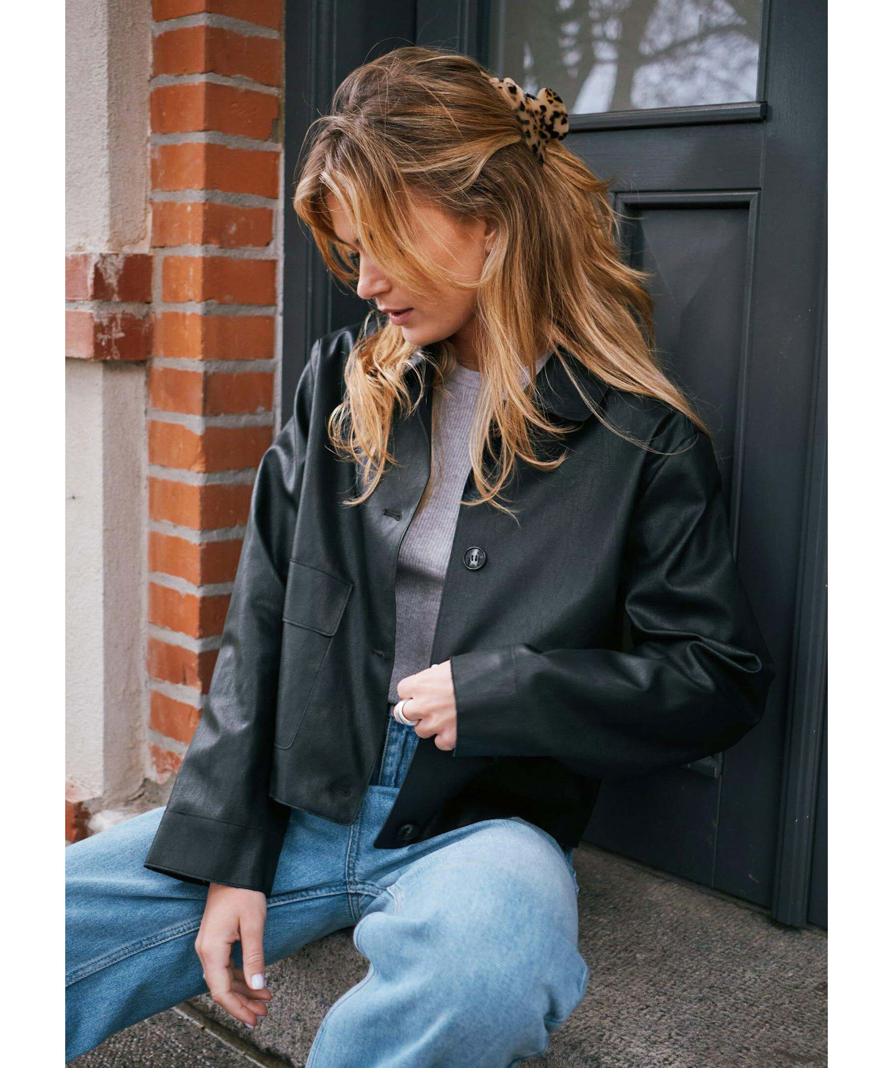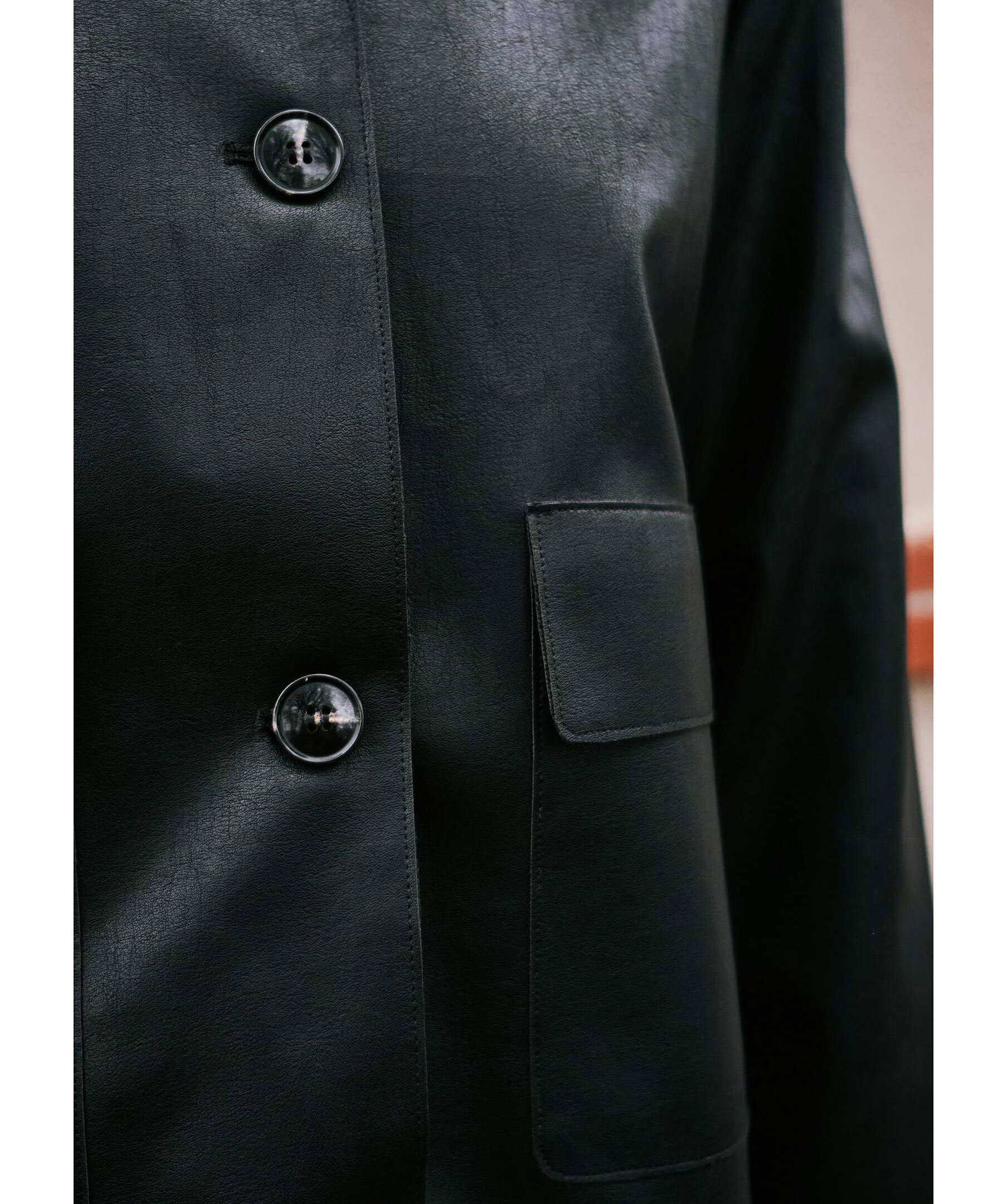 Svart jacka i läderimitation från Nei Noir. Jackan har avslappnande axlar, stängs med knappar framtill och har påsydda fickor. Tillverkad av 100% polyester.