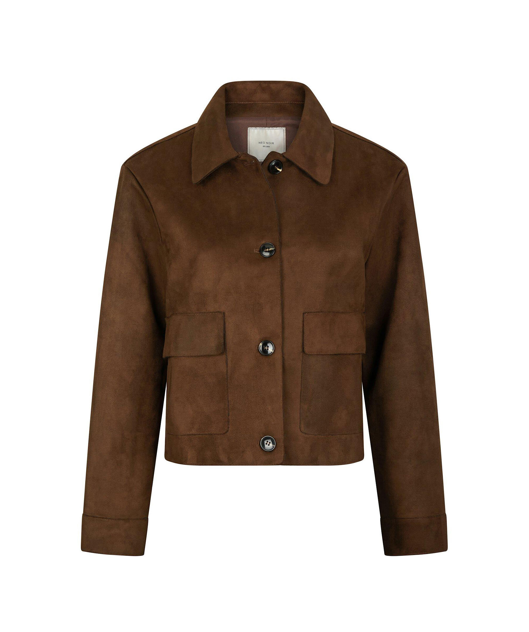 Brun, kort jacka i konstgjord mockaläder från Neo Noir. Stängs med knappar framtill och har två fickor med lock. Tillverkad i polyester.
