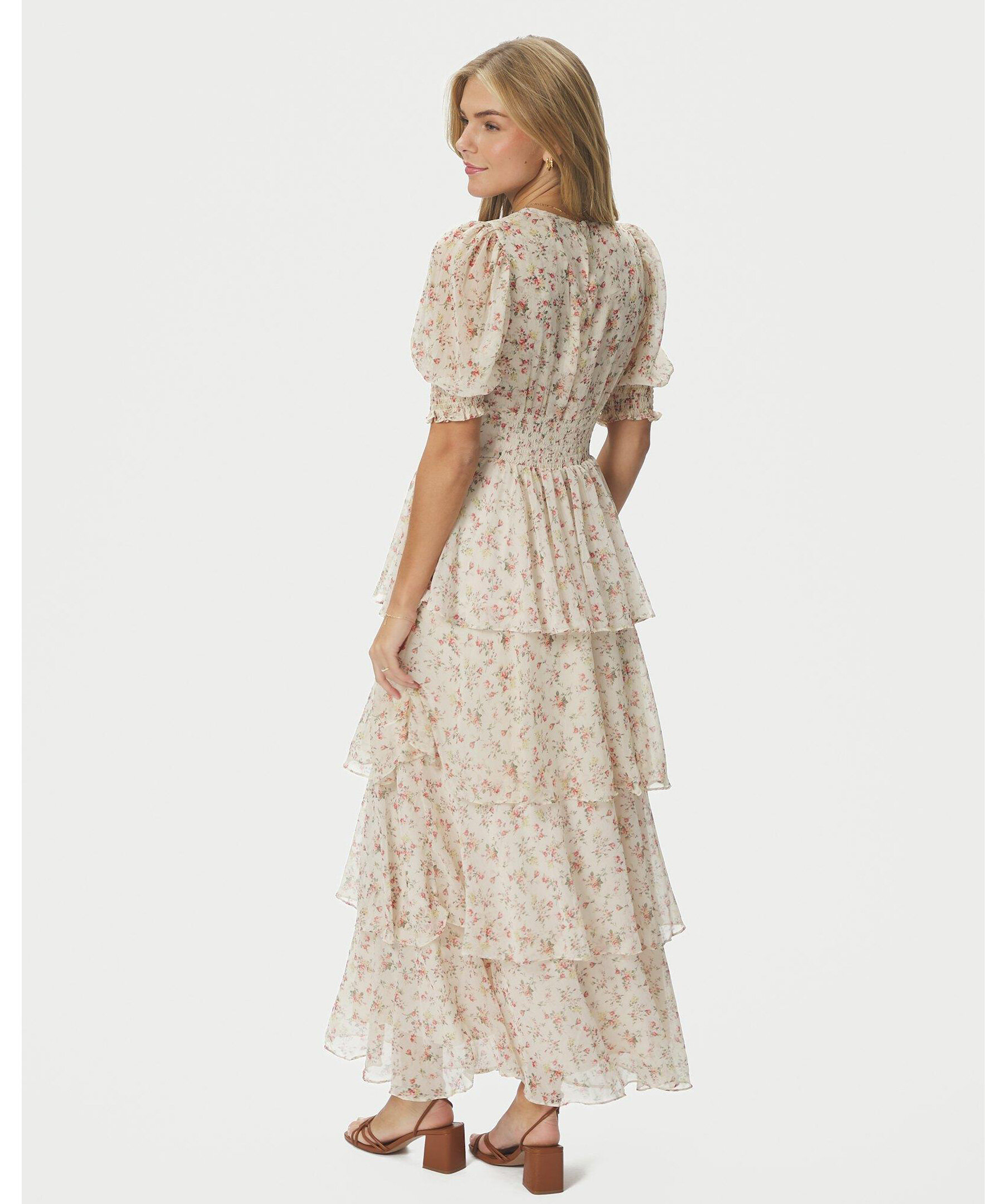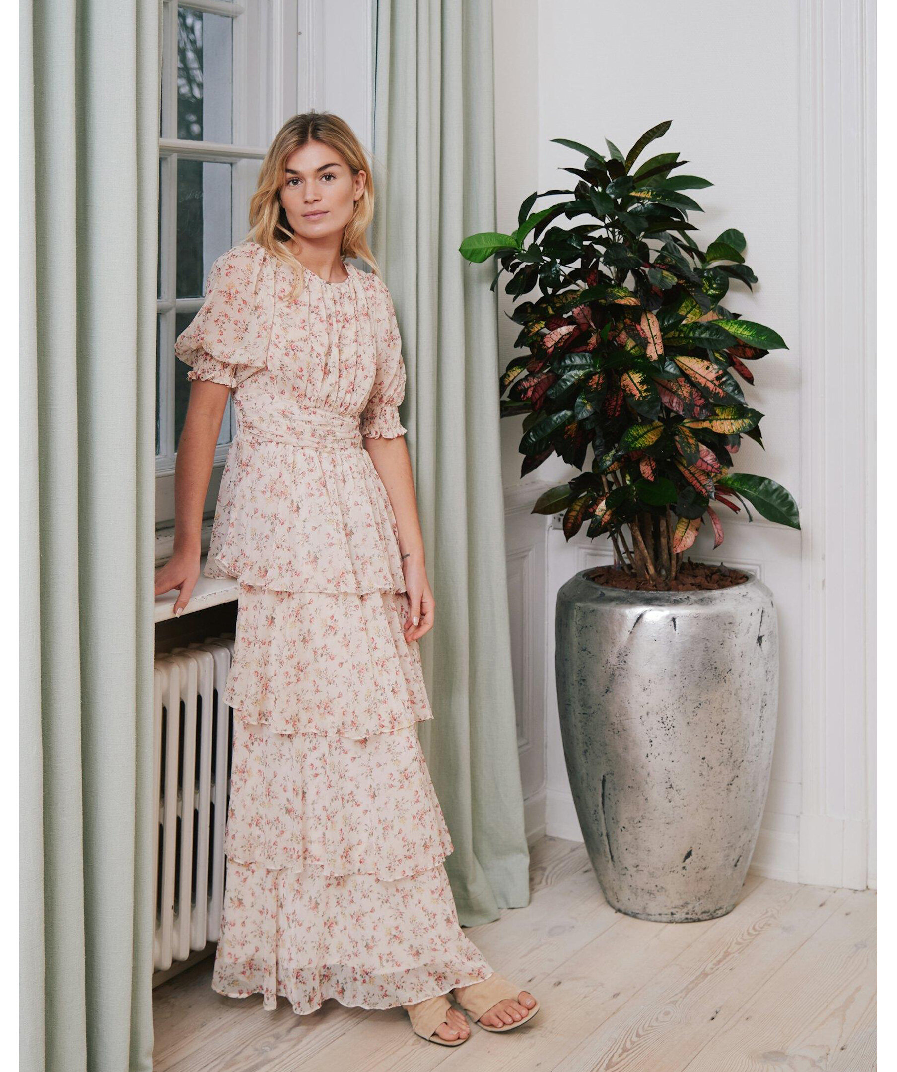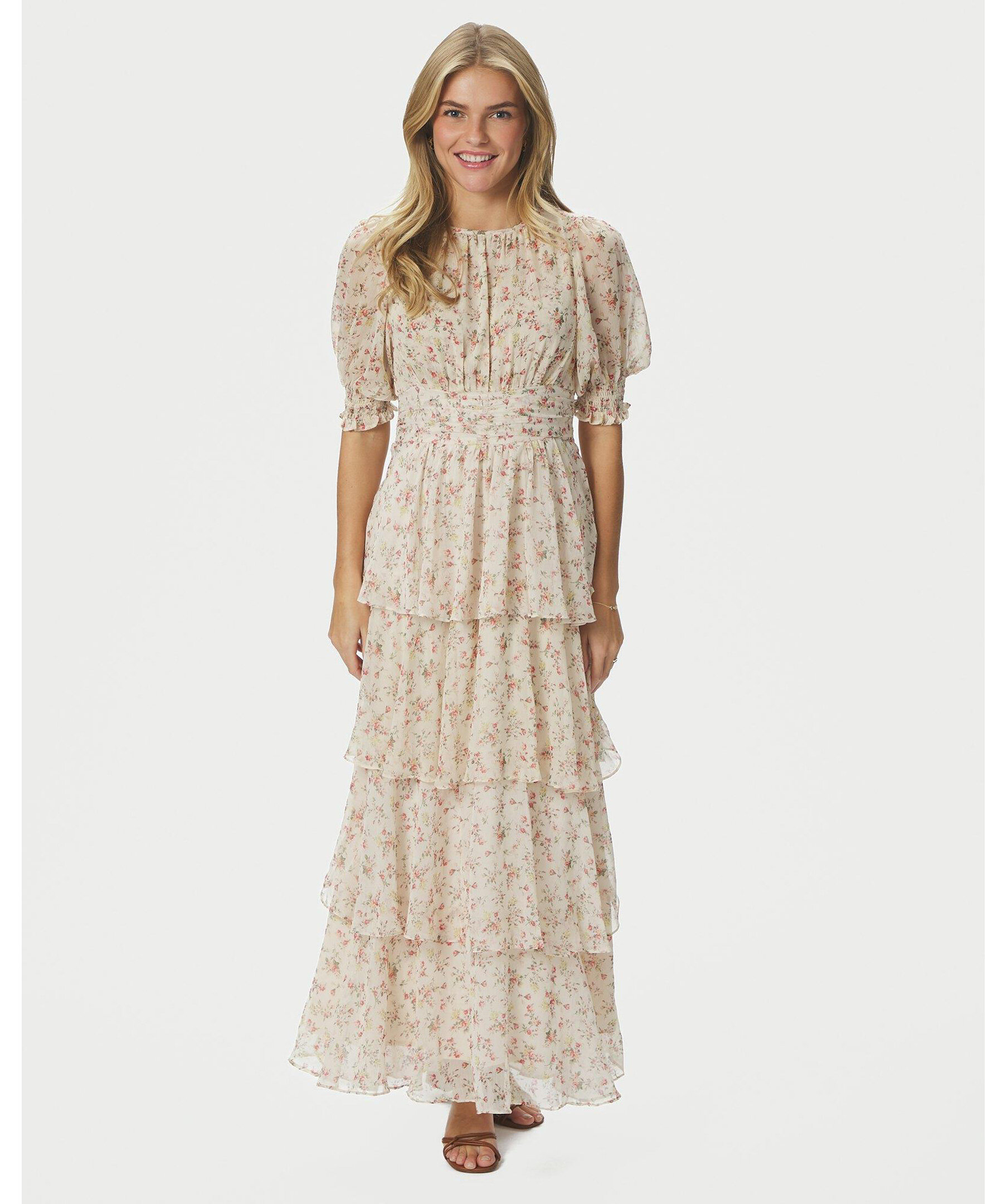 Vacker klänning i polyester med detaljer i tejp, lösa ärmar och en vågig, volangkjol. Modellen är 176 cm och bär storlek 36.