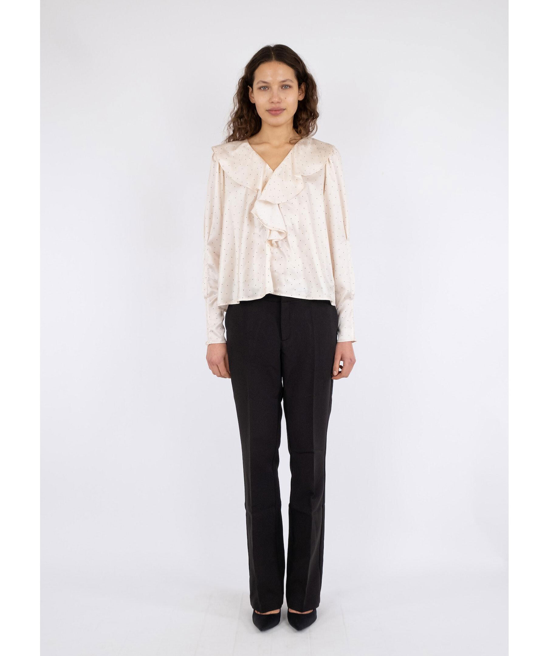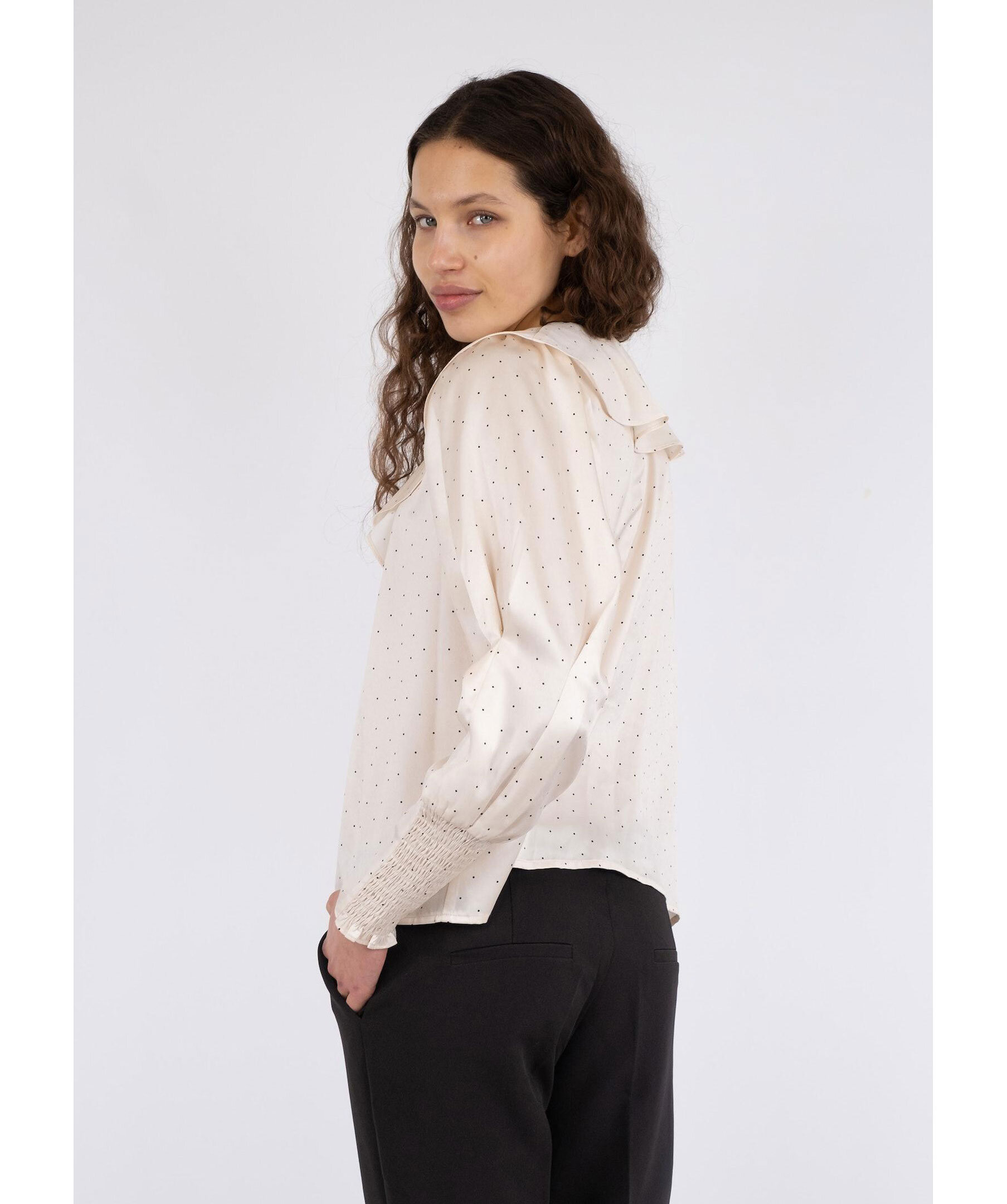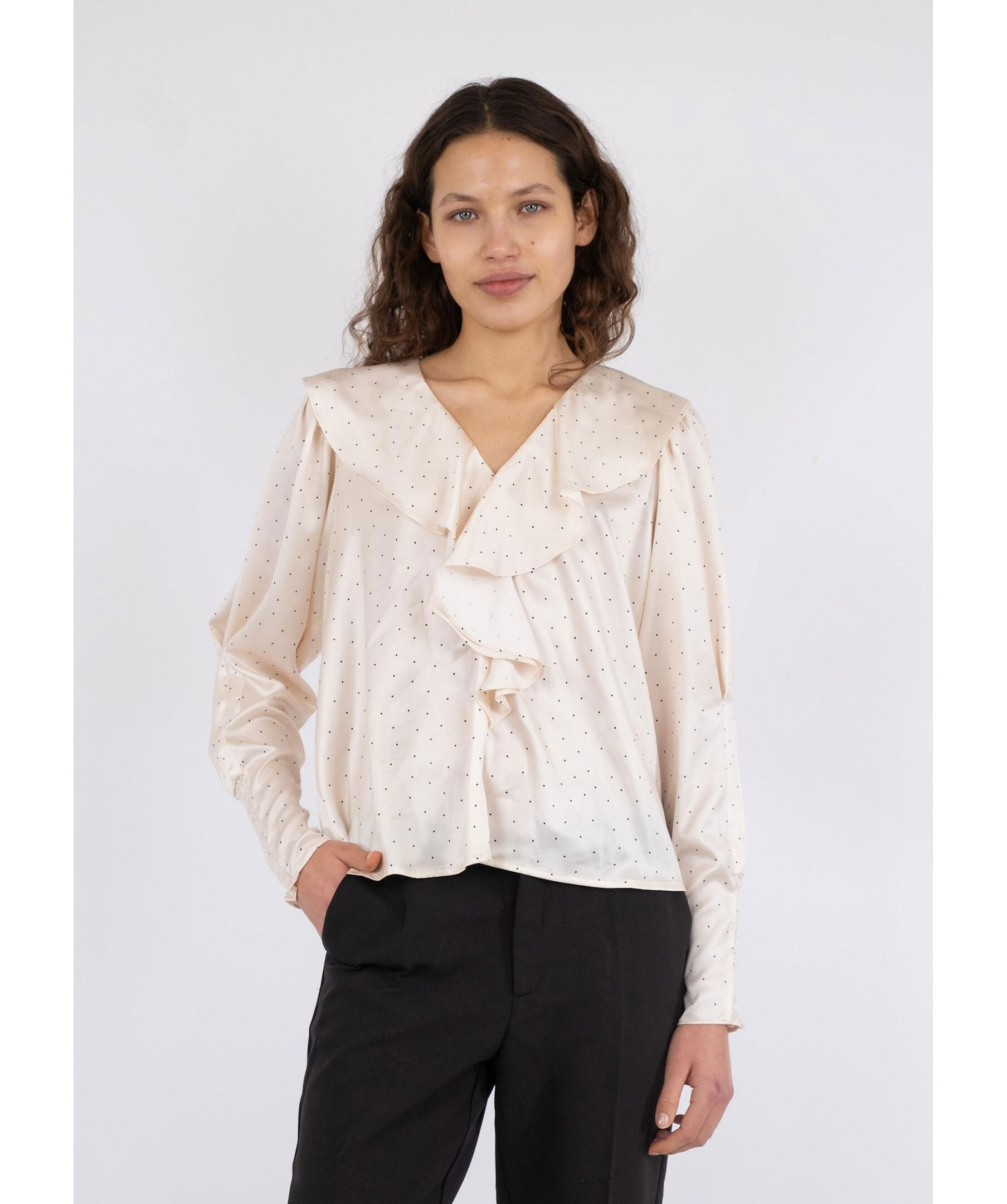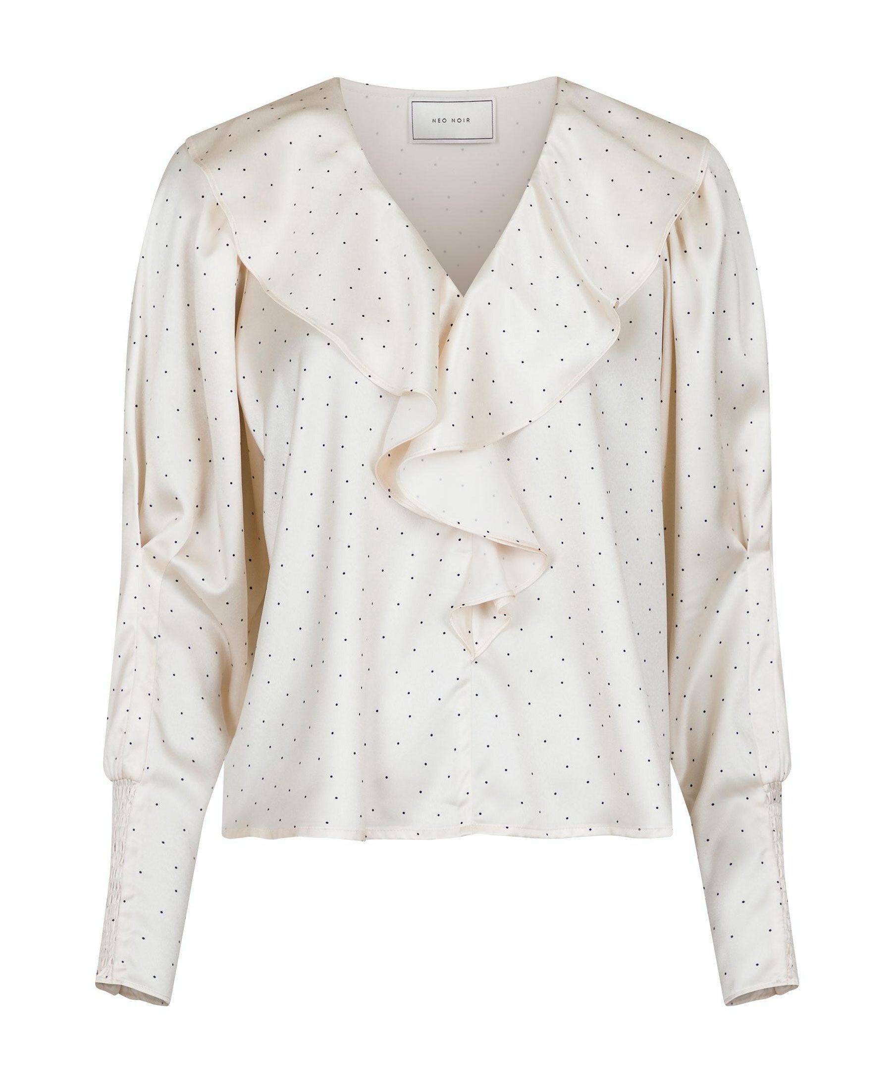 Krämvit silkblus från Neo Noir med prickar. V-ringad hals med volanger. Smockdetaljer vid ärmslut. Tillverkad i polyester. Lös passform.
