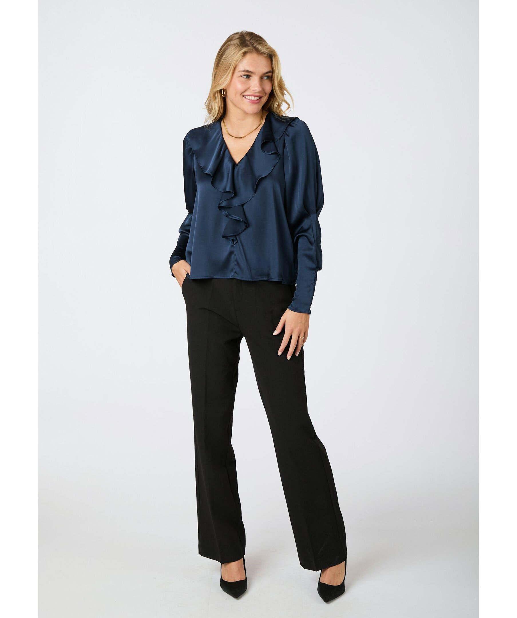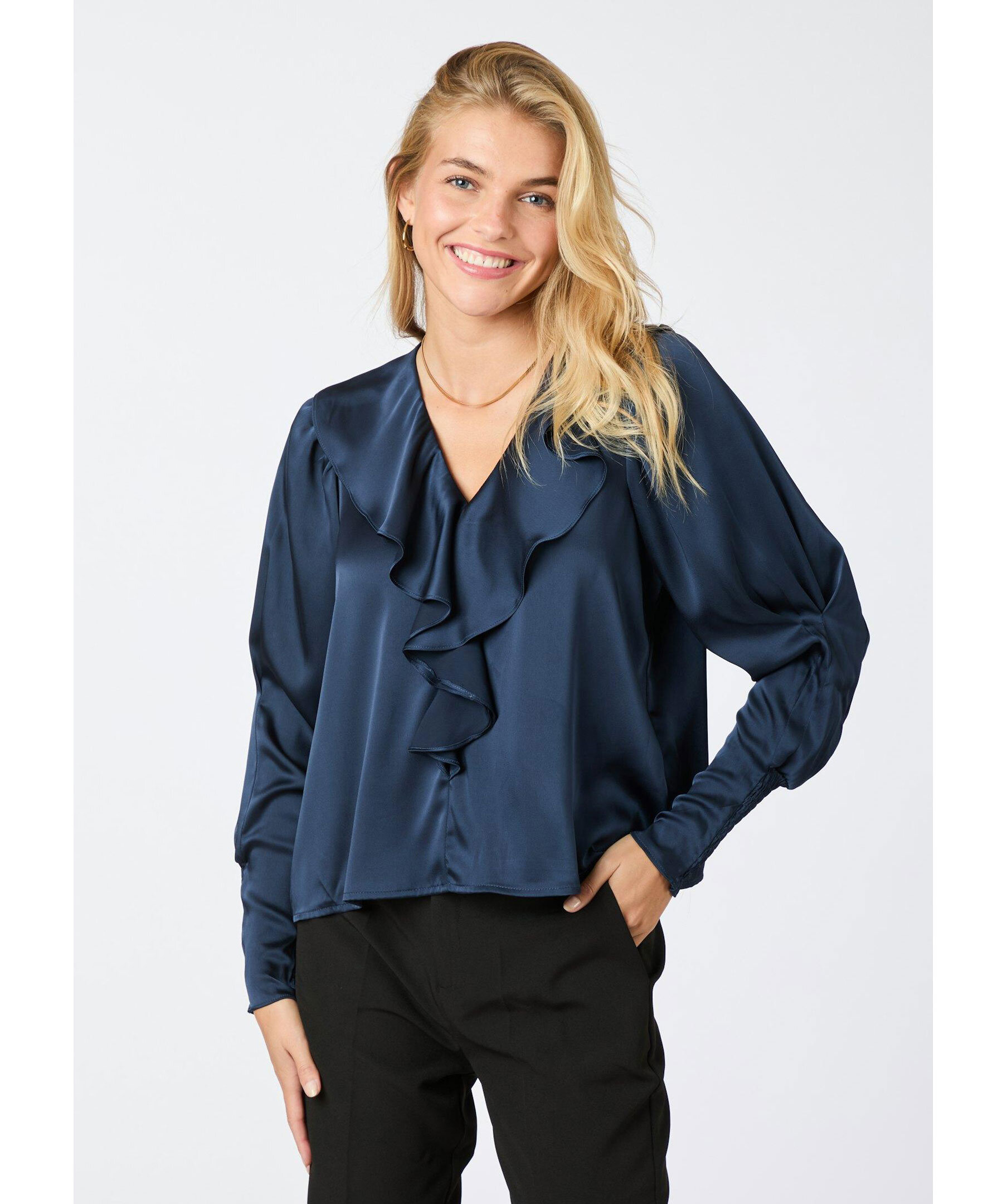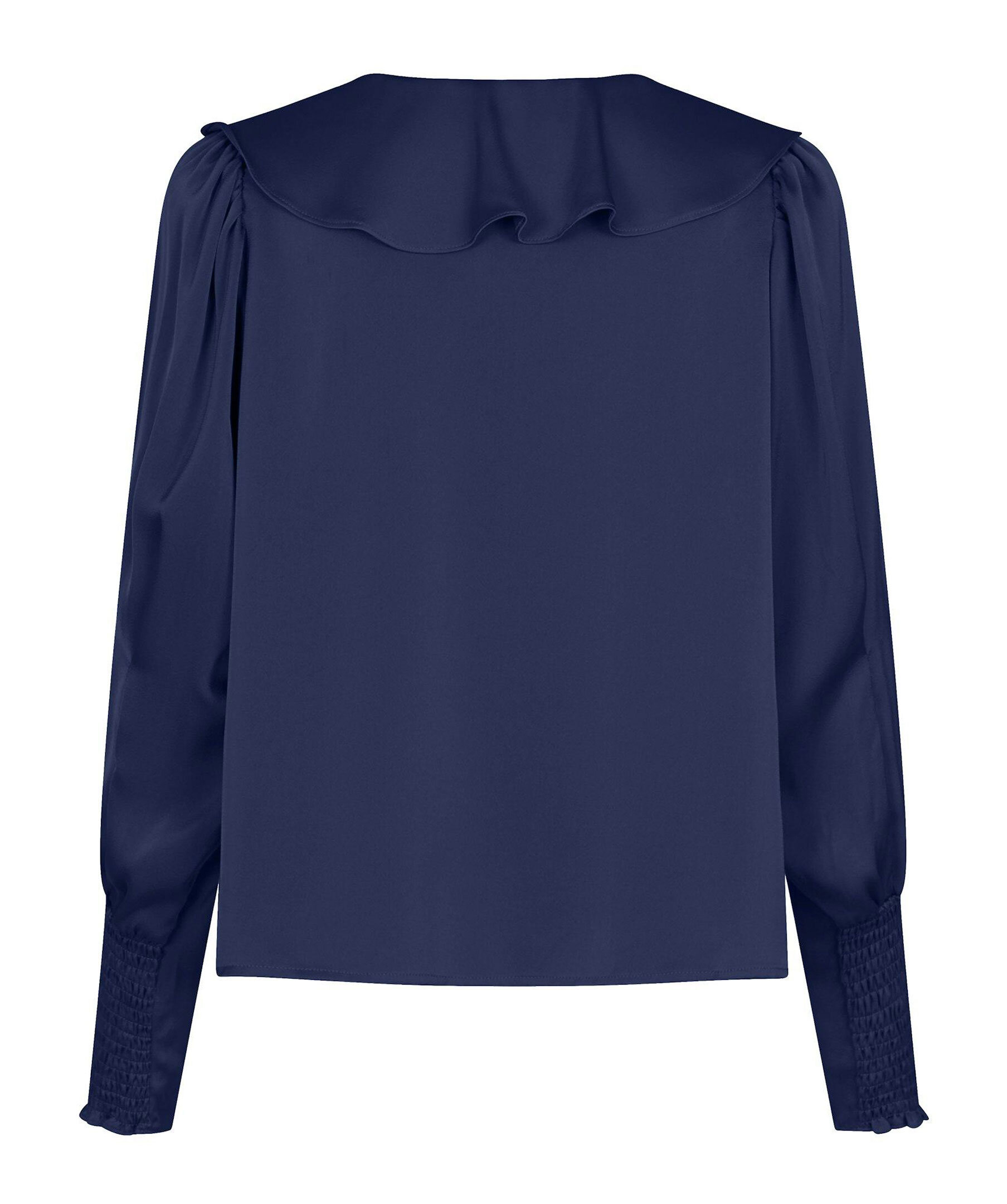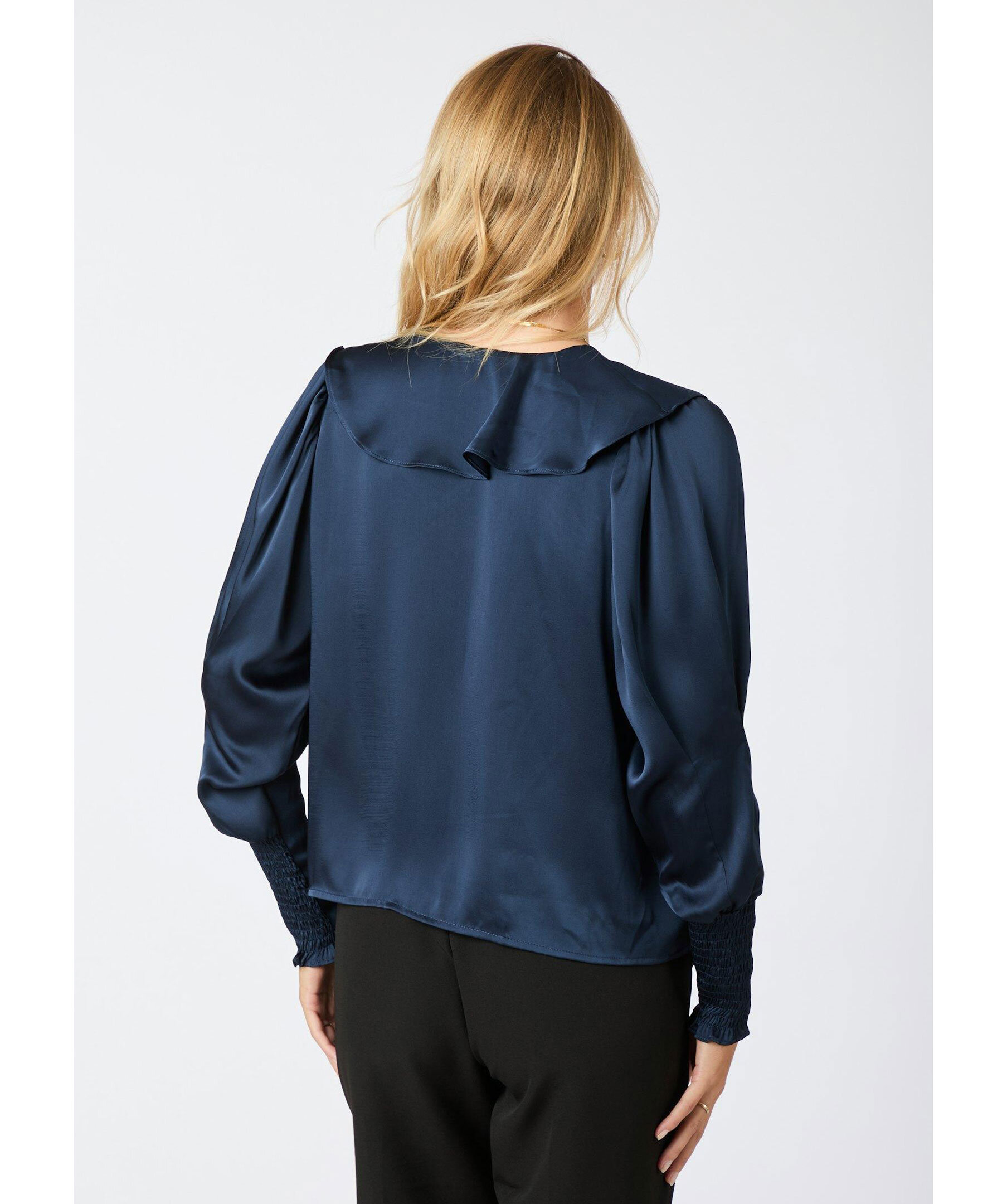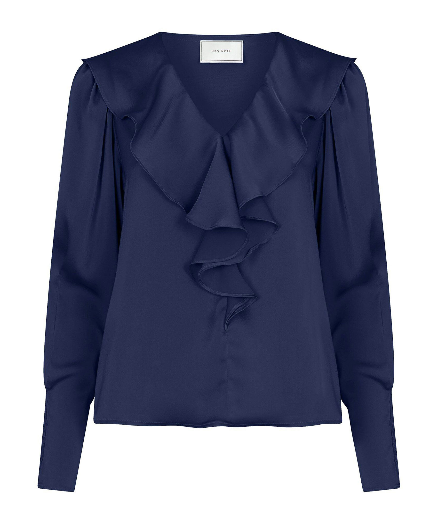 Marinblå, feminin blus från Neo Noir. Blusen har volangkrage och v-ringning och är tillverkad i mjuk satin. Ärmsluten är försedda med en mjuk smock.