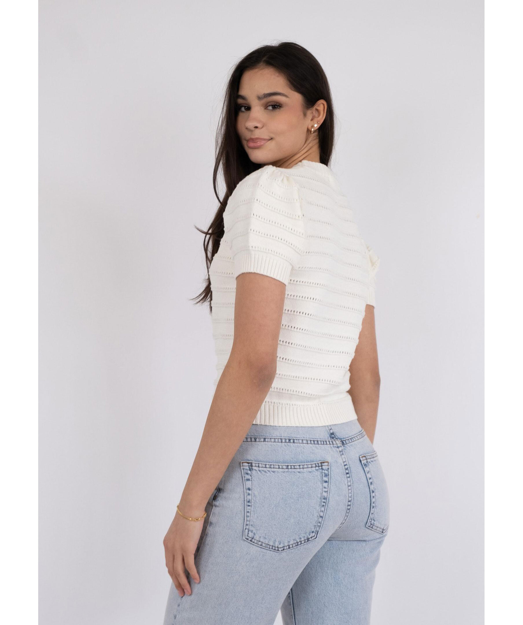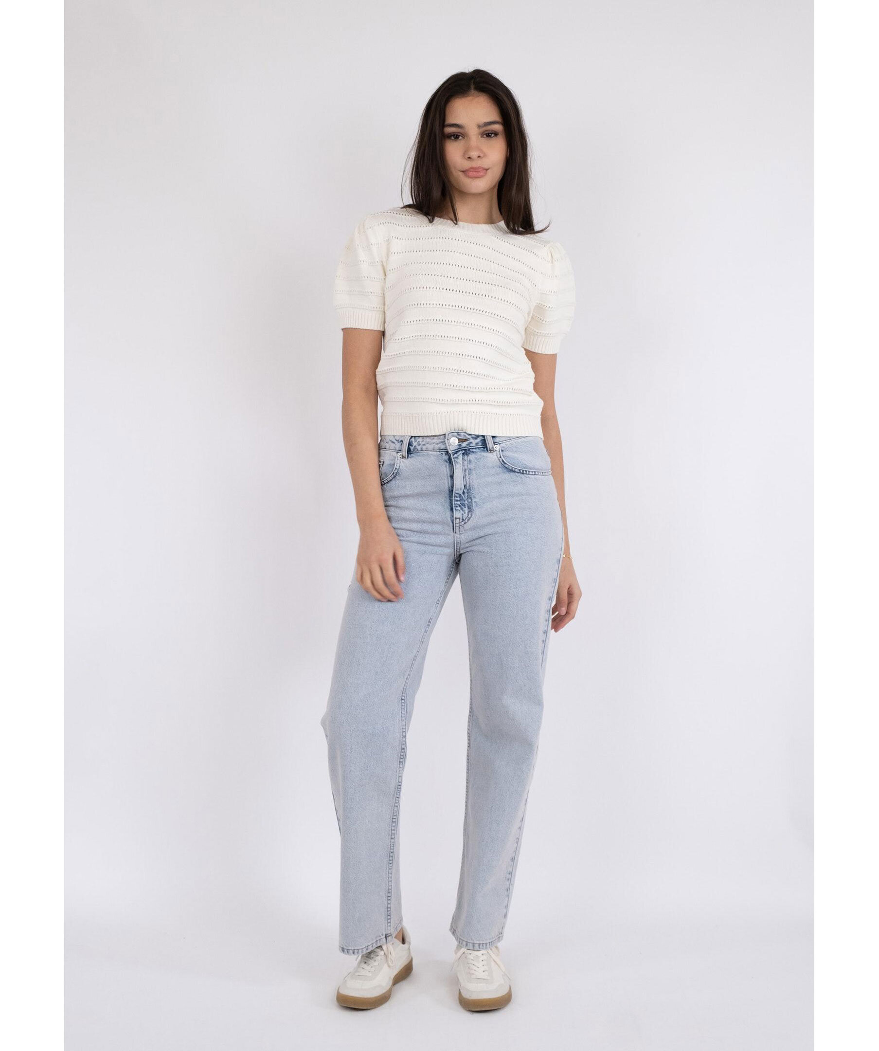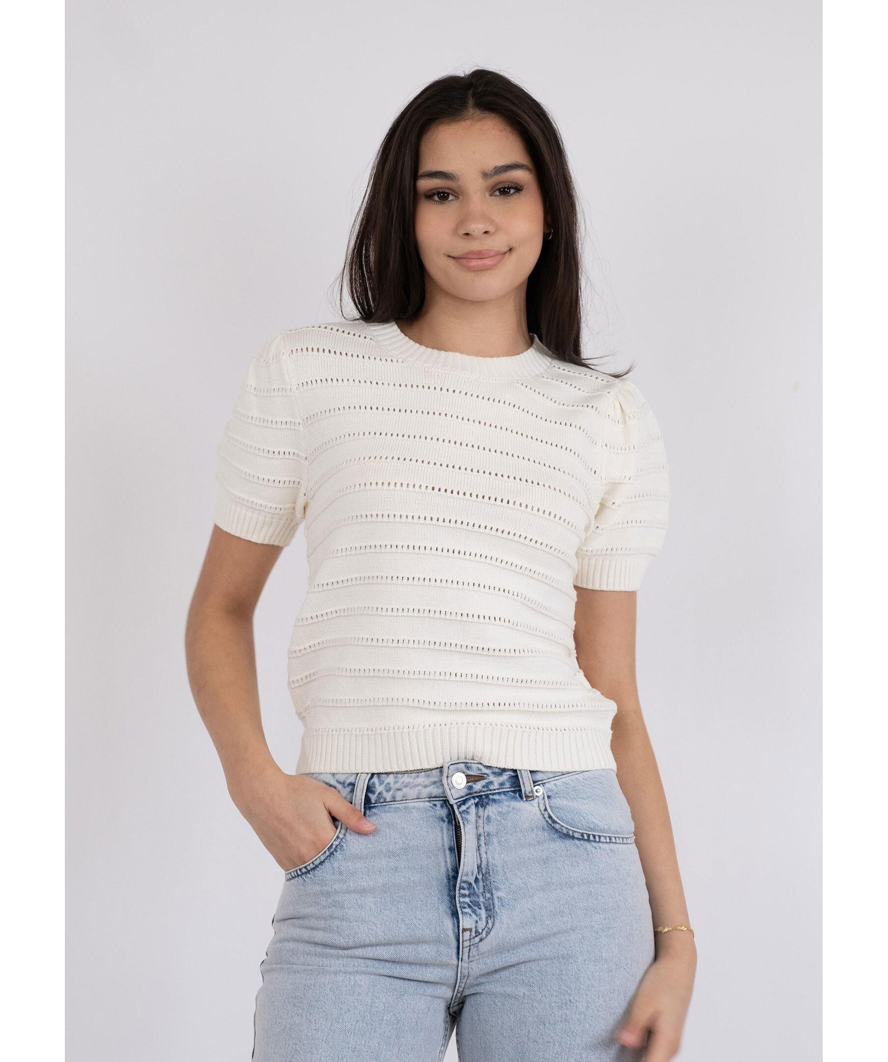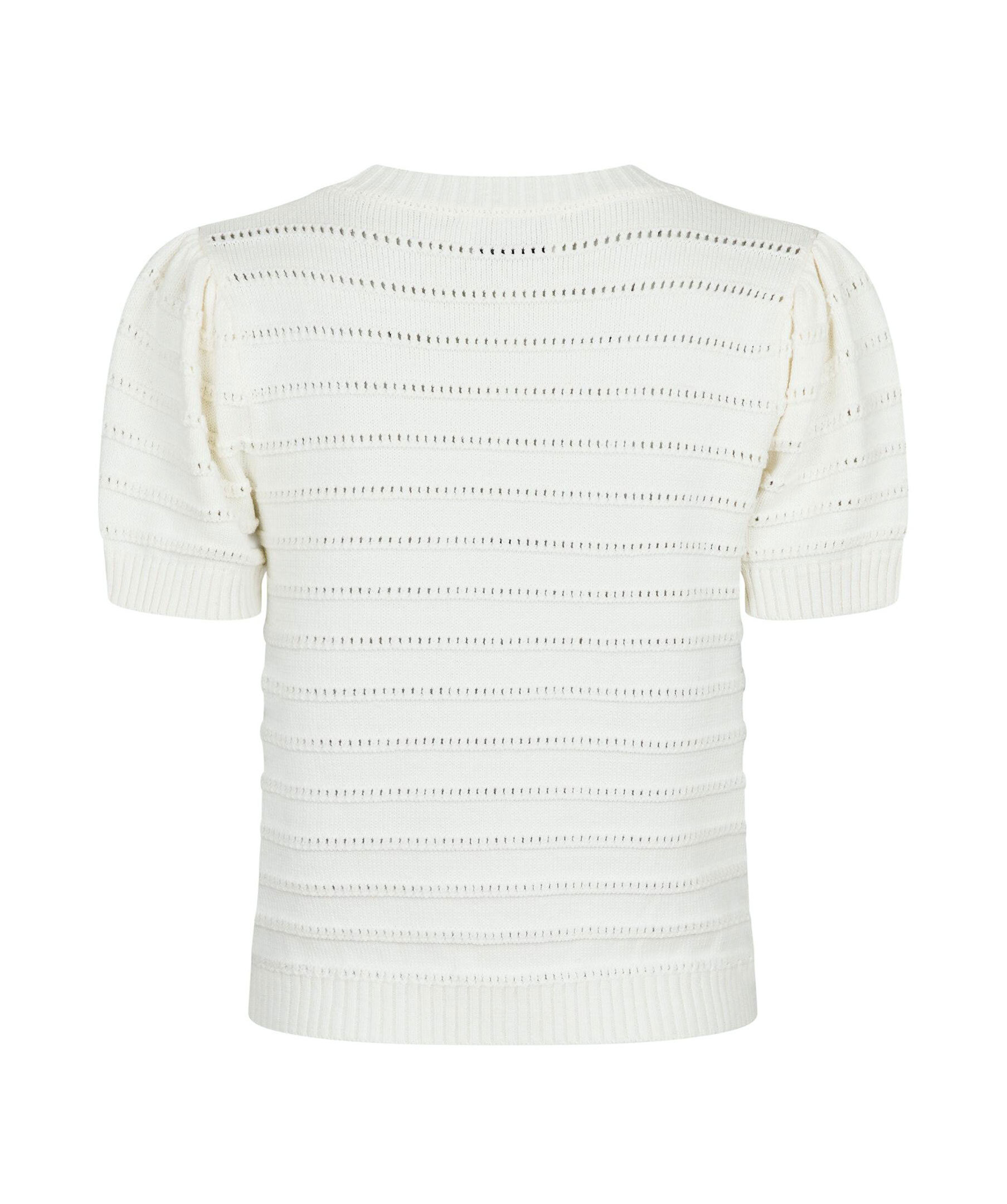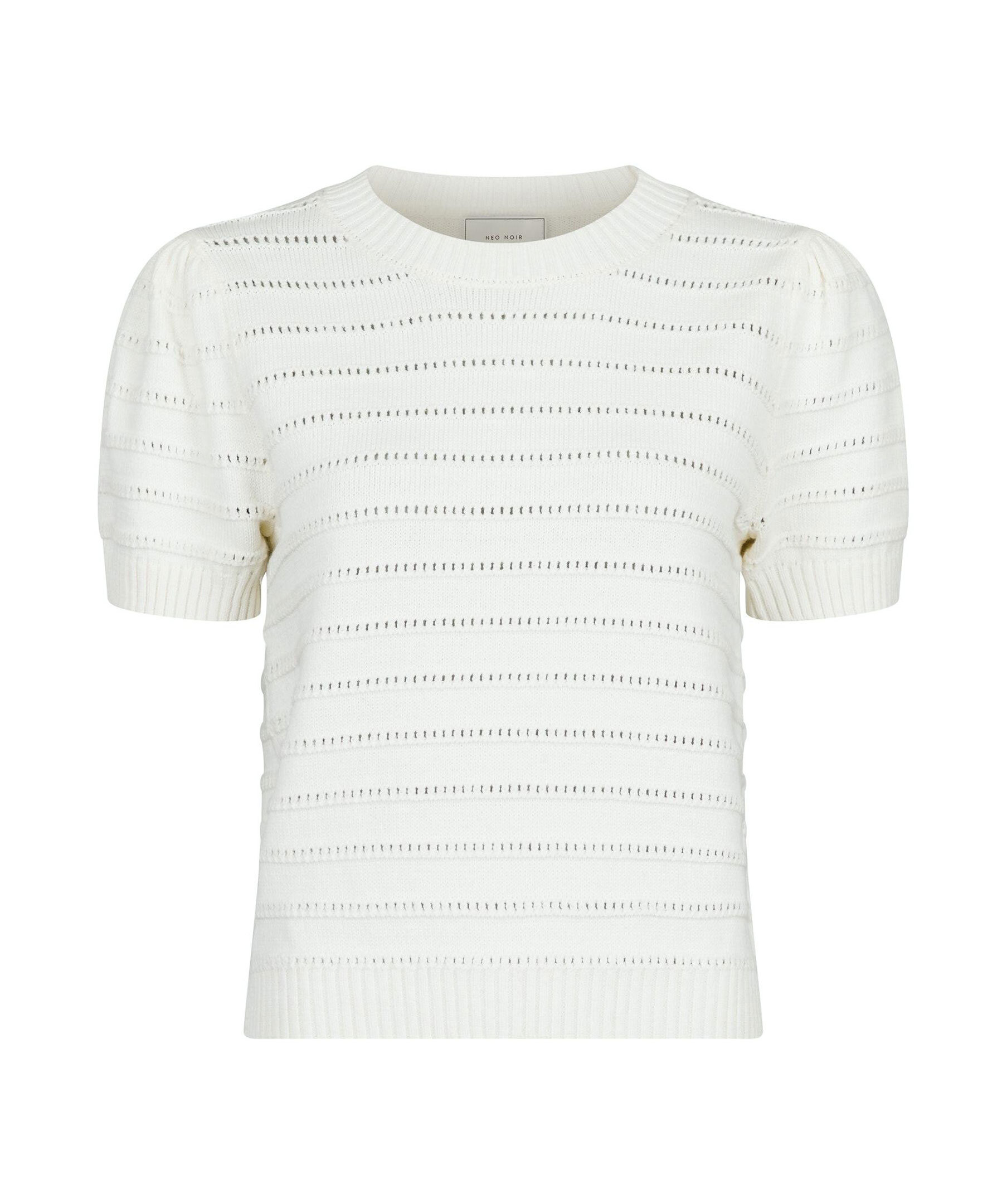 Vit, kortärmad stickad tröja från Neo Noir. Ärmarna har puff effekt. Tillverkad i en mjuk ullmixkvalitet.