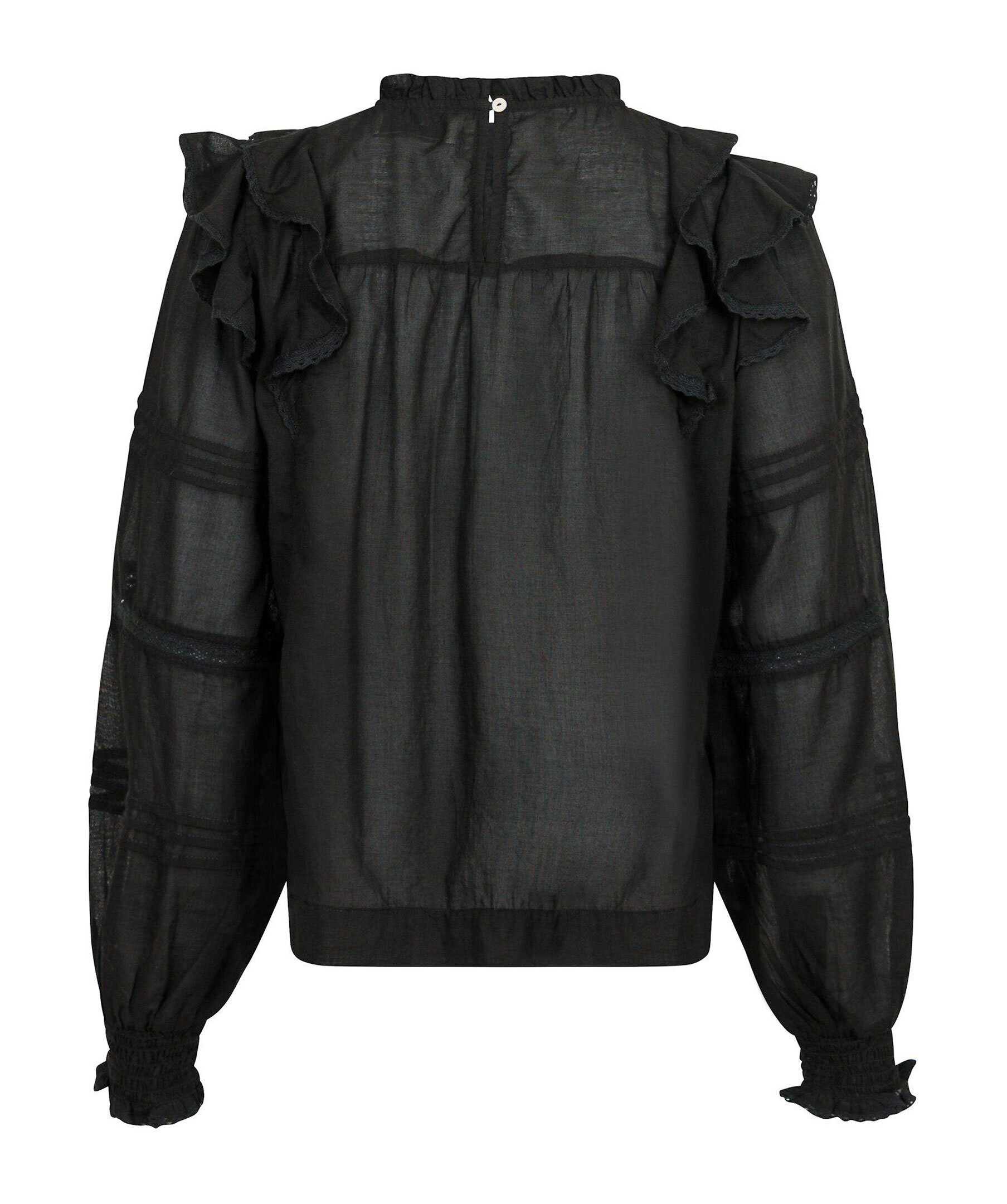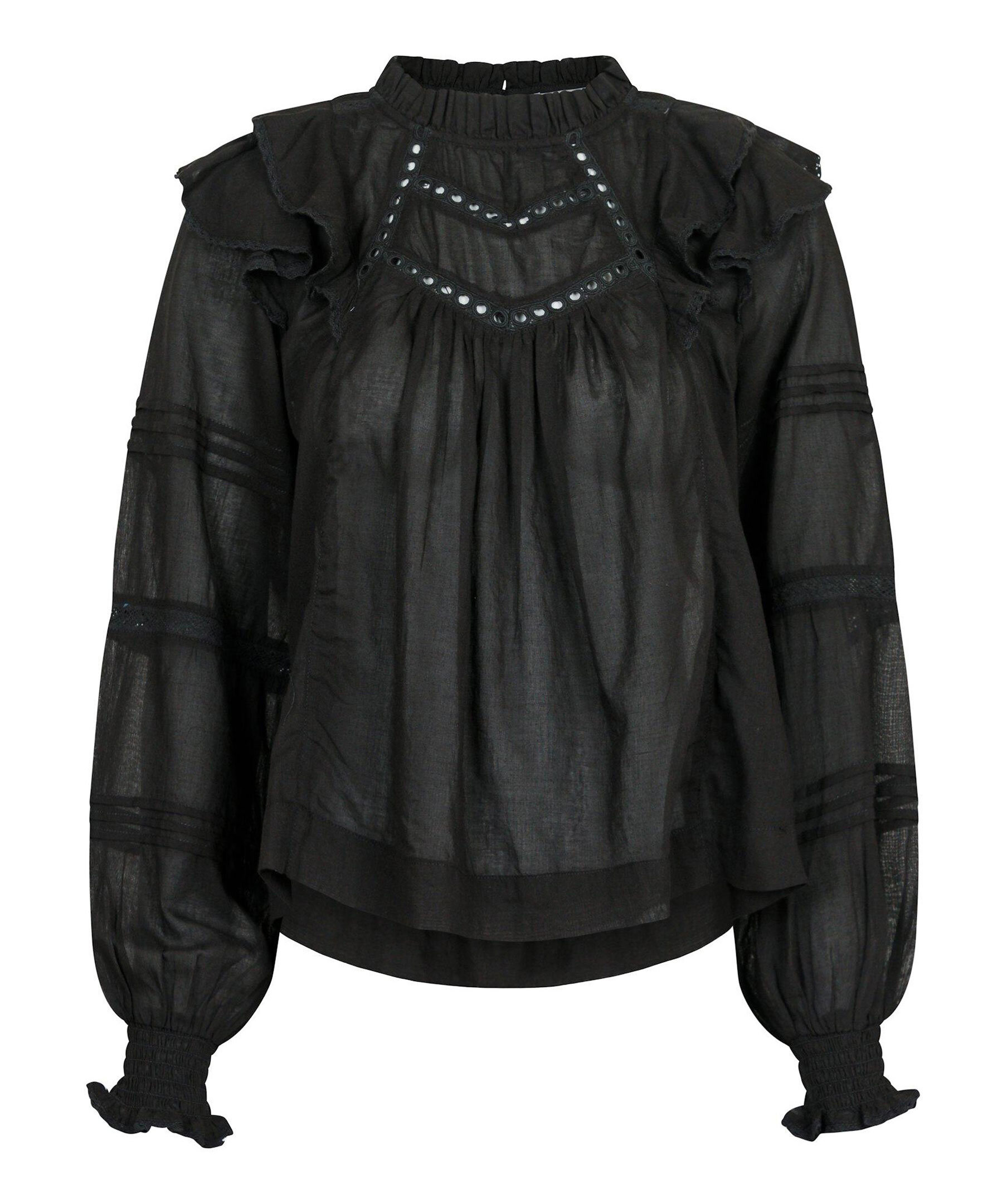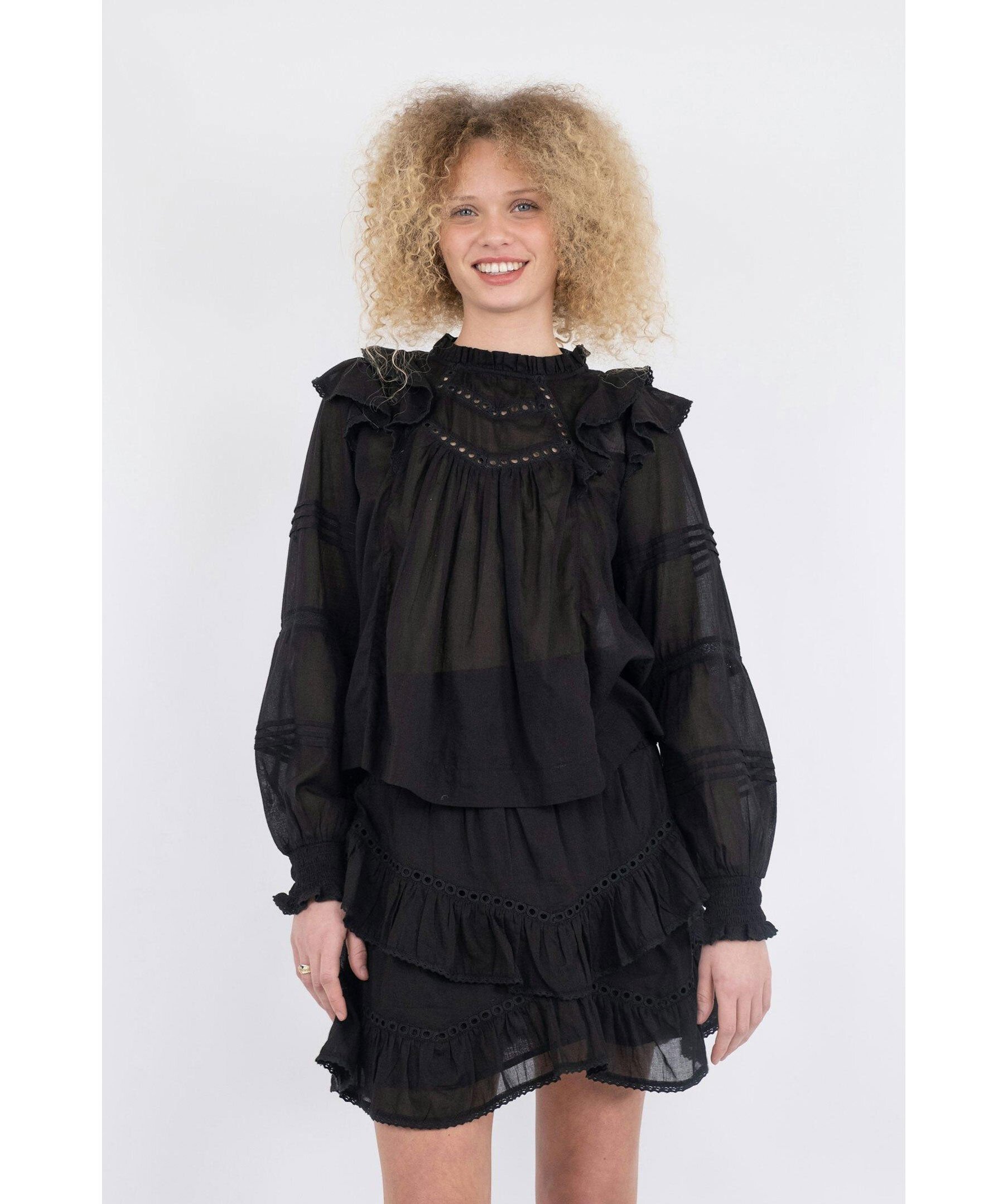 Svart blus från Neo Noir. Lös passform med volangdetaljer vid axlarna och ärmarna. Tillverkad i lätt och luftig bomullsvoile. Smockresår vid handlederna för bekväm passform. Hög hals och genombrutna detaljer på bröstet och ärmarna.