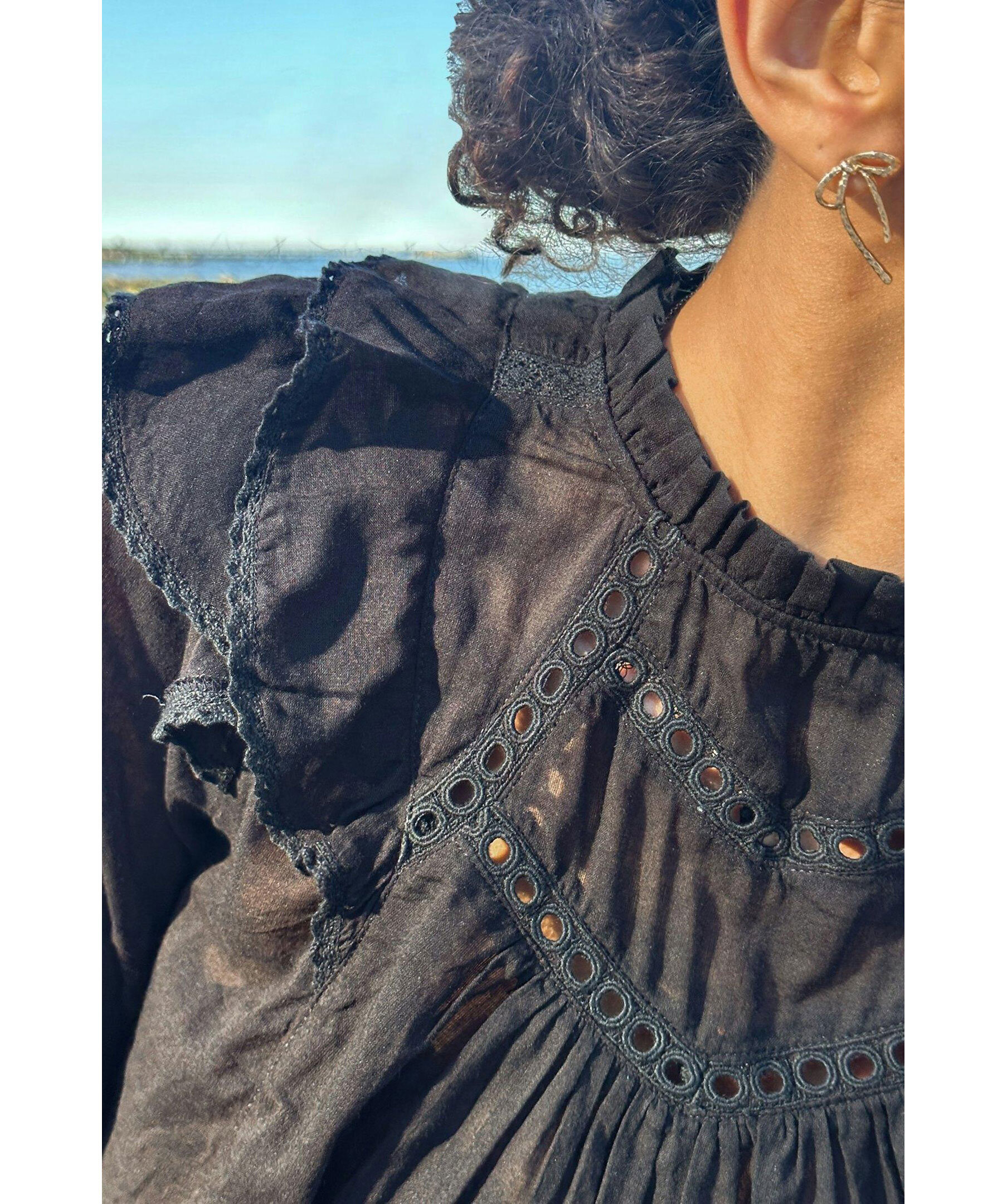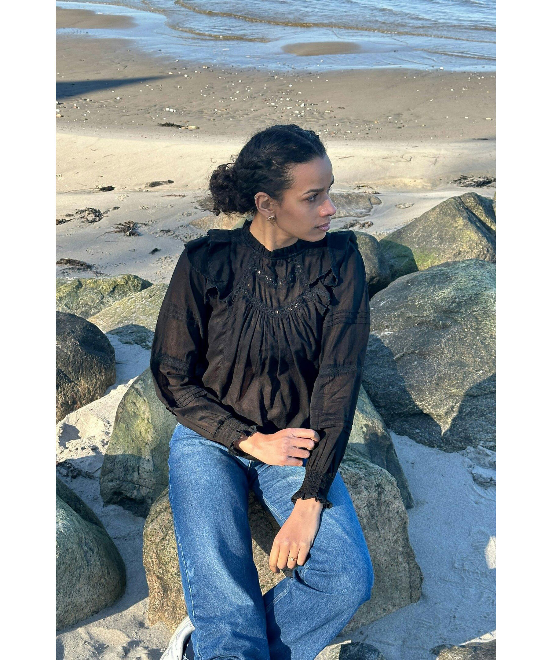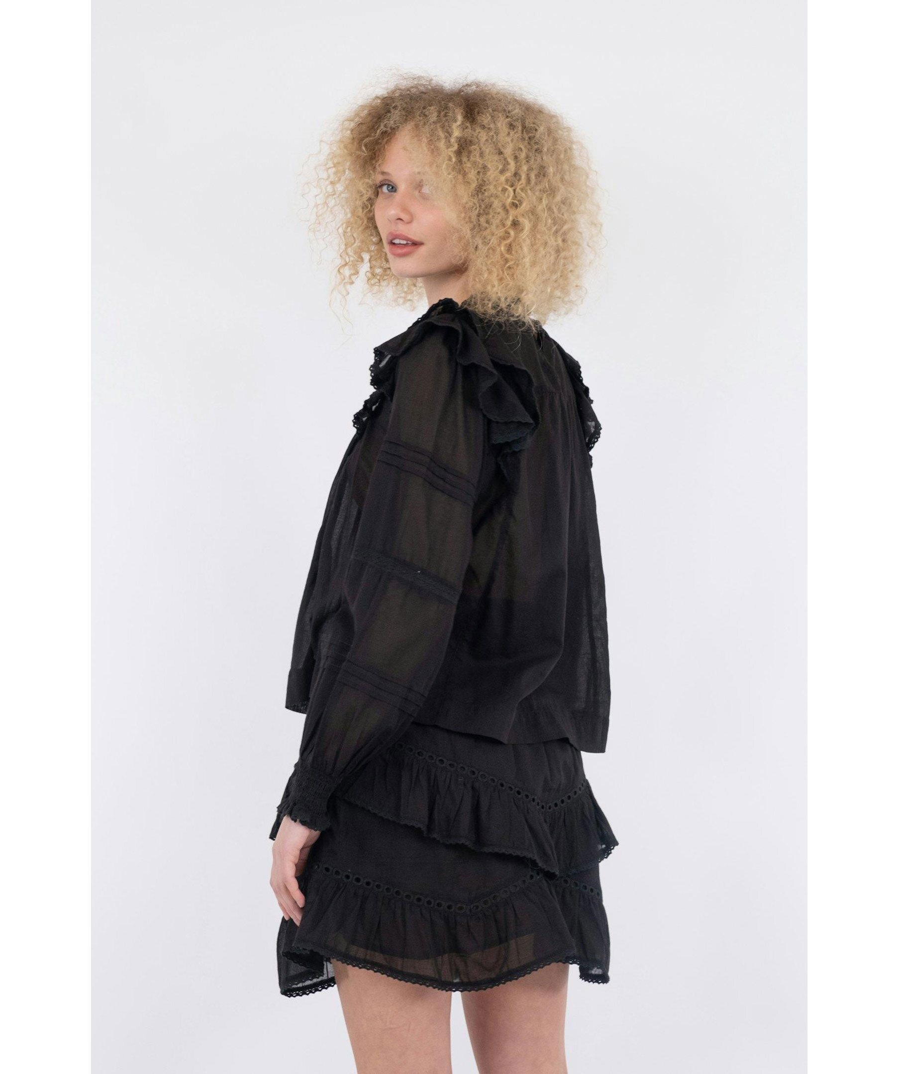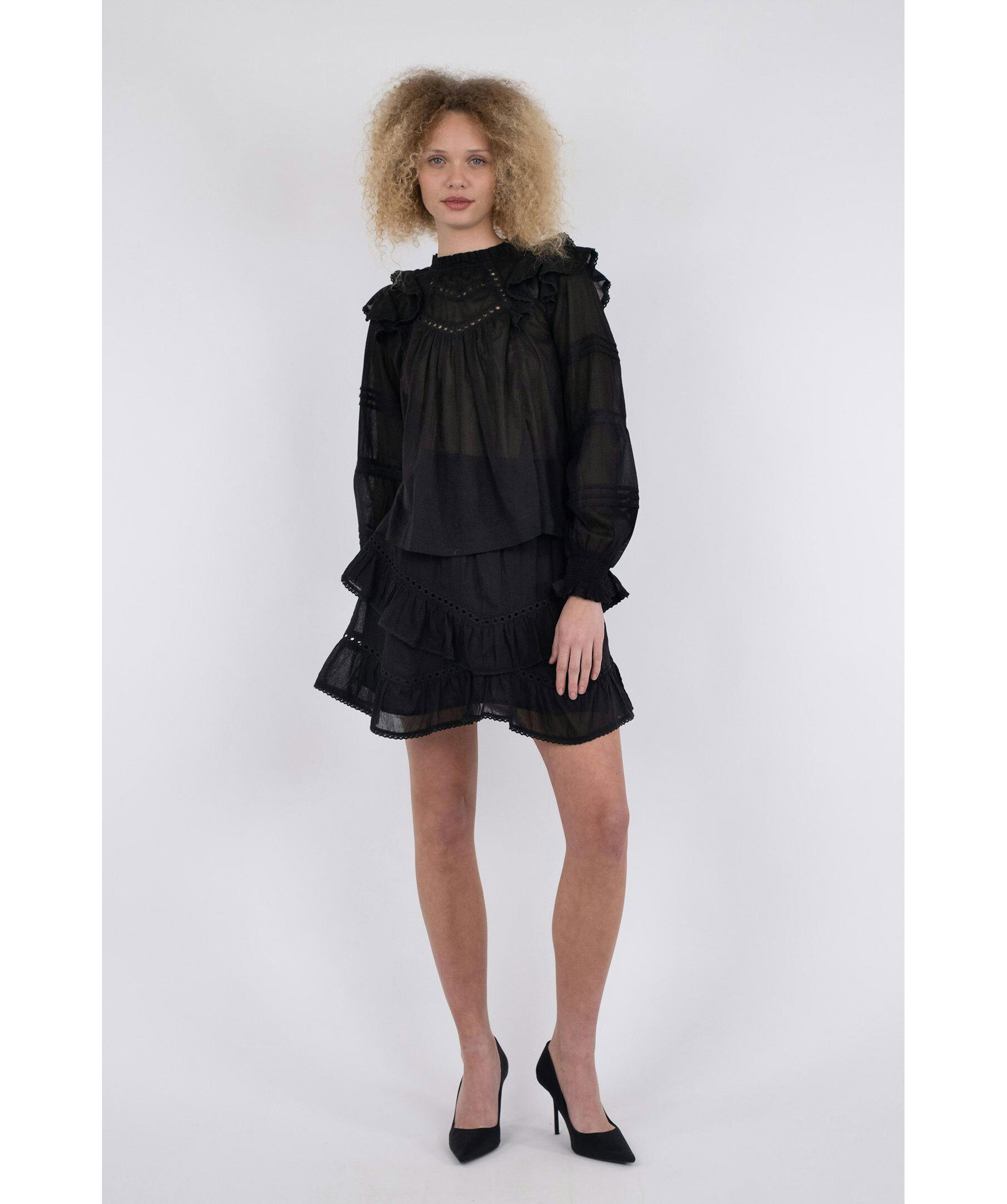 Svart blus från Neo Noir. Lös passform med volangdetaljer vid axlarna och ärmarna. Tillverkad i lätt och luftig bomullsvoile. Smockresår vid handlederna för bekväm passform. Hög hals och genombrutna detaljer på bröstet och ärmarna.