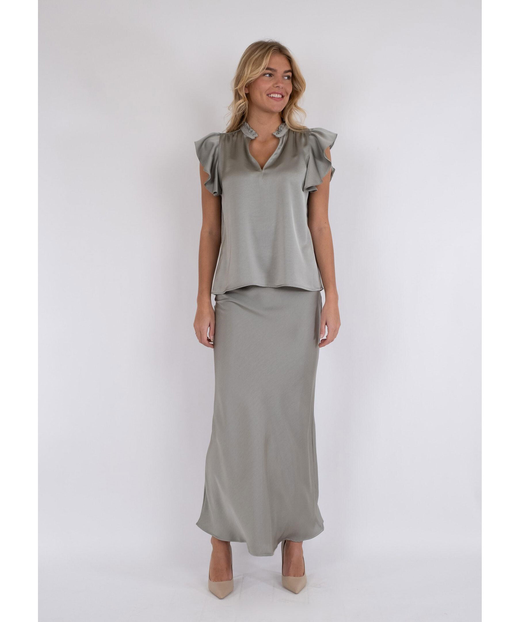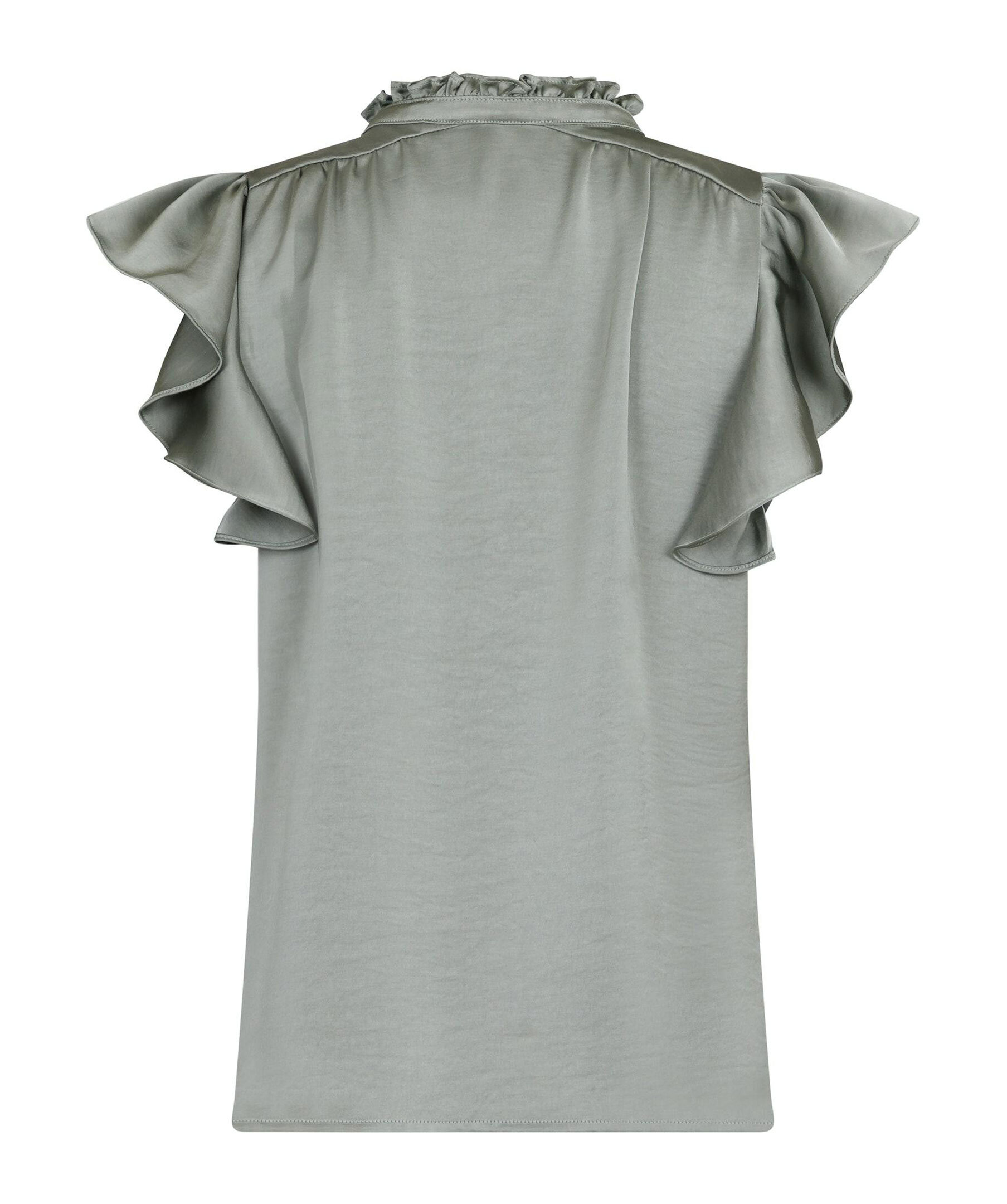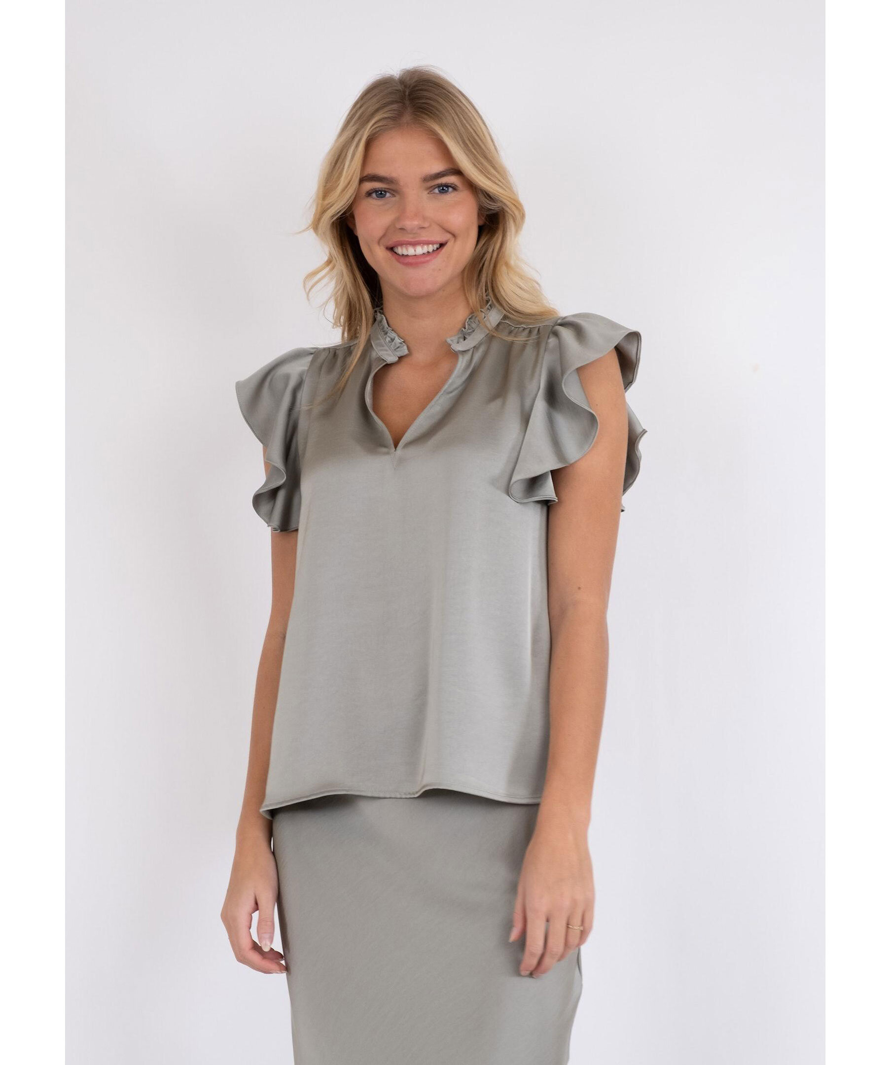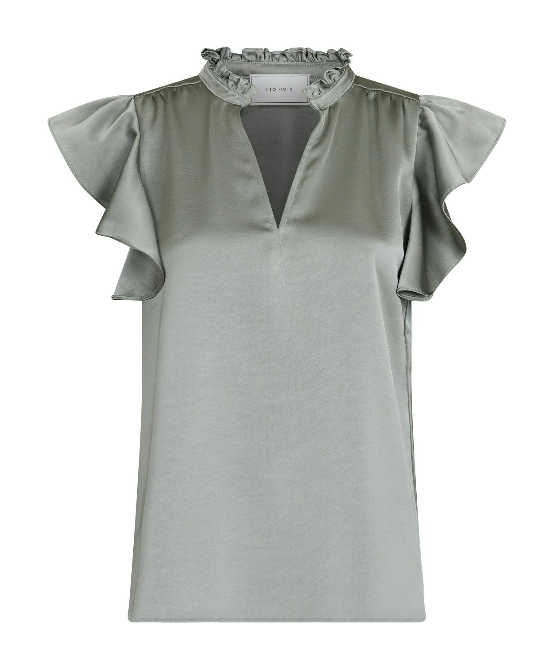 Dovt grön blus från Neo Noir med v-ringad öppning framtill samt kort ärm och hals med volang. Tillverkad i mjuk, lyxig satin.