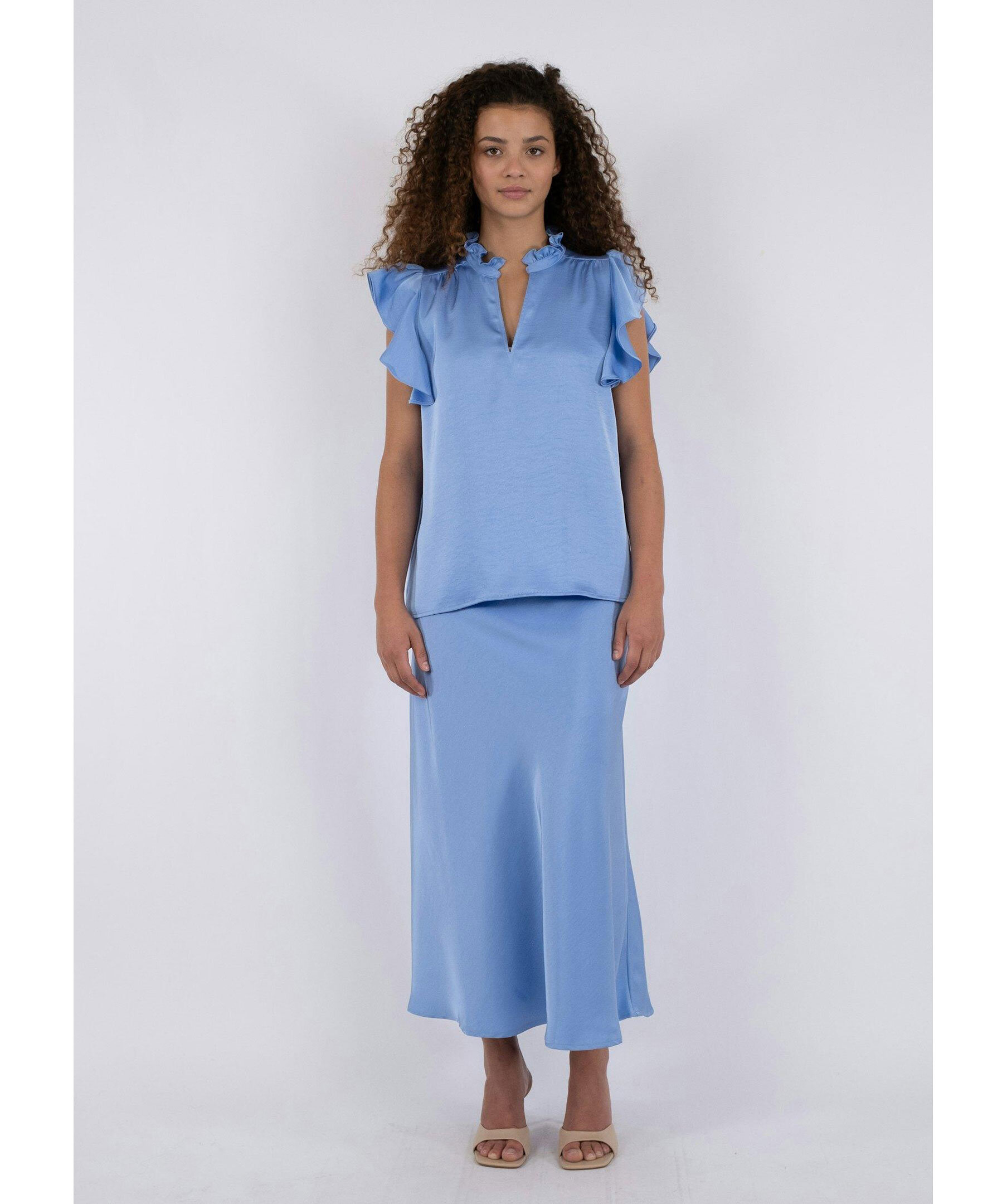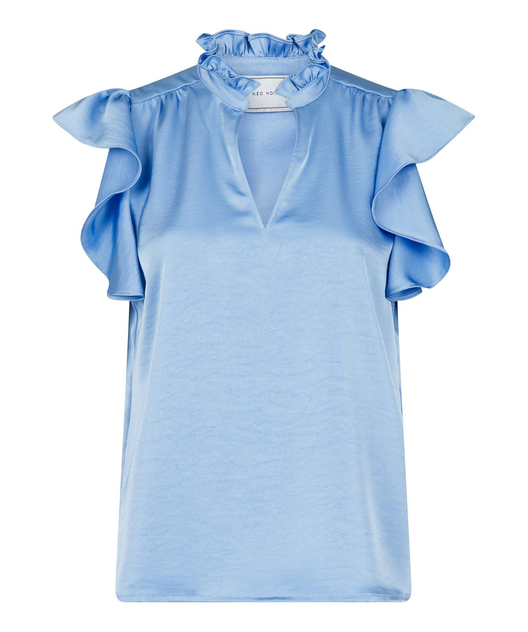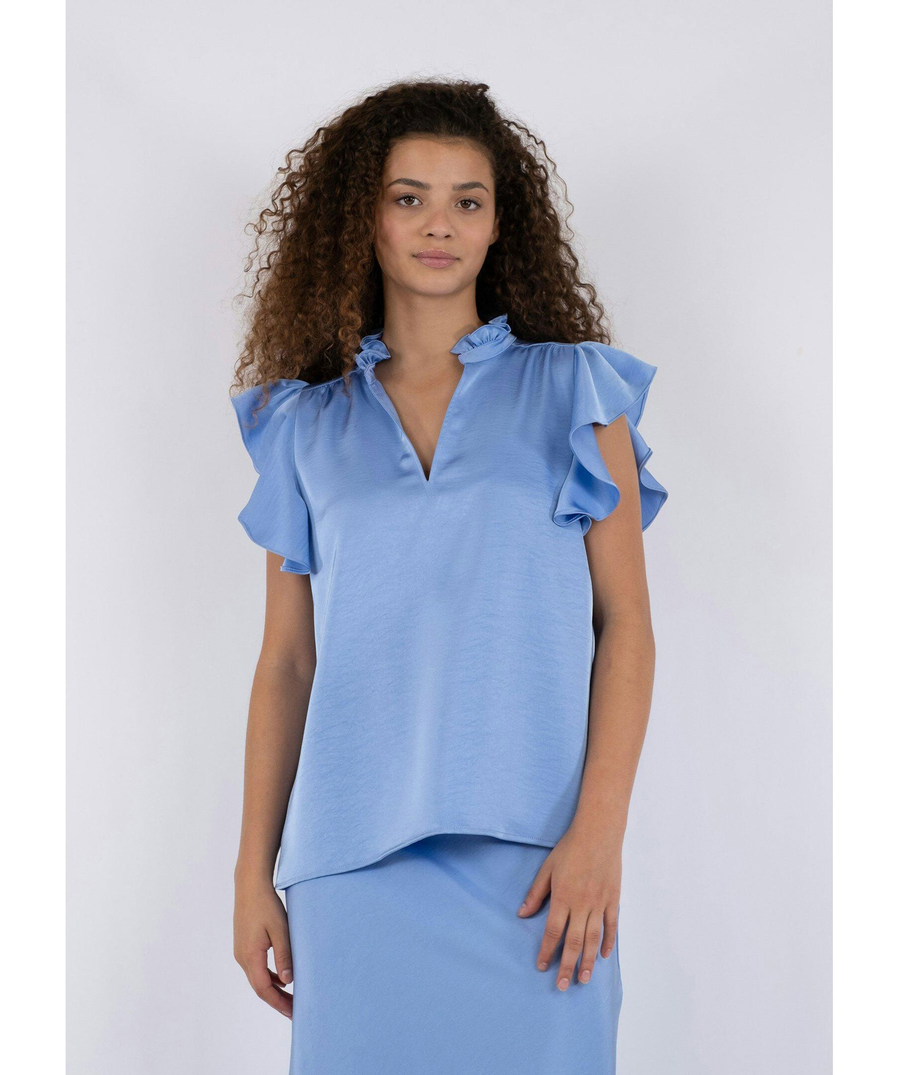 Blå blus från Neo Noir med v-ringad öppning framtill samt kort ärm och hals med volang. Tillverkad i mjuk, lyxig satin.