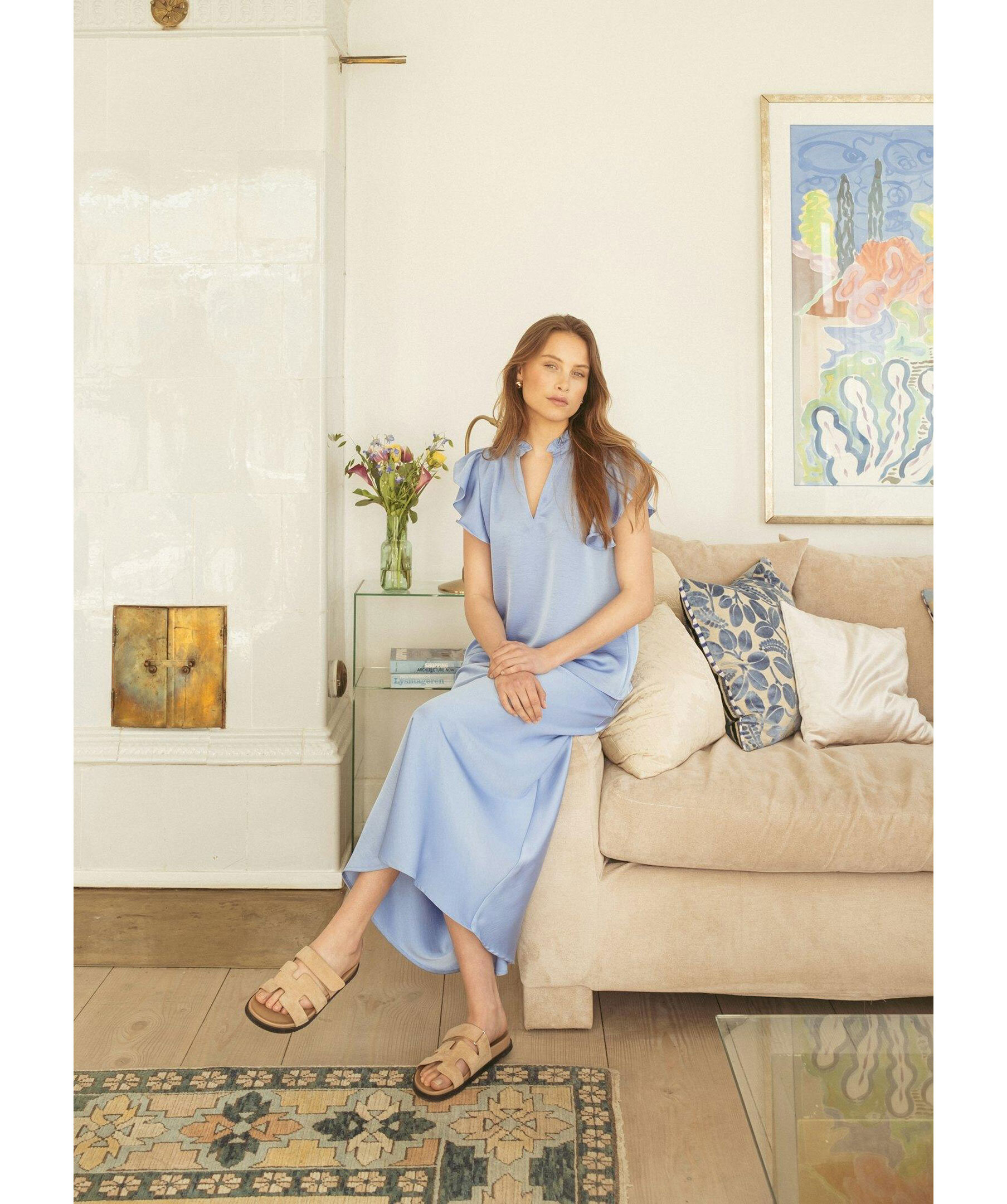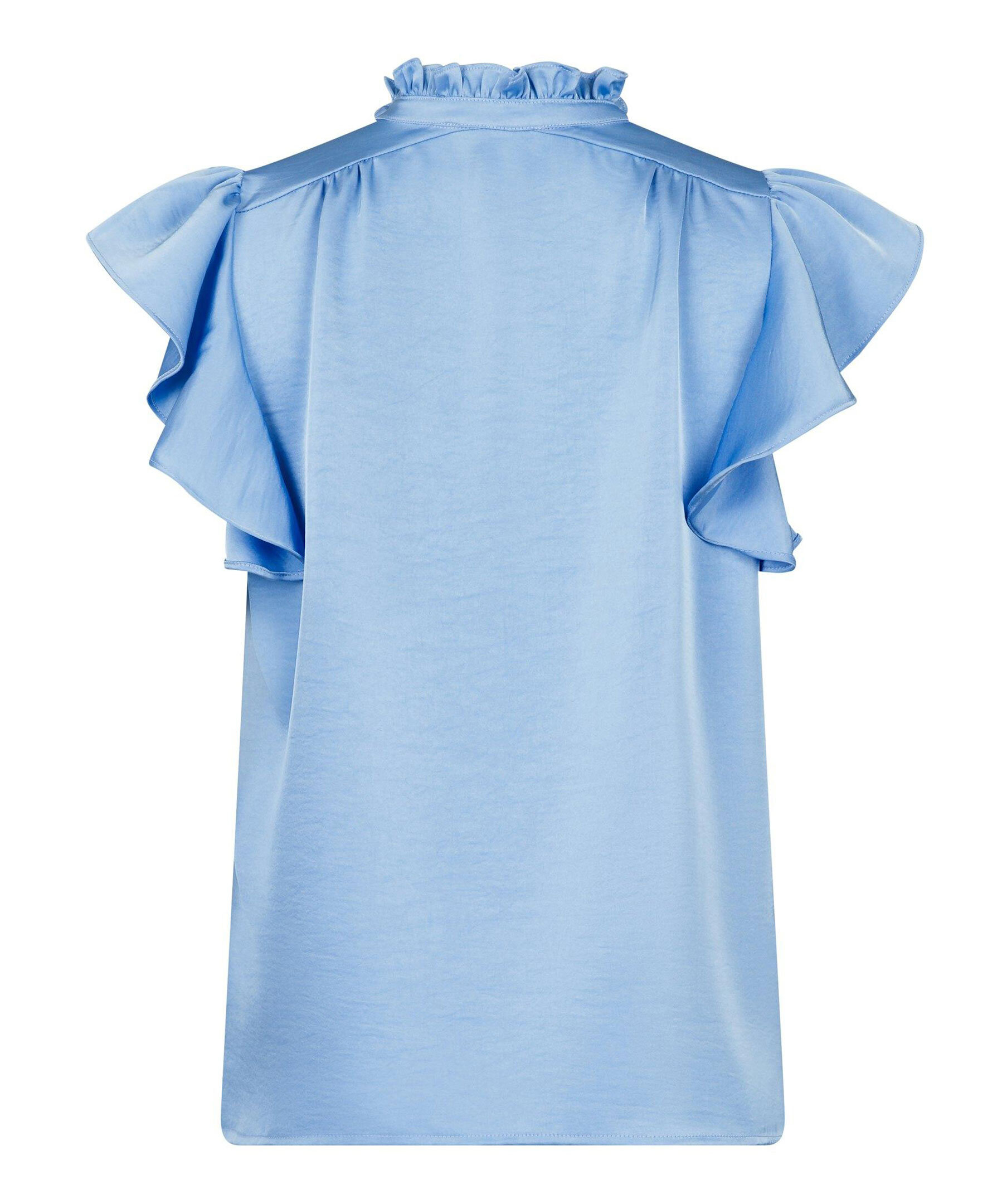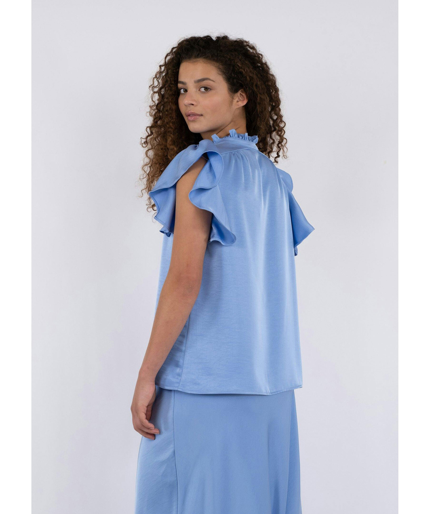 Blå blus från Neo Noir med v-ringad öppning framtill samt kort ärm och hals med volang. Tillverkad i mjuk, lyxig satin.