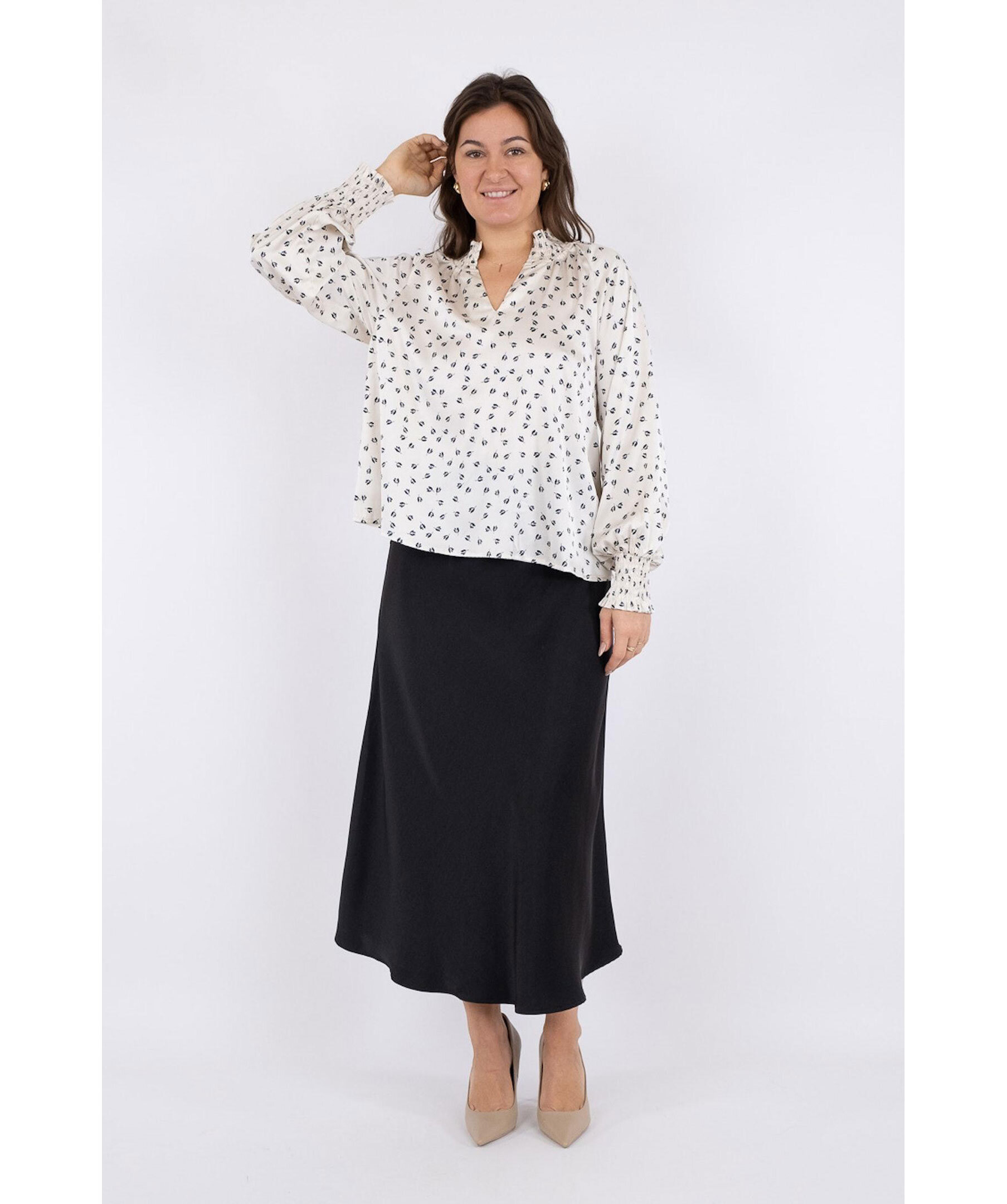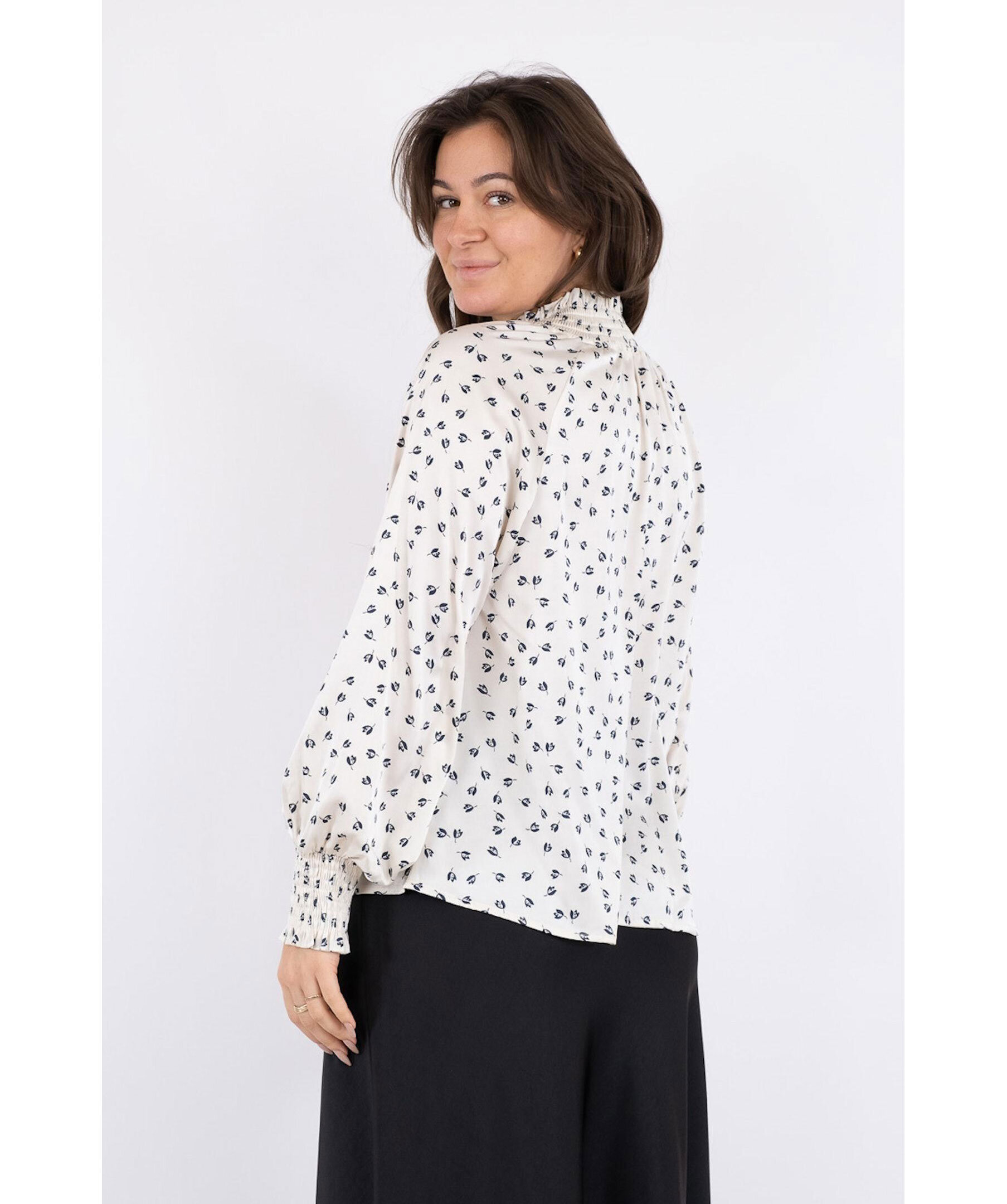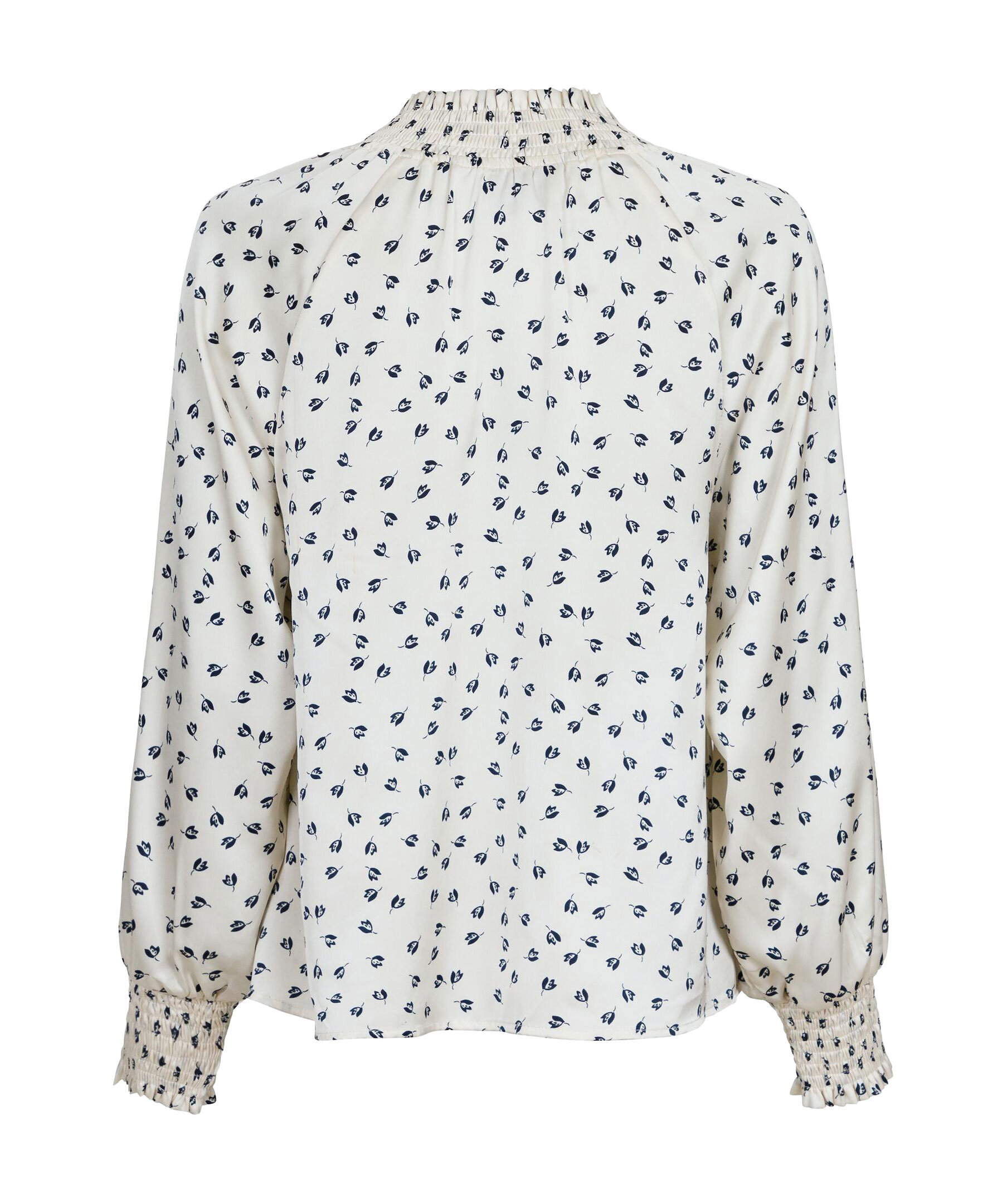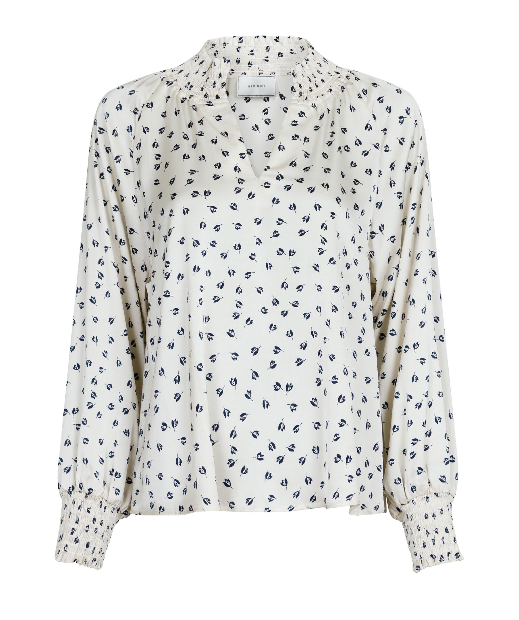 Krämvit blus från Neo Noir. Vacker blus med smockdetaljer vid kragen. Blusen är loose-fit och kommer i en skön mjuk satängkvalitet med grafiskt tryck.