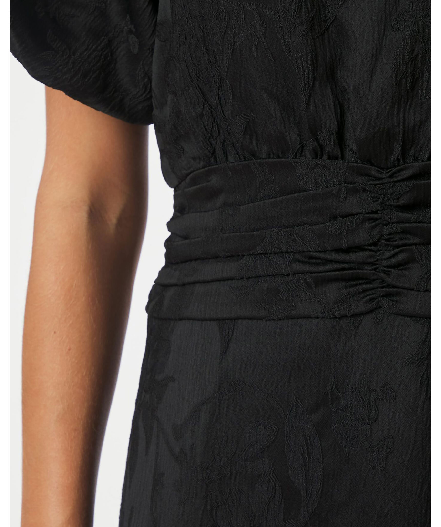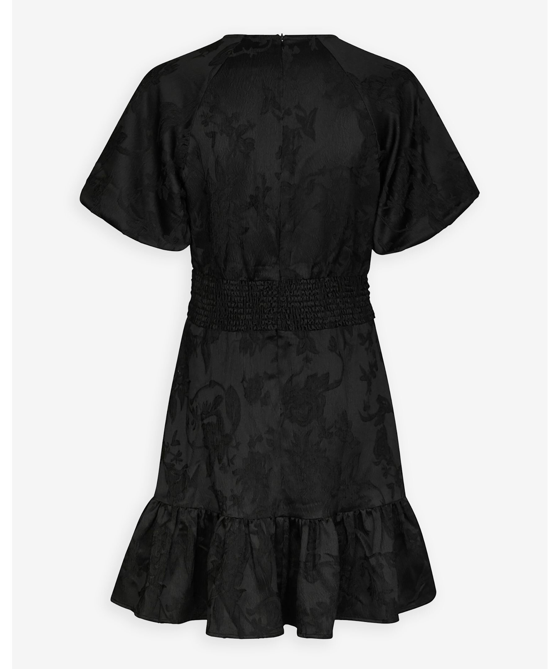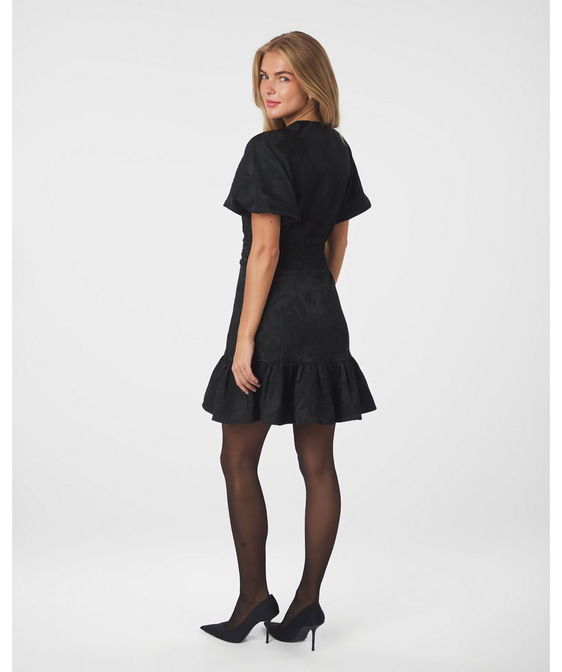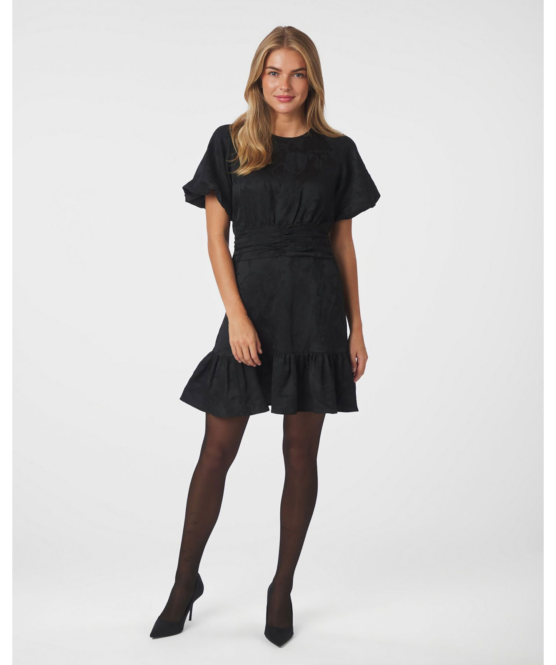 Knälång, svart klänning från Neo Noir med ett vackert blommönster. Klänningen har dekorativa feminina detaljer såsom en markerad midja, volanger och dekorativa sömmar.