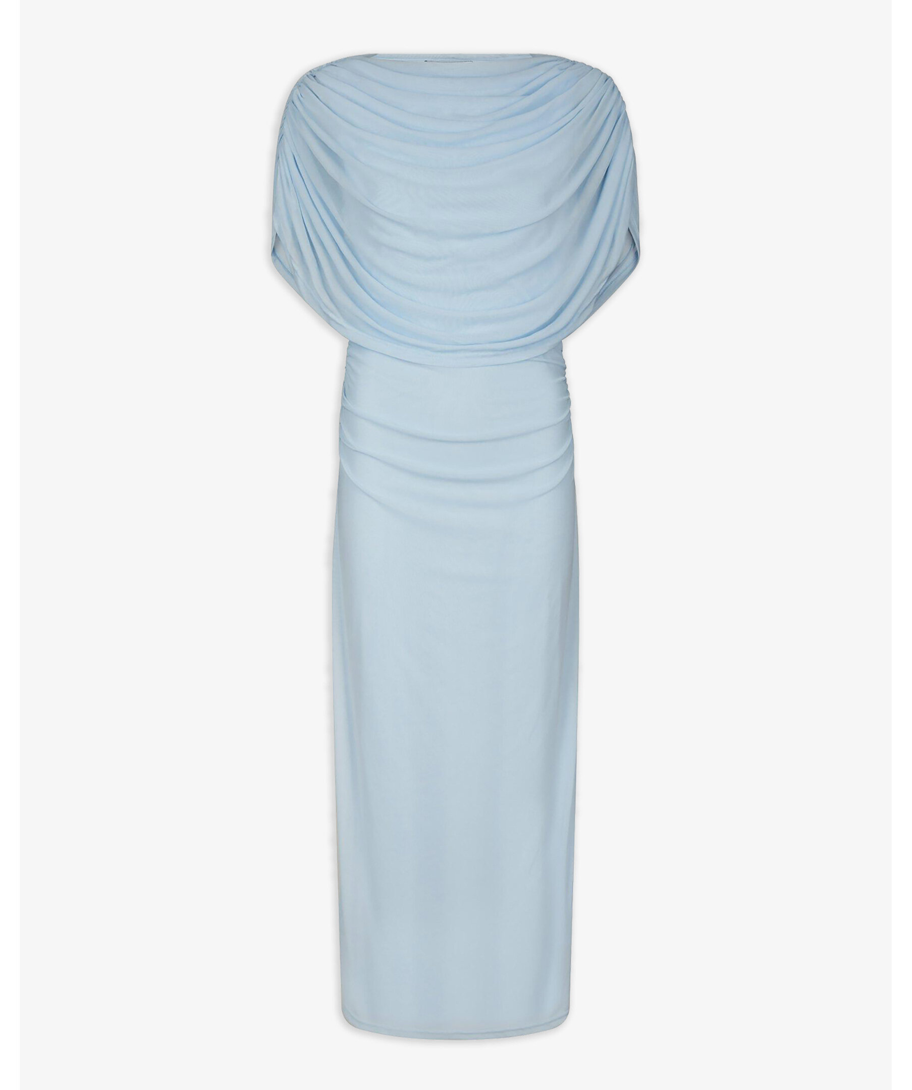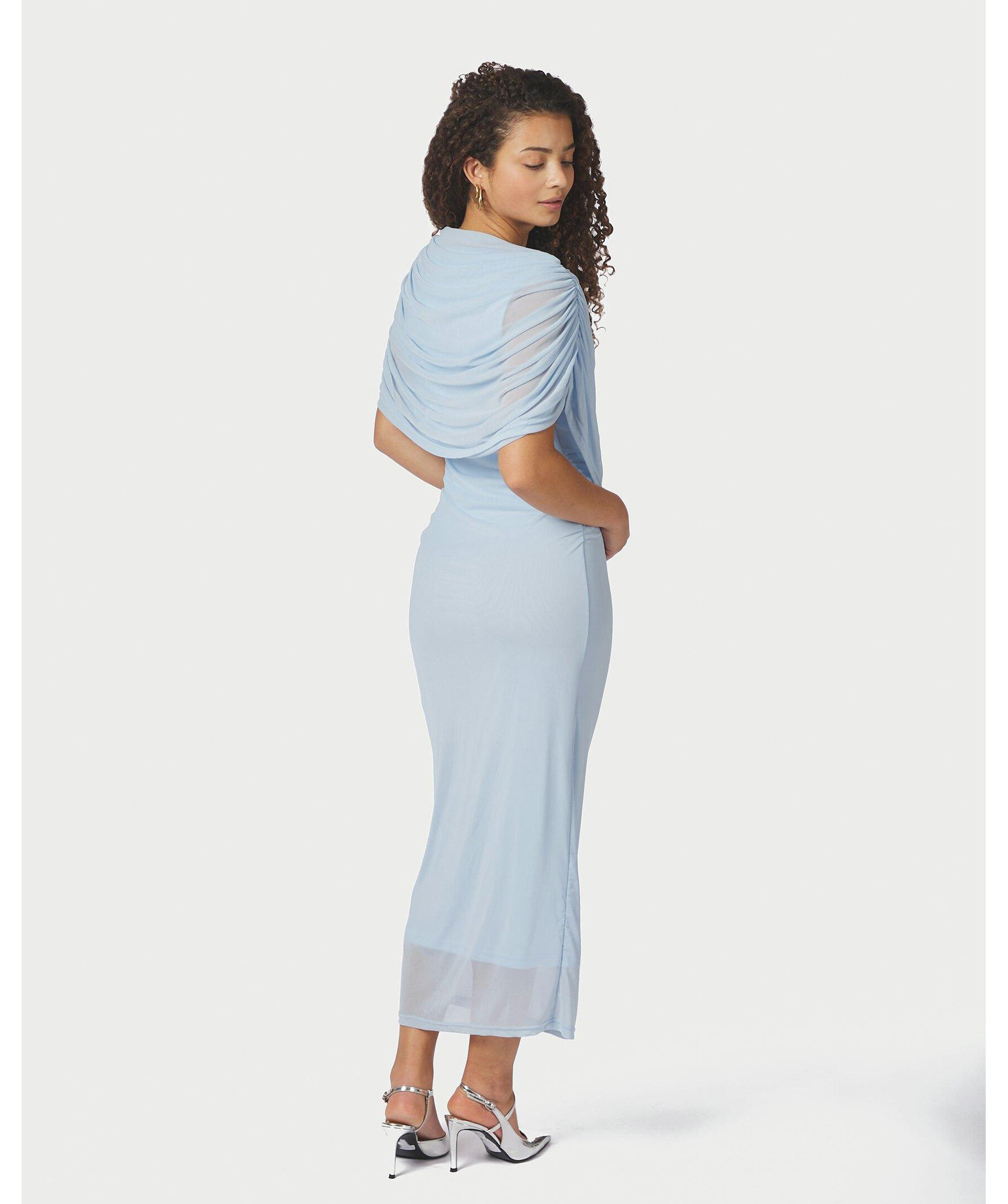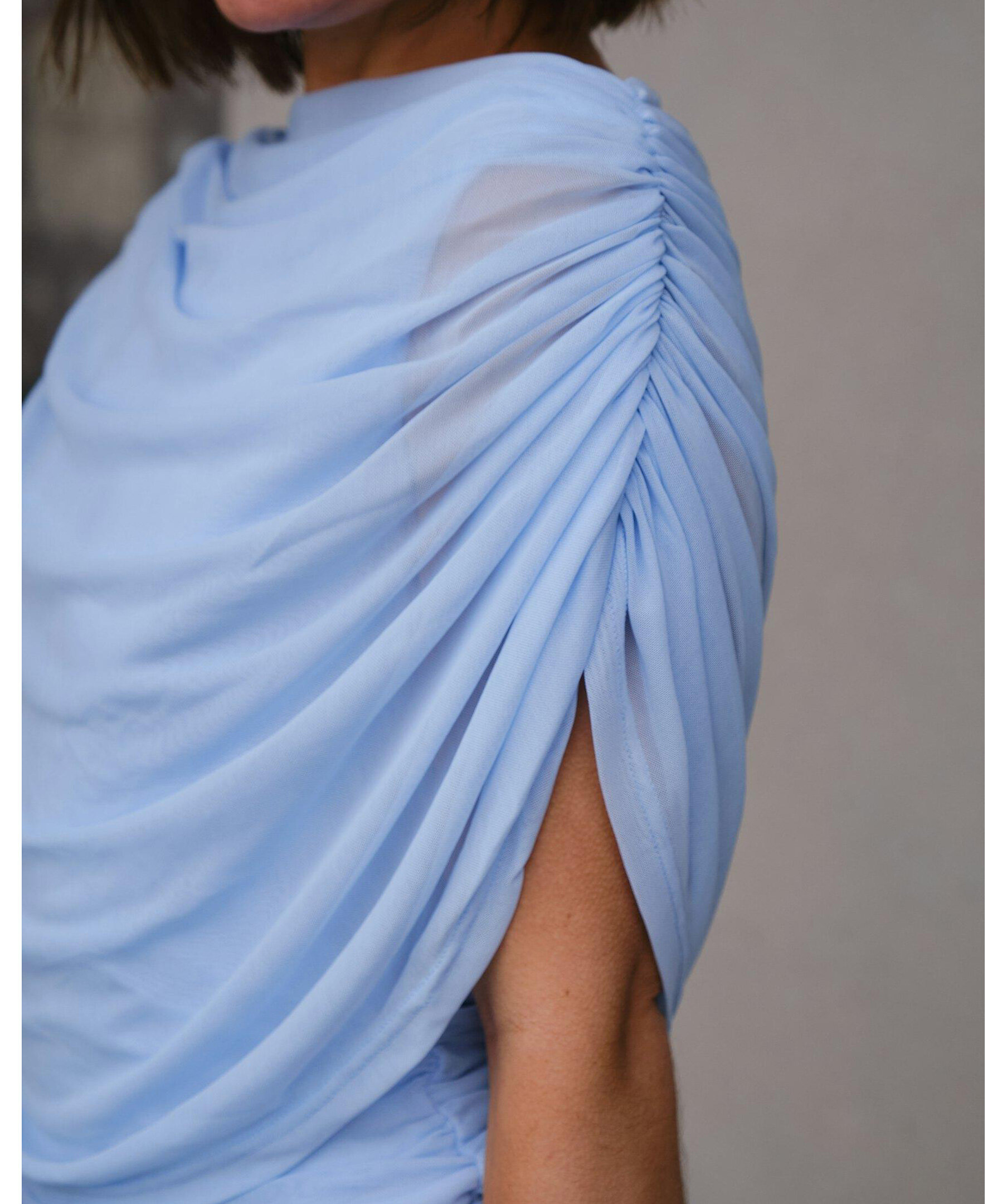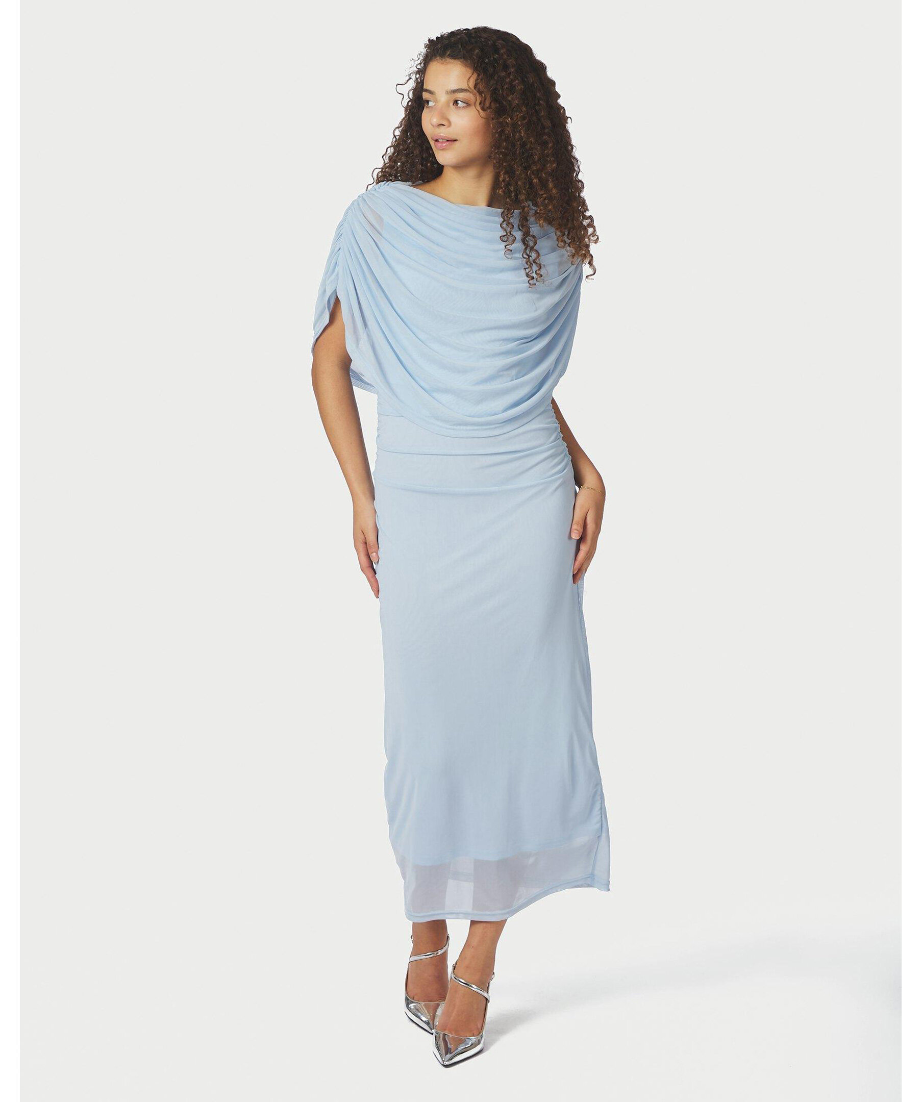 Ljusblå lång meshklänning med smock längs sid sömmen vid midjan, och med draperad vattenfallseffekt vid halsen fram. Modellen är 176 cm lång och bär storlek 36.