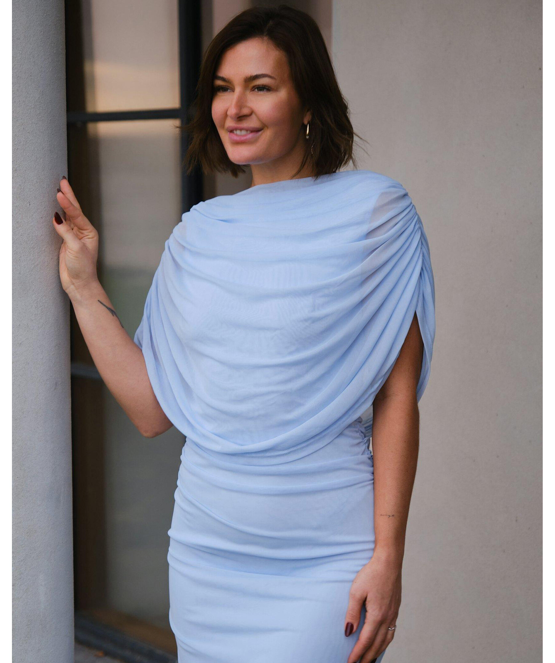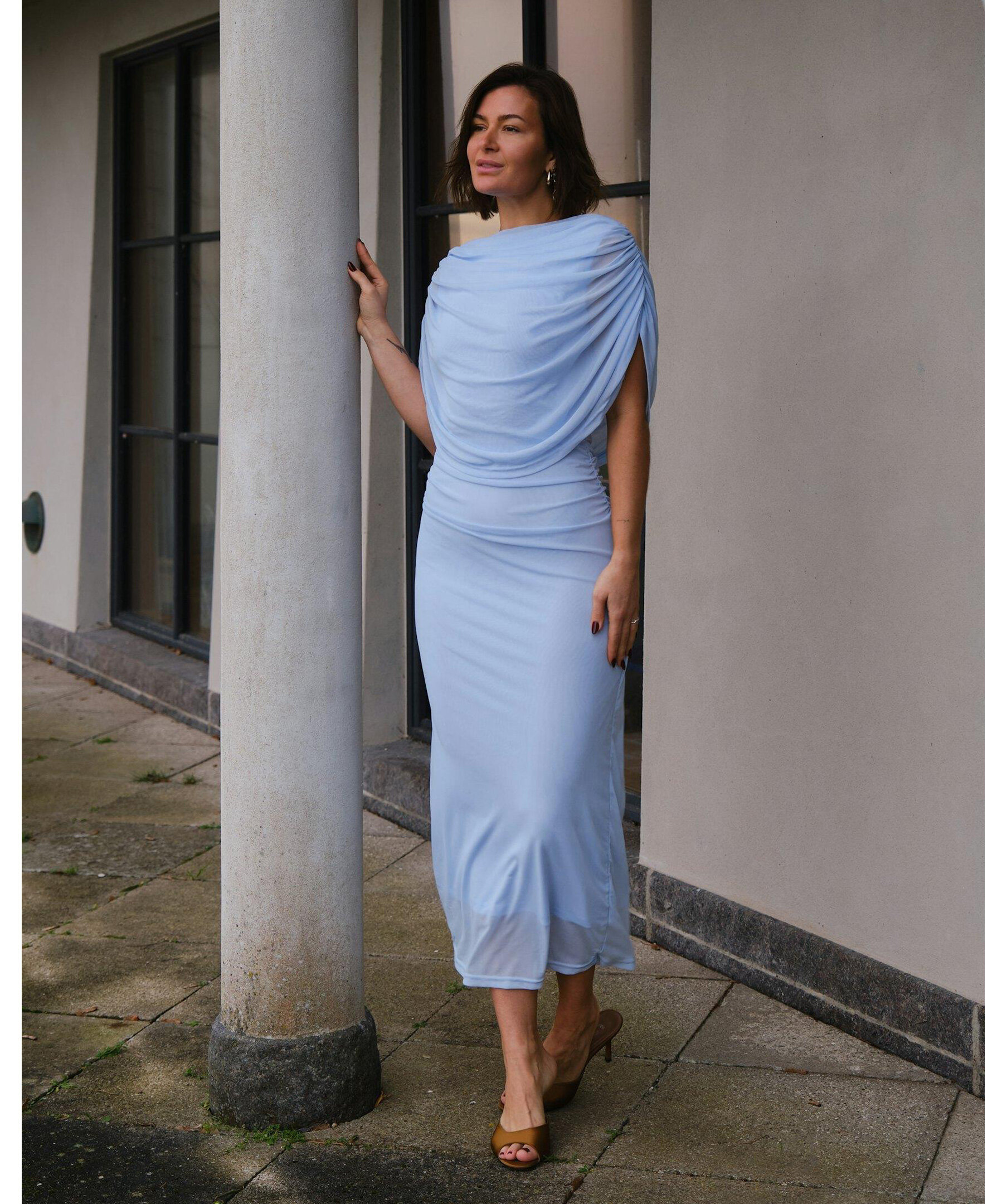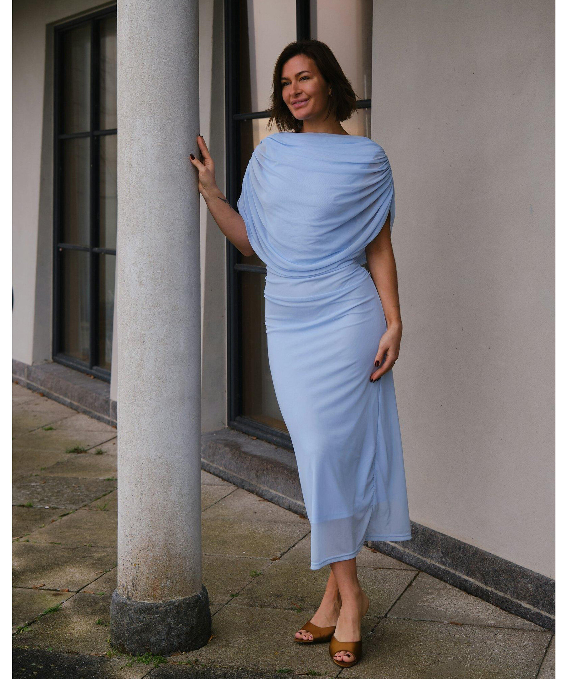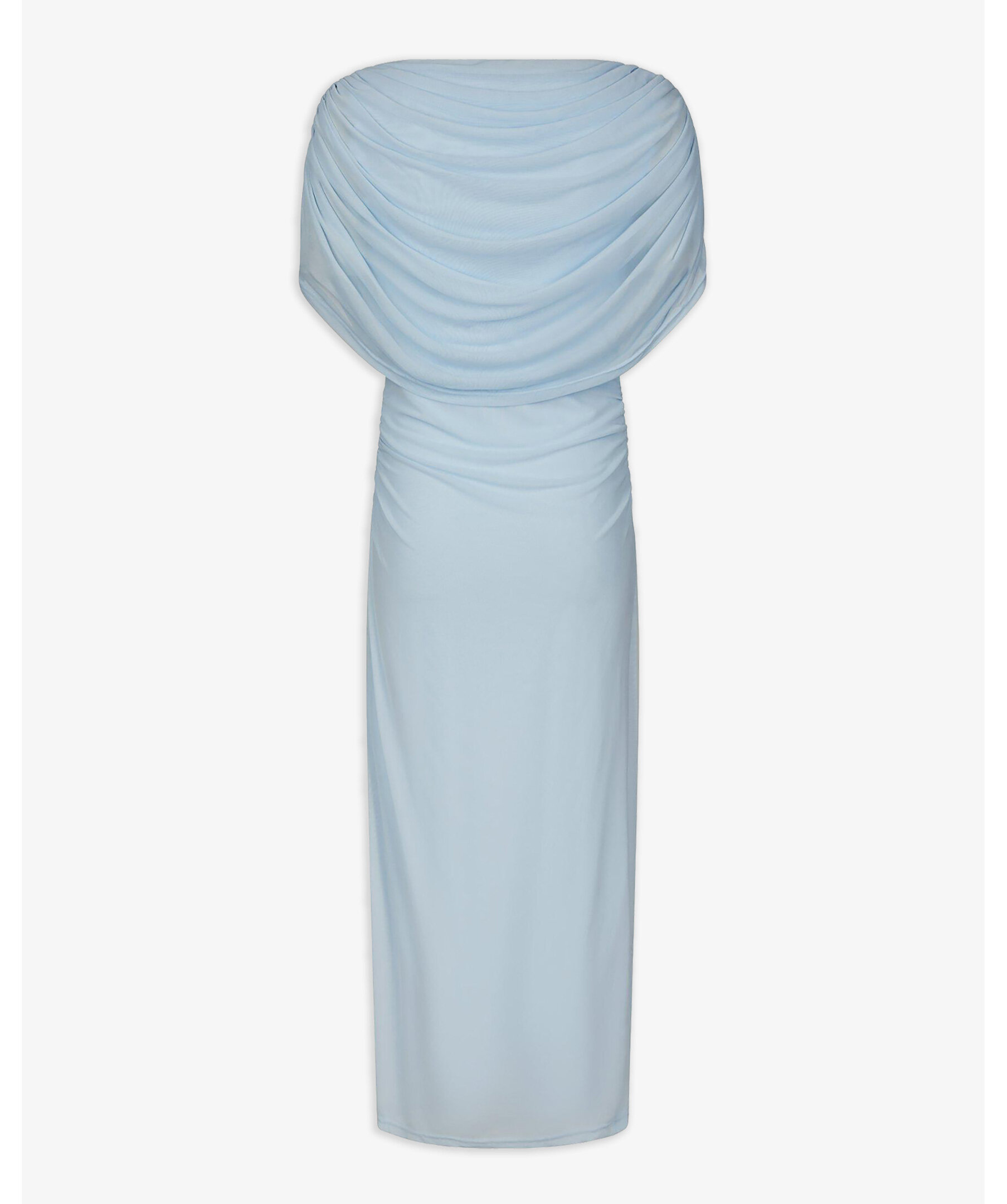 Ljusblå lång meshklänning med smock längs sid sömmen vid midjan, och med draperad vattenfallseffekt vid halsen fram. Modellen är 176 cm lång och bär storlek 36.