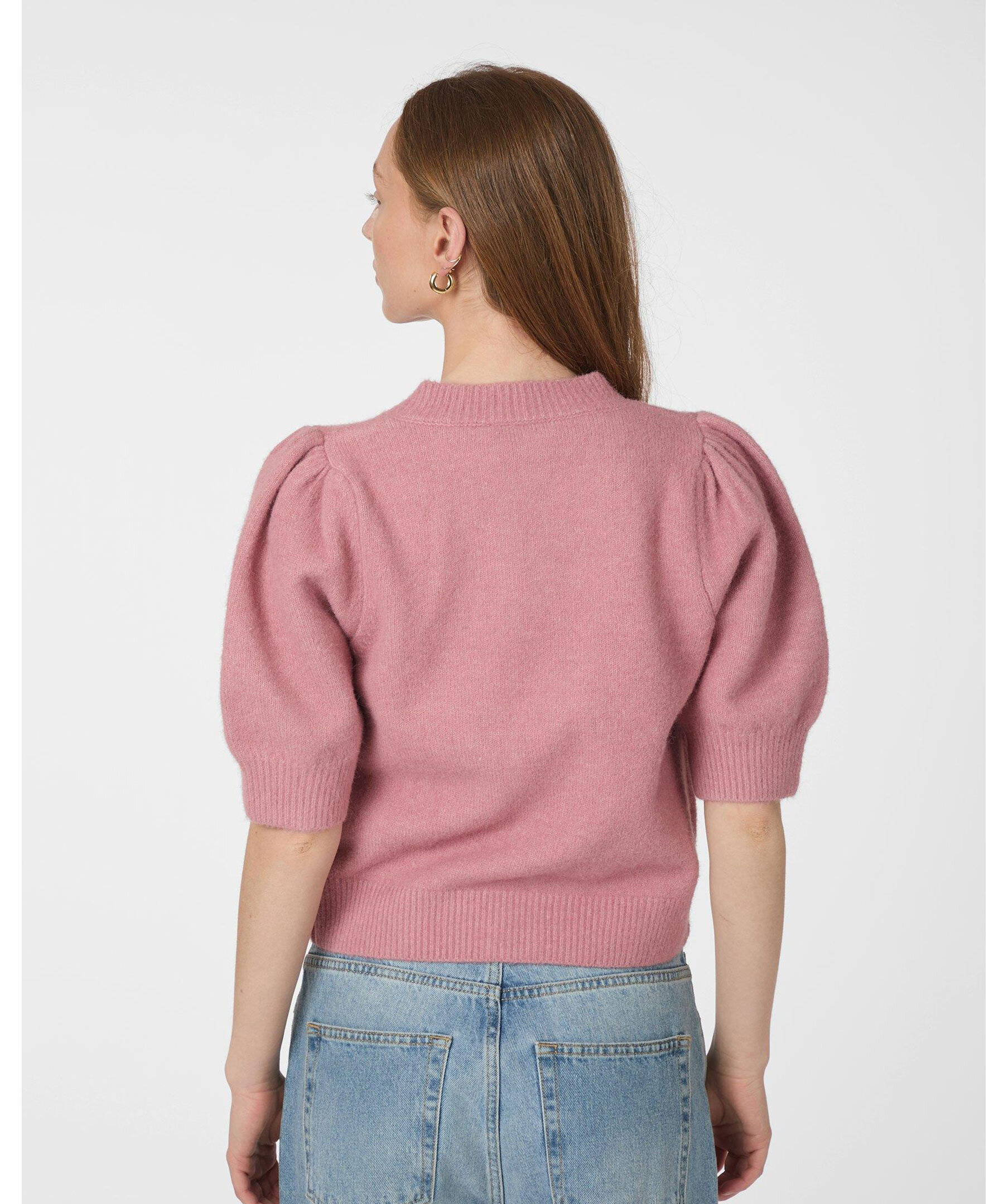 Rosa, melerad stickad tröja från Neo Noir. Stängs framtill med klädda knappar. Puffärmar som slutar strax över armbågen. Ribbstickad krage, ärm- och plaggslut. Tillverkad i ullblandning.