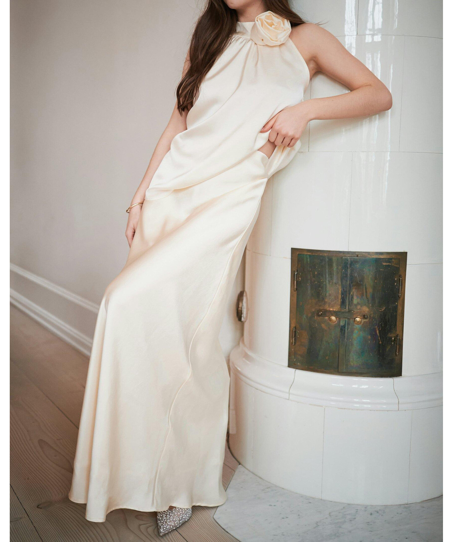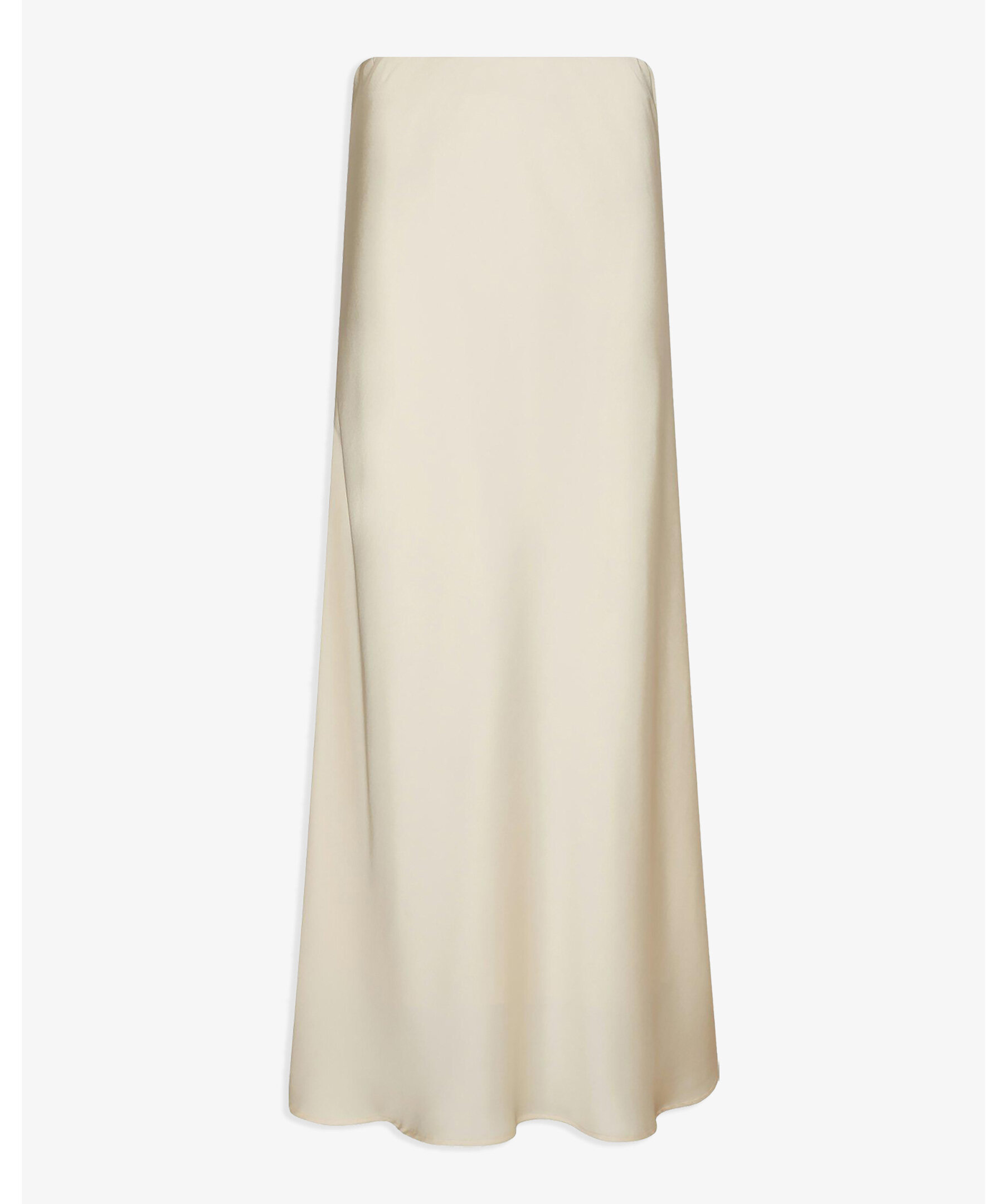 Långkjol med elastik inuti vid midjan. Kjolen är snedskuren och har en mycket smickrande passform. Kvaliteten är en fin, draperad satin. Modellen är 176 cm och bär storlek 36.