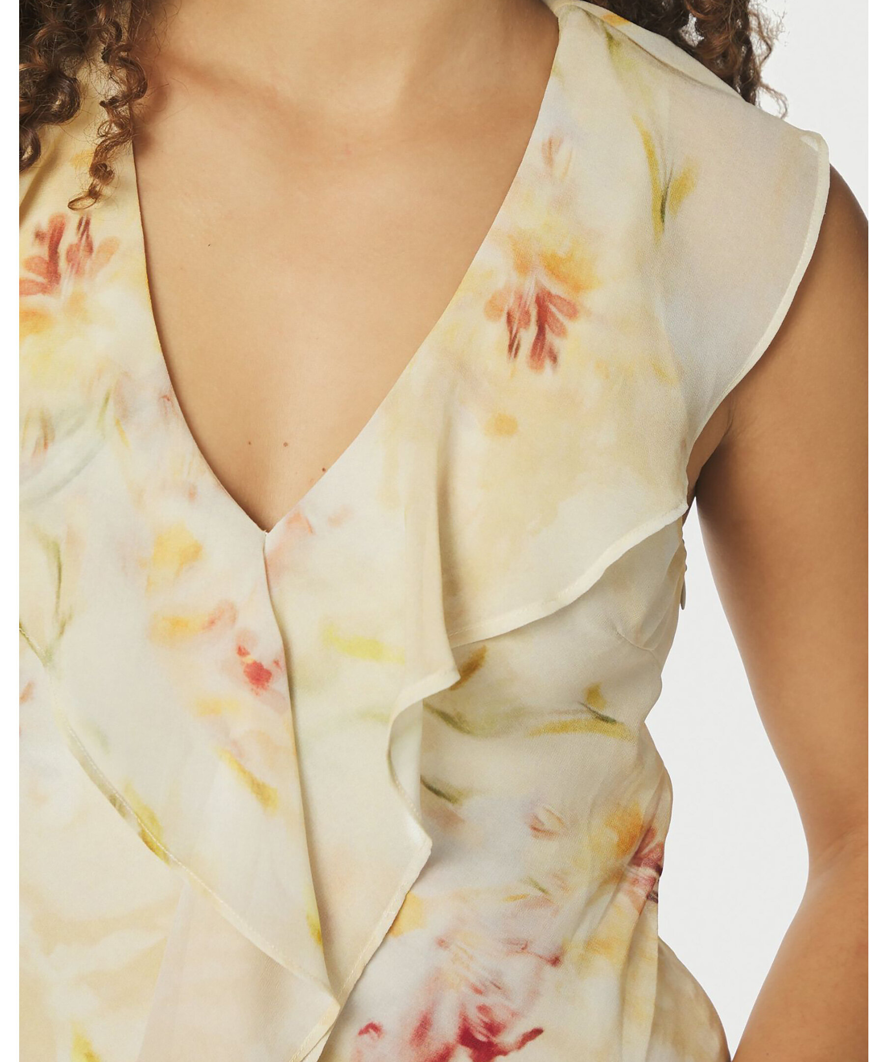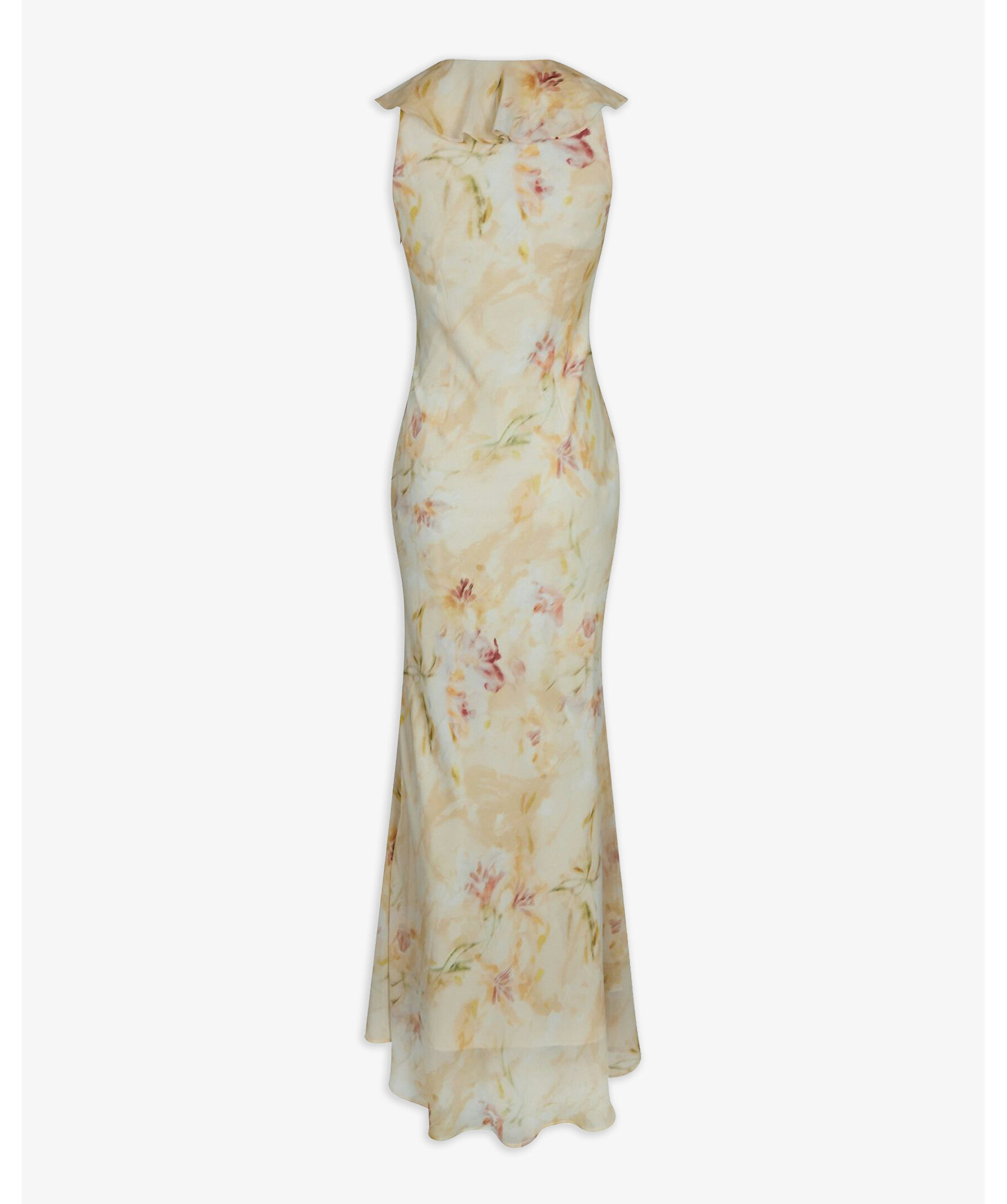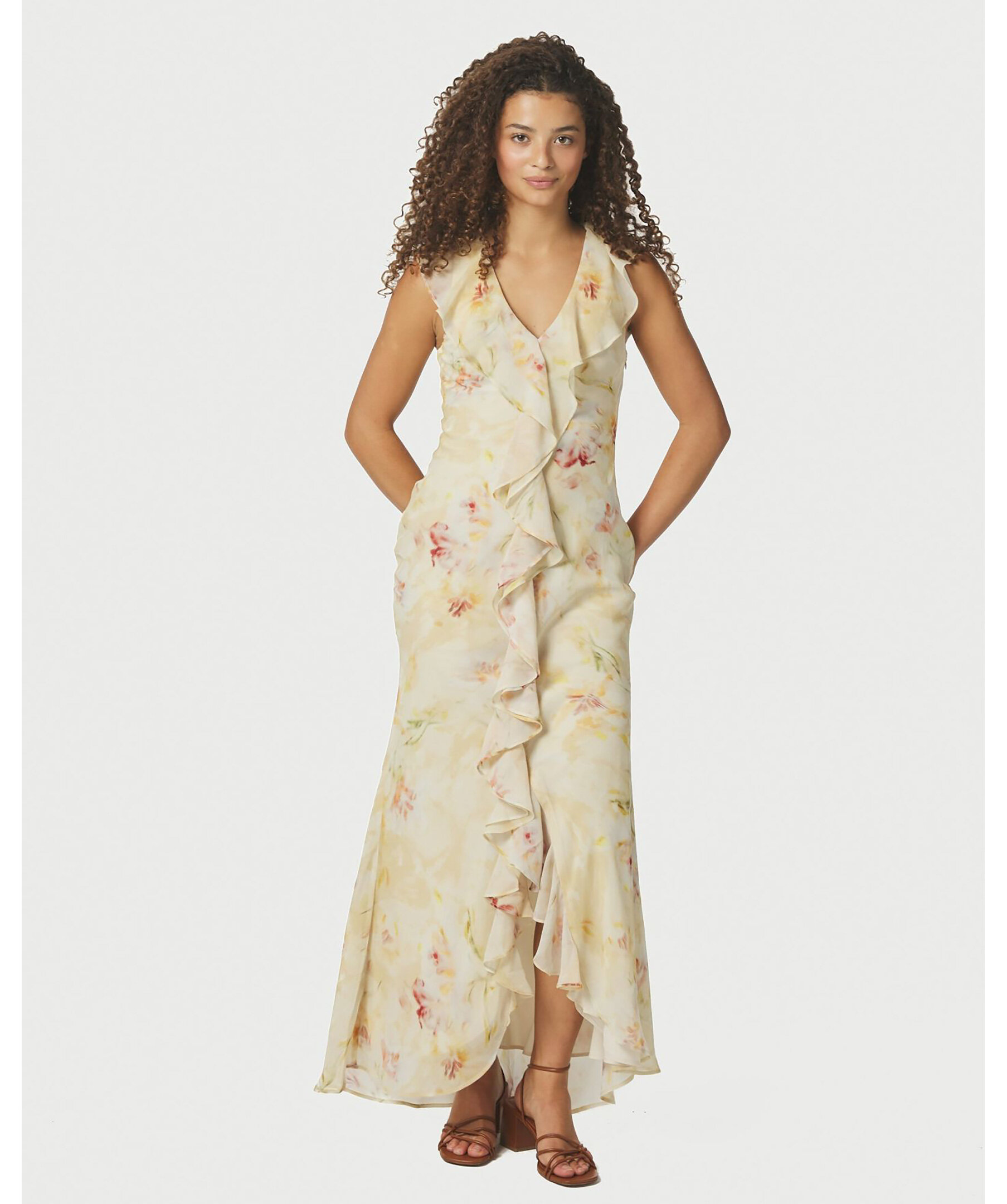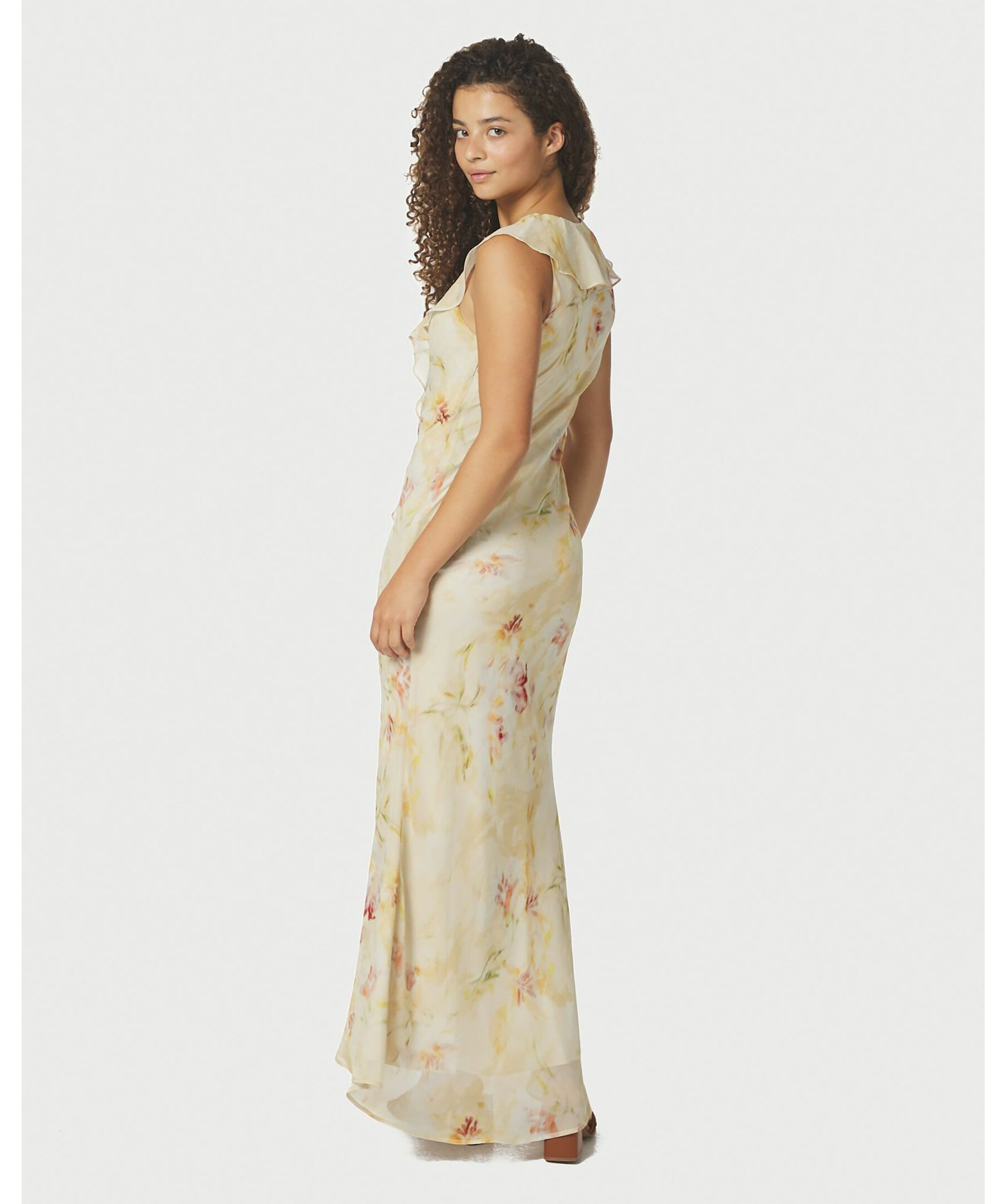 Blommig lång klänning med volangkrage och en slits fram. Modellen är 176 cm och bär storlek 36.