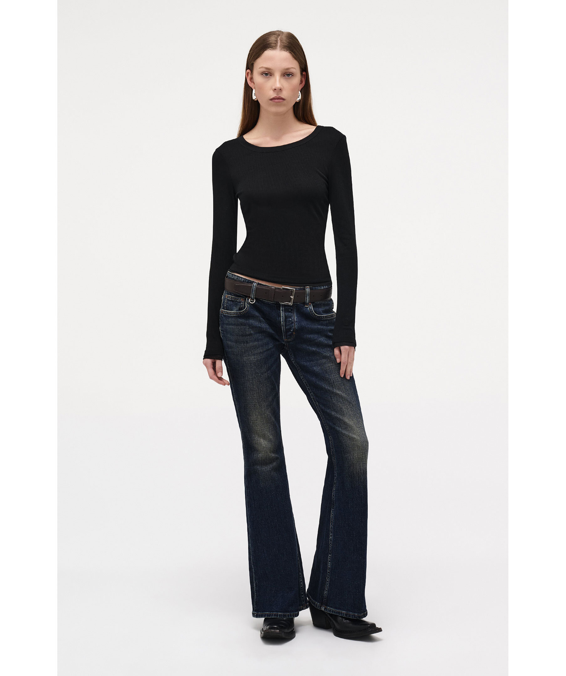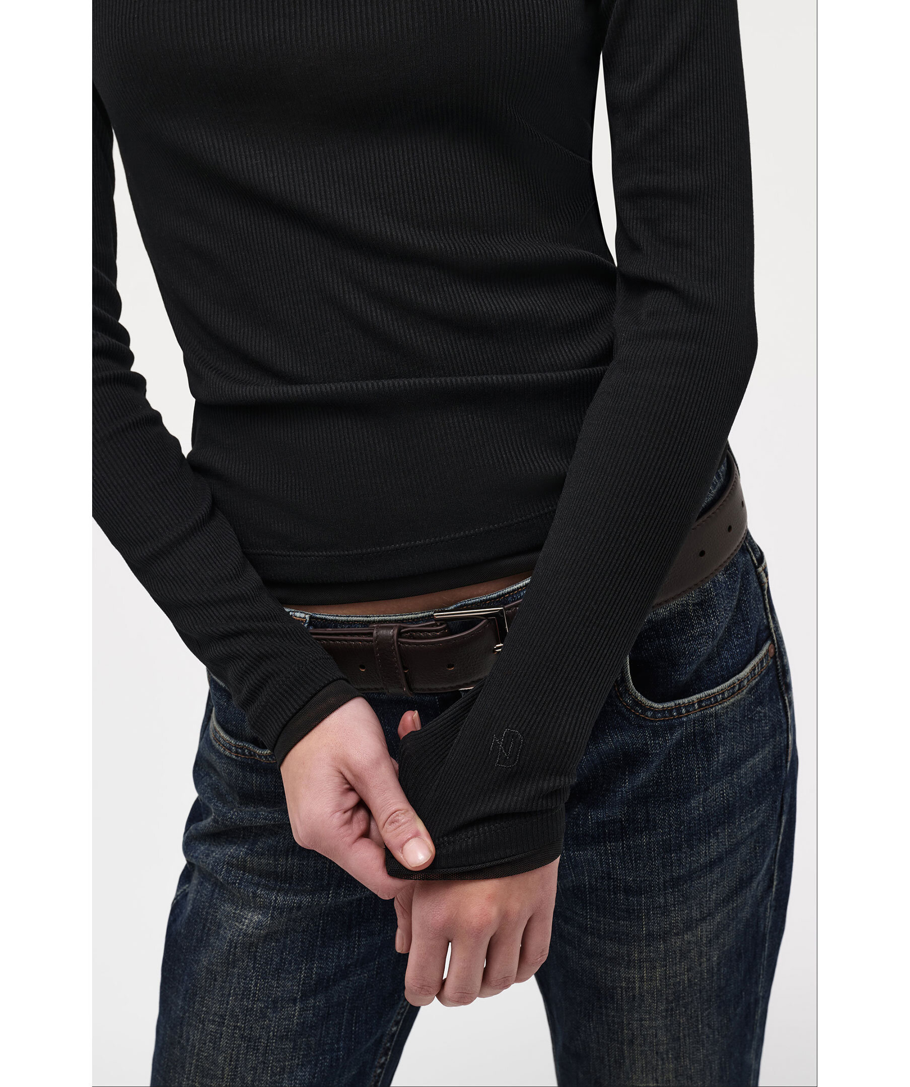 Svart långärmad t-shirt från Neuw. Slimmad passform med transparenta meshdetaljer vid ärmsluten och en scoop-urringning med ribbad fåll. Tillverkad i en elastisk mix av 62 % polyester, 38 % rayon och 3 % spandex ger den en följsam, mjuk känsla med ribbad struktur.