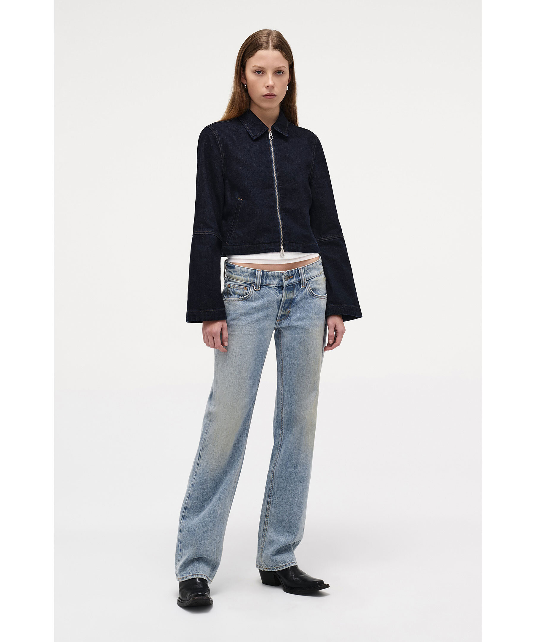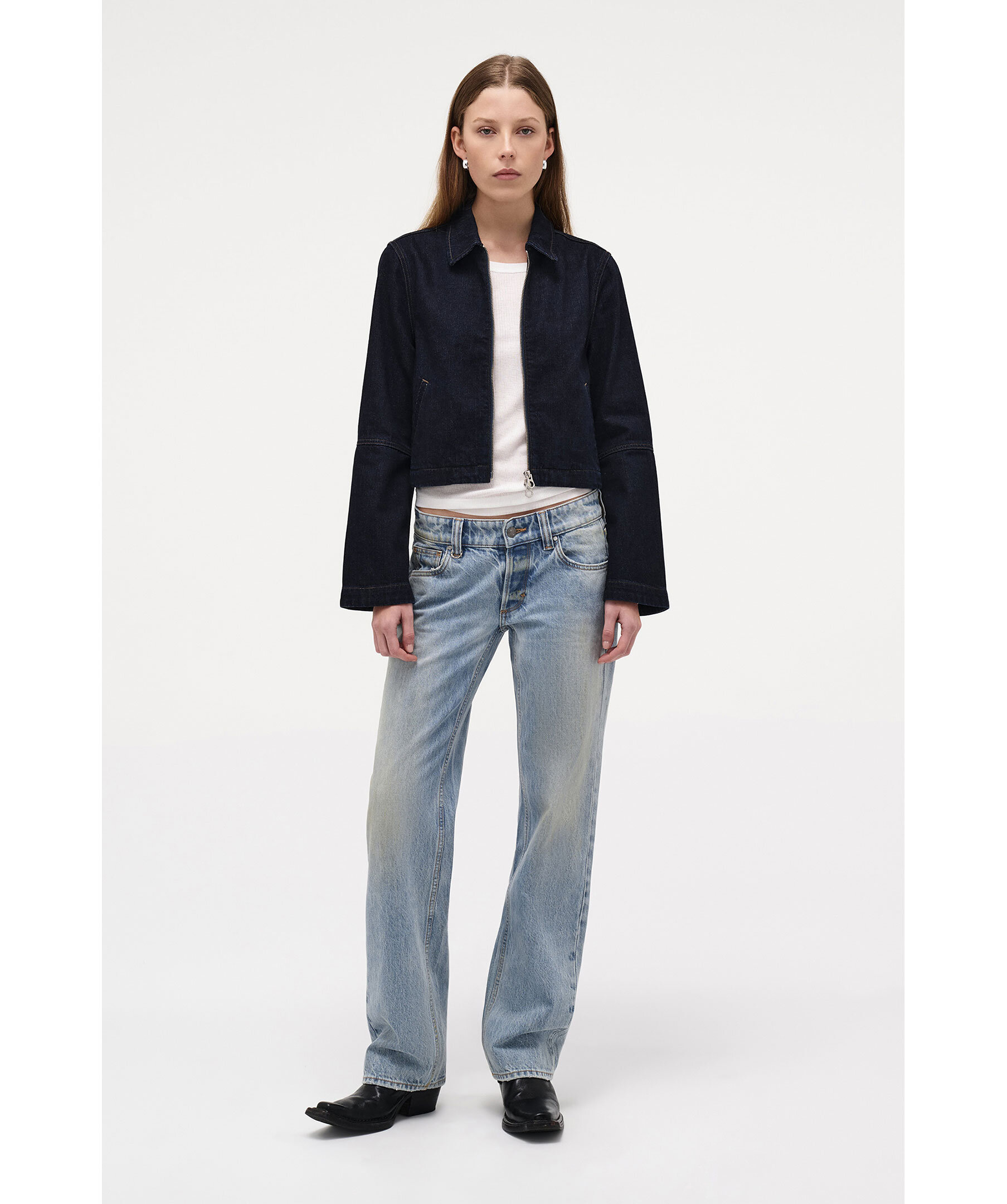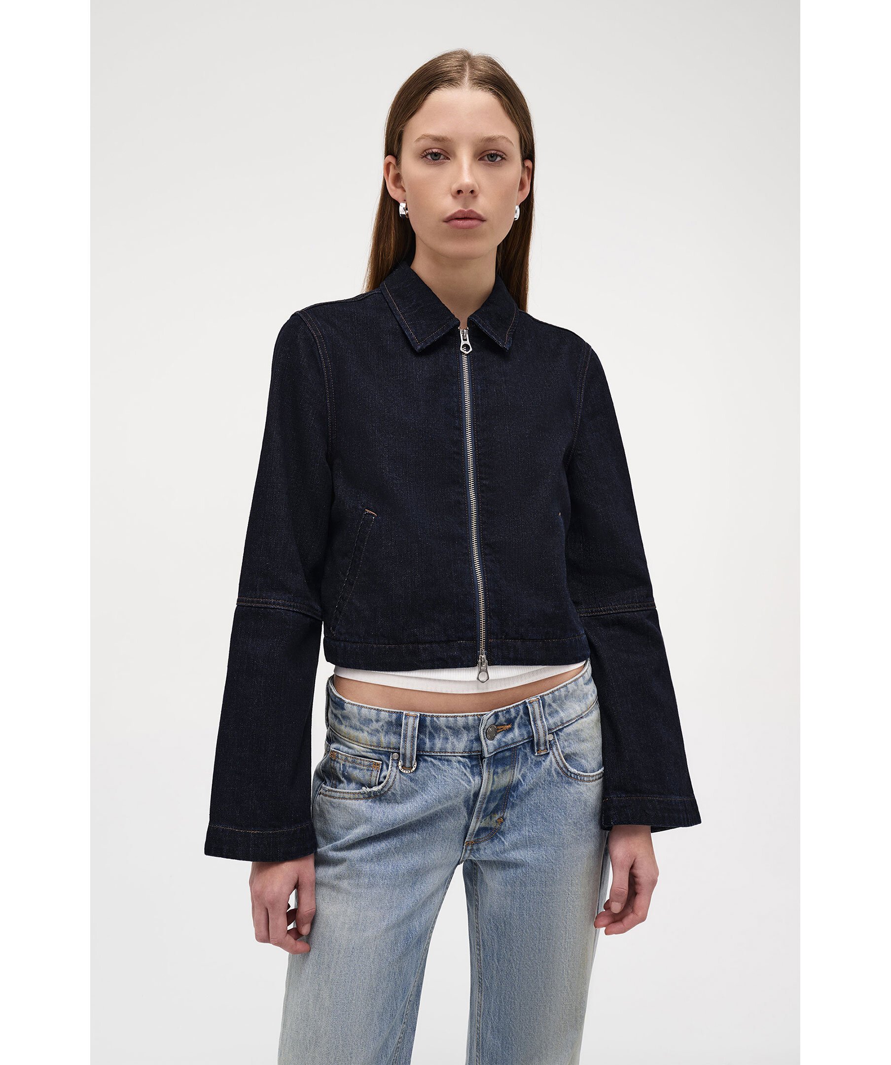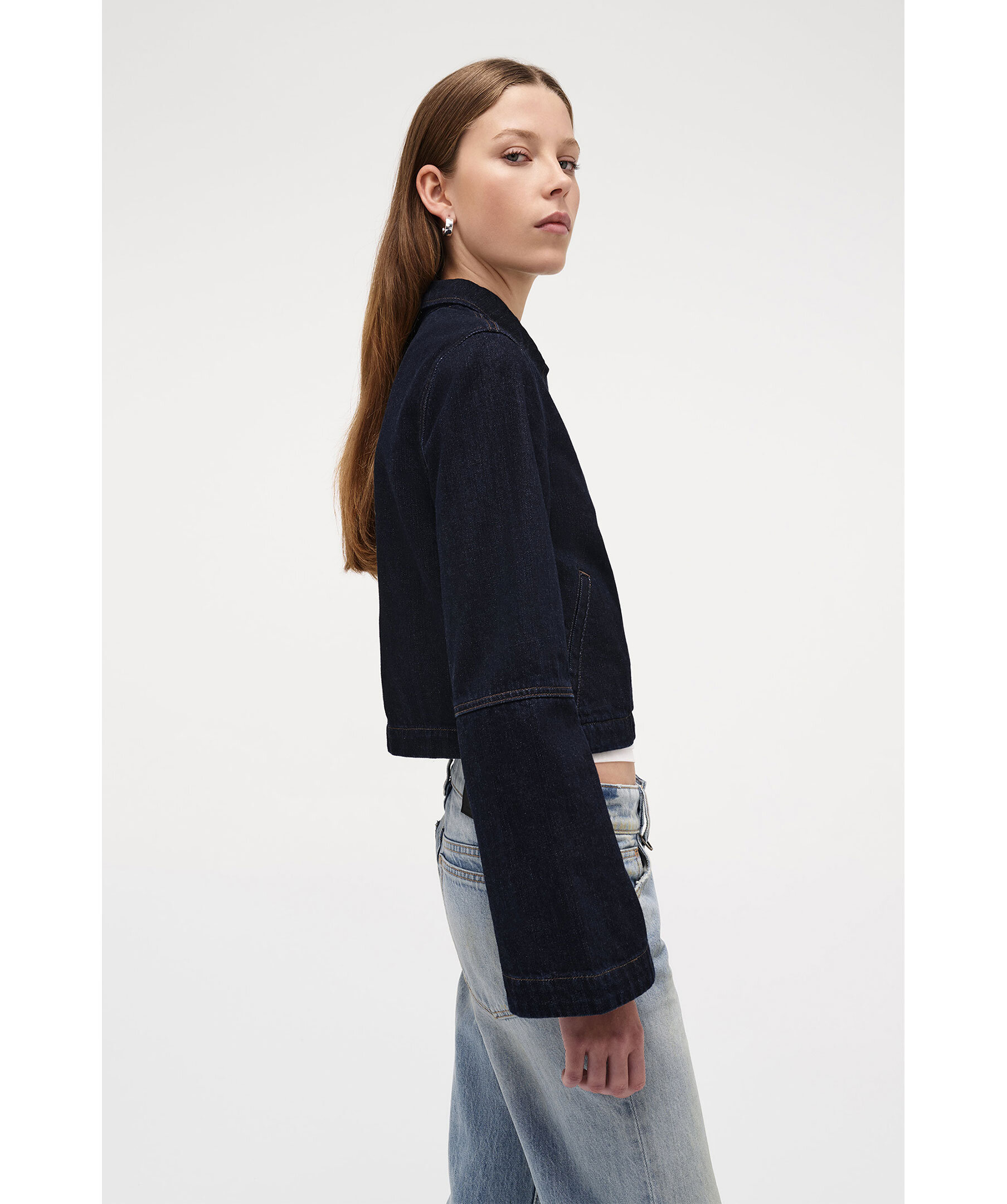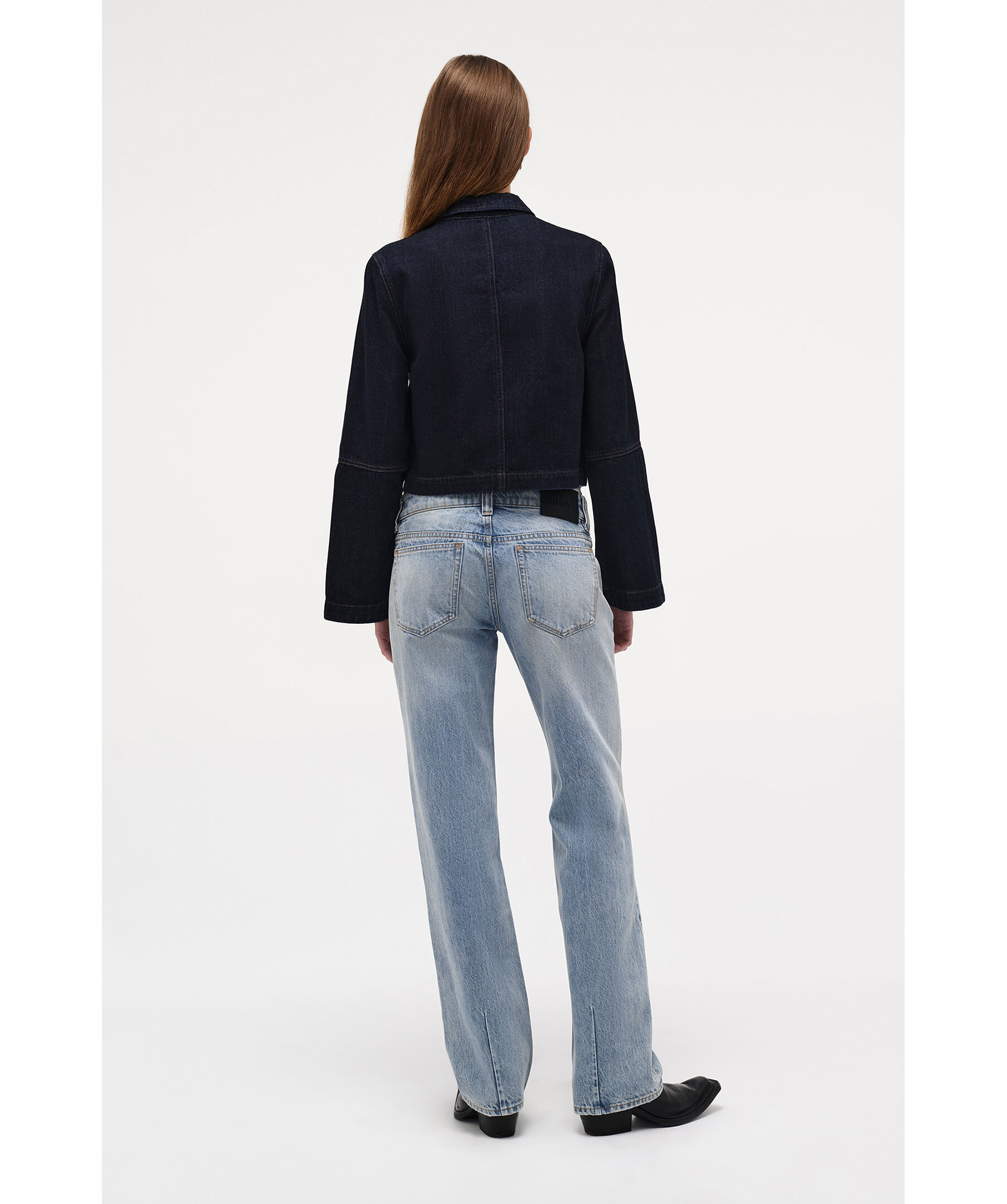 Mörkblå jeansjacka från Neuw. Minimalistisk jacka i en kort passform med feminina detaljer och en elegant silhuett. Den är tillverkad i 100 % bomull med en djup indigofärg och subtil crosshatch-textur. De lätt utsvängda ärmarna och stilrena welt-fickorna ger ett modernt uttryck, medan den olinjerade konstruktionen gör den lätt och perfekt för lager-på-lager-styling.