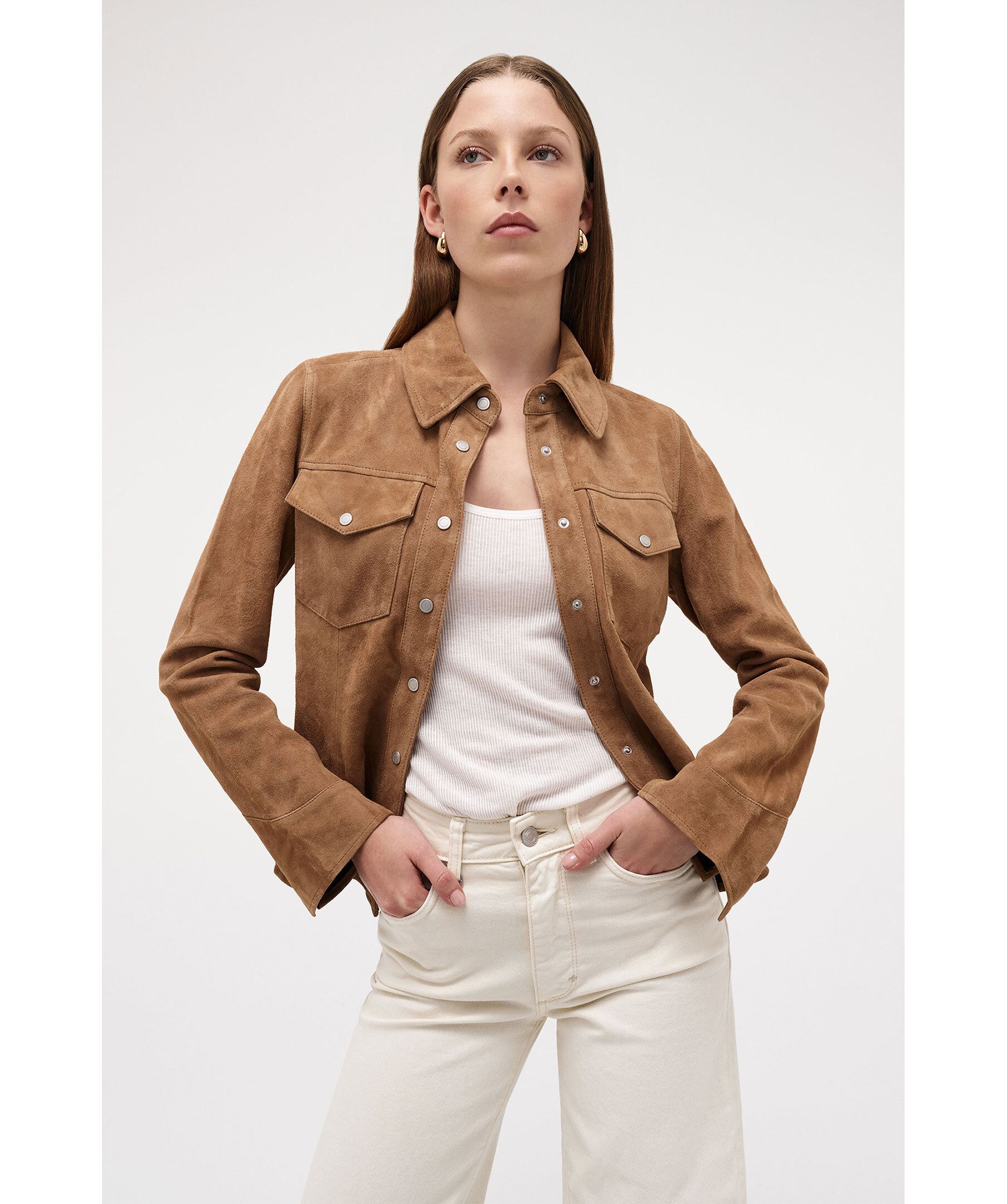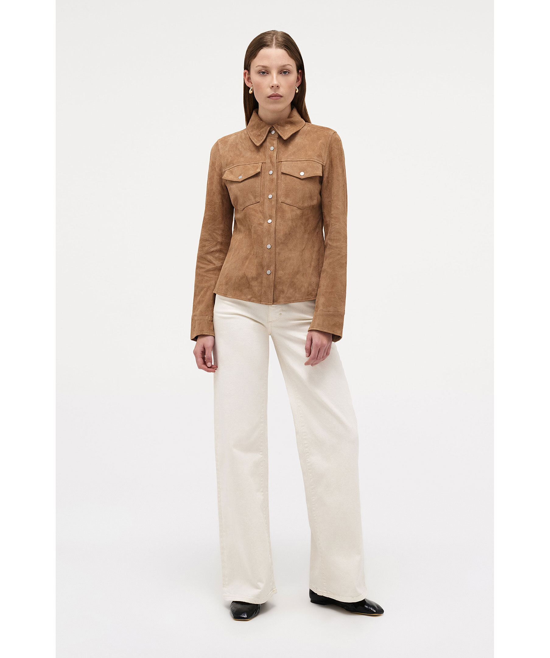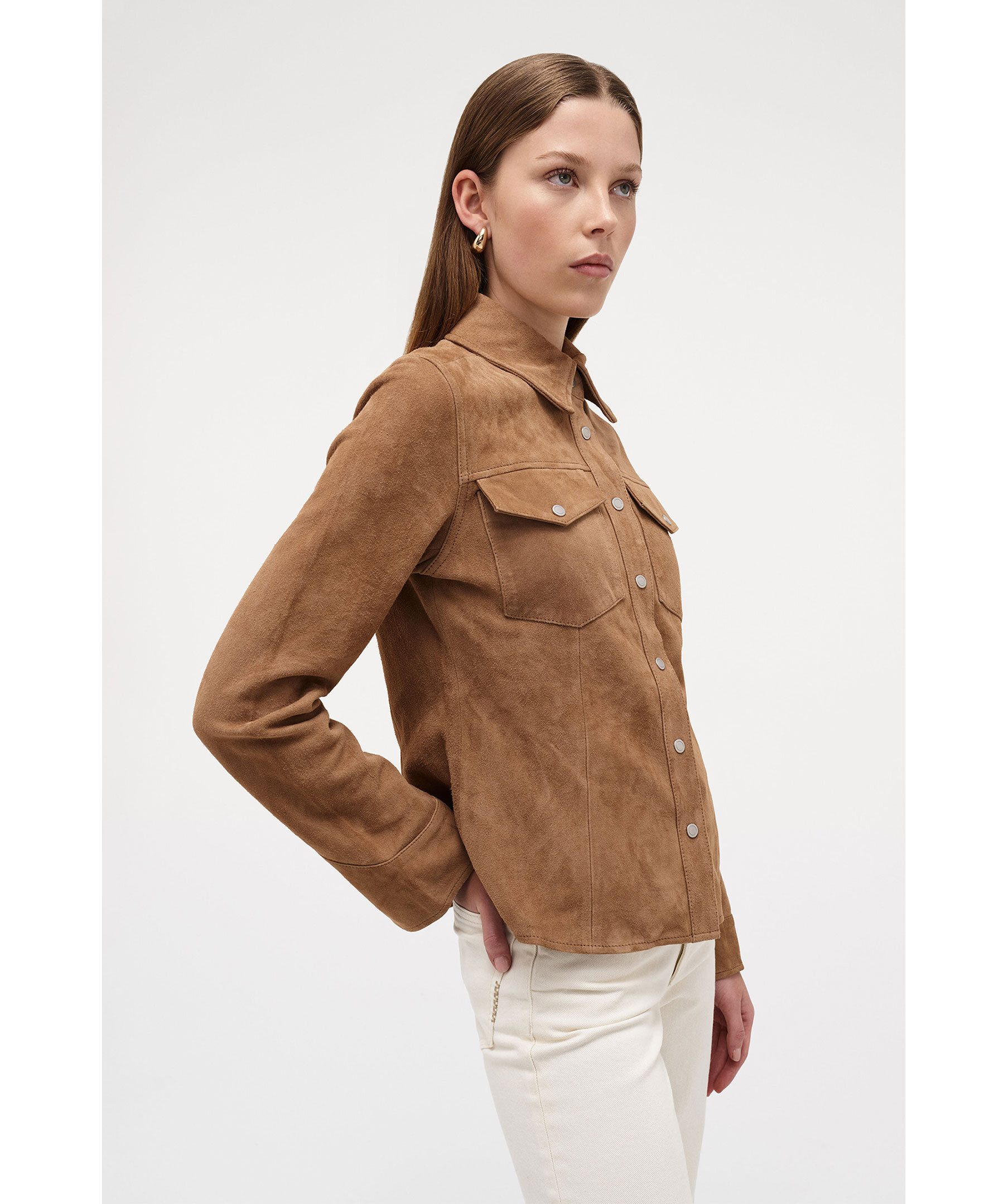 Overshirt i mocka från Neuw. Western inspirerade design och har en modern siluett. Plagget är strukturerat men lätt och ofodrat, vilket gör det perfekt att bära som lagerplagg. Den är figursydd med prinsessömmar för en smickrande passform och försetts med silverknäppsnappar som ger en ren och sofistikerad westernstil.