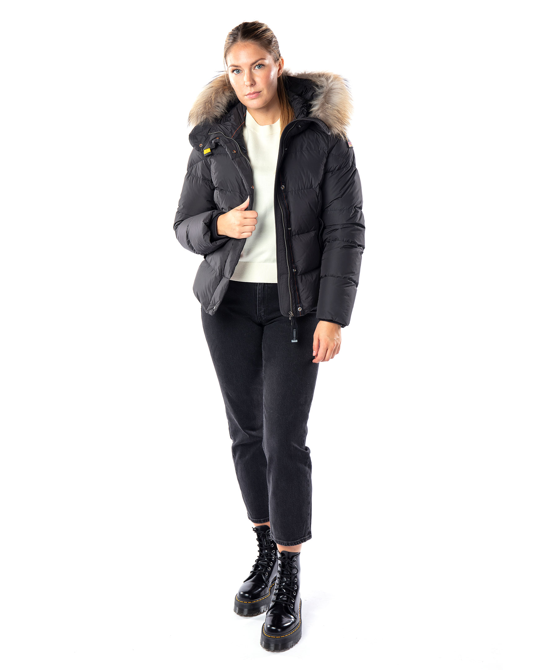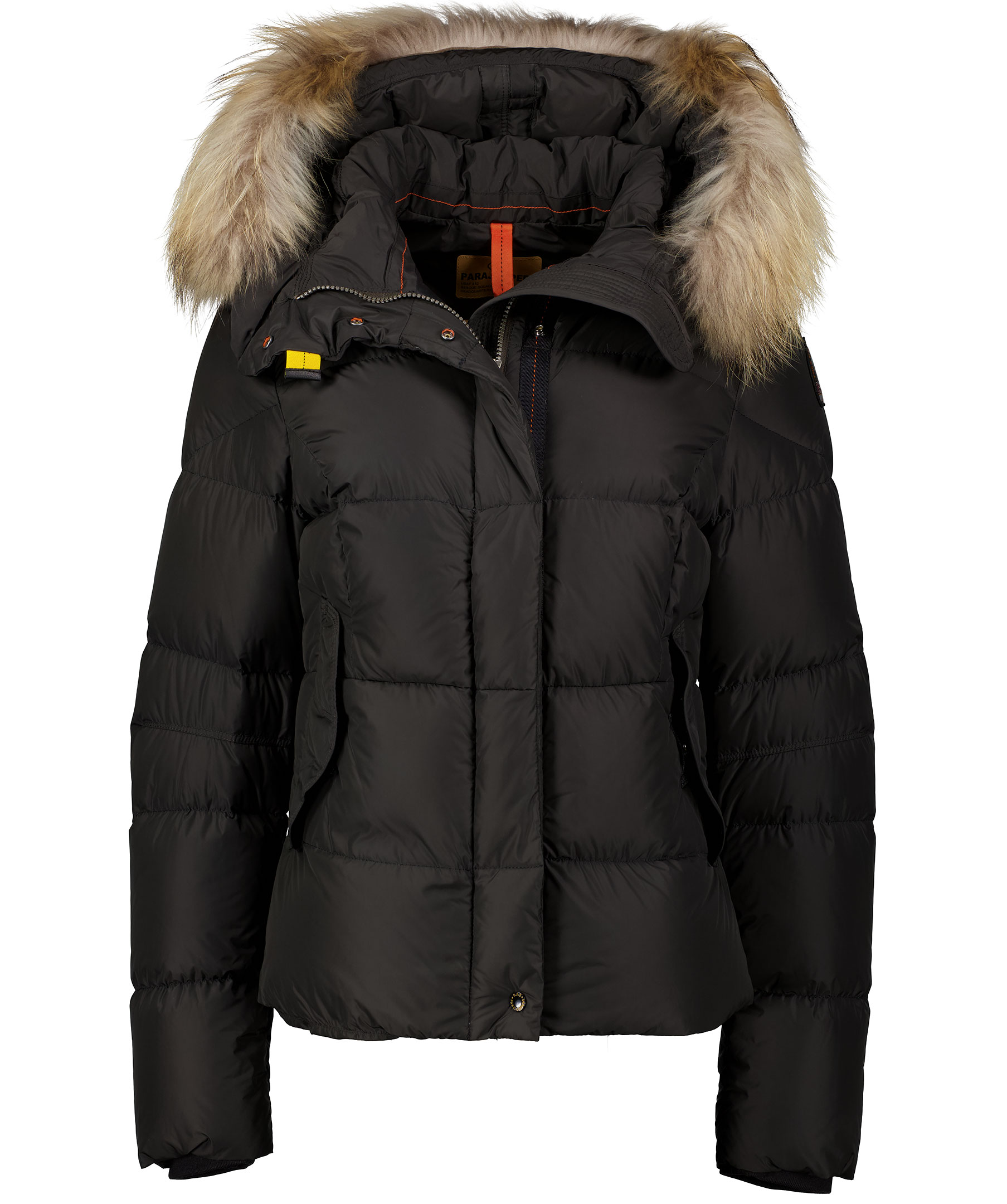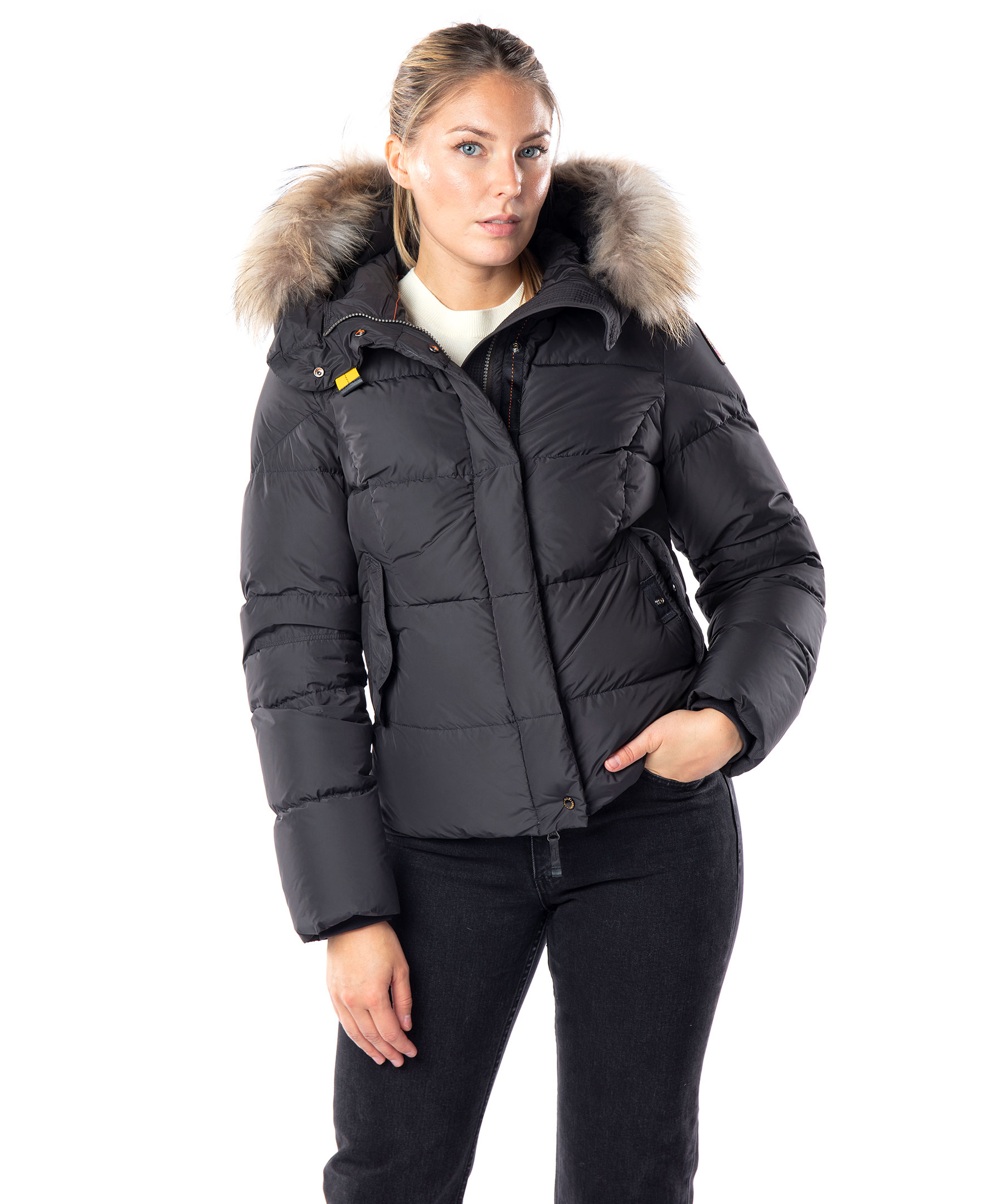 Svart, dunjacka i kort modell från Parajumpers. Jackan har två sneda framfickor med ficklock och tryckknapp och två innerfickor. Jackan stängs med dold tvåvägsdragkedja och tryckknappar, har en luva med avtagbar naturpäls på kragen samt hög krage. Patch med logotyp på vänster ärm och gul flärp vid kragen. Yttertyg i 100% polyester och fylld med 100% dun. Modellen är 175 cm lång och bär storlek S. TIPS! Ånga pälsen för att få den stor och fluffig. OBS! Naturpälsar är unika och kan skilja sig från bilden.
