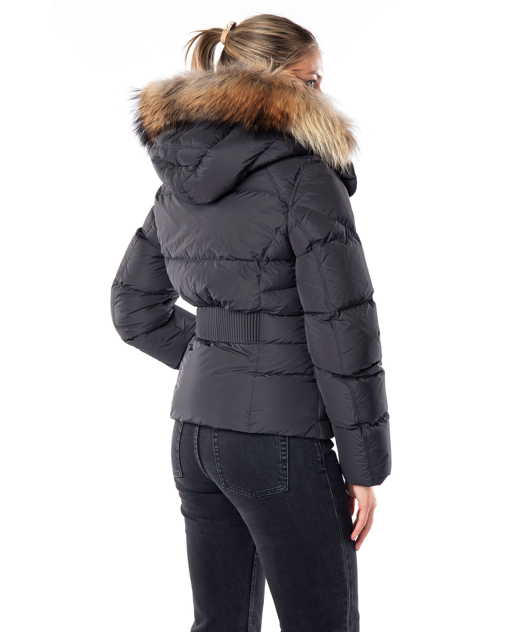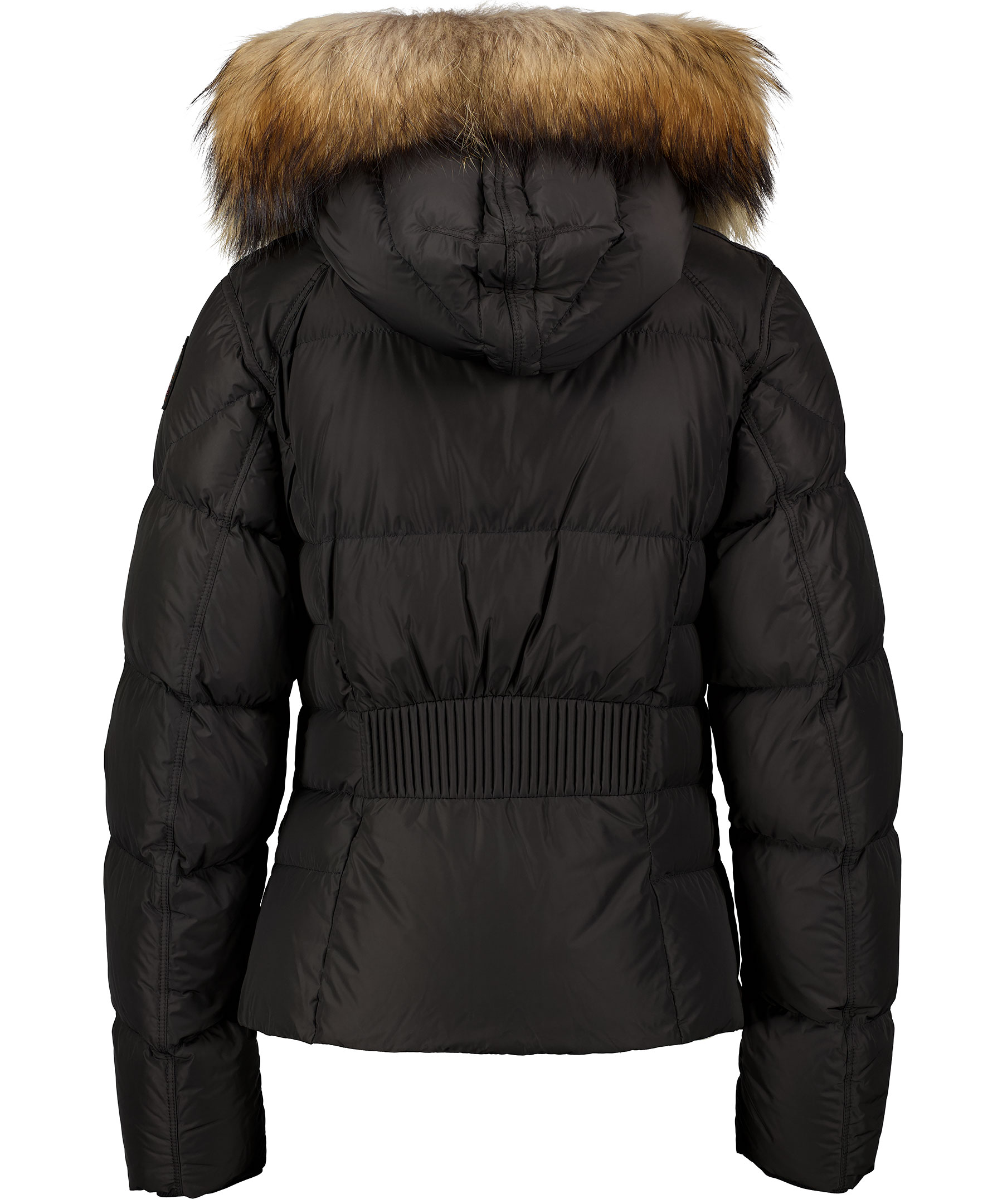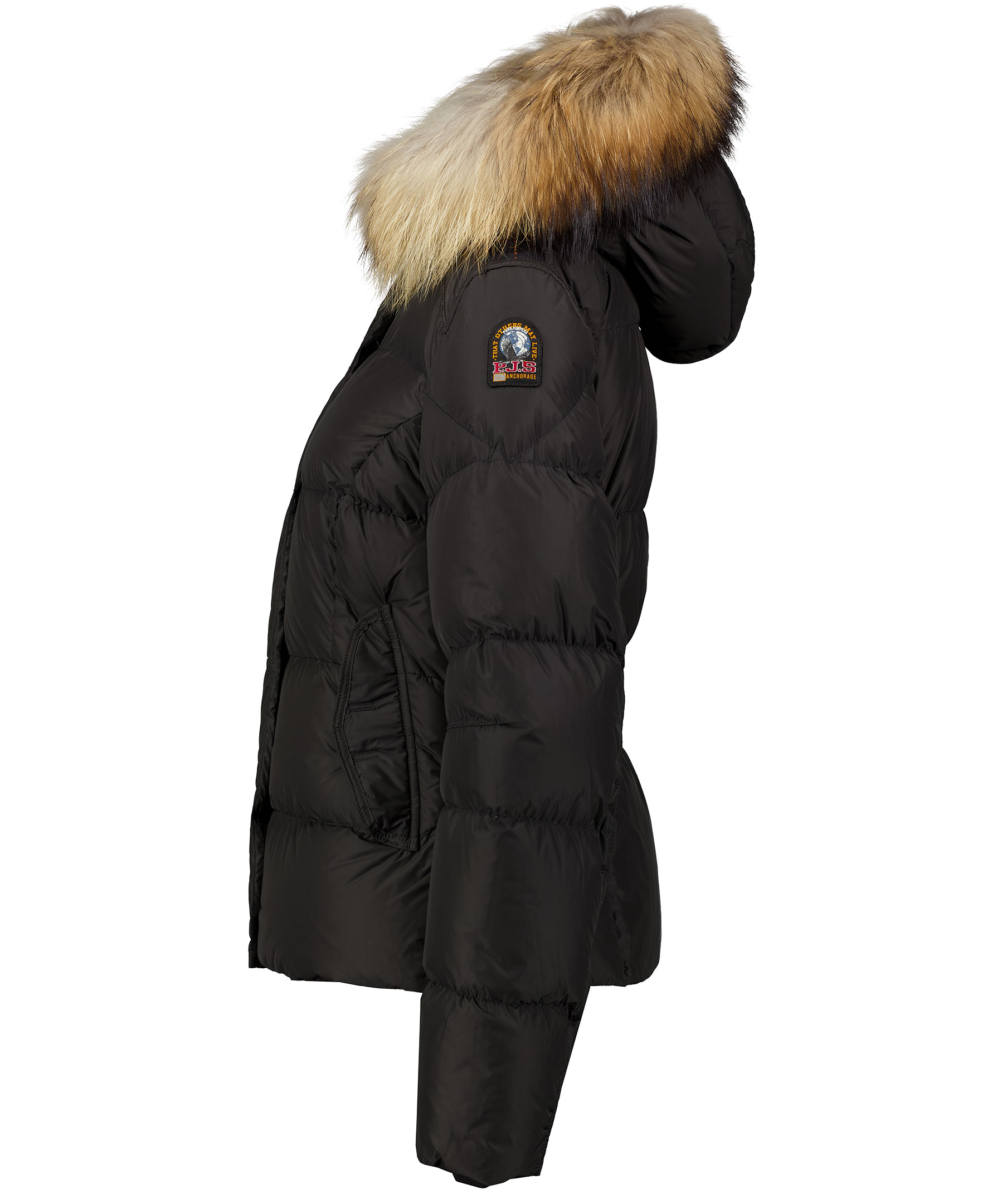 Svart, dunjacka i kort modell från Parajumpers. Jackan har två sneda framfickor med ficklock och tryckknapp och två innerfickor. Jackan stängs med dold tvåvägsdragkedja och tryckknappar, har en luva med avtagbar naturpäls på kragen samt hög krage. Patch med logotyp på vänster ärm och gul flärp vid kragen. Yttertyg i 100% polyester och fylld med 100% dun. Modellen är 175 cm lång och bär storlek S. TIPS! Ånga pälsen för att få den stor och fluffig. OBS! Naturpälsar är unika och kan skilja sig från bilden.